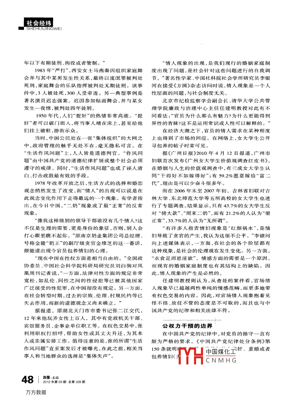 社會經(jīng)緯HEHUIJINGWEI中國官場情人政渝文/趙季文2010年4月11個標題為《鐵嶺縣國子竟從吉林省延邊朝鮮族自治州政府原副秘書長土局副局長陳立巖與情婦開房》的視頻車鐘日等人身上,騙走財物共值人民幣78797余萬瞬間傳遍了全中國。第二天,鐵嶺市國土資源局發(fā)元。車鐘日終以貪污、受賄、巨額財產(chǎn)來源不明數(shù)罪布消息,證實該局副局長陳立巖在大連市某賓館與并罰,被判無期徒刑,剝奪政治權利終身。通過網(wǎng)上相識的有夫之婦馮某發(fā)生不正當男女關在上述案件中,情婦雖假,但利用貪官情人輸系,并已責令陳立巖停止工作,檢查交待錯誤送利益的潛規(guī)則卻暴露無遺。“視頻窺私”與“網(wǎng)絡反腐”疊加在一起,陳立巖2009年1月21日,原北京市副市長劉志華受事件觸發(fā)了網(wǎng)民極高的興奮點。一時間,網(wǎng)絡轉載賄案終審判決,劉志華被認定利用職務便利為他人滿天,“副局長”、“陳立巖”也成了熱門搜索詞。這是謀取利益,索取和收受他人財物折合人民幣696萬短短一個月來,繼溫州市甌海區(qū)委書記謝再興謀殺余元。值得注意的是,在近七百萬元的受賄財物中情人之后另一場官場桃色風波。劉志華單獨受賄的金額僅為48萬余元,其他六百多萬元受賄款均與情婦王建瑞有關。貪官與情人的利益鏈條許多案件都顯示,情婦是腐敗利益鏈條中的重有調(diào)查稱,迄今被查處的貪官95%存在生活作要環(huán)節(jié)。例如在原中石化集團總經(jīng)理陳同海、原青風問題,或養(yǎng)情婦或嫖娼狎妓,而60%以上的腐敗島市委書記杜世成、原天津市人民檢察院檢察長李案件都與情婦有關。金寶、原貴州省省委書記劉方仁、原全國人大副委記者對2000年以來落馬的85位省部級官員的員長成克杰等案件中,官員大肆受賄的背后都有情相關報道進行調(diào)查,傳出擁有情人的有45人之多,婦的身影。占529%。在有些年份,落馬高官包養(yǎng)情人的比例相當之高,2007年竟達100%高風險的情婦職業(yè)群2009年堪稱反腐風暴年,被打落的省部級高官從鴛侶到殺人,原溫州市甌海區(qū)區(qū)委書記謝再多達17人,創(chuàng)下歷史紀錄。而當中被指“生活腐化”興,只是重復了別人的故事。記者根據(jù)公開報道統(tǒng)的也占很高的比例。計,2001年到2010年10年間,因情婦問題而發(fā)生這一奇特現(xiàn)象,使沒有情婦的貪官也成了新的命案和傷害案至少有21宗,平均每年就有2宗。聞。原中國建設銀行董事長張恩照的辯護律師高子統(tǒng)計中,官員殺死或傷害情婦的有16宗,因包程曾給三十多位高官做過辯護,他向媒體披露,張養(yǎng)情婦而殺妻的有3宗,殺害情婦丈夫的有2宗。是他代理的案件中唯一一位沒有婚外私情的貪官。在發(fā)妻與情婦的PK大戰(zhàn)中,官員似乎更傾向于保“貪官背后必有情人”的印象已深入人心,以至住現(xiàn)有的婚姻狀態(tài)。如周其東、吳悅明、梁冠中、楊于“抹黃”現(xiàn)象時有發(fā)生。一些寫手編造貪官的桃色國瞿、宋鳴兒、曾國華、段義和等案件的發(fā)生,皆與新聞,將貪官描述成既貪又淫的¨色官”,并通過媒情婦逼婚或以公開私情相威脅有關。為擺脫情婦糾體和互聯(lián)網(wǎng)廣為傳播。落馬的安徽省衛(wèi)生廳原副廳纏,涉案官員不惜鋌而走險,除之而后快。段義和長尚軍、湖北棗陽市原市長尹冬桂即因此將“抹黃”句“那個女人知道得太多了,又不識好歹”,頗能道者訴至公堂,并贏了官司。出其中的真另據(jù)國內(nèi)媒體報道,一位冒充“書記情婦”的女在涉案FH中國煤化工干部占了絕CNMHG46年期總期社會經(jīng)緯SHEHUIJINGWEI大多數(shù),而級別最高的要數(shù)副部級干部段義和。集女性毛發(fā)、內(nèi)褲236份,還自拍淫亂照片二百多從涉案官員的職業(yè)分析,知法犯法的現(xiàn)象非常張,自拍淫穢錄影帶、光碟一批。原山東青島市委書突出,涉及政法委、公安和反貪等執(zhí)法人員9人(包記杜世成、原中國石化集團總經(jīng)理陳同海則“頗具括段義和案中具體實施犯罪的陳志)。而其他多為合作精神”,擁有一名公共情人。原安徽宣城市委書政府行政部門的干部,如交通局、工商局、林業(yè)局、記楊楓則長于管理,運用MBA知識管理7名情婦。民政局、糧食局等。新近,“含淚索賄”成為中國官場情色故事的新看從上述案件的作案手法來看,采用焚尸、肢解、點,而該詞的發(fā)明人是原廣東增城市人大常委會黨爆炸、割頭顱、用車碾軋等特別兇殘手段的多達8組副書記、副主任邱伙勝宗,慘況令人發(fā)指據(jù)多家媒體報道,邱伙勝被控受賄105萬元這是一場賭命的游戲。命案的發(fā)生固然使官員日前被廣州中院判處有期徒刑7年。在庭審中,邱與情婦的關系戛然終止,但涉案的官員也因此賭上說,他所做的一切都是被“二奶”逼的,他受賄的98了自己的性命。在統(tǒng)計的案件中,除曾國華(雇兇傷萬元贓款全部送給了情婦。邱的數(shù)名行賄人在證詞害)和沙文學(投水自盡)兩案之外,其他19宗的涉中也提到,邱向他們要錢時淚流滿面,說如果沒有案官員無一例外領下死罪(其中史洪海案因證據(jù)問錢就會“家破人亡”或者“兩公婆要一起跳樓”。原廣題緩期兩年執(zhí)行)東省鹽務局局長、廣鹽集團有限公司董事長沈志強也有過類似經(jīng)歷,自辯是為情婦“逼迫”而受賄。荒唐的官場情色游戲
