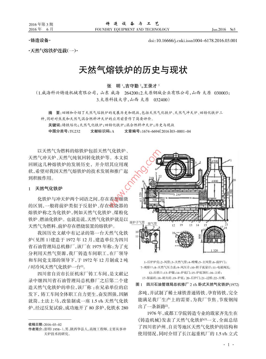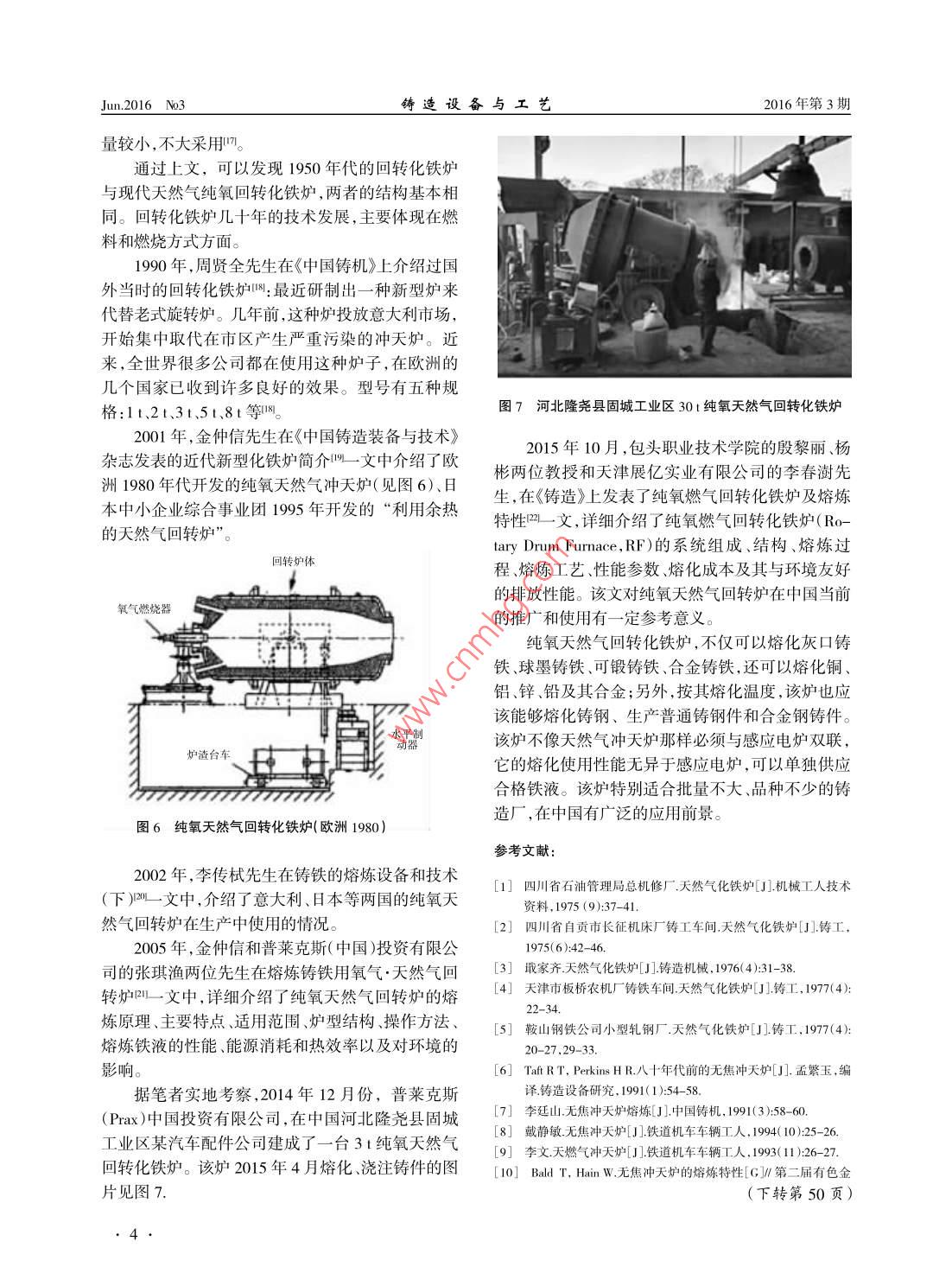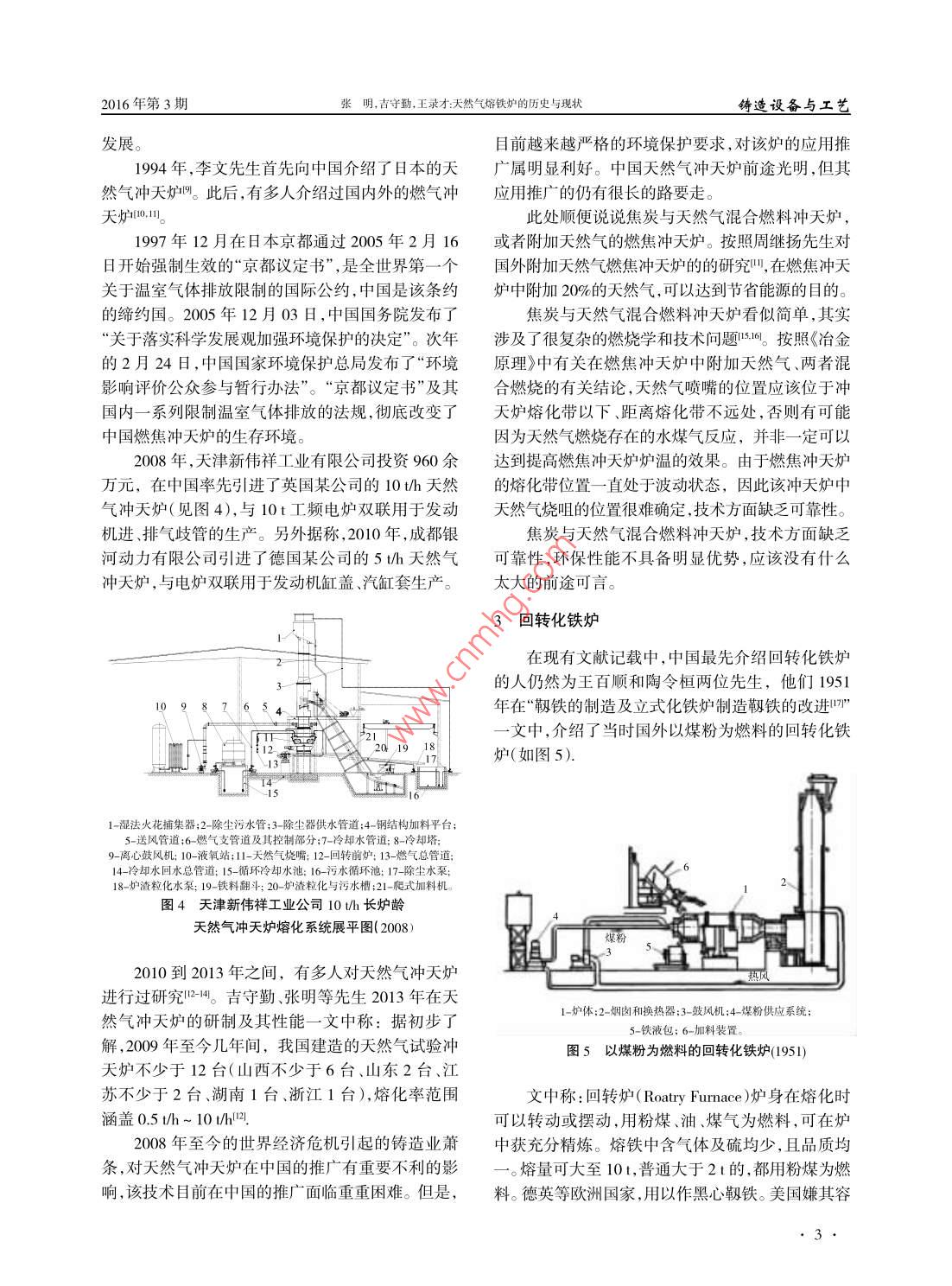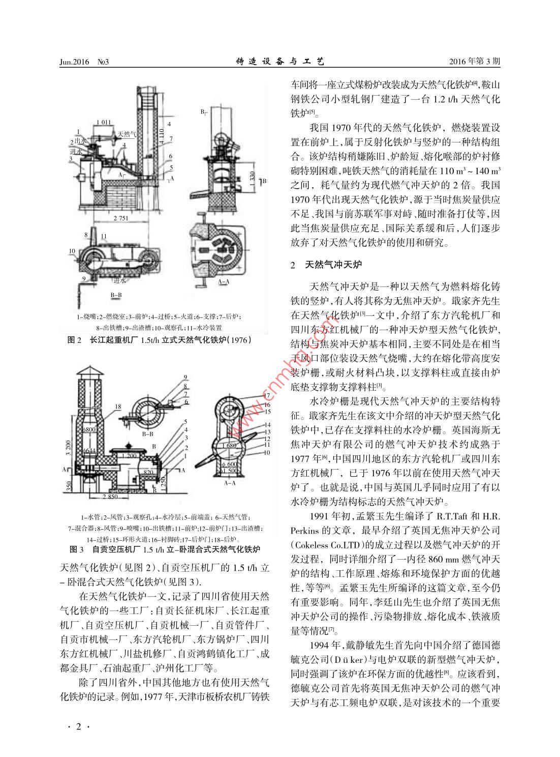 2016年第3期鑄造設(shè)備與工藝2016年6 月FOUNDRY EQUIPMENT AND TECHNOLOGYJun.2016 N03_●鑄造設(shè)備.doi: 10.6666/j.cnki.issn1004- 6178.2016.03.001●天然氣熔鐵爐連載( - -).天然氣熔鐵爐的歷史與現(xiàn)狀張明',吉守勤2,王錄才(1.威海科興鑄造機械有限公司,山東威海264200;2. 太原鋼城企業(yè)有限公司,山西太原: 030003;3.太原科技大學(xué),山西太原032400)摘要:回顧和介紹了天然氣熔鐵爐的發(fā)展歷史和現(xiàn)狀, 包括天然氣化鐵爐、天然氣沖天爐、回轉(zhuǎn)化鐵爐三種,同時對焦炭和天然氣混合燃料沖天爐的應(yīng)用前景作了簡要評價。關(guān)鍵詞:鑄鐵熔化;天然氣化鐵爐;回轉(zhuǎn)化鐵爐;混合燃料沖天爐;歷史與現(xiàn)狀中圖分類號:TC232文獻(xiàn)標(biāo)識碼:A文章編號:1674- 6694( 2016 )03 0001-040以天然氣為燃料的熔鐵爐包括天然氣化鐵爐、天然氣沖天爐、天然氣純氧回轉(zhuǎn)化鐵爐等。本文擬回顧這幾種熔鐵爐的發(fā)展歷史,并介紹其應(yīng)用現(xiàn)狀,希望對我國天然氣熔鐵爐的技術(shù)發(fā)展和推廣起到積極作用。φ8001天然氣化鐵爐烈4003 250*化鐵爐與沖天爐兩個詞語之間,存在著很細(xì)微700200的區(qū)別,一般將前爐類似于反射爐、存在燃燒器的熔鐵爐稱之為化鐵爐,例如天然氣化鐵爐、煤粉化鐵爐、燃油化鐵爐。也就是說,天然氣化鐵爐就是以接爐子氣管接氣管12191314.15天然氣為燃料、前爐存在燃燒裝置的熔鐵爐。我國歷史文獻(xiàn)中有記錄的第--臺天然氣化鐵爐(見圖1)建造于1972年12月,建造單位為四川省石油管理局總機修廠,該廠在1975年稱:為了充1 320分利用天然氣資源,我廠鑄造車間職工,在廠領(lǐng)導(dǎo)和車間黨支部的領(lǐng)導(dǎo)下,于1972年12月制成2噸1-后爐爐殼;2-風(fēng)管;3-天然氣管;4嗩嘴;5-主風(fēng)管;6前爐門;1時冷風(fēng)天然氣化鐵爐一臺。7-觀察口;8-天然氣壓力表:9風(fēng)壓計;10-轉(zhuǎn)子流量計:11電磁閥瓦;四川省自貢市長征機床廠鑄工車間,是文獻(xiàn)記12-出鐵口;13-爐腿;14爐底門;15-爐底頂杠;16-立磚;17-保溫磚;18-耐火磚;19- 爐底; 20-后爐門;21-過橋;22-火嘴。錄中繼四川省石油管理局總機修廠“之后第二個建圖1四川石油管理局總機修廠 2 l/h臥式天然氣化鐵爐(1972)造天然氣化鐵爐的單位,該廠稱:在兄弟單位的啟發(fā)下,鑄工車間全體職工自力更生,奮發(fā)圖強,因陋多噸,并試制了稀土球鐵普通鑄鐵、孕育鑄鐵,完全就簡,土法上馬,改裝制成一座1.5 t/h天然氣化鐵能滿足我廠生產(chǎn)上的需要,為我廠節(jié)焦、節(jié)廢鋼闖爐,經(jīng)過反復(fù)試驗,成功地開了80多爐,化鐵水280出了- -條新路1。1976年,成都工學(xué)院鑄造專業(yè)的戢家齊先生在《鑄造機械》發(fā)表了天然氣化鐵爐B_ .文,全面總結(jié)收稿日期:2016-03-02作者簡介:張明( 1958- ),男,陜西華縣人,高級工程師,主要從事沖了四川省瀘州、自貢等地區(qū)天然氣化鐵爐的結(jié)構(gòu)和天爐技術(shù)的研究。使用情況,同時介紹了長江起重機廠的1.5t/h 立式Jun.2016 N03鑄造設(shè)備與工藝2016年第3期車間將-座立式煤粉爐改裝成為天然氣化鐵爐州,鞍山鋼鐵公司小型軋鋼廠建造了一臺1.2 t/h天然氣化鐵爐1。我國1970年代的天然氣化鐵爐,燃燒裝置設(shè);出水置在前爐上,屬于反射化鐵爐與豎爐的-種結(jié)構(gòu)組合。該爐結(jié)構(gòu)稍嫌陳舊、爐齡短、熔化喉部的爐襯修砌特別困難,噸鐵天然氣的消耗量在110 m'~ 140 m3之間,耗氣量約為現(xiàn)代燃?xì)鉀_天爐的2倍。我國1970年代出現(xiàn)天然氣化鐵爐,源于當(dāng)時焦炭量供應(yīng)不足、我國與前蘇聯(lián)軍事對峙、隨時準(zhǔn)備打仗等,因2 751此當(dāng)焦炭量供應(yīng)充足、國際關(guān)系緩和后,人們逐步放棄了對天然氣化鐵爐的使用和研究。102天然氣沖 天爐工心天然氣沖天爐是-種以天然氣為燃料熔化鑄B鐵的豎爐,有人將其稱為無焦沖天爐。戢家齊先生在天然氣化鐵爐B一文中,介紹了東方汽輪機廠和8-出鐵槽:9-出渣槽:10- 觀察孔:11-水冷裝置四川東方紅機械廠的一-種沖天爐型天然氣化鐵爐,圖2長江起重機廠 1.5U/h 立式天然氣化鐵爐( 1976)結(jié)構(gòu)與焦炭沖天爐基本相同,主要不同處是在相當(dāng)于風(fēng)口部位裝設(shè)天然氣燒嘴,大約在熔化帶高度安裝爐柵,或耐火材料凸塊,以支撐料柱或直接由爐底墊支撐物支撐料柱8。水冷爐柵是現(xiàn)代天然氣沖天爐的主要結(jié)構(gòu)特18征。戢家齊先生在該文中介紹的沖天爐型天然氣化鐵爐中,已存在支撐料柱的水冷爐柵。英國海斯無焦沖天爐有限公司的燃?xì)鉀_天爐技術(shù)約成熟于1977年間,中國四川地區(qū)的東方汽輪機廠或四川東方紅機械廠,已于1976 年以前在使用天然氣沖天A-A爐了。也就是說,中國與英國幾乎同時應(yīng)用了有以水冷爐柵為結(jié)構(gòu)標(biāo)志的天然氣沖天爐。1-水管:2-風(fēng)管;3-觀察孔;4-水冷層;5-前端蓋; 6-天然氣管;1991年初,孟繁玉先生編譯了R.T.Taft 和H.R.7-混合器;8-風(fēng)管;9噴嘴; 10-出鐵槽:11-前爐12-前爐門;13-出渣槽:Perkins的文章,最早介紹了英國無焦沖天爐公司14-過橋:15-環(huán)形火道;16-襯腳磚:17-后爐門];18-后爐;圖3自貢空壓機廠 1.5 th立-臥混合式天然氣化鐵爐( Cokeless Co.LTD )的成立過程以及燃?xì)鉀_天爐的開天然氣化鐵爐(見圖2)、自貢空壓機廠的1.5t/h立發(fā)過程,同時詳細(xì)介紹了- -內(nèi)徑860 mm燃?xì)鉀_天爐的結(
