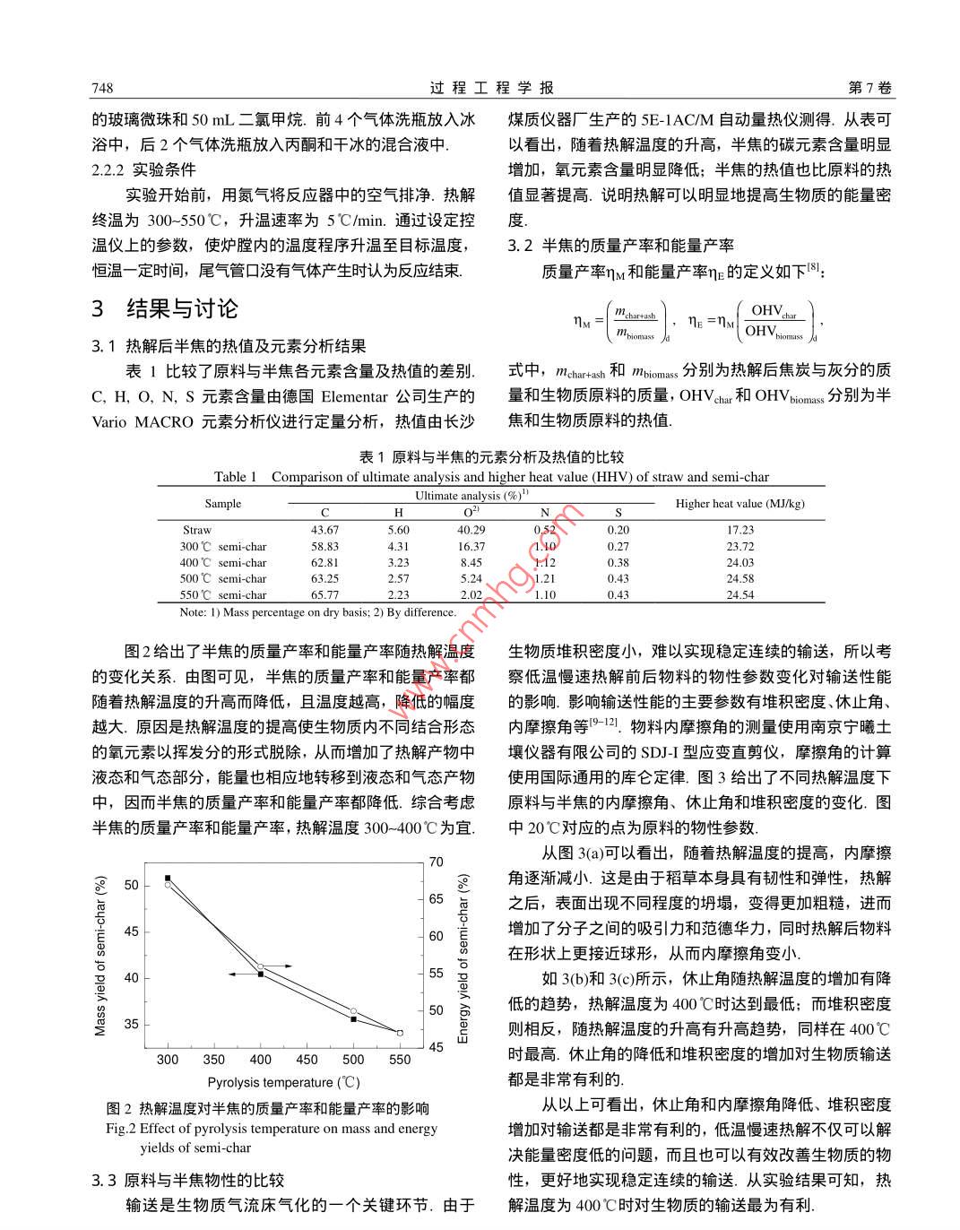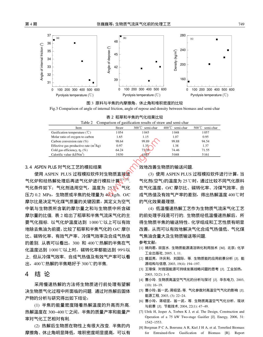 第7卷第4期過程工程學報Vol.7 No.42007年8月The Chinese Journal of Process EngineeringAug. 2007生物質氣流床氣化前的處理工藝張巍巍,曾國勇,陳雪莉,于遵宏(華東理工大學潔凈煤技術研究所,上海200237)摘要:針對生物質氣化過程面臨的問題,利用慢速熱解方法作為生物質氣流床氣化的前處理工藝并考察其可行性.分析討論了熱解后半焦的化學組成和輸送特性,并使用ASPEN PLUS模擬軟件計算比較了原料與半焦的氣化結果.結果表明,半焦的能量密度隨熱解溫度的升高而升高;熱解溫度在300- 400C之間,半焦的質量產率和能量產率對于氣化工藝比較有利;熱解后半焦的內摩擦角、體止角明顯降低,堆積密度明顯提高.使用ASPEN PLUS模擬軟件進行計算比較,熱解溫度為400C時的氣化效果最理想.關鍵詞:生物質;氣流床氣化;慢速熱解;半焦中圖分類號: TK文獻標識碼: A文章編號: 1009 -606X(2007)04- -0747-041前言2實驗生物質能是太陽能轉換和積累的主要形態(tài)之一,是2.1實驗原料的制備唯一的既有礦物燃料屬性,又可儲存、運輸、再生、轉稻稈(取自.上海市寶山區(qū))經過粉碎過篩后,取60換并較少受自然條件制約的能源.生物質能的開發(fā)利用-80 目(0.18-0.28 mm)的篩間物作為實驗原料,并將其可緩解能源緊缺問題、環(huán)境污染問題和“三農”問題等放置在105C烘箱內干燥3 h后放入密封容器中備用.國家重大戰(zhàn)略問題.生物質氣化是生物質能高品位利用2. 2實驗流程及條件發(fā)展最迅速最實用的技術之一- ,因此研究生物質氣化具2.2.1實驗流程有重要的現實意義1-31.熱解實驗流程如圖1所示.生物質原料放入特制的由于生物質的能量密度和機械強度較低、堆積密度吊籃內,然后送入到外有電爐加熱的金屬反應器內進行較小、休止角太大及流動性不好的特點,導致生物質在熱解.溫度由插入吊籃內的熱電偶顯示.熱解后固體產氣化應用中遇到很多問題,如燃氣熱值較低(一般為5物半焦留在反應器內,實驗結束后取出稱重.產生的氣MJNm'左右,屬低熱值氣體)、合成氣中焦油含量較大、體由載 氣帶出,通過除塵、除焦凈化后將其收集進行分生物質原料在輸送方面難以實現穩(wěn)定連續(xù)的送料.析.焦油收集主要由6個氣體洗瓶完成,第1個和第6近年來燃料利用和能源供應領域內提出了一種高個氣體洗瓶裝有一半的玻璃微珠, 第2, 3,4氣體洗瓶裝溫空氣氣化技術(High Temperature Air Gasification, 有 100 mL左右的二氯甲烷,第5個氣體洗瓶裝有1/3HTAG),是采用1000 C以上的高溫空氣對生物質進行Q14氣化,獲得的燃氣具有熱值較高、焦油和酚類含量極低、對外界的污染很小等特點[4-61.但從生物質原料與氣化介質接觸方式考慮,徹底解決產出氣中不含焦油和酚類的相關技術國內目前尚是空白,國外披露也較少7。為了更好地實現生物質氣化,將生物質在進入氣流床氣化之前進行低溫慢速熱解處理,以達到提高合成氣熱值、改善輸送特性的目的.emper2. N2 Cylinder3. Mass flow meter本工作主要通過慢速熱解實驗對生物質原料進行4. Electrical furmace5. Pyrolysis basket6. Quartz fiber filter8. Acetone- CO2 ice bath 9. Flow meter預處理,考察了熱解后固體產物半焦的質量產率、能量10.11. Valve12. Gas cllector13. Gases chromatograph 14. Computer產率及元素含量的變化,同時分析了生物質原料與半焦圖1熱解實驗裝置流程圖在物性方面的差別,并對比了熱解前后物料氣流床氣化Fig.1 Schematic diagram of experimental apparatus的ASPEN PLUS過程模擬結果.for slow pyroylsis收稿日期: 2006- -10-17,修回日期: 2006 -12-052張蹦飾11080七楚士旌,士林省通榆后748過程工程學報第7卷的玻璃微珠和50 mL二氯甲烷.前4個氣體洗瓶放入冰煤質儀器廠生產的5E-1AC/M自動量熱儀測得,從表可浴中,后2個氣體洗瓶放入丙酮和干冰的混合液中.以看出,隨著熱解溫度的升高,半焦的碳元素含量明顯2.2.2實驗條件增加,氧元素含量明顯降低;半焦的熱值也比原料的熱實驗開始前,用氮氣將反應器中的空氣排凈.熱解值顯著提高.說明熱解可以明顯地提高生物質的能量密終溫為300- -550'C,升溫速率為5"C/min.通過設定控度溫儀.上的參數,使爐膛內的溫度程序升溫至目標溫度,3.2半焦的質量產率和能量產率恒溫- -定時間,尾氣管口沒有氣體產生時認為反應結束.質量產率ηM和能量產率n的定義如下8:3結果 與討論"artshOHV。mbiomassne=nmMOHV3.1熱解后半焦的熱值及元素分析結果表1比較了原料與半焦各元素含量及熱值的差別.式中,mchartash 和mbiomas分別為熱解后焦炭與灰分的質C, H, O, N, s元素含量由德國Elementar 公司生產的量和生物質原料的質量, 0HVcm和OHVbiomass分別為半Vario MACRO元素分析儀進行定量分析,熱值由長沙焦和生物質原料的熱值.表1原料與半焦的元素分析及熱值的比較Table 1Comparison of ultimate analysis and higher heat value (HHV) of straw and semi-charUltimate analysis (%)”SampleHigher heat value (MJ/kg)CHNStraw5.6040.290.520.2017.23300 C. semi-char58.834.3116.371.1023.72400’C. semi-char62.813.238.451.1224.03500 C semi-char2.576.241.210.4324.58550 C semi-char2.23.021.124. 54Note: 1) Mass percentage on dry basis; 2) By difference.圖2給出了半焦的質量產率和能量產率隨熱解溫度生物質堆積密度小,難以實現穩(wěn)定連續(xù)的輸送,所以考的變化關系.由圖可見,半焦的質量產率和能量產率都察低溫慢速熱解前后物料的物性參數變化對輸送性能隨著熱解溫度的升高而降低,且溫度越高,降低的幅度的影響.影響輸送性能的主要參數有堆