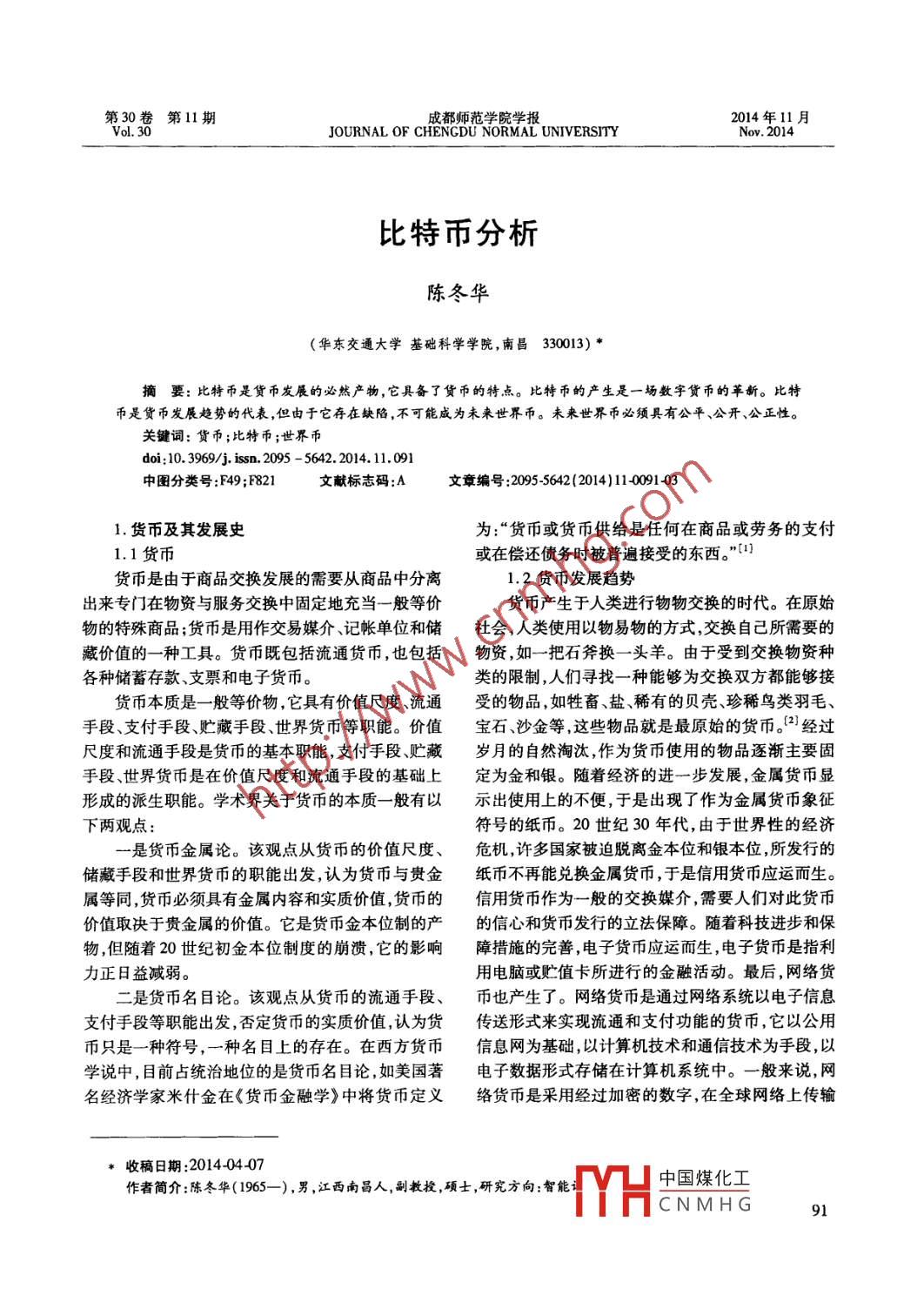 第30卷第11期成都師范學(xué)院學(xué)報(bào)2014年11月Vol 30JOURNAL OF CHENGDU NORMAL UNIVERSITYNov.2014比特幣分析陳冬華(華東交通大學(xué)基礎(chǔ)科學(xué)學(xué)院,南昌330013)*摘要:比特幣是貨幣發(fā)展的必然產(chǎn)物,它具備了貨幣的特點(diǎn)。比特幣的產(chǎn)生是一場(chǎng)數(shù)字貨幣的革新。比特幣是貨幣發(fā)展趨勢(shì)的代表,但由于它存在缺陷,不可能成為未來(lái)世界幣。未來(lái)世界幣必須具有公平、公開、公正性。關(guān)鍵詞:貨幣;比特幣;世界幣doi:10.3969/j.isn.2095-5642.2014.1l.091中圖分類號(hào):F49;F821文獻(xiàn)標(biāo)志碼:A文章編號(hào):2095-5642(2014】11-0091031.貨幣及其發(fā)展史為:“貨幣或貨幣供給是任何在商品或勞務(wù)的支付1.1貨幣或在償還債務(wù)時(shí)被普遍接受的東西。”[1貨幣是由于商品交換發(fā)展的需要從商品中分離1.2貨幣發(fā)展趨勢(shì)出來(lái)專門在物資與服務(wù)交換中固定地充當(dāng)一般等價(jià)貨幣產(chǎn)生于人類進(jìn)行物物交換的時(shí)代。在原始物的特殊商品;貨幣是用作交易媒介、記帳單位和儲(chǔ)社會(huì),人類使用以物易物的方式,交換自己所需要的藏價(jià)值的一種工具。貨幣既包括流通貨幣,也包括物資,如一把石斧換一頭羊。由于受到交換物資種各種儲(chǔ)蓄存款、支票和電子貨幣。類的限制,人們尋找一種能夠?yàn)榻粨Q雙方都能夠接貨幣本質(zhì)是一般等價(jià)物,它具有價(jià)值尺度、流通受的物品,如牲畜、鹽、稀有的貝殼、珍稀鳥類羽毛、手段、支付手段、貯藏手段、世界貨幣等職能。價(jià)值寶石、沙金等,這些物品就是最原始的貨幣。2經(jīng)過(guò)尺度和流通手段是貨幣的基本職能,支付手段貯藏歲月的自然淘汰,作為貨幣使用的物品逐漸主要固手段、世界貨幣是在價(jià)值尺度和流通手段的基礎(chǔ)上定為金和銀。隨著經(jīng)濟(jì)的進(jìn)一步發(fā)展,金屬貨幣顯形成的派生職能。學(xué)術(shù)界關(guān)于貨幣的本質(zhì)一般有以示出使用上的不便,于是出現(xiàn)了作為金屬貨幣象征下兩觀點(diǎn)符號(hào)的紙幣。20世紀(jì)30年代,由于世界性的經(jīng)濟(jì)一是貨幣金屬論。該觀點(diǎn)從貨幣的價(jià)值尺度、危機(jī),許多國(guó)家被迫脫離金本位和銀本位,所發(fā)行的儲(chǔ)藏手段和世界貨幣的職能出發(fā),認(rèn)為貨幣與貴金紙幣不再能兌換金屬貨幣,于是信用貨幣應(yīng)運(yùn)而生。屬等同,貨幣必須具有金屬內(nèi)容和實(shí)質(zhì)價(jià)值,貨幣的信用貨幣作為一般的交換媒介需要人們對(duì)此貨幣價(jià)值取決于貴金屬的價(jià)值。它是貨幣金本位制的產(chǎn)的信心和貨幣發(fā)行的立法保障。隨著科技進(jìn)步和保物,但隨著20世紀(jì)初金本位制度的崩潰,它的影響障措施的完善,電子貨幣應(yīng)運(yùn)而生,電子貨幣是指利力正日益減弱。用電腦或貯值卡所進(jìn)行的金融活動(dòng)。最后,網(wǎng)絡(luò)貨二是貨幣名目論。該觀點(diǎn)從貨幣的流通手段、幣也產(chǎn)生了。網(wǎng)絡(luò)貨幣是通過(guò)網(wǎng)絡(luò)系統(tǒng)以電子信息支付手段等職能出發(fā),否定貨幣的實(shí)質(zhì)價(jià)值認(rèn)為貨傳送形式來(lái)實(shí)現(xiàn)流通和支付功能的貨幣,它以公用幣只是一種符號(hào),一種名目上的存在。在西方貨幣信息網(wǎng)為基礎(chǔ),以計(jì)算機(jī)技術(shù)和通信技術(shù)為手段,以學(xué)說(shuō)中,目前占統(tǒng)治地位的是貨幣名目論,如美國(guó)著電子數(shù)據(jù)形式存儲(chǔ)在計(jì)算機(jī)系統(tǒng)中。一般來(lái)說(shuō),網(wǎng)名經(jīng)濟(jì)學(xué)家米什金在《貨幣金融學(xué)》中將貨幣定義絡(luò)貨幣是采用經(jīng)過(guò)加密的數(shù)字,在全球網(wǎng)絡(luò)上傳輸*收稿日期:20140407作者簡(jiǎn)介:陳冬華(1965-),男,江西南昌人,副教授,碩士,研究方向:智能H中國(guó)煤化工CNMHG成都師范學(xué)院學(xué)報(bào)2014年11月并可以脫離銀行實(shí)體的數(shù)字化交易媒介物。它的主位和信用缺失、取證和補(bǔ)救困難、管轄沖突等法律問(wèn)要形式為電子錢包、數(shù)字錢包、電子支票、電子信用題。2013年12月5日中國(guó)人民銀行聯(lián)合四部委下卡、智能卡、在線貨幣、數(shù)字貨幣等發(fā)《關(guān)于防范比特幣風(fēng)險(xiǎn)的通知》,明確界定比特幣2比特幣分析不是貨幣,是一種虛擬商品。但對(duì)比特幣非貨幣屬2.1比特幣性的認(rèn)識(shí)不應(yīng)限于不是由貨幣當(dāng)局發(fā)行、不具有法二十世紀(jì)初期,諾貝爾獎(jiǎng)經(jīng)濟(jì)學(xué)獲得者哈耶克償性與強(qiáng)制性這么兩點(diǎn)。比特幣的非貨幣屬性還應(yīng)在他的《貨幣的非國(guó)家化》中闡述了一種去國(guó)家化包括缺乏貨幣應(yīng)具備的必要信用基礎(chǔ)、未能反映特非主權(quán)貨幣的構(gòu)想,他的思想觀點(diǎn)為:廢除中央銀行定的社會(huì)生產(chǎn)關(guān)系、其購(gòu)買力的確定不具有合理性、制度,允許私人貨幣發(fā)行,并自由競(jìng)爭(zhēng)。2008年,全缺乏貨幣資產(chǎn)必需的安全保障等幾點(diǎn)。球金融危機(jī)爆發(fā),域名 bitcoin.org被匿名注冊(cè)成功。比特幣構(gòu)建于算法,它的信任基礎(chǔ)也在于算法2008年10月31日,“中本聰”在網(wǎng)站上發(fā)表了《比然而算法只