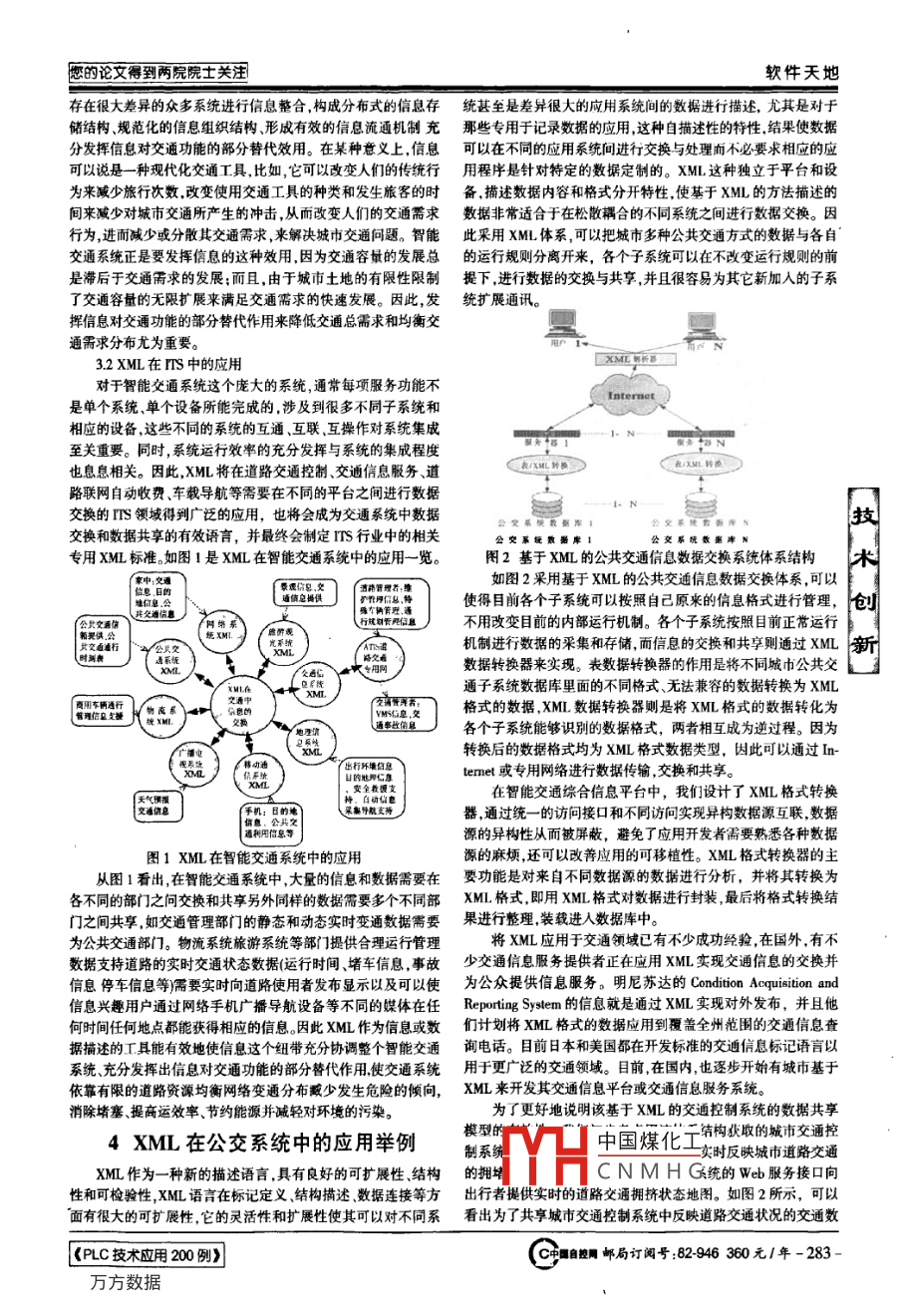 軟件天地中文核心期刊《微計算機售息》(測控自動化)2008年第24卷第31期文章編號:1008-05702008)03-1-0282-03XML在TS中的應用Application of XMl in /TS重慶郵電大學西南大學楊旺功1鄒曉霞1王霞霞2陳繼努YANG WANGGONG ZOU XIAOXIA WANG XIAXIA CHEN JINU摘要:針對我國城市智能交通系統(tǒng)建設中通信協(xié)議標準不一致而導致的互換性和交換性問題,在分析可擴展標記語言特點的基礎上,提出了利用可擴展標記語言實現(xiàn)交通教據(jù)資源在智能交遁系純中的各子系的數(shù)裾共享及交互,并探討了可擴展標記語言在智能公交系統(tǒng)中的范圍,最后舉例說明基于XML的交通控制系統(tǒng)的數(shù)據(jù)共事的有效性。關鍵詞可擴展標記語言;智能交通系統(tǒng);共享性;交互性中圖分類號:TT319文獻標識碼;BAbstract: In view of the sharing and interactivity of question which causes as a result of the correspondence agreement standard inIntelligent Transportation System construction of our country city, based on analysis of eXtensible Markup Language, We proposethe use XML to realize various subsystem data sharing and interactivity of transportation data resources in ITS, and discussed XMLKey w. pe in ITS, finally explained the validity of transportation control system data sharing based on the XML with exampleswords: XML, ITS, sharing, interactivity1引言用程序中解放出來,對于構建簡單、模塊化和松耦合系統(tǒng)提供了新的體系結構。已在許多行業(yè)得到了廣泛的應用,產(chǎn)生了很多基智能交通系統(tǒng)是在較完善的道路設施基礎上,將先進的電于XML的專業(yè)標識語言。集成運用于地面交通管理所建立的一種安時準確,高效大范圍全方位發(fā)描述的數(shù)據(jù)可以被計算機理解、傳輸和按照數(shù)據(jù)內容執(zhí)行相應揮作用的交通運輸管理系統(tǒng)。它是充分發(fā)揮現(xiàn)有交通基礎設施的操作。比如處理數(shù)據(jù)、按一定方式顯示信息、存儲數(shù)據(jù)和對外的潛力提高運輸效率保障交通安全緩解交通擁擠的有力措場設備發(fā)布控制指令等。當然XML不同于我們常用的計算機施。城市交通控制系統(tǒng)依靠先進的交通數(shù)據(jù)采集技術產(chǎn)生了大編程語言,這些編程語言是用來制定運算和操作的,而XML是量的實時或非實時交通數(shù)據(jù)這些數(shù)據(jù)使用后往往被丟棄或以說明性的語言是用來表現(xiàn)信息的,使得信息能被程序正常地存不同的專用格式存儲致使這些寶貴的交通數(shù)據(jù)資源不能很好儲傳輸和處理,就它本身而言并不能產(chǎn)生什么操作,操作仍要的被智能交通系統(tǒng)S的其它子系統(tǒng)共享或進行數(shù)據(jù)深層挖由應用程序來實現(xiàn)。xML作為純數(shù)據(jù)描述語言和與編程語言、掘。因此要充分發(fā)揮信息在TS中的效用就必須利用一種通操作系統(tǒng)或傳輸協(xié)議無關的特性,使它非常適合于應用程序之用的數(shù)據(jù)格式將數(shù)據(jù)描述成非專有的格式以提高信息在系統(tǒng)間的數(shù)據(jù)交換,為軟件系統(tǒng)的開發(fā)提供真正的有開放標準和自中的互換性和共享性。描述數(shù)據(jù)控制的多層分布式系統(tǒng)它的靈活性和擴展性使其可XMLeXtensible Markup Language,可擴展標記語言)正是適以對不同應用甚至是差異很大的應用間的數(shù)據(jù)進行描述。xML應這種通用格式的數(shù)據(jù)描述、進行信息交換和共享的語言體能允許許多的個人與組織來創(chuàng)建自己的行業(yè)標識語言,應用這系。為了有效地利用交通控制系統(tǒng)產(chǎn)生的實時和非實時交通數(shù)些標識語言他們就可以在自己的領域內自由地交換信息。xML據(jù),本文在分析XML特點的基礎上,依據(jù)城市交通控制系統(tǒng)種獨立于平臺和設備、描述數(shù)據(jù)內容和格式分開特性使基于般結構構建了以XM為數(shù)據(jù)交換格式來提取現(xiàn)有交通控制系xML的方法描述的數(shù)據(jù)非常適合于在松散耦合的不同系統(tǒng)之統(tǒng)中的數(shù)據(jù)數(shù)據(jù)從這些專用系統(tǒng)中提取后可被進一步挖掘或間進行數(shù)據(jù)交換。因此,對于城市交通信號控制系統(tǒng)中大規(guī)模供其他平臺使用。的分布式實時交通數(shù)據(jù)自動交換和對外場設備的控制這一個關2XML技術介紹鍵需求XML作為計算機可理解的數(shù)據(jù)描述、分布式數(shù)據(jù)存儲和數(shù)據(jù)交換格式將是對現(xiàn)存系統(tǒng)不進行替換的開放標準KML的開發(fā)動機來自于Web服務的方式,同HML也是 SGML(Standard Generalized Markup Language,標準通3XML的應用記語言)的一個簡化子集。XML良好的可擴展性使信息提供者3l信息與rS可根據(jù)自己的需求來定義任意的標記數(shù)據(jù)經(jīng)XML處理后簡單易讀,且易于由其他應用進行處理XM把數(shù)據(jù)從創(chuàng)建它的應門多,中國煤化工部門的信息采集共享楊旺功:碩士研究生和管理CNMHGITS系統(tǒng)來講,重點需基金項目:2004年國家科技型中小企業(yè)技術創(chuàng)新基金項目要解決的問題是信息共享問題。也就是說,各子系統(tǒng)所采集的(0426225110220)信息將提供給整個系統(tǒng)共享。即如何有效地對性質功能、結構-282-360元/年郵局訂閱號:82946《現(xiàn)場總線技術應用200例》您的論文得到兩院院士關注軟件天地存在很大差異的眾多系統(tǒng)進行信息整合構成分布式的信息存統(tǒng)
