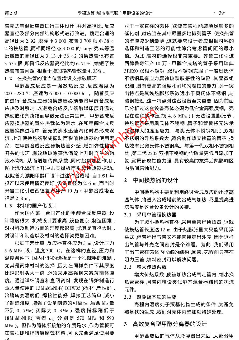 城市煤氣聯(lián)產(chǎn)甲醇設(shè)備的設(shè)計