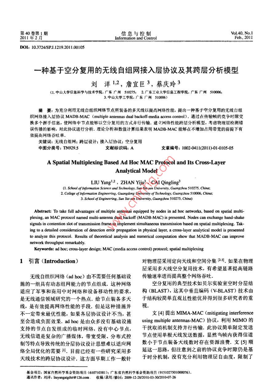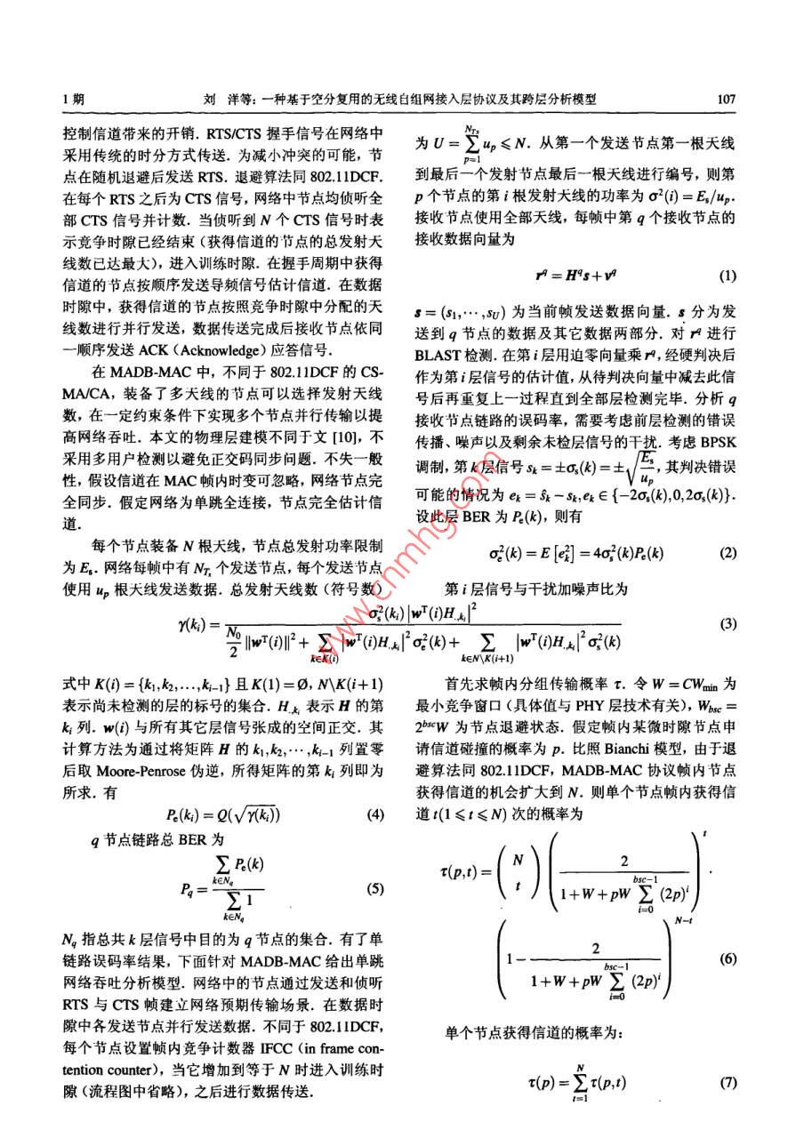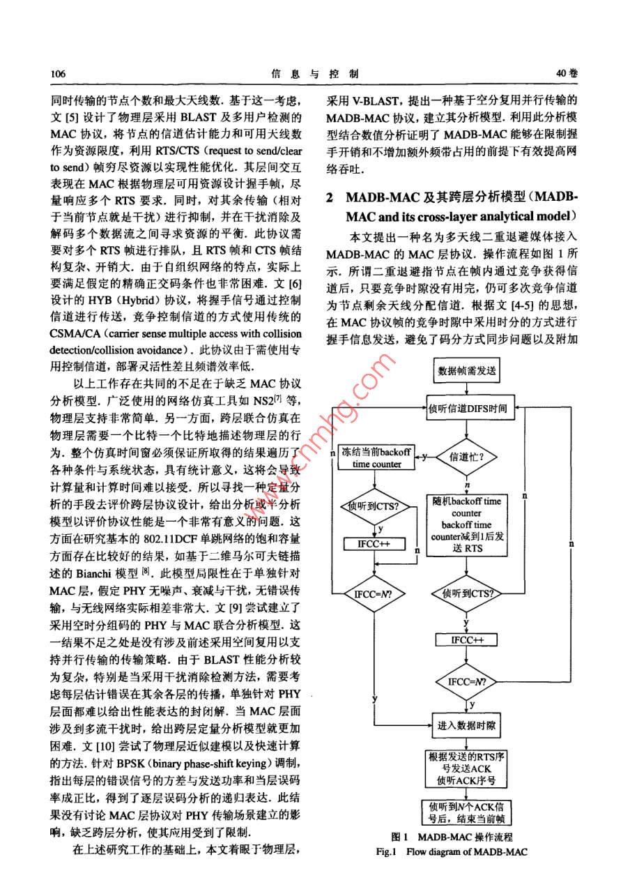 第40卷第1期2011年2月信息與控制Information and ControlFebDoI:10.3724/SPJ.1219201100一種基于空分復用的無線自組網(wǎng)接入層協(xié)議及其跨層分析模型劉洋12,詹宜巨3,蔡慶玲3(1中山大學信息科學與技術學院,廣東廣州510275;2廣東工業(yè)大學信息工程學院,廣東廣州5100063.中山大學工學院,廣東廣州510006)摘要:為充分利用無線自組織網(wǎng)絡節(jié)點所裝備的多天線以提高網(wǎng)絡性能,提出一種基于空分復用的無線日組織網(wǎng)絡接入層協(xié)議 MADB-MAO( multiple antennas dual backoff-media access control).通過在傳輸幀的競爭時隙交換多個握手信總,使網(wǎng)絡中節(jié)點能夠以空分復用的方式并行傳輸。建饑網(wǎng)絡性能跨層分析模型,考慮物理層檢測錯誤傳播的影響,對此協(xié)議進行分析.理論分析和數(shù)值計算結果表明 MADB-MAC能夠在不增加占用帶寬的前提下有效提高網(wǎng)絡吞吐率關鍵詞:無線自組網(wǎng):跨層設計;接入層協(xié)議:空分復用中圖分類號:TN9295文獻標識碼:A文章編號:10020411(2011)0140105-05A Spatial Multiplexing Based Ad Hoc MAC Protocol and Its Cross-LayerAnalytical ModelLIU Yang,2, ZHAN Yiju, CAI Qingling(1. School of information Science and Technology, Sun Yat-sen University, Guangzhou 510275, China:2. College of Information Engineering, Guangdong Universiry of Technology, Guangzhou 510006, China,3. School of Engineering, Sun Yat-sen Universiry, Guangzhou 510275, China)Abstract: To take full advantages of multiple antennas equipped by nodesplexing, an MAC protocol named multi-antenna dual backoff (MADB-MAC) is presented. Nodes can exchange hand-shakesignals in contention slot of transmission frame to implement simultaneous transmission based on spatial multiplexing to a detailed consideration of detection emor propagation in physical layer, a cross-layer analytical model isto analyze this protocol. Results of theoretical analysis and numerical computation show that MADB-MAC canetwork throughput remarkably.Keywords: ad hoc; cross-layer design; MAC (media access control) protocol; spatial multiplexing1引言( Introduction)對物理層采用定向天線和空間分集2習.如果在物理層采用多大線空分復用技術,有希望顯著提高鏈路無線自組織網(wǎng)絡( ad hoc)由不需要任何基礎設傳輸速率進而提高整個網(wǎng)絡吞吐施的一組具有動態(tài)組網(wǎng)能力的節(jié)點組成.這種網(wǎng)絡空分復用的典型技術如貝爾實驗室空時分層結適應了軍事和商用中對網(wǎng)絡和設備移動性的要求,構( BLAST),這其中垂直編碼( V-BLAST)技術由是無線通信領域研究的一個熱點.給節(jié)點裝備多天于結構較簡單直觀且性能優(yōu)異得到很多研究者的重線,是有效提高網(wǎng)絡性能的手段.但是這種措施并視不一定帶來最優(yōu)性能,如果各層協(xié)議設計不當,甚文[4]提出 MIMA-MAC( mitigating interference至會造成負面效果. ad hoc是由眾多沒有基礎設施 using multiple antennas-MAC)協(xié)議,利用MIMO的支持的節(jié)點自發(fā)組成的臨時網(wǎng)絡,沒有中心節(jié)點,干擾取消機制支持并行傳輸.此協(xié)議簡單限定發(fā)送無線信道是復雜的廣播媒體,帶寬受限、分布式控節(jié)點使用單根大線發(fā)送數(shù)據(jù),顯然當幀內(nèi)獲得信道制等特點導致傳統(tǒng)的分層協(xié)議設計思想難以適應網(wǎng)數(shù)小于節(jié)點裝備大線數(shù)時存在資源浪費文S順絡全局優(yōu)化的需要叫.目前已經(jīng)有一些研究采用多延這一思路,但注意到之前的協(xié)議競爭時隙仍是基天線技術的跨層協(xié)議設計,這方面早期工作一般針于時分機制,沒有充分利用物理層自由度,限制了基金項目:園家自然科學基金資助項月(610710381);廣東省自然科學基金資助項日(9151027501000076)通訊作者:劉洋, liuyangatgdute@126c0m,收稿/錄用/修山:2001228201003-302010407-26信息與控制40卷同時傳輸?shù)墓?jié)點個數(shù)和最大天線數(shù).基于這一考慮,采用 V-BLAST,提出一種基于空分復用并行傳輸?shù)奈腫5]設計了物理層采用 BLAST及多用戶檢測的MADB-MAC協(xié)議,建立其分析模型.利用此分析模MAC協(xié)議,將節(jié)點的信道估計能力和可用天線數(shù)型結合數(shù)值分析證明了MADB-MAC能夠在限制握作為資源限度,利用 RTS/CTS( request to send/clear手開銷和不增加額外頻帶占用的前提下有效提高網(wǎng)to send)幀窮盡資源以實現(xiàn)性能優(yōu)化.其層間交互絡吞吐.表現(xiàn)在MAC根據(jù)物理層可用資源設計握手幀,盡量響應多個RTS要求.同時,對其余傳輸(相對2 MADB-MAC及其跨層分析模型(MADB于當前節(jié)點就是干擾)進行抑制,并在干擾消除及MAC and its cross-layer analytical model解碼多個數(shù)據(jù)流之間尋求資源的平衡,此協(xié)議需本文提出一種名為多天線二重退避媒體接入要對多個RTS幀進行排隊,且RTS幀和CTs頓結 MADB-MAC的MAC層協(xié)議.操作流程如圖1所構復雜、開銷大.由于自組織網(wǎng)絡的特點,實際上示,所謂二重退避指節(jié)點在幀內(nèi)通過競爭獲得信要滿足假定的精確正交碼條件也非常困難文]道后,只要競爭時隙沒有用完,仍可多次競爭信道設計的HYB( Hybrid)協(xié)議,將握手信號通過控制為節(jié)點剩余天線分配信道,根據(jù)文45]的思想,信道進行傳送,競爭控制信道的方式使用傳統(tǒng)的在MAC協(xié)議幀的競爭時隙中采用時分的方式進行CSMA/CA(carrier sense multiple access with collision握手信息發(fā)送,避免了碼分方式同步問題以及附加detection/collision avoidance).此協(xi