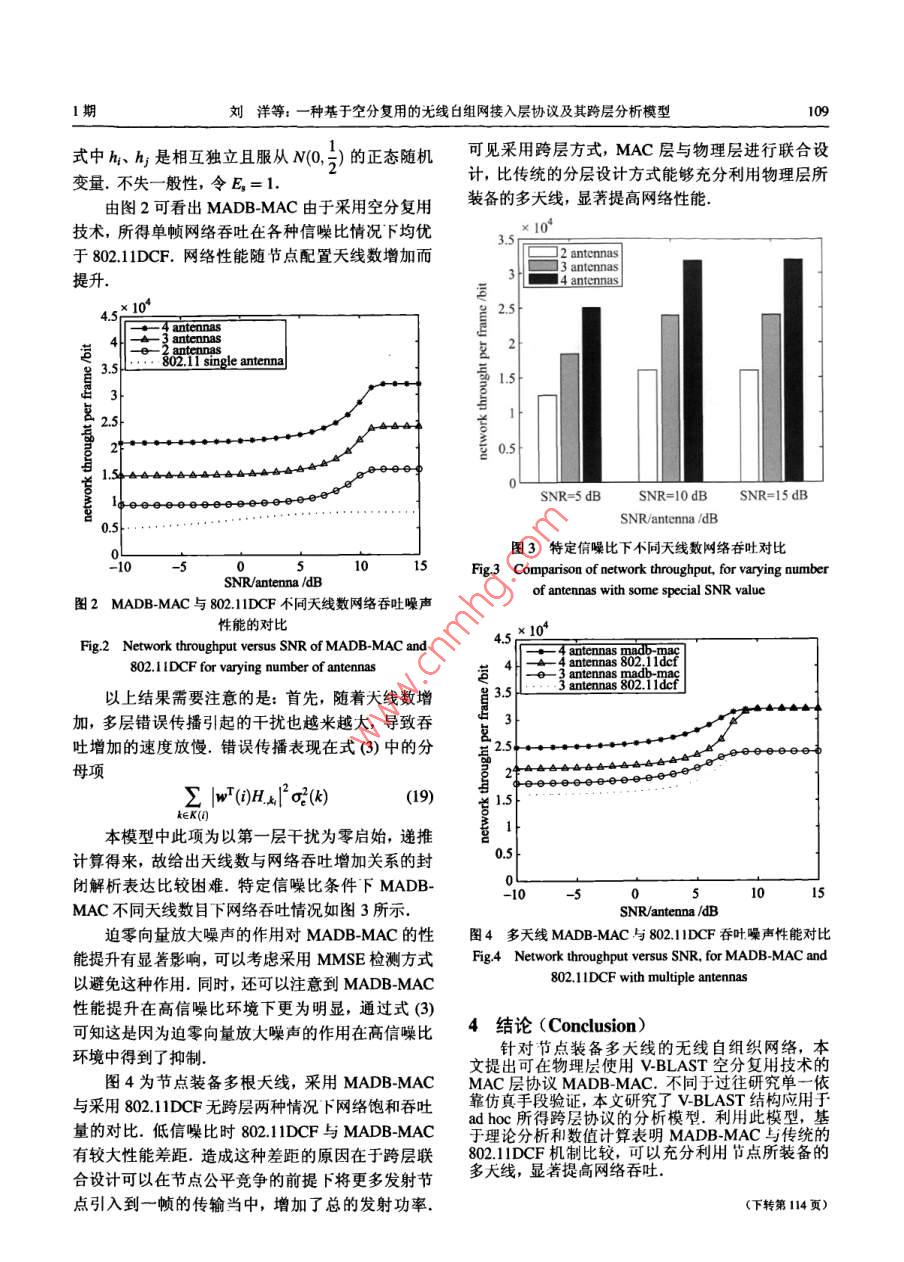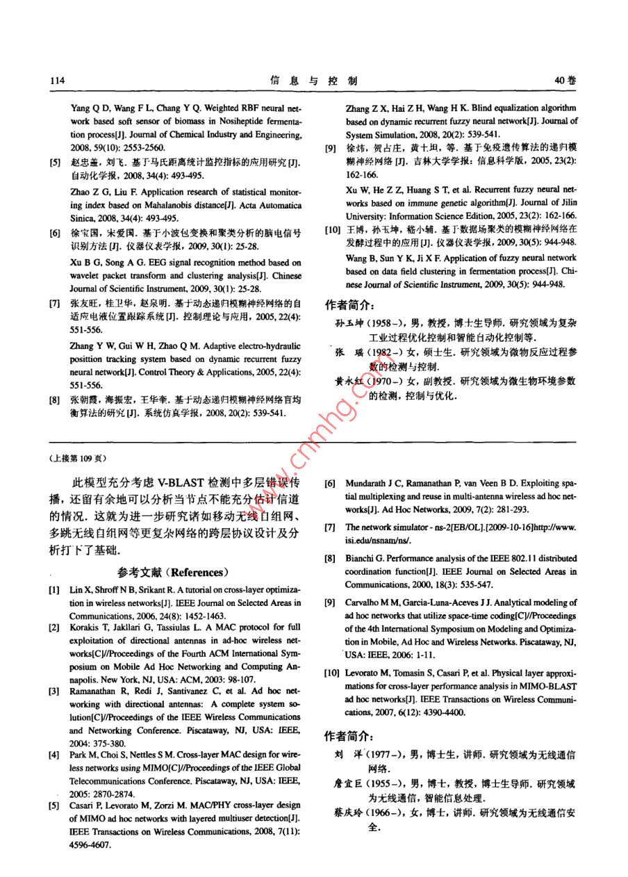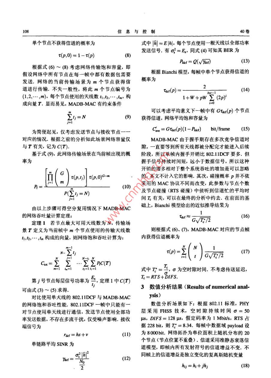 第40卷第1期2011年2月信息與控制Information and ControlFebDoI:10.3724/SPJ.1219201100一種基于空分復用的無線自組網(wǎng)接入層協(xié)議及其跨層分析模型劉洋12,詹宜巨3,蔡慶玲3(1中山大學信息科學與技術學院,廣東廣州510275;2廣東工業(yè)大學信息工程學院,廣東廣州5100063.中山大學工學院,廣東廣州510006)摘要:為充分利用無線自組織網(wǎng)絡節(jié)點所裝備的多天線以提高網(wǎng)絡性能,提出一種基于空分復用的無線日組織網(wǎng)絡接入層協(xié)議 MADB-MAO( multiple antennas dual backoff-media access control).通過在傳輸幀的競爭時隙交換多個握手信總,使網(wǎng)絡中節(jié)點能夠以空分復用的方式并行傳輸。建饑網(wǎng)絡性能跨層分析模型,考慮物理層檢測錯誤傳播的影響,對此協(xié)議進行分析.理論分析和數(shù)值計算結果表明 MADB-MAC能夠在不增加占用帶寬的前提下有效提高網(wǎng)絡吞吐率關鍵詞:無線自組網(wǎng):跨層設計;接入層協(xié)議:空分復用中圖分類號:TN9295文獻標識碼:A文章編號:10020411(2011)0140105-05A Spatial Multiplexing Based Ad Hoc MAC Protocol and Its Cross-LayerAnalytical ModelLIU Yang,2, ZHAN Yiju, CAI Qingling(1. School of information Science and Technology, Sun Yat-sen University, Guangzhou 510275, China:2. College of Information Engineering, Guangdong Universiry of Technology, Guangzhou 510006, China,3. School of Engineering, Sun Yat-sen Universiry, Guangzhou 510275, China)Abstract: To take full advantages of multiple antennas equipped by nodesplexing, an MAC protocol named multi-antenna dual backoff (MADB-MAC) is presented. Nodes can exchange hand-shakesignals in contention slot of transmission frame to implement simultaneous transmission based on spatial multiplexing to a detailed consideration of detection emor propagation in physical layer, a cross-layer analytical model isto analyze this protocol. Results of theoretical analysis and numerical computation show that MADB-MAC canetwork throughput remarkably.Keywords: ad hoc; cross-layer design; MAC (media access control) protocol; spatial multiplexing1引言( Introduction)對物理層采用定向天線和空間分集2習.如果在物理層采用多大線空分復用技術,有希望顯著提高鏈路無線自組織網(wǎng)絡( ad hoc)由不需要任何基礎設傳輸速率進而提高整個網(wǎng)絡吞吐施的一組具有動態(tài)組網(wǎng)能力的節(jié)點組成.這種網(wǎng)絡空分復用的典型技術如貝爾實驗室空時分層結適應了軍事和商用中對網(wǎng)絡和設備移動性的要求,構( BLAST),這其中垂直編碼( V-BLAST)技術由是無線通信領域研究的一個熱點.給節(jié)點裝備多天于結構較簡單直觀且性能優(yōu)異得到很多研究者的重線,是有效提高網(wǎng)絡性能的手段.但是這種措施并視不一定帶來最優(yōu)性能,如果各層協(xié)議設計不當,甚文[4]提出 MIMA-MAC( mitigating interference至會造成負面效果. ad hoc是由眾多沒有基礎設施 using multiple antennas-MAC)協(xié)議,利用MIMO的支持的節(jié)點自發(fā)組成的臨時網(wǎng)絡,沒有中心節(jié)點,干擾取消機制支持并行傳輸.此協(xié)議簡單限定發(fā)送無線信道是復雜的廣播媒體,帶寬受限、分布式控節(jié)點使用單根大線發(fā)送數(shù)據(jù),顯然當幀內(nèi)獲得信道制等特點導致傳統(tǒng)的分層協(xié)議設計思想難以適應網(wǎng)數(shù)小于節(jié)點裝備大線數(shù)時存在資源浪費文S順絡全局優(yōu)化的需要叫.目前已經(jīng)有一些研究采用多延這一思路,但注意到之前的協(xié)議競爭時隙仍是基天線技術的跨層協(xié)議設計,這方面早期工作一般針于時分機制,沒有充分利用物理層自由度,限制了基金項目:園家自然科學基金資助項月(610710381);廣東省自然科學基金資助項日(9151027501000076)通訊作者:劉洋, liuyangatgdute@126c0m,收稿/錄用/修山:2001228201003-302010407-26信息與控制40卷同時傳輸?shù)墓?jié)點個數(shù)和最大天線數(shù).基于這一考慮,采用 V-BLAST,提出一種基于空分復用并行傳輸?shù)奈腫5]設計了物理層采用 BLAST及多用戶檢測的MADB-MAC協(xié)議,建立其分析模型.利用此分析模MAC協(xié)議,將節(jié)點的信道估計能力和可用天線數(shù)型結合數(shù)值分析證明了MADB-MAC能夠在限制握作為資源限度,利用 RTS/CTS( request to send/clear手開銷和不增加額外頻帶占用的前提下有效提高網(wǎng)to send)幀窮盡資源以實現(xiàn)性能優(yōu)化.其層間交互絡吞吐.表現(xiàn)在MAC根據(jù)物理層可用資源設計握手幀,盡量響應多個RTS要求.同時,對其余傳輸(相對2 MADB-MAC及其跨層分析模型(MADB于當前節(jié)點就是干擾)進行抑制,并在干擾消除及MAC and its cross-layer analytical model解碼多個數(shù)據(jù)流之間尋求資源的平衡,此協(xié)議需本文提出一種名為多天線二重退避媒體接入要對多個RTS幀進行排隊,且RTS幀和CTs頓結 MADB-MAC的MAC層協(xié)議.操作流程如圖1所構復雜、開銷大.由于自組織網(wǎng)絡的特點,實際上示,所謂二重退避指節(jié)點在幀內(nèi)通過競爭獲得信要滿足假定的精確正交碼條件也非常困難文]道后,只要競爭時隙沒有用完,仍可多次競爭信道設計的HYB( Hybrid)協(xié)議,將握手信號通過控制為節(jié)點剩余天線分配信道,根據(jù)文45]的思想,信道進行傳送,競爭控制信道的方式使用傳統(tǒng)的在MAC協(xié)議幀的競爭時隙中采用時分的方式進行CSMA/CA(carrier sense multiple access with collision握手信息發(fā)送,避免了碼分方式同步問題以及附加detection/collision avoidance).此協(xi
