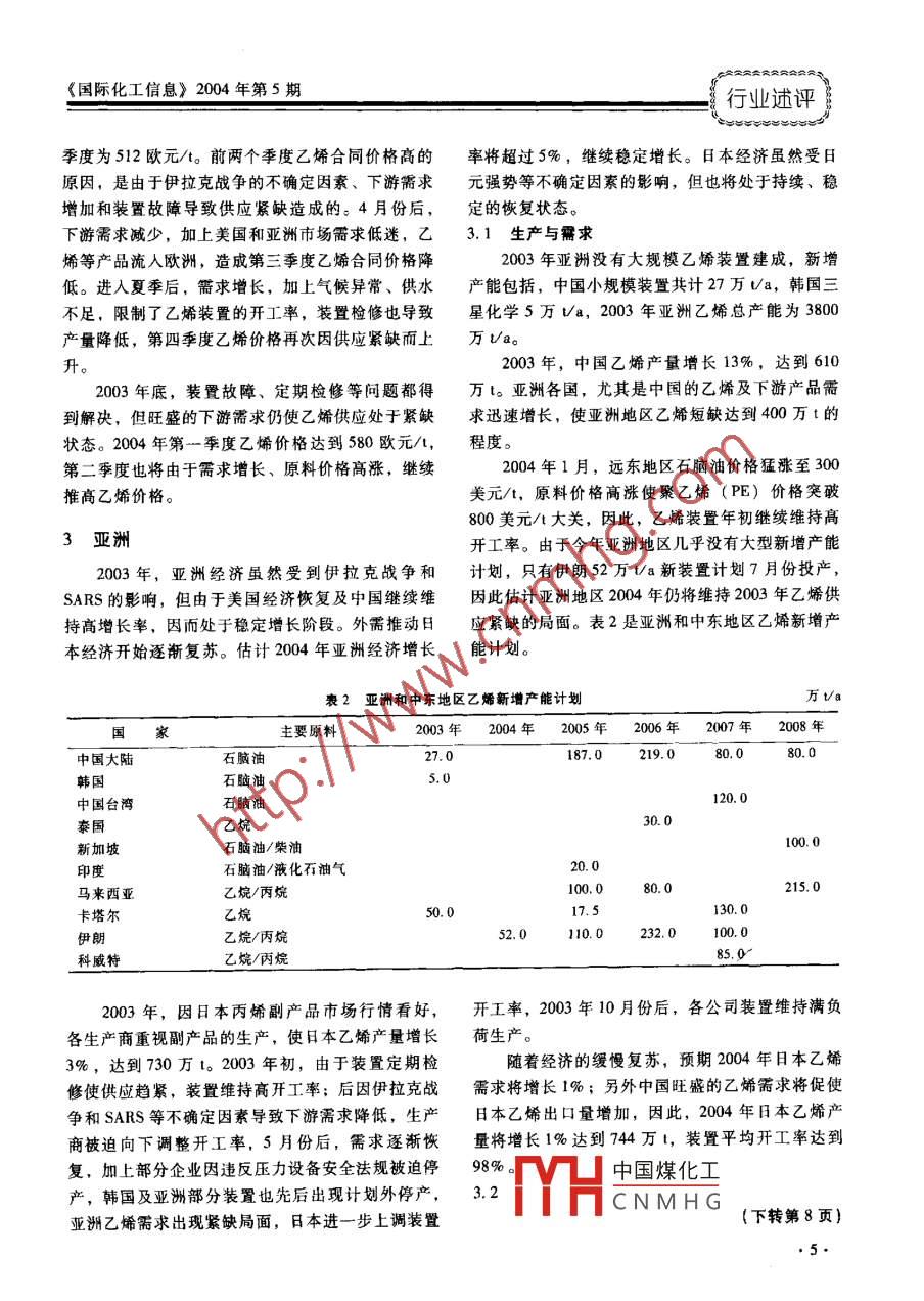 《國際化工信息》2004 年第5期行業(yè)述評全球乙烯生產與需求前景樂觀李靜文摘要: 2003年上半年,受伊拉克戰(zhàn)爭和SARS影響,乙烯需求減少;戰(zhàn)爭導致的原材料價格高漲,迫使生產企業(yè)調低裝置開工率。下半年,隨著全球經濟全面復蘇,乙烯需求開始增長并出現短缺局面;導致2003年底出現乙烯價格增長并持續(xù)到2004年初。2004 年全球基本上沒有大型新建裝置的投產計劃,加上原料乙烷和石腦油價格繼續(xù)攀高,預期2004年乙烯供應仍將處于短缺狀態(tài),并將導致價格不斷攀升。關鍵詞:乙烯;產能;下游產品;開工率2003年上半年,受伊拉克戰(zhàn)爭和SARS影響,2004年,美國經濟穩(wěn)步復蘇,發(fā)達國家經濟世界經濟處于一種不確定的發(fā)展狀態(tài);下半年隨著也開始逐漸恢復,以中國為首的亞洲國家經濟繼續(xù)美國經濟的全面復蘇,全球經濟迅速步人恢復狀堅挺,預計對乙烯的需求將會進一步增長。2004態(tài),對化工產品的需求也開始恢復增長。但原料價年基本上沒有大型新建裝置的投產計劃,只有部分格高漲使乙烯生產受到一定影響,美國天然氣價格中小規(guī)模新裝置可能投人運營,因此乙烯供需平衡不斷攀升導致產品競爭力下降,乙烯產量降低;歐將持續(xù)2003年底的緊缺狀況。結果是裝置開工率洲乙烯產量基本持平;亞洲則繼續(xù)增長。估計進一步提高。預計2004年乙烯產量將增長4.1%,2003年全球乙烯產量比上年增長3.4%,達到達1.02億t。表1是世界乙烯產能、產量和開工率9800萬t。等情況。表1世界乙烯產量和產 能萬Va2003年2004年2004年-2003年產能產量開工率,% 產能產量開工率,%產能開工率,%北美合計3550289083520307087-30美國89023002860245086306加拿大、墨西哥6605908962090亞太合計)70110310010日本77074096760-10中國大陸90韓國550560中國臺灣290270280亞太其他地區(qū)91086095870中東地區(qū)880)69403(4403607039083南美歐洲208039236015020東歐、獨聯體64057670其他地區(qū)16012075中國煤化工。合計111509830MYHCNMHG●3.行業(yè)述評《國際化工信息》2004 年5月2003年,美國乙烯合同價格平均為28.5美分1美國/磅,比2002年平均價格高5美分/磅。1月份價2003年上半年,伊拉克戰(zhàn)爭和對恐怖襲擊的格為26. 25美分/磅,但由于原料價格高漲、裝置擔心等諸多不確定因素,影響了美國經濟2002年開工率降低、加上定期檢修等原因,5月份合同價底出現的發(fā)展勢頭。5月開始,美國減稅措施開始格漲到31美分/磅。隨后,由于下游產品需求降見效,第三季度美國實際GDP增長率達到8. 2%,低,價格恢復到年初水平。隨著需求的逐漸恢復價經濟步入全面恢復進程。格緩慢增長,但第四季度由于多套裝置進行檢修,2004年,美國經濟將繼續(xù)恢復,但地緣政治、12月份合同價格再次升至29.5 美分/磅的水平。原油和天然氣價格高漲、美元疲軟及中東地區(qū)不斷估計2004年的基本趨勢是,需求繼續(xù)增長,升級的恐怖襲擊等,將對美國經濟產生多大影響,價格維持較高水平。與2003年相同的是,邊際利目前還很難確定。潤將進一步惡化。1.1 生產與需求2000年和2001年,美國乙烯產量連續(xù)降低,2歐洲2002年開始轉為增產,2003年由于天然氣持續(xù)維2003年上半年,歐洲經濟基本處于零增長狀持高價格,產品競爭力低下,開工率不得不降低到態(tài),下半年隨著美國經濟的復蘇,出口開始恢復。80%的低水平,乙烯產量比上年減少2.8%,以乙但與不斷增長的外需相比,歐洲內部需求基本處于烷為原料1的裂解裝置產量降低8%。停滯狀態(tài)。雖然下半年經濟開始復蘇,乙烯需求出現增預計2004年,外需將推動歐洲經濟緩慢恢復,長,但全年需求量基本維持或略低于2002年的需但強勢歐元對出口和經濟的影響還不確定。德國經求水平。其中,環(huán)氧乙烷(EO) /億二醇(EG)濟依然低迷,失業(yè)率很高,實施減稅政策的效果尚對乙烯的需求增長6%; a-烯烴增長5.5%;二氯不能確定,但整體經濟基本處于恢復狀態(tài)。估計歐乙烷(EDC) /氯乙烯單體(VCM) 和高密度聚乙元區(qū)經濟的整體增長率為1. 5%。烯(HDPE)等產品對乙烯的需求則減少約4%。2.1 生產與需求總需求減少約0.5%。2003年歐洲乙烯產量比上年增長2.9%,按裝預期2004年隨著美國經濟的持續(xù)恢復,乙烯置產能計算的名義開工率為89%,實際開工率達需求將不斷增長。但是,美國乙烯生產商仍面臨多到95%,高于2002年。2003年2季度,陶氏化學年來的同樣問題,即原料價格持續(xù)高漲,天然氣價-套34萬/a新線性低密度聚乙烯(LLDPE)裝格達到令人難以接受的程度。美國乙烯裝置多以乙置投產,LLDPE產能比上年提高17%。2003 年11烷為原料,天然氣價格的增長嚴重影響了乙烯的競月,FAO位于安特衛(wèi)普的17萬t/a乙烯裝置開始爭力。估計2004年美國將增加以石腦油為原料的試車,2004 年正式投產。乙烯裝置的生產,總產量將增長6%。2004年,預計歐洲乙烯需求將隨著經濟的緩2003年7月,陶氏化學位于得克薩斯城、以慢增長而增長, 增長率為2.5%。 但由于歐洲沒有乙烷為原料的33萬t/a 裝置停運;殼牌以石腦油新增產能計劃,估計該地區(qū)將處于供應緊缺局面。為原料、位于鹿港的55萬Va乙烯裂解裝置計劃因此,裝置將維持高開工率,名義開工率達到今年3月投產;美國乙烯總體上仍處于產能過剩的91%,實際開工率高達96%。狀態(tài),因此開工率將維持85%左右的低水平。2.2原料與市場2003年,原料石腦油價格隨原油價格高漲而.1.2 原料和市場