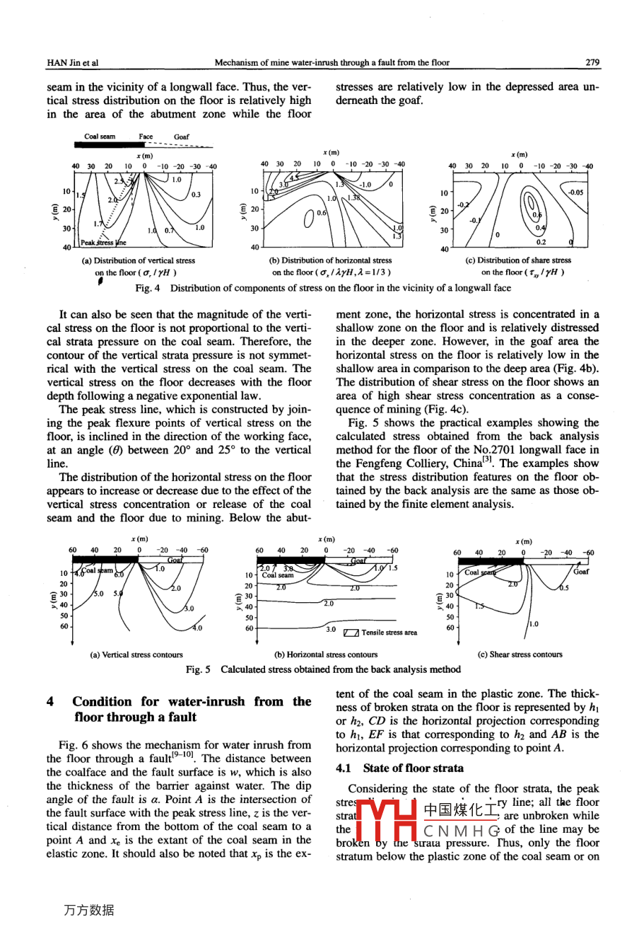 Available online at www.sciencedirect.comMININGScienceDirectSCIENCE ANDTECHNOLOGYEL SEVIER,Mining Science and Technology 19 (2009) 0276- 0281www.clsevier.com/locate/jcumtMechanism of mine water -inrush through a fault from the floorHAN Jin', SHI Long-qing', YU Xiao-ge', WEI Jiu-chuan', LI Shu-cai2'College of Information Science and Engineering, Shandong University of Science and Technology, Qingdao,Shandong 266510, ChinaGeotechrical & Structural Engineering Technique Center, Ji 'nan, Shandong 250061, ChinaAbstract: The mechanism of mine water inrushes in coal mines in China differs considerably from that in other countries. In China,most water inrushes occur from floor strata, where the water-inrush sources are karstic limestone aquifers. Our study describes themechanism of mine water inrushes through a fault in the mine floor using principles of strata mechanics and the path of water in-rush from an aquifer to the working face. A criterion to judge whether a ground water inrush will occur through a fault or not is alsodescribed, together with a case history of water inflow in the Feicheng coalfield, China.Keywords: fault; water-nrush; mechanism; Feicheng coalfield1 Introductioncontributes 4.9%, flooding caused by alluvial wateraccounts for 1.4%, and inflows caused by sandstoneThere are very few cases of water inrushes fromaquifers account for 1.4%. The principal limestonethe floor in major mining countries such as the Unitedaquifer is Ordovician and is distributed extensively inStates, Russia, Poland, Canada, Australia, Germany,northern China. About 75% of the coal production inIndia and the United Kingdom". In these countries,China comes from that region, where about 50% ofthe incidence of mine water inflow can generally bethe coal reserves are mined from coal seams of theatributed to a large number of various cause, such asPermian and Carboniferous Systems. These strata liea sudden inflow of surface water accidental contactsuncomfortably on the Ordovician limestone, which iswith unconsolidated surface deposits during workabout 800 m thick; there are no Silurian and Devo-development, strata water entering working faces, anian strata in northern China. After nearly a centuryshaft encountering a confined aquifer during sinkingf mining, most Chinese mines have been extractingoperations, clearing of old shafts, contacting aban-deeper coal seams, especially those coal seams lo-doned mine workings, failure of underground watercated in the Permian and Carboniferous Systems.dams and seals or leakage of water from an aquiferBecause the distance between the current mining ho-through a bore hole'4. The main method for the con-rizons and Ordovician limestone is only 20~40 m,trol of mine water inflow in these countries is the ap-geological structures such as faults play an importantplication of various mine dewatering techniques.role in controlling the inflow of karst water into theIn contrast, more than 90% of water inrushes inmine workings.Chinese coal mines are due to water inflow fromkarst aquifers through coal seam floors. The main2 Distribution of strata pressure on a coaltechnique for controlling water inrush through theseam as a consequence of miningfloor is to leave a sufficiently thick barrier against theaquifer and/or grouting of the floor". Coal mine in-There are two patterns of vertical strata pressureundations in China can be divided into four categories,distribution on a coal seam, corresponding to differ-according to the source of the mine water inrush. In-ent mining depths and coal seam strengths. One of theundations caused by limestone aquifer account forpattermns is the single elastic distribution shown in Fig.92.3% of the cases, flooding caused by surface waterlal4 o!. The main characteristic of this stress distribu-Received 19 August 2008; accepted 22 January 2009Projects Y2007F46 supported by the Natural Science Foundaion of Shandong Province中國煤化工Scsn see RecFoundation of the Ministry of Education, 108158 by the Key Project of the Ministry CCNMHGhe National Natural ScienceFoundation of China:MYHCorresponding author. Tel: +86 532 80691759; E-mail adress: shilq@ sdust.edu.cnHAN Jinet alMechanism of mine water inrush through a fault from the floortion is that peak vertical strata pressure is centralizednot break the coal seam and associated floor strata.on the fringes of the coal face. The pressure decreasesTherefore, the floor strata remain intact and wa-in accordance with a negative exponential law to-ter-resistant. The second pattern of vertical stratawards the solid coal; the coal seam is in a state ofstress distribution on a coal seam is based on bothelastic compression and the stress on the coal seam iselastic and plastic stress distribution and the forma-proportional to its elastic deformation. Because thetion of a yield zone in the coal seam ahead of the face,vertical strata pressure does not exceed the compres-as shown in Fig. 1b7.sive strength of the coal seam, the strata pressure doesVertical strata pessureVertical strata pressureFaceGoafw.w Face.. Goa......Coal seamElasticCoal scam(a. Elastic zone-. Elastic zone -Fig.1 Distribution of vertical strata pressure on coal seamIn the elastic zone, the coal seam undergoes elasticσ=σ +k,σ3(1deformation and the peak vertical strata pressure OC-where k。 =1+sin中σ is the ultimate strength ofcurs on the interface of the elastic and plastic zones.1 - sinpThe stress gradually decreases towards the solid coalthe coal seam, o。the minimum principal stress, φuntil it attains the original virgin state of verticalstress. The stress in this zone is also proportional tothe internal friction angle of the coal seam obtainedthe elastic deformation of the coal seam. Therefore,from laboratory tests and σ。the uniaxial compres-the floor beneath this stressed zone does not undergosion strength of coal as obtained from laboratorypermanent deformation. In the plastic zone, in con-tests.trast, the coal seam suffers permanent de