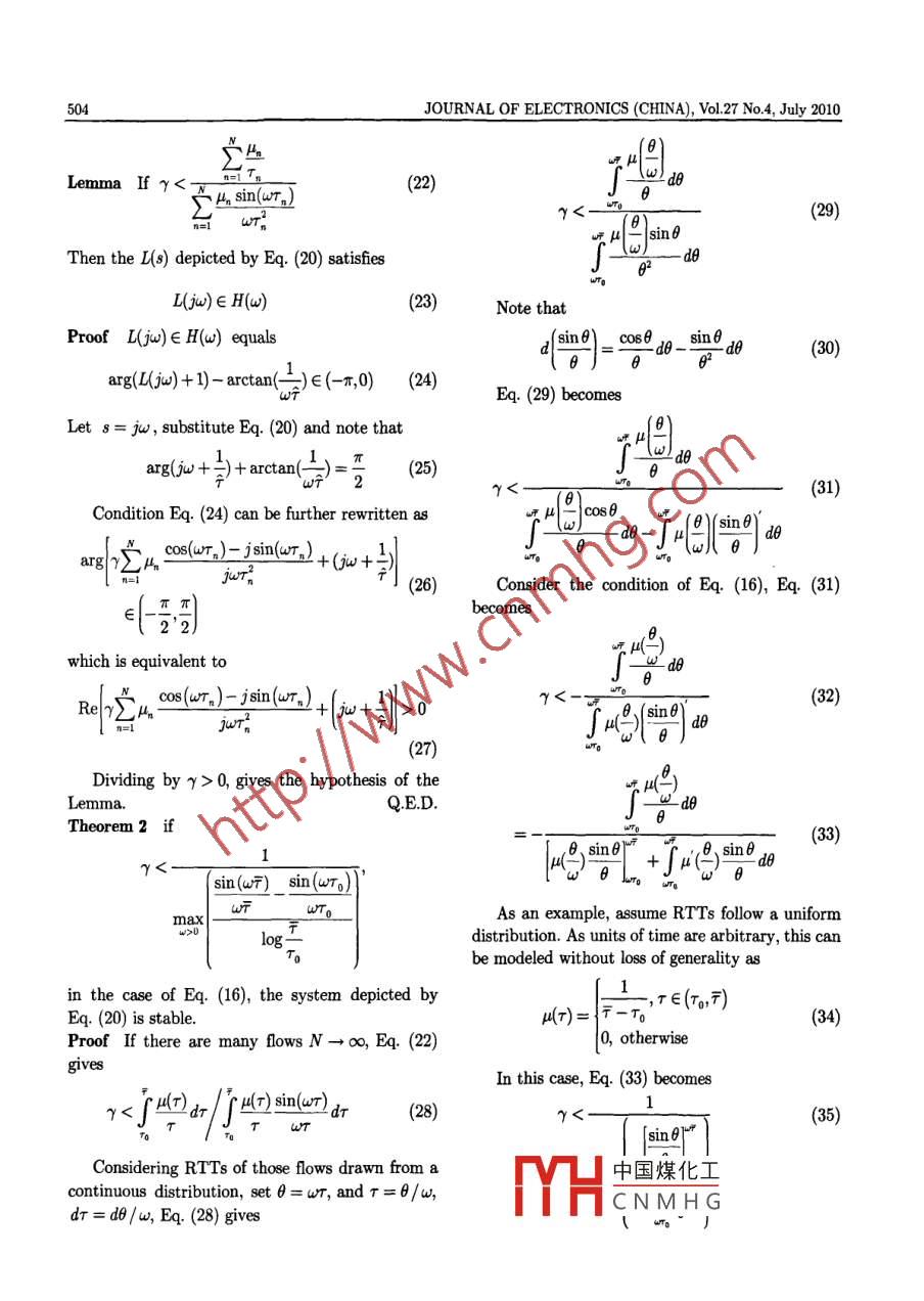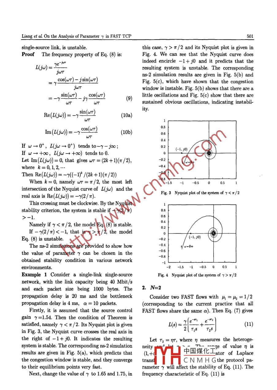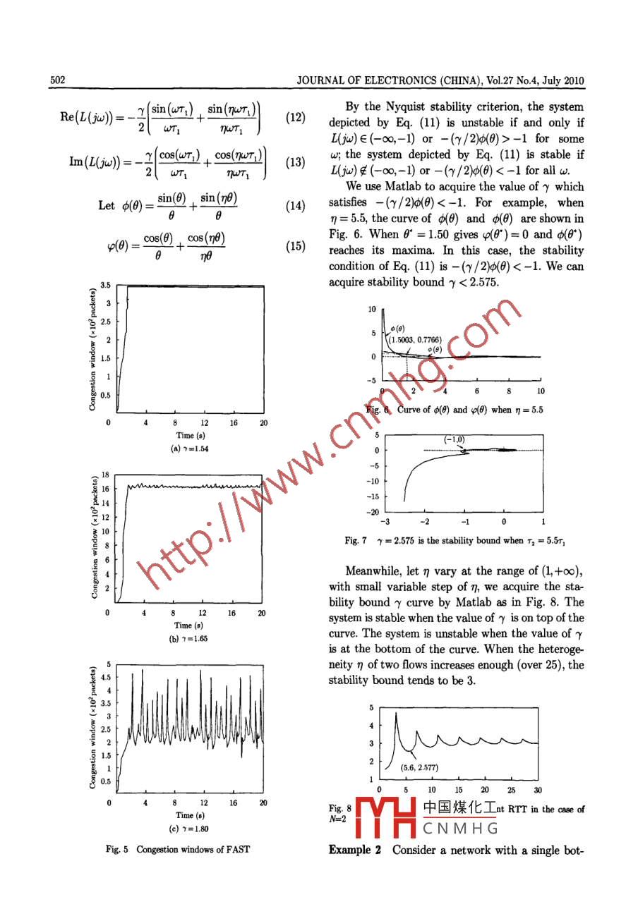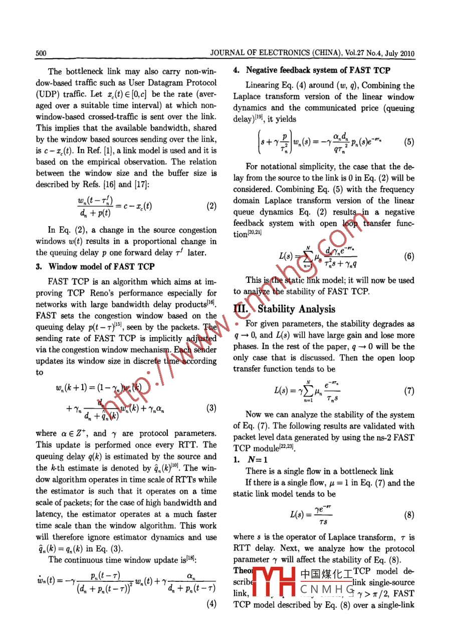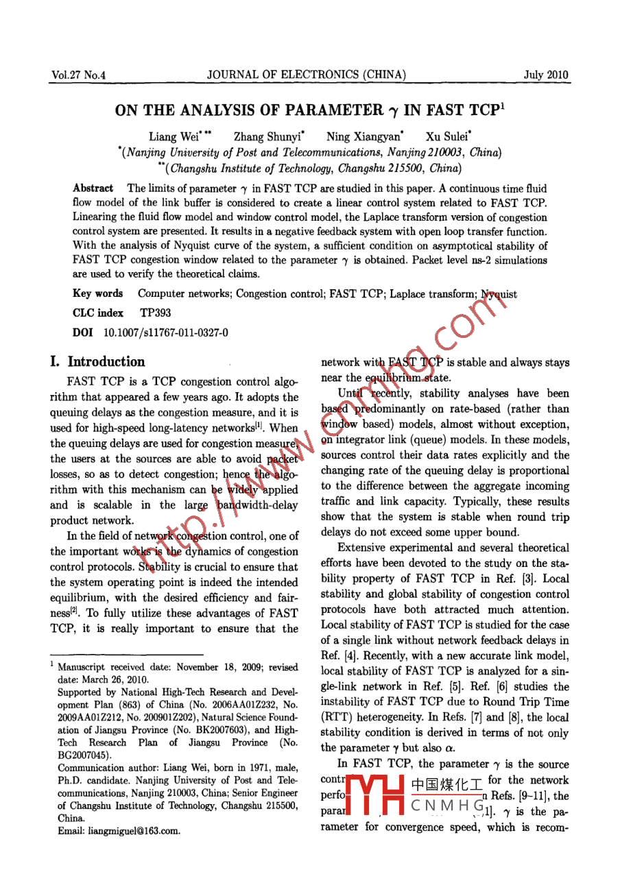 Vol.27 No.4JOURNAL OF ELECTRONICS (CHINA)July 2010ON THE ANALYSIS OF PARAMETER γ IN FAST TCPILiang Wei* " Zhang Shunyi" Ning Xiangyan' Xu Sulei*""(Nanjing University of Post and Telecommunications, Nanjing 210003, China)"(Changshu Institute of Technology, Changshu 215500,0 China)Abstract The limits of parameter γ in FAST TCP are studied in this paper. A continuous time fluidflow model of the link buffer is considered to create a linear control system related to FAST TCP.Linearing the fuid flow model and window control model, the Laplace transform version of congestioncontrol system are presented. It results in a negative feedback system with open loop transfer function.With the analysis of Nyquist curve of the system, a sufficient condition on asymptotical stability ofFAST TCP congestion window related to the parameter γ is obtained. Packet level ns-2 simulationsare used to verify the theoretical claims.Key words Computer networks; Congestion control; FAST TCP; Laplace transform; NyquistCLC indexrP393DOI 10.1007/s11767-011-0327-0I. Introductionnetwork with FAST TCP is stable and always staysFAST TCP is a TCP congestion control algo-near the equilibrium state.rithm that appeared a few years ago. It adopts theUntil recently, stability analyses have beenqueuing delays as the congestion measure, and it isbased predominantly on rate-based (rather thanused for high-speed long _latency networksl". Whenwindow based) models, almost without exception,the queuing delays are used for congestion measure,on integrator link (queue) models. In these models,the users at the sources are able to avoid packetsources control their data rates explicitly and thelosses, so as to detect congestion; hence the algo-changing rate of the queuing delay is proportionalrithm with this mechanism can be widely appliedto the difference between the aggregate incomingand is scalable in the large bandwidth delaytraffic and link capacity. Typically, these resultsproduct network.show that the system is stable when round tripIn the field of network congestion control, one ofdelays do not exceed some upper bound.the important works is the dynamics of congestionExtensive experimental and several theoreticalcontrol protocols. Stability is crucial to ensure thatefforts have been devoted to the study on the sta-the system operating point is indeed the intendedbility property of FAST TCP in Ref. [3]. Localequilibrium, with the desired efficiency and fair-stability and global stability of congestion controlnessl. To fully utilize these advantages of FASTprotocols have both attracted much attention.TCP, it is really important to ensure that theLocal stability of FAST TCP is studied for the caseof a single link without network feedback delays inRef. [4. Recently, with a new accurate link model,1 Manuscript received date: November 18, 2009; revisedlocal stability of FAST TCP is analyzed for a sin-date: March 26, 2010.Supported by National High Tech Research and Devel-gle-link network in Ref. [5]. Ref. [6] studies theopment Plan (863) of China (No. 2006AA01Z232, No.instability of FAST TCP due to Round Trip Time2009AA01Z212, No.2009012202), Natural Science Found-(RTT) heterogeneity. In Refs. [7] and [8], the localation of Jiangsu Province (No. BK207603), and High-stability condition is derived in terms of not onlyTech Research Plan of Jiangsu Province (No.the parameter γ but also a.BG2007045).Communication author: Liang Wei, born in 1971, male,n FAST TCP, the parameter γ is the sourcePh.D. candidate. Nanjing University of Post and Tele-contr中國(guó)煤化工for the networkcommunications, Nanjing 210003, China; Senior Engineerperfoa Refs. [9-11], theof Changshu Institute of Technology, Changshu 215500,China.pararHCNMHG ris the pa-Email: liangmiguel@163.com.rameter for convergence speed, which is recom-Liang et al. On the Analysis of Parameter γ in FAST TCP499mended to be 0.5121. In Ref. [13], RTT is assumed asare connected by a single bottleneck link with ca-a constant, the conclusion of r condition seems topacity C. Let w。(t) denote the congestion window ofbe unreasonable. In Refs. [3] and [5], the parame-source n at time t, n∈{..*, N}. The followingter γ condition for stability is not free enough.variables are used throughout the paper. All areThis paper still studies the stability of FAST TCP.functions of timet; when written without explicitA sufficient condition on asymptotical stability oftime dependence, they denote equilibrium values.FAST TCP congestion window is obtained and ap: Queuing delay at the link;guideline on choosing this parameter γ to obtainw。: Window size of flow n;satisfactory performance is provided, as well as thex。:Arrival rate of flow n's data at the queue;ns-2 simulation results, so as to validate the theo-dn :Propagation delay for flow n;retical results.T. :RTT delay for flown, r。=d +p.The paper is organized as follows. Section IIdescribes a negative feedback system mathematicalmodel of FAST TCP. Section III focuses on sta-ODbility condition analysis. Packet level simulationssO--每are also given to verify the theorem. Section IV is .the conclusion part.sxOODwII. Analyses to F AST TCP Model1. Window -based transmission controlFig 2 The topology of snglelink multisource networkA schematic picture of the control structure forwindow- based transmission control is displayed inLet a packet sent by source n at time t, appearFig.1. The dynamics of the endpoint protocol areat the bottleneck queue at time t + Tt|. This for-represented by the three blocks: transmission con-ward delay TH models the amount of time it takestrol, window control, and congestion estimator.to travel from source n to the link, and it accountsThe system consists of an inner loop and an outerfor the constant forward latency but not queuingloop. In the outer loop, the window control adjustsdelays. The backward delay rh(t) is defined in thethe transmission window size based on the esti-same manner: it is the period from the time w