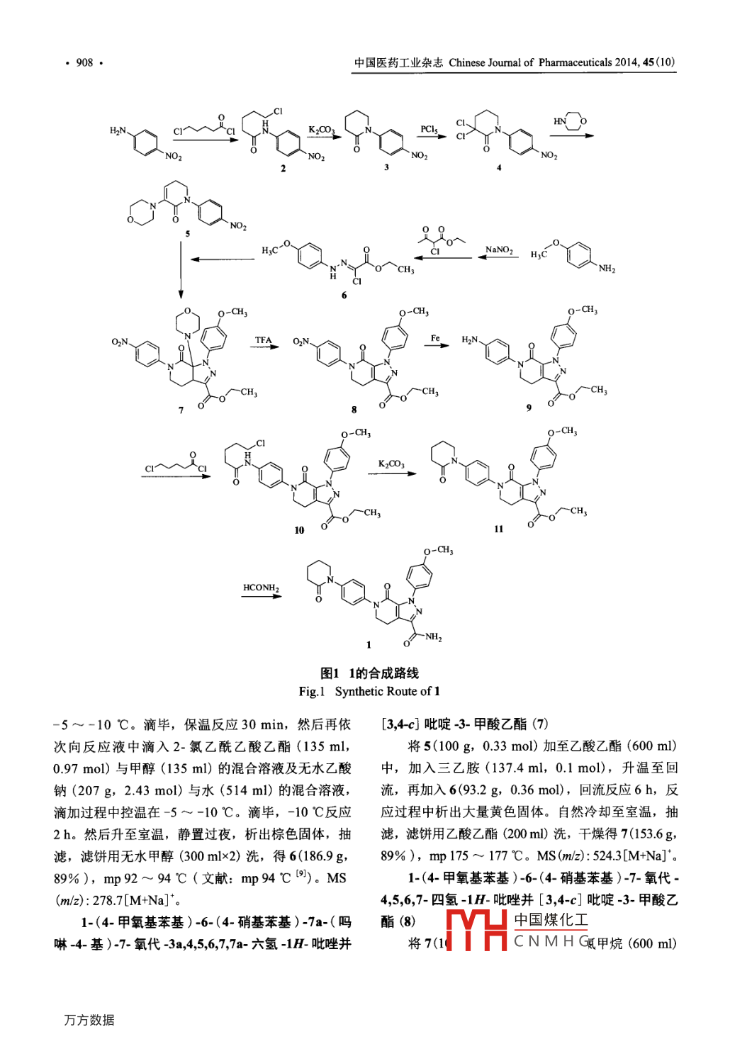 ●906●中國(guó)醫(yī)藥工業(yè)雜志Chinese Journal of Pharmaceuticals 2014, 45(10)阿哌沙班的合成何超,侯云雷,祝妍,馬龍升,趙燕芳*(沈陽(yáng)藥科大學(xué),基于靶點(diǎn)的藥物設(shè)計(jì)與研究教育部重點(diǎn)實(shí)驗(yàn)室,遼寧沈陽(yáng)110016)摘要:對(duì)硝基苯胺經(jīng)酰胺化、環(huán)化、雙氯取代、消除反應(yīng)得關(guān)鍵中間體3-(嗎啉4基)-1-(4-硝基苯基)-5,6-二氫- 1H-吡啶-2~酮(5);同時(shí),對(duì)甲氧基苯胺經(jīng)重氮化后,與2-氯乙酰乙酸乙酯通過(guò)Japp-Klingemann反應(yīng),得到中間體2-氯-2-[2-(4- 甲氧基苯基)腙]乙酸乙酯(6)。中間體5與6進(jìn)行[1+3]偶極環(huán)加成反應(yīng)、脫嗎啉、還原、酰胺化、環(huán)化、氨解反應(yīng)得到X a因子直接抑制劑阿哌沙班。反應(yīng)總收率為25% (以對(duì)硝基苯胺計(jì)),純度為99%。優(yōu)化后的工藝與文獻(xiàn)報(bào)道的工藝相比,反應(yīng)條件溫和,操作步驟簡(jiǎn)便,更適宜工業(yè)生產(chǎn)。關(guān)鍵詞:阿哌沙班;抗血栓; X a因子直接抑制劑;合成中圖分類號(hào): R973.2文獻(xiàn)標(biāo)志碼: A文章編號(hào): 1001-8255 (2014) 10-0906-05Synthesis of ApixabanHE Chao, HOU Yunlei, ZHU Yan, MA Longsheng, ZHAO Yanfang*(Key Lab. of Structure Based Drug Design and Discovery (Shenyang Pharmaceutical University), Ministry of Education, Shemyang 110016)ABSTRACT: The key intermediate 3- (4-morpholinyl)-1- (4-nitrophenyl) -5,6-dihydropyridin-2(1H) -one(5) wasobtained via amidation, cyclization, dichlorination and elimination with 4-nitroaniline as the starting material. Whileanother intermediate ethyl 2-chlor-2- [2- (4 -methoxyphenyl) hydrazono]acetate(6) was prepared from 4-anisidine bydiazotization and Japp-Klingemann reaction with ethyl 2-chlor0-3- oxobutanoate. Apixaban, a factor X a direct inhibitor,was synthesized from 5 and 6 by 1,3-dipolar cycloaddition, olefination, reduction, amidation, cyclization and aminolysiswith an overall yield of 25% (based on 4 -nitroaniline) and an HPLC purity of 99%. The improved process had severaladvantages over those reported procedures, such as mild conditions, simple operations and more suitable for industrialproduction.Key Words: apixaban; anticoagulation; factor X a direct inhibitor; synthetic process阿哌沙班(apixaban, 1), 化學(xué)名為1-(4-甲栓形成。2012年12月,美國(guó)FDA正式批準(zhǔn)1用氧基苯基)-7_氧代-6-[4-(2-氧代哌啶-1-基)苯于降低非瓣膜性房顫患者的卒中和全身性栓塞風(fēng)基]-4,5,6,7-四氫-1H-吡唑并[3,4-c] 吡啶-3-甲酰險(xiǎn)“2]。2013年4月1在中國(guó)獲準(zhǔn)上市,商品名為胺,是由百時(shí)美-施貴寶公司和輝瑞公司聯(lián)合開(kāi)發(fā)艾樂(lè)妥。的新型X a因子直接抑制劑,2011 年5月獲得歐盟目前已有多篇文獻(xiàn)報(bào)道了1的合成方法[38],上市許可",用于擇期髖關(guān)節(jié)置換手術(shù)(THR)或但這些合成路線大多都存在原料昂貴、反應(yīng)時(shí)間膝關(guān)節(jié)置換手術(shù)(TKR)成年患者,以預(yù)防靜脈血長(zhǎng)、后處理麻煩、操作不方便和總收率低等問(wèn)題,不適于工業(yè)生產(chǎn)。本研究參考相關(guān)文獻(xiàn)(4.5],以對(duì)收稿日期: 2014-04-29硝基苯胺為原料,經(jīng)酰胺化、環(huán)化、雙氯取代、消作者簡(jiǎn)介:何超(1988-), 男,碩士研究生,專業(yè)方向:藥物除反應(yīng)得關(guān)鍵中間體3-(嗎啉-4-基)-1-(4-硝基通信聯(lián)系人:趙燕芳(1974-), 女,副教授,碩士生導(dǎo)師,主要從苯基)-5,6-二氫-1H-吡啶-2-酮(5);以對(duì)甲氧基事抗腫瘤藥物的研究。苯胺為原中國(guó)煤化工酰乙酸乙酯通Tel: 024 23986426E-mail: yanfangzhao@126.com過(guò)Japp-KliqMYHCNMHG[2-<(4-甲氧基苯.中國(guó)醫(yī)藥工業(yè)雜志Chinese Jourmal of Pharmaceuticals 2014, 45(10)●907●基)腙]乙酸乙酯(6); 5與6進(jìn)行[1+3]偶極.室溫下將2(100 g, 0.39 mol)和碳酸鉀(70 g,環(huán)加成反應(yīng)得1-(4-甲氧基苯基)-6-(4-硝基苯0.51 mol)加至無(wú)水四氫呋喃(600 ml)中,升溫至基)-7a-(嗎啉-4-基)-7-氧代-3a,4,5,6,7,7a-六氫-回流反應(yīng)4 h。反應(yīng)畢,減壓蒸干,將殘余物倒入1H-吡唑并[3,4-c] 吡啶-3-甲酸乙酯(7),繼而經(jīng)冰水(800 ml)中,攪拌,析出大量黃色固體,抽濾, .脫嗎啉、還原、酰胺化、環(huán)化、氨解得到目標(biāo)產(chǎn)物1,水洗至中性,干燥,得3(78.9g, 92%), mp 96 ~并進(jìn)行了工藝優(yōu)化。1的合成路線見(jiàn)圖1。.98 C。MS (mlz): 221.2[M+H]'. .制備3時(shí),文獻(xiàn)用酰胺化-環(huán)合兩步- ~鍋煮的3,3-二氯-1-(4-硝基苯基)哌啶-2-酮(4)方法,收率為64%“s;本研究分離出酰胺化產(chǎn)物,將3(100g,0.45 mol)加至二氯甲烷(800 m) .再環(huán)合,收率分別為95%和92%。合成4時(shí),考中,攪拌溶解至澄清。室溫下,向反應(yīng)液中緩慢察了溶劑種類及五氯化磷投料量對(duì)收率的影響,結(jié)加入五氯化磷(233.8g, 1.13 mol),升溫至回流果表明,以二氯甲烷作溶劑,室溫加入2.5倍量(摩反應(yīng)3h。反應(yīng)畢,將反應(yīng)液冷至室溫,倒入冰水爾比)的五氯化磷后,回流反應(yīng)3 h,粗品收率提(800 ml)中,攪拌,分出有機(jī)層,水層用二氯甲烷高至90%。制備7時(shí),文獻(xiàn)采用碘化鉀作催化劑,(300 mlx3)萃取,合并有機(jī)層,經(jīng)飽和氯化鈉溶液通過(guò)試驗(yàn)驗(yàn)證,不加催化劑時(shí),反應(yīng)時(shí)間為6h,(300 mlx3)洗、無(wú)水硫酸鈉干燥后過(guò)濾,濾液減壓收率接近90%。在最后-一步氨解反應(yīng)中,文獻(xiàn)將中蒸干,得固體粉末4(118.2 g, 90%), mp 170~間體1-(4-甲氧基苯基)