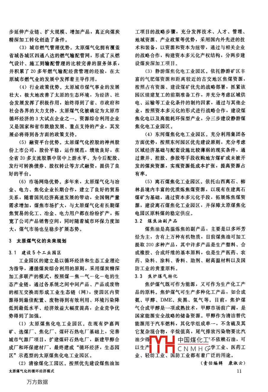 ★專題論壇一 煤炭企業(yè)循環(huán)經(jīng)濟(jì)★太原煤氣化的循環(huán)經(jīng)濟(jì)模式邱彤(太原煤氣化公司焦化二廠,山西太原市,030024)摘要介紹了太原煤氣化公司的運(yùn)營機(jī)構(gòu),闡述了公司發(fā)展循環(huán)經(jīng)濟(jì)的優(yōu)勢,并展示了未來5大生態(tài)工業(yè)園區(qū)的規(guī)模及其產(chǎn)品市場前景。關(guān)鍵詞循環(huán)經(jīng)濟(jì)煤氣化工業(yè)園 區(qū)“3R”原則。集團(tuán)公司目前占有的煤炭資源主要分1概述布在西山煤田、沁水煤田、寧武煤田和河?xùn)|煤田太原煤炭氣化(集團(tuán))有限責(zé)任公司位于山西等,現(xiàn)有礦井生產(chǎn)能力為250萬t/a.所屬選煤廠省太原市萬柏林區(qū),是1981年經(jīng)國務(wù)院批準(zhǔn),由按4個(gè)煤礦所產(chǎn)肥焦煤、瘦煤、氣煤3種煤配比洗原煤炭部和山西省聯(lián)合投資建設(shè)的國內(nèi)首家煤炭綜選設(shè)計(jì)建設(shè),設(shè)計(jì)人洗能力180萬t/a,公司所屬合利用的大型聯(lián)合企業(yè),其設(shè)立的宗旨是“建成煤2個(gè)焦化廠是太原城市煤氣的主要?dú)庠磸S,老焦化炭深度加工轉(zhuǎn)化的示范性企業(yè),努力實(shí)現(xiàn)太原城市廠年生產(chǎn)冶金焦炭70萬t,外供焦?fàn)t煤氣1.5億煤氣化”。經(jīng)過20多年的建設(shè)與發(fā)展,初步形成從m',煤焦油、硫銨、輕苯、黃血鹽等化工產(chǎn)品4原煤開采、洗選煉焦、制氣、煤化工、煤矸石發(fā)電供萬余噸。第二焦化廠,是亞行貸款改善山西環(huán)境項(xiàng)熱、城市煤氣輸配供應(yīng)、煤氣表灶管生產(chǎn)到煤氣工程目的子項(xiàng)目,建設(shè)規(guī)模為年產(chǎn)冶金焦炭100萬t,設(shè)計(jì)、施工、安裝為一體的綜合生產(chǎn)經(jīng)營體系。煤焦油、硫銨、輕苯、黃血鹽等化工產(chǎn)品6萬余該公司下屬主要生產(chǎn)經(jīng)營及輔助單位18個(gè),噸,外供焦?fàn)t煤氣1.84億m'。煤矸石熱電廠是集在建單位2個(gè),年產(chǎn)原煤250萬t、洗精煤110萬團(tuán)公司煤炭深加工轉(zhuǎn)化的配套項(xiàng)目,利用晉陽選煤t、優(yōu)質(zhì)冶金焦炭170萬t、焦?fàn)t煤氣4.74億m°.廠的煤矸石和洗中煤為燃料,采用熱電聯(lián)供工藝,各種化工產(chǎn)品10萬t、電力裝機(jī)容量21.2萬kW、具有綜合利用、節(jié)能環(huán)保等重要作用。電力主要供煤氣表8萬只、煤氣灶2萬臺等綜合生產(chǎn)能力;擁廠區(qū),部分上網(wǎng),熱能全部供廠區(qū)使用。設(shè)計(jì)年消有城市煤氣客戶44萬戶,太原城市氣化率達(dá)到耗煤矸石和洗中煤混合燃料30.6萬t。82%,主導(dǎo)產(chǎn)品洗精煤、冶金焦炭暢銷國內(nèi)冶金、2太原煤氣化的優(yōu)勢化工等行業(yè),部分產(chǎn)品出口。1998年 12月,集團(tuán)公司重組焦化廠、選煤廠、嘉樂泉煤礦的優(yōu)質(zhì)資(1) 人才技術(shù)優(yōu)勢。經(jīng)過多年的生產(chǎn)實(shí)踐,太產(chǎn),設(shè)立了山西神州煤電焦化股份有限公司,共發(fā)原煤氣化培養(yǎng)和造就了采煤、選煤、煉焦、制氣、行流通股15000萬股,募集資金6.9億元,其股票煤化工、電力等各專業(yè)的技術(shù)人員、形成了一體化于2000年6月在深交所成功上市交易。生產(chǎn)、多元化經(jīng)營產(chǎn)運(yùn)銷良性循環(huán)的運(yùn)作機(jī)制,積集團(tuán)公司的產(chǎn)業(yè)鏈條主要分為采煤、洗選、煉累了煤炭綜合利用跨行業(yè)、多產(chǎn)業(yè)平衡發(fā)展的管理焦、制氣、煤化工、煤矸石發(fā)電和煤氣輸配等煤炭中國煤化工:圍繞煤炭綜合利用體深加工轉(zhuǎn)化的核心產(chǎn)業(yè),最終達(dá)到將煤吃干榨盡之目的。這種發(fā)展模式最大化地延伸了產(chǎn)業(yè)鏈,真正系證少心成時(shí)歹兒時(shí)業(yè)羽刊,CNMHG.是太原煤氣化獨(dú)特拓展了煤炭綜合利用之路,體現(xiàn)了循環(huán)經(jīng)濟(jì)發(fā)展的的優(yōu)勢,不僅給調(diào)節(jié)市場留下了空間,而且為進(jìn)一中國煤炭第31卷第10期2005年10月步延伸產(chǎn)業(yè)鏈、擴(kuò)大規(guī)模、增加產(chǎn)品,真正向煤炭工項(xiàng)目的戰(zhàn)略步驟,充分發(fā)揮技術(shù)、人才、管埋、精深加工轉(zhuǎn)化創(chuàng)造了條件。地域資源、產(chǎn)業(yè)政策等優(yōu)勢,采用國內(nèi)外先進(jìn)的技(3)城市燃?xì)夤芾韮?yōu)勢。太原煤氣化擁有覆蓋術(shù)和裝備,以資源和資本為紐帶,通過與相關(guān)企業(yè)省城各城區(qū)四通八達(dá)的燃?xì)廨斉涔芫W(wǎng),形成了從燃的戰(zhàn)略合作,構(gòu)建資本多元化產(chǎn)權(quán)結(jié)構(gòu),分兩步建氣設(shè)計(jì)、施工到輸配管理的比較完善的服務(wù)體系,設(shè)煤炭深加工項(xiàng)目。并積累了20多年燃?xì)廨斉浣?jīng)營管理的經(jīng)驗(yàn),在太(3)靜游煤焦化電工業(yè)園區(qū)。依托靜游礦區(qū)豐原城市燃?xì)鈽I(yè)的發(fā)展中發(fā)揮著主導(dǎo)作用。富的氣肥煤資源和距離較近的古交地區(qū)焦煤資源,(4)行業(yè)政策優(yōu)勢。太原城市煤氣事業(yè)的發(fā)展按照占有資源、建設(shè)煤礦優(yōu)先的戰(zhàn)略部署,抓緊該壯大,極大地改善了太原的生態(tài)環(huán)境,為經(jīng)濟(jì)、社.園區(qū)續(xù)建復(fù)工的前期準(zhǔn)備工作,并充分考慮區(qū)域供會發(fā)展發(fā)揮了積極作用,始終得到了省、市政府和電、運(yùn)輸?shù)裙I(yè)化條件的制約因