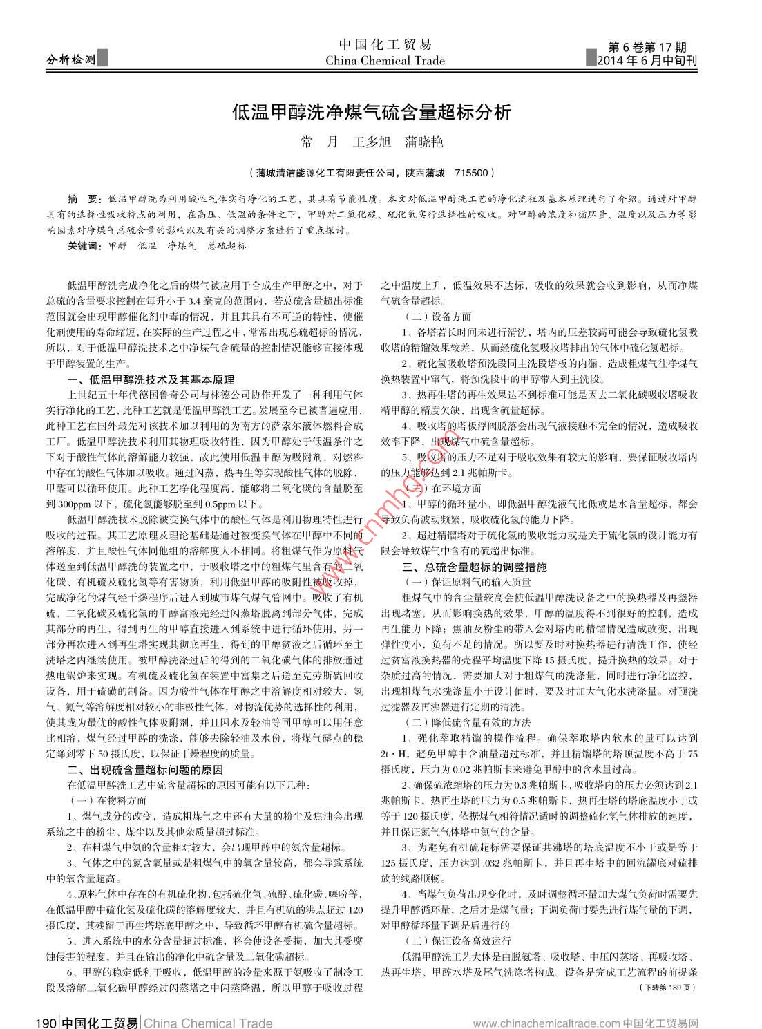 低溫甲醇洗凈煤氣硫含量超標分析