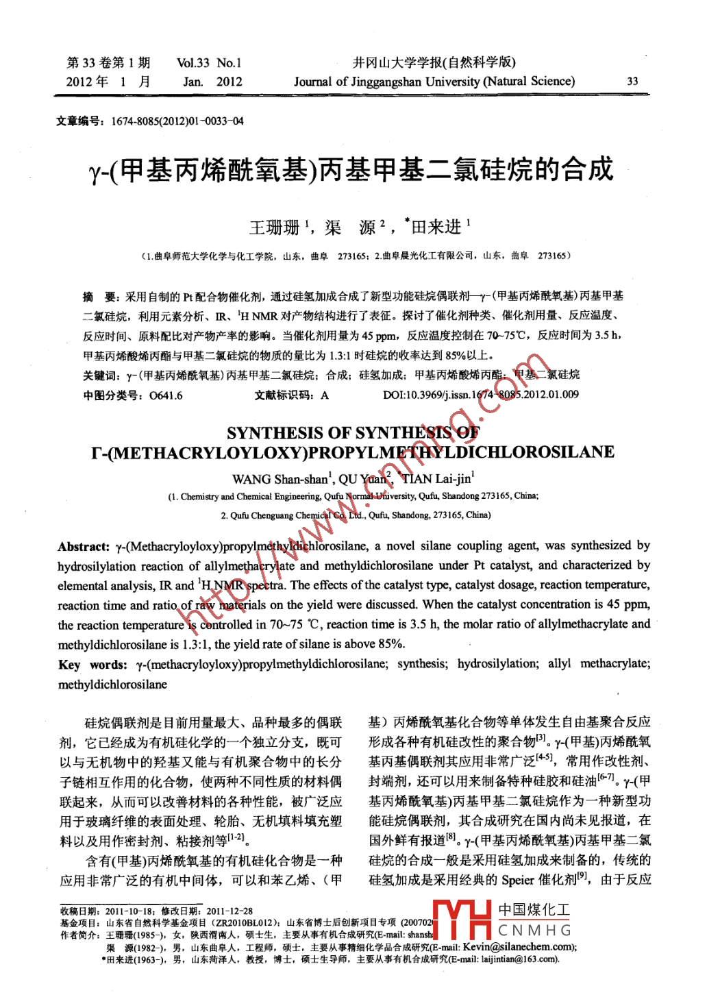 第33卷第1期Vl33No.1井岡山大學學報(自然科學版)2012年1月Jan.2012Journal of Jinggangshan University(Natural Science)章編號:1674-8085(2012)01-0033-04γ-(甲基丙烯酰氧基)丙基甲基二氯硅烷的合成王珊珊,渠源2,田來進(1曲阜師范大學化學與化工學院,山東,曲阜273165:2曲阜晨光化工有限公司,山東,曲阜273165)摘要:采用自制的P配合物催化劑,通過硅氫加成合成了新型功能硅烷偶聯(lián)劑γ(甲基丙烯酰氧基)丙基甲基二氯硅烷,利用元素分析、R、HNMR對產(chǎn)物結(jié)構(gòu)進行了表征。探討了催化劑種類、催化劑用量、反應溫度反應時間、原料配比對產(chǎn)物產(chǎn)率的影響。當催化劑用量為45ppm,反應溫度控制在7075℃,反應時間為3.b,甲基丙烯酸烯丙酯與甲基二氯硅烷的物質(zhì)的量比為131時硅烷的收率達到85%以上關(guān)鍵詞:γ(甲基丙烯酰氧基)丙基甲基二氯硅烷;合成;硅氫加成;甲基丙烯酸烯丙酯;甲基二氯硅烷中圖分類號:0641.6文獻標識DO10.3969jisn.1674-80852012.01.009SYNTHESIS OF SYNTHESIS OFT-(METHACRYLOYLOXY)PROPYLMETHYLDICHLOROSILANEWANG Shan-shan, QU Yuan, TIAN Lai-jin(1. Chemistry and Chemical Engineering, Qufu Normal University, Qufu, Shandong 273165, Chi2. Qufu Chenguang Chemical Co. Ltd, Qufu, Shandong, 273165, China)Abstract: y-(Methacryloyloxy)propylmethyldichlorosilane, a novel silane coupling agent, was synthesized byhydrosilylation reaction of allylmethacrylate and methyldichlorosilane under Pt catalyst, and characterized byelemental analysis, IR and H NMR spectra. The effects of the catalyst type, catalyst dosage, reaction temperature,reaction time and ratio of raw materials on the yield were discussed. When the catalyst concentration is 45 ppm,the reaction temperature is controlled in 70-75 C, reaction time is 3. 5 h, the molar ratio of allylmethacrylate andmethyldichlorosilane is 1.3: 1, the yield rate of silane is above 85%Key words: Y-(methacryloyloxy)propylmethyldichlorosilane; synthesis; hydrosilylation; allyl methacrylatemethyldichlorosilane硅烷偶聯(lián)劑是目前用量最大、品種最多的偶聯(lián)基)丙烯酰氧基化合物等單體發(fā)生自由基聚合反應劑,它已經(jīng)成為有機硅化學的一個獨立分支,既可形成各種有機硅改性的聚合物。y(甲基)丙烯酰氧以與無機物中的羥基又能與有機聚合物中的長分基丙基偶聯(lián)劑其應用非常廣泛4S,常用作改性劑、子鏈相互作用的化合物,使兩種不同性質(zhì)的材料偶封端劑,還可以用來制備特種硅膠和硅油。y(甲聯(lián)起來,從而可以改善材料的各種性能,被廣泛應基丙烯酰氧基)丙基甲基二氯硅烷作為一種新型功用于玻璃纖維的表面處理、輪胎、無機填料填充塑能硅烷偶聯(lián)劑,其合成研究在國內(nèi)尚未見報道,在料以及用作密封劑、粘接劑等2國外鮮有報道。y(甲基丙烯酰氧基)丙基甲基二氯含有(甲基)兩烯酰氧基的有機硅化合物是一種硅烷的合成一般是采用硅氫加成來制備的,傳統(tǒng)的應用非常廣泛的有機中間體,可以和苯乙烯、(甲硅氫加成是采用經(jīng)典的 Speier催化劑,由于反應收稿日期:2011-10-18;修改日期:2011-12-28中國煤化工基金項目:山東省自然科學基金項目(ZR2010BL012);山東省博士后創(chuàng)新項目專項Q200702作者簡介:王珊珊(985-),女,陜西渭南人,碩士生,主要從事有機合成研究(Emal: shansCNMHG渠源(1982),男,山東曲阜人,工程師,碩士,主要從事精細化學品合成研究(Emai:Kevin@Dsilanechem.com;田來進(1963-),男,山東菏澤人,教授,博土,碩士生導師,主要從事有機合成研究( E-mail: laijintian@163com)中國煤化工CNMHG中國煤化工CNMHG井岡山大學學報(自然科學版)表2兩種原料的配比對產(chǎn)率的影響構(gòu)進行了表征。探討了催化劑種類、催化劑用量Tabe2 Effects of the ratio of two raw materials on the yield反應溫度、原料配比對合成工藝的影響。當催化劑n(D: n(D)催化劑c用量(ppm)產(chǎn)率(%用量為45Pm,反應溫度控制在70-75℃,反應時間為3.5h,甲基丙烯酸烯丙酯與甲基二氯硅烷的物l2:16l.43質(zhì)的量比為1.3:1時,此時反應體系比較平穩(wěn),也沒有產(chǎn)生凝膠現(xiàn)象,催化劑C表現(xiàn)出了較高的區(qū)域1.4:1書5557803選擇性和催化活性,產(chǎn)物產(chǎn)率達到85%以上,具有2.0:1應用于工業(yè)生產(chǎn)的前景。由表2可以看出,隨著甲基丙烯酸烯丙酯(I參考文獻:和甲基二氯硅烷即(Ⅱ)的增加,產(chǎn)物產(chǎn)率先增加,當物質(zhì)的量比為:13:1時,產(chǎn)物產(chǎn)率最大,達到了鄔繼榮陳利民許文東新型硅烷偶聯(lián)劑研究進展8512%。物質(zhì)的量比繼續(xù)增大,產(chǎn)物產(chǎn)率反而下降化工生產(chǎn)與技術(shù),2009,16(64851了,二者物質(zhì)的量比為:20:1,產(chǎn)物產(chǎn)率為60.26%。[2]吳森紀有機硅及其應用北京科學技術(shù)文獻出這說明了當甲基丙烯酸烯丙酯相對過量時,更易發(fā)版社,1991生加成反應,副產(chǎn)物少。當甲基丙烯酸烯丙酯太過[3]幸松民有機硅合成工藝及產(chǎn)品應用DM]北京:化學工于過量時,反而會影響了反應,降低了產(chǎn)物產(chǎn)率,業(yè)出版社,20009所以最佳反應物質(zhì)的量比是13:1。[4] Okawa, T. Method for the preparation of high-purity2.7反應時間的影響methacryloxypropyldimethylchlorosilane using inorganicchlorides[P]JP09143187,1997-0603[5] Otomo, Takayoshi. Curable silicEP078181,1995-12-28[6]于菲,渠源,田來進,等.¥-環(huán)氧丙氧基丙基甲基二乙氧基硅烷的合成[曲阜師范大學學報,2009,35(4)76-80[7戴延鳳,李鳳儀不飽和烴硅氫加成催化劑固載化研究進展門化學試劑,2005,27(9:68-72反