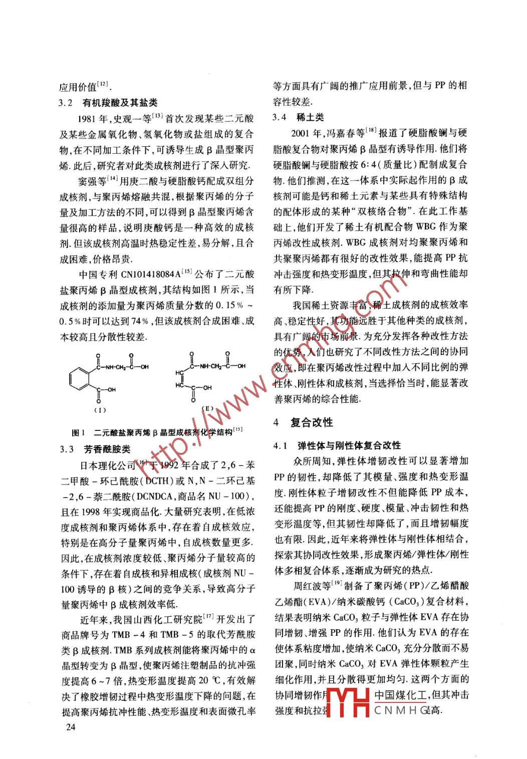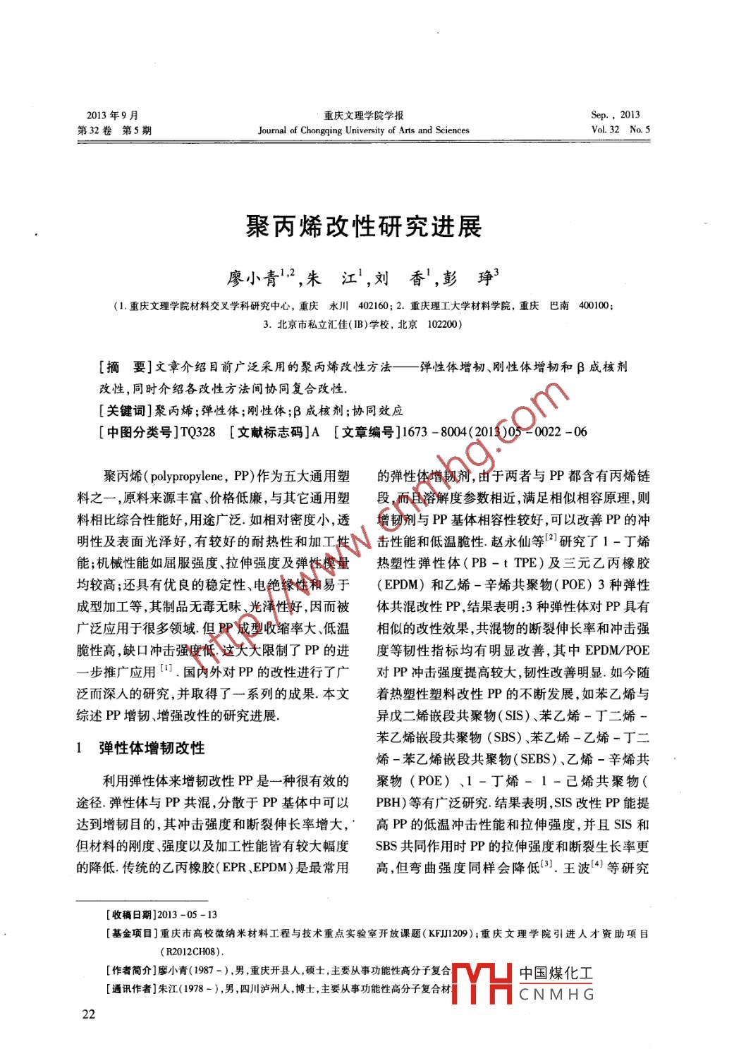 2013年9月重慶文理學院學報第32卷第5期Journal of Chongqing University of Arts and SciencesVol 32 No 5聚丙烯改性研究進展廖小青2,朱劉香1,彭琤(1.重慶文理學院材料交叉學科研究中心,重慶水川402160;2.重慶理工大學材料學院,重慶巴南400100;3.北京市私立匯佳(IB)學校,北京102200[摘要]文章介紹目前廣泛采用的聚丙烯改性方法——彈性體增韌、剛性體增韌和β成核劑改性,同時介紹各改性方法間協(xié)同復(fù)合改性關(guān)鍵詞]聚丙烯;彈性體;剛性體;β成核劑;協(xié)同效應(yīng)[中圖分類號]TQ328[文獻標志碼]A[文章編號]1673-8004(2013)05-0022-06聚丙烯( polypropylene,P)作為五大通用塑的彈性體增韌劑,由于兩者與PP都含有丙烯鏈料之一,原料來源豐富、價格低廉,與其它通用塑段,而且溶解度參數(shù)相近,滿足相似相容原理,則料相比綜合性能好,用途廣泛.如相對密度小,透增韌劑與PP基體相容性較好,可以改善PP的沖明性及表面光澤好,有較好的耐熱性和加工性擊性能和低溫脆性趙永仙等2研究了1-丁烯能;機械性能如屈服強度、拉伸強度及彈性模量熱塑性彈性體(PB-tTPE)及三元乙丙橡膠均較高;還具有優(yōu)良的穩(wěn)定性、電絕緣性和易于(EPDM)和乙烯-辛烯共聚物(POE)3種彈性成型加工等,其制品無毒無味、光澤性好,因而被體共混改性PP,結(jié)果表明:3種彈性體對PP具有廣泛應(yīng)用于很多領(lǐng)域但PP成型收縮率大、低溫相似的改性效果,共混物的斷裂伸長率和沖擊強脆性高,缺口沖擊強度低.這大大限制了PP的進度等韌性指標均有明顯改善,其中 EPDM/POE步推廣應(yīng)用.國內(nèi)外對PP的改性進行了廣對PP沖擊強度提高較大,韌性改善明顯如今隨泛而深入的研究,并取得了一系列的成果本文著熱塑性塑料改性PP的不斷發(fā)展,如苯乙烯與綜述PP增韌、增強改性的研究進展異戊二烯嵌段共聚物(SlS)、苯乙烯-丁二烯1彈性體增韌改性苯乙烯嵌段共聚物(SBS)、苯乙烯-乙烯-丁二烯-苯乙烯嵌段共聚物(SEBS)、乙烯-辛烯共利用彈性體來增韌改性PP是一種很有效的聚物(POE)、1-丁烯-1-已己烯共聚物(途徑.彈性體與PP共混,分散于PP基體中可以PBH)等有廣泛研究結(jié)果表明,S改性PP能提達到增韌目的,其沖擊強度和斷裂伸長率增大,高PP的低溫沖擊性能和拉伸強度,并且SIS和但材料的剛度、強度以及加工性能皆有較大幅度SBS共同作用時PP的拉伸強度和斷裂生長率更的降低傳統(tǒng)的乙丙橡膠(EPR、EPDM)是最常用高,但彎曲強度同樣會降低(.王波4等研究[收稿日期]2013-05-13[基金項目]重慶市高校微納米材料工程與技術(shù)重點實驗室開放課題(KFJ209);重慶文理學院引進人才資助項目(R2012CHo8)[作者簡介]廖小青(1987-),男,重慶開縣人,碩士,主要從事功能性高分子復(fù)合中國煤化工[通訊作者]朱江(1978-),男,四川瀘州人,博士,主要從事功能性高分子復(fù)合材HiCNMHG2PPH共混改性PP,隨著PBH用量的增加,共混獨特的結(jié)構(gòu)使其具有陽離子交換性、膨脹性、吸物的拉伸強度、彎曲強度、硬度均呈下降趨勢,但水性、吸附性、分散性和潤滑等性質(zhì).硏究者將插沖擊強度顯著提高層聚合的概念引入烯烴聚合,制備了聚丙烯/蒙2剛性體增韌改性脫土(PP/MMT)納米復(fù)合材料.滑石粉是一種由層狀硅酸鹽晶體組成的礦物,采用滑石粉填充的彈性體的增韌改性顯著增加了PP的韌性,PP耐熱性好,收縮率低,尺寸穩(wěn)定性好,硬度高.但其模量、強度和熱變形溫度卻降低了.然而剛滑石粉填充PP復(fù)合材料已廣泛應(yīng)用于汽車部件性體粒子的加入可以彌補這一缺陷,改善材料的及日常用品的生產(chǎn)然而,由于兩相界面的親和沖擊強度、拉伸強度、模量、熱變形溫度、加工流性不強,滑石粉的直接填充往往導致一些力學性動性能等,還可以顯著降低成本,有較高的經(jīng)濟能的下降,從而使復(fù)合材料的應(yīng)用受到限制硅效益.常用的剛性粒子有碳酸鈣、蒙脫土、滑石灰石是一種工業(yè)礦物,屬于鏈狀偏硅酸鹽,粉碎粉、硫酸鋇、二氧化硅和云母.后顆粒呈纖維狀或針狀硅灰石無毒,不含結(jié)晶碳酸鈣是研究最多的剛性體粒子之一,常規(guī)水,吸濕性小,熱穩(wěn)定性好;與碳酸鈣相比,耐腐用的碳酸鈣因制造方法的不同,可分為重質(zhì)碳酸蝕性好;與云母、滑石粉等片狀材料相比,哽度鈣和輕質(zhì)碳酸鈣,前者是石灰石經(jīng)機械粉碎而高,表面不易刮傷.據(jù)文獻[8-9]記載,硅灰石填成,后者是采用化學方法生產(chǎn)的由于碳酸鈣表充聚丙烯樹脂的性能,與滑石粉、云母填充對比面極性強,不易分散,易成團,所以目前研究主要在彎曲模量方面,硅灰石比滑石粉提高10%集中在表面改性表面改性方法有表面涂覆和接枝等.表面涂覆通常是通過添加偶聯(lián)劑,改變3β成核劑改性CaCO3表面極性常用偶聯(lián)劑有:鈦酸酯偶聯(lián)劑、在不同結(jié)晶條件下,聚丙烯可形成α、B、y、8鋁酸酯偶聯(lián)劑、磷酸酯偶聯(lián)劑、稀土偶聯(lián)劑等接和擬六方晶等5種晶型.α晶型為單斜晶系,是枝主要是為了改變PP與CaCO3表面極性促進熱穩(wěn)定性最好的晶型;β晶型屬六方晶系,只能結(jié)合,一般是通過偶聯(lián)反應(yīng)將有機基團和烯烴基在特殊的情況下得到,如通過剪切誘導結(jié)晶和添團直接聚合,使其具有很好的相容性.近年來隨加成核劑等;而γ晶型最不穩(wěn)定,只有在高壓下著超細碳酸鈣技術(shù)的發(fā)展,特別是納米碳酸鈣的