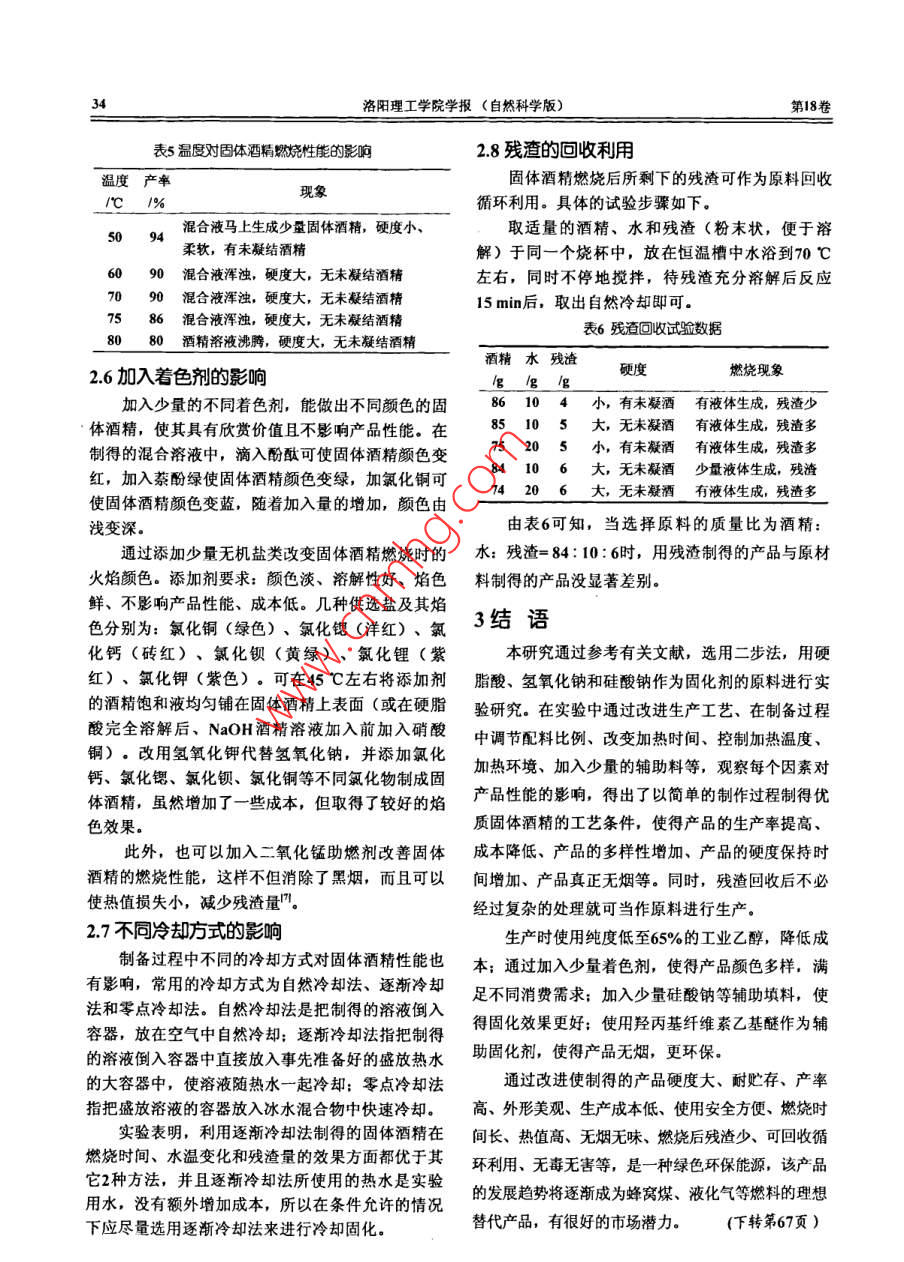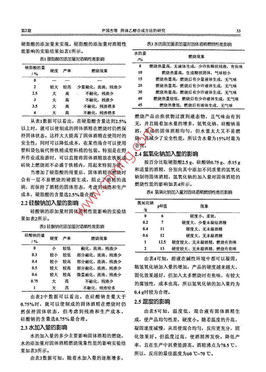 第18卷第2期洛陽理工學院學報(自然科學版)Vol 18 No. 22008年12月Luoyang Institute of Science and Technology(Natural Science Edition)固體乙醇合成方法的研究尹國杰,李冬(洛陽理工學院環(huán)境工程與化學系,河南洛陽471023)摘要:詳細討論了影響固體乙醇合成的各種主要因素,確定了最佳工藝條件。酒精∶水:硬脂酸∶硅酸鈉:氬氧化鈉的最佳配比為102:15:2.5:0.75:0.4,最佳反應溫度為70℃關鍵詞:固體酒精;硬脂酸;氫氧化鈉;硅酸鈉;殘渣中圖分類號:06234文獻標識碼:A文章編號:16745043200802-0032403目前,隨著全國火鍋熱的興起,一種新型的火1實驗鍋燃料(環(huán)保型固體酒精)已悄然在市場上出現(xiàn)11試劑及儀器并且這種產品的銷量更是成倍地增長。與此同時,出現(xiàn)了各種工業(yè)酒精固化的方法主要試劑:硬脂酸,AR;氫氧化鈉,AR;硅酸鈉,AR;酒精,AR;二氧化錳,AR;酚酞,這些方法的差別主要是選擇使用了不同的凝膠劑AR;萘酚綠,AR;氯化銅,AR目前所使用的凝膠劑物質主要有:硬脂酸、乙酸鈣飽和溶液、硝化纖維、羥丙基纖維素等。以醋主要儀器:恒溫水浴鍋酸鈣為固化劑時操作溫度較低,在40℃~50℃即12實驗原理可,但制得的固體酒精放置后易軟化變形,最終C,H3SCOOH+NaoH=CI H3sCOONa+H2O變成糊狀物,因此儲存性能較差,不宜久置;以硝2C1-HsCOOH+Na SiO=2C:H3s COONa+H)SiO化纖維為固化劑時操作溫度也在40℃~50℃,但反應生成的硬脂酸鈉是一個長碳鏈的極性分尚需用乙酸乙酯和丙酮溶解硝化纖維,致使成本提子,室溫下在酒精中不易溶。在較高的溫度下,硬高,制得的固體酒精燃燒時可能發(fā)生爆炸,故安全脂酸鈉可以均勻地分散在液體酒精中,而冷卻后則性較差;以乙基羧基乙基纖維素為固化劑雖制備工形成凝膠體系,使酒精分子被束縛于相互連接的大藝并不復雜,但該固化劑來源困難,價格較高,不分子之間,即液體酒精包含在硬脂酸鈉空間網狀骨易推廣使用";以硬脂酸鈉為固化劑原料來源豐架間隙中,呈不流動狀態(tài)而使酒精凝固,形成了固富,成本較低,產品硬度大,不易熔化流淌,殘渣體狀態(tài)的酒精少,不冒黑煙,耐貯存,對環(huán)境無污染56。本研究提出的方法可以克服以上缺點,使得產13實驗制備方法品的外觀可以是白色,也可以是紅、藍、紫色等;(1)取酒精于燒杯中,水浴至60℃左右,加入并且固化效果好,更容易攜帶、運輸;在制備過程硬脂酸,用玻璃棒攪拌均勻,使硬脂酸充分溶解。中通過填料使得產品燃燒過程無煙,更加環(huán)保;更(2)取氫氧化鈉和硅酸鈉加入水中,用玻璃棒攪為重要的是,對原料乙醇的要求不高,65%的乙醇拌至充分溶解,水浴到60℃左右。即能達到制備要求,生產工藝簡化,大大降低產品(3)水浴恒溫60℃時,把氫氧化鈉和硅酸鈉溶價格液慢慢加到硬脂酸酒精溶液中,同時用玻璃棒攪拌通過改進生產工藝,在制備過程中調節(jié)配料比均勻,再反應15min后取出,放置自然冷卻。例、改變加熱時間或加熱環(huán)境、加入少量的輔助2結果與討論料,使得產品具有回收率高、成本降低、產品的多2.1硬脂酸加入量的影響樣性增加、產品的硬度保持時間增加、產品真正無硬脂酸加入量的多少直接影響固體酒精的凝固煙等優(yōu)點。性能。目前,大部分市售的固體酒精在點燃后即變收稿日期:20080402為液體。因此,必須放在鐵制容器內燃燒,且易流作者簡介:尹國杰(1981)男河南焦作人,助教,主要從事無淌,不安全。能否使固體酒精在燃燒吋仍保持固體機化學方面的研究狀態(tài)呢?實驗表明是完全可以的。這可以通過改變第2期尹國杰等固體乙醇合成方法的研究硬脂酸的添加量來實現(xiàn)。硬脂酸的添加量對酒精性水的添加量添加量對固體酒精燃燒性能影響能影響的實驗結果如表1所示。水的量表1硬脂酸的添加量對酒精性能影響燃燒現(xiàn)象硬脂酸的量0燃燒熱量高,無液體生成,少許焦糊狀殘渣,有焦味硬度產率燃燒現(xiàn)象燃燒熱量高,生成糊狀固體,氣味較小025較大較高少量融化,流淌,殘渣少大高不融化,殘渣少大高不融化,殘渣少050005燃燒熱量高,燃燒后有少量液體生成,無氣味燒熱量高,燃燒后有少許液體生成,無氣味燃燒熱量高,燃燒后有少許液體生成,無氣味燃燒熱量較低,燃燒后有少許液體生成,無氣味3.5大高不融化,殘渣稍多燃燒熱量低,燃燒后有液體生生成,無氣味大高不融化,殘渣稍多燃燒產品由焦狀物過渡到液態(tài)物,且氣味由有到從表1數(shù)據(jù)可以看出,在硬脂酸含量達到25%無,并且隨著加水量的增多,氫氧化鈉、硅酸鈉易以上時,就可以使制成的固體酒精在燃燒時仍然保溶,形成的固體酒精均勻,但水量太大又不易燃持固體狀態(tài)。這樣大大提高了固體酒精在使用時的燒,且減少了安全性能,所以含水量為15%時最為安全性,同時可以降低成本,在某些場合可以使用合理塑料袋包裝代替鐵桶或塑料桶的包裝。特別是在野外作業(yè)或旅游時,可以直接將固體酒精放在鐵板或24氫氧化鈉加入量的影響磚塊上燃燒而不必盛于鐵桶內,用起來特別方便。按百分比取硬脂酸25g、硅酸鈉075g、水15g當增加了硬脂酸的用量后,固體酒精在燃燒時和適量的酒精,分別向其中添加不同質量的氫氧化會有一層不易燃燒的硬膜生成,阻止了酒精的流鈉制得固體酒精,氫氧化鈉的加入量對固體酒精的淌,而保持了酒精的固體形態(tài),考慮到殘渣和生產燃燒性能的影響如表4所示。成本,硬脂酸的含量選25%最合理表4氫氧化鈉