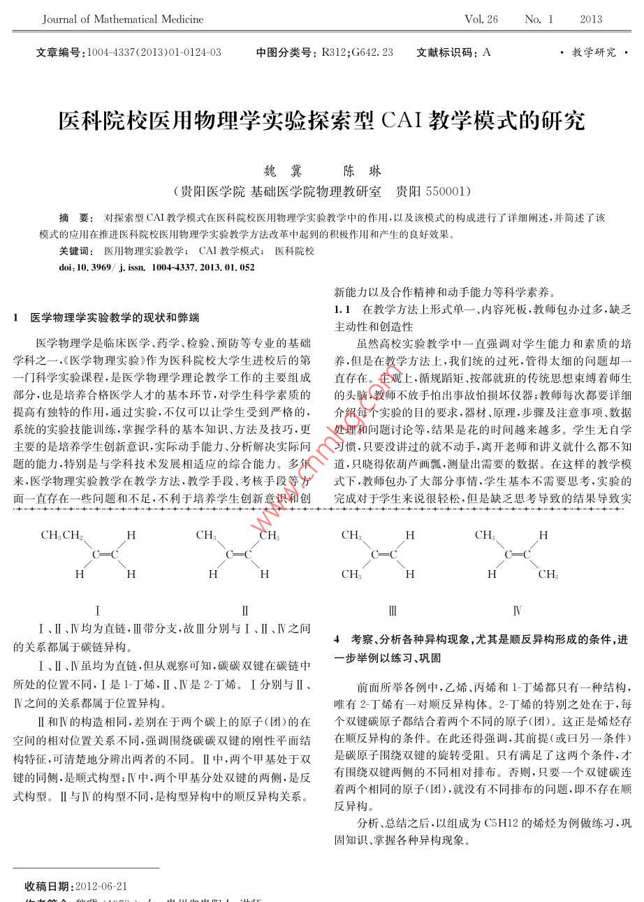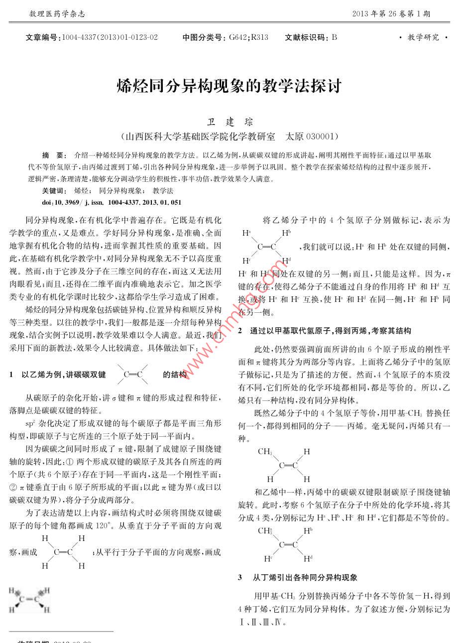 數(shù)理醫(yī)藥學(xué)雜志2013年第26卷第1期文章編號: 1004-4337(2013)01-0123-02中圖分類號: G642;R313文 獻標(biāo)識碼: B●教學(xué)研究●烯烴同分異構(gòu)現(xiàn)象的教學(xué)法探討衛(wèi)建琮(山西醫(yī)科大學(xué)基礎(chǔ)醫(yī)學(xué)院化學(xué)教研室太原 030001)摘要:介紹一種烯烴同分異構(gòu)現(xiàn)象的教學(xué)方法。以乙烯為例,從碳碳雙鍵的形成講起,闡明其剛性平面特征;通過以甲基取代不等價氫原子.由丙烯過渡到丁烯.引出各種同分異構(gòu)現(xiàn)象.進一步舉例予以鞏固。整個教學(xué)在探索烯烴結(jié)構(gòu)的過程中逐步展開,邏輯嚴(yán)密,條理清楚,能夠充分調(diào)動學(xué)生的積極性,事半功倍,教學(xué)效果令人滿意。關(guān)鍵詞:烯烴; 同分異構(gòu)現(xiàn)象; 教學(xué)法doi: 10. 3969/ j. issn, 1004-4337. 2013. 01. 051同分異構(gòu)現(xiàn)象,在有機化學(xué)中普遍存在。它既是有機化將乙烯分子中的4個氫原子分別做標(biāo)記,表示為.學(xué)教學(xué)的重點,又是難點。學(xué)好同分異構(gòu)現(xiàn)象,是準(zhǔn)確、全面HHb地掌握有機化合物的結(jié)構(gòu),進而掌握其性質(zhì)的重要基礎(chǔ)。因,我們就可以說:H和Hb處在雙鍵的同側(cè),此,在基礎(chǔ)有機化學(xué)教學(xué)中,對同分異構(gòu)現(xiàn)象無不予以高度重視。然而,由于它涉及分子在三維空間的存在,而這又無法用H°和H同處在雙鍵的另一側(cè);而且,只能是這樣。因為,π肉眼看見;而且,還得在二維平面內(nèi)準(zhǔn)確地表示它。加之醫(yī)學(xué)鍵的存在,使得乙烯分子不能通過自身的作用將H"和H4互類專業(yè)的有機化學(xué)課時比較少,這都給學(xué)生學(xué)習(xí)造成了困難。換,或?qū)°和H°互換,使H°和Hd在同一側(cè),H°和Hb同烯烴的同分異構(gòu)現(xiàn)象包括碳鏈異構(gòu)、位置異構(gòu)和順反異構(gòu)在另一側(cè)。等三種類型。以往的教學(xué)中,我們一.般都是逐一- 介紹每種異構(gòu)2通過以甲基取代氫原子,得到丙烯,考察其結(jié)構(gòu)現(xiàn)象,結(jié)合實例予以說明,教學(xué)效果難以令人滿意。最近,我們采用下面的新教法,效果令人比較滿意。具體做法如下:此處,仍然要強調(diào)前面所講的由6個原子形成的剛性平面和π鍵將其分為兩部分等內(nèi)容。.上面將乙烯分 子中的氫原1以乙烯為例 ,講碳碳雙鍵的結(jié)構(gòu)子做標(biāo)記,只是為了描述的方便。然而,4個氫原子的本質(zhì)沒有不同,它們所處的化學(xué)環(huán)境都相同,都是等價的。所以,乙從碳原子的雜化開始,講σ鍵和π鍵的形成過程和特征,烯只有--種結(jié)構(gòu),沒有同分異構(gòu)體。落腳點是碳碳雙鍵的特征。既然乙烯分子中的4個氫原子等價,用甲基-CH3替換任sp雜化決定了形成雙鍵的每個碳原子都是平面三角形何一個,都得到相同的分子一丙烯。 毫無疑問,丙烯只有一構(gòu)型,即碳原子與它所連的三個原子處于同一平 面內(nèi)。種。因為碳碳之間同時形成了π鍵,限制了成鍵原子圍繞鍵CH,軸的旋轉(zhuǎn),因此:①兩個形成雙鍵的碳原子及其各自所連的兩個原子(共6個原子)存在于同-平面內(nèi),這是一個剛性平面;②π鍵垂直于由6原子所形成的平面;以此π鍵為界(或日以和乙烯中--樣,丙烯中的碳碳雙鍵限制碳原子圍繞鍵軸碳碳雙鍵為界),將分子分成兩部分。為了表達清楚以上內(nèi)容,畫結(jié)構(gòu)式時必須將圍繞雙鍵碳旋轉(zhuǎn)。此時,考察6個氫原子在分子中所處的化學(xué)環(huán)境,將其原子的每個鍵角都畫成120。從垂直于分子平面的方向觀分成4類,分別標(biāo)記為H*、H"、Hf和H',它們都是不等價的。CH、察,畫成;從平行于分子平面的方向觀察,畫成Hd3從丁烯引 出各種同分異構(gòu)現(xiàn)象用甲基-CH3分別替換丙烯分子中各不等價氫- H,得到4種丁烯,它們互為同分異構(gòu)體。為了敘述方便,分別標(biāo)記為I、I、I、IV。收稿日期:2012-08-28Journal of Mathematical MedicineVol. 26No.12013文章編號: 1004-4337(2013)01-0124-03中圖分類號: R312;G642. 23文獻標(biāo)識碼: A●教學(xué)研究●醫(yī)科院校醫(yī)用物理學(xué)實驗探索型CAI教學(xué)模式的研究魏冀陳琳(貴陽醫(yī)學(xué)院基礎(chǔ)醫(yī)學(xué)院物理教研室貴陽550001)摘要: 對探索型CAI教學(xué)模式在醫(yī)科院校醫(yī)用物理學(xué)實驗教學(xué)中的作用,以及該模式的構(gòu)成進行了詳細闡述,并簡述了該模式的應(yīng)用在推進醫(yī)科院校醫(yī)用物理學(xué)實驗教學(xué)方法改革中起到的積極作用和產(chǎn)生的良好效果。關(guān)鍵詞:醫(yī)用物理實驗教學(xué); CAI 教學(xué)模式;醫(yī)科院校doi: 10.3969/ j. issn. 1004-4337. 2013. 01. 052新能力以及合作精神和動手能力等科學(xué)素養(yǎng)。1.1 在教學(xué)方法上形式單一、內(nèi)容死板,教師包辦過多,缺乏1醫(yī)學(xué)物理學(xué)實驗教學(xué)的現(xiàn)狀和弊端主動性和創(chuàng)造性醫(yī)學(xué)物理學(xué)是臨床醫(yī)學(xué)、藥學(xué)、檢驗、預(yù)防等專業(yè)的基礎(chǔ)雖然高校實驗教學(xué)中一直強調(diào)對學(xué)生能力和素質(zhì)的培學(xué)科之一,《醫(yī)學(xué)物理實驗》作為醫(yī)科院校大學(xué)生進校后的第養(yǎng),但是在教學(xué)方法上,我們統(tǒng)的過死,管得太細的問題卻-一門科學(xué)實驗課程,是醫(yī)學(xué)物理學(xué)理論教學(xué)工作