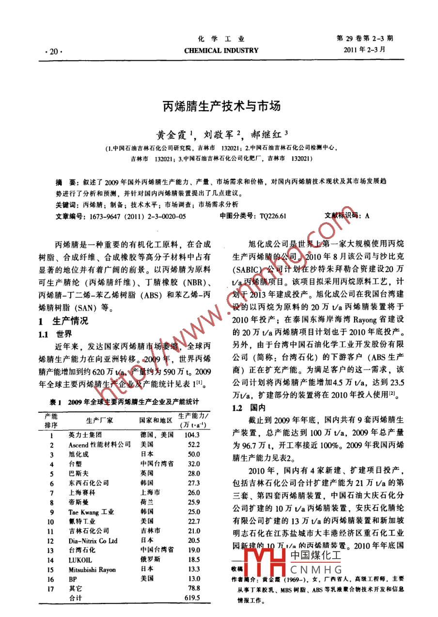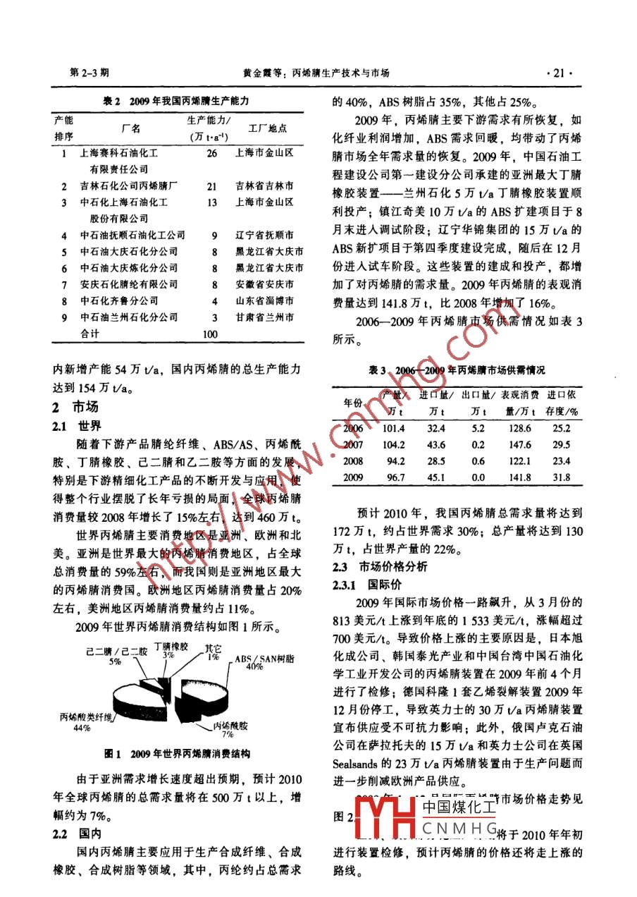 化學(xué)工業(yè)第29卷第2-3期CHEMICAL INDUSTRY2011年2-3月丙烯腈生產(chǎn)技術(shù)與市場黃金霞’,劉敬軍2,郝繼紅3(1中國石油吉林石化公司研究院,吉林市132021;2中國石油吉林石化公司檢測中心吉林市132021;3中國石油吉林石化公司化肥廠,吉林市132021)摘要:敘述了2009年國外丙烯腈生產(chǎn)能力、產(chǎn)量、市場需求和價格,對國內(nèi)丙烯腈技術(shù)現(xiàn)狀及其市場發(fā)展趨勢進(jìn)行了分析和預(yù)測,并針對國內(nèi)丙烯腈裝置提出了幾點(diǎn)建議。關(guān)鍵詞:丙烯腈;制備;技術(shù)水平;市場調(diào)查;市場需求分析文章編號:1673-9647(2011)2-3-002005中圖分類號:TQ22661文獻(xiàn)標(biāo)識碼:A丙烯腈是一種重要的有機(jī)化工原料,在合成旭化成公司是世界上第一家大規(guī)模使用丙烷樹脂、合成纖維、合成橡膠等高分子材料中占有生產(chǎn)丙烯腈的公司。2010年8月該公司與沙比克顯著的地位并有著廣闊的前景。以丙烯腈為原料(SABC)公司計劃在沙特朱拜勒合資建設(shè)20萬可生產(chǎn)腈綸(丙烯腈纖維)、丁腈橡膠(NBR)、ψa丙烯腈項(xiàng)目。該項(xiàng)目擬采用丙烷原料工藝,計丙烯腈-丁二烯-苯乙烯樹脂(ABS)和苯乙烯-丙劃于2013年建成投產(chǎn)。旭化成公司在我國臺灣建烯腈樹脂(SAN)等設(shè)的以丙烷為原料的20萬Ua丙烯腈裝置將于1生產(chǎn)情況2010年投產(chǎn);在泰國東海岸海灣 Rayong省建設(shè)1.1世界的20萬t/a丙烯腈項(xiàng)目計劃也于2010年底投產(chǎn)近年來,發(fā)達(dá)國家丙烯腈市場萎縮,全球丙另外,由于臺灣中國石油化學(xué)工業(yè)開發(fā)股份有限烯腈生產(chǎn)能力在向亞洲轉(zhuǎn)移。200年,世界丙烯公司(簡稱:臺灣石化)的下游客戶(ABS生產(chǎn)腈產(chǎn)能增加到約620萬va,產(chǎn)量約為590萬t020商)正在擴(kuò)充產(chǎn)能。為滿足客戶的這一需求,該年全球主要丙烯腈生產(chǎn)企業(yè)及產(chǎn)能統(tǒng)計見表1。公司計劃將丙烯腈產(chǎn)能增加45萬a,達(dá)到235萬Ua,擴(kuò)建部分的裝置將在2010年投入使用2。衰12009年全球主要丙烯腈生產(chǎn)企業(yè)及產(chǎn)能統(tǒng)計12國內(nèi)生產(chǎn)廠家國家和地區(qū)生廣能力(萬ta")截止到200年年底,國內(nèi)共有9套丙烯腈生1英力士集團(tuán)德國,美國1043產(chǎn)裝置,總產(chǎn)能達(dá)到100萬a,2009年總產(chǎn)量2 Ascend性能材料公司美國為967萬t,開工率接近100%。209年我國丙烯3旭化成日本50.0中國臺灣省32.0腈生產(chǎn)能力見表2。巴斯夫英國2010年,國內(nèi)有4家新建、擴(kuò)建項(xiàng)目投產(chǎn)6東西石化公司韓國包括吉林石化公司合計擴(kuò)建產(chǎn)能為21萬a的第7上海賽科上海市三套、第四套丙烯腈裝置,中國石油大慶石化分8帝斯曼荷蘭9 Tae Kwang工業(yè)韓國25.0公司擴(kuò)建的10萬a丙烯腈裝置,安慶石化腈綸10氰特工業(yè)美國有限公司擴(kuò)建的13萬t/a的丙烯腈裝置和新加坡11吉林石化公司吉林市21.020明志石化在江蘇鹽城市大豐港經(jīng)濟(jì)區(qū)重石化工業(yè)Dia-Nitrix Co Lad日本2345臺灣石化中國臺灣省190互t/的丙烯腈裝置。2010年年底國UKOIL俄羅斯中國煤化工Mitsubishi Rayon日本CNMHG美國作者藺介:黃金霞(1969-),女,廠西百人,高級工程獅,主要17其它78.8從事丁苯膠乳、MBS樹脂、ABS等乳液豪合物技術(shù)開發(fā)和信息合計6l9.5情報工作。第2-3期黃金霞等:丙烯腈生產(chǎn)技術(shù)與市場2122009年我國丙烯生產(chǎn)能力的40%,ABS樹脂占35%,其他占25%生產(chǎn)能力/廠名工廠地點(diǎn)2009年,丙烯腈主要下游需求有所恢復(fù),如排序1上海賽科石油化工26上海市金山區(qū)化纖業(yè)利潤增加,ABS需求回暖,均帶動了丙烯腈市場全年需求量的恢復(fù)。2009年,中國石油工有限責(zé)任公司程建設(shè)公司第一建設(shè)分公司承建的亞洲最大丁腈2吉林石化公司丙烯腈廠21吉林省吉林市13上海市金山區(qū)橡膠裝置——蘭州石化5萬ta丁腈橡膠裝置順3中石化上海石油化工股份有限公司利投產(chǎn);鎮(zhèn)江奇美10萬t/a的ABS擴(kuò)建項(xiàng)目于84中石油撫順石油化工公司9遼寧省撫順市月末進(jìn)入調(diào)試階段;遼寧華錦集團(tuán)的15萬ta的5中石油大慶石化分公司8黑龍江省大慶市ABS新擴(kuò)項(xiàng)目于第四季度建設(shè)完成,隨后在12月6中石油大慶煉化分公司8黑龍江省大慶市份進(jìn)入試車階段。這些裝置的建成和投產(chǎn),都增7安慶石化腈綸有限公司8安徽省安慶市加了對丙烯腈的需求量。2009年丙烯腈的表觀消8中石化齊魯分公司山東省淄博市費(fèi)量達(dá)到141.8萬t,比2008年增加了16%。9中石油蘭州石化分公司3甘肅省蘭州市2006-2009年丙烯腈市場供需情況如表3合計所示。內(nèi)新增產(chǎn)能54萬t/a,國內(nèi)丙烯腈的總生產(chǎn)能力表3200-2009年丙烯腈市場供需情況達(dá)到154萬ta。2市場年份產(chǎn)量/進(jìn)口量/出口量/表觀消費(fèi)進(jìn)口依萬t量/萬t存度/%1世界2006101432.45.2隨著下游產(chǎn)品腈綸纖維、ABS/AS、丙烯酰2007104243.6胺、丁腈橡膠、己二腈和乙二胺等方面的發(fā)展,200894.228.506122.123.4特別是下游精細(xì)化工產(chǎn)品的不斷開發(fā)與應(yīng)用,使6.745.10.0141.831.8得整個行業(yè)擺脫了長年虧損的局面,全球丙烯腈消費(fèi)量較2008年增長了15%左右,達(dá)到460萬to預(yù)計2010年,我國丙烯腈總需求量將達(dá)到世界丙烯腈主要消費(fèi)地區(qū)是亞洲、歐洲和北172