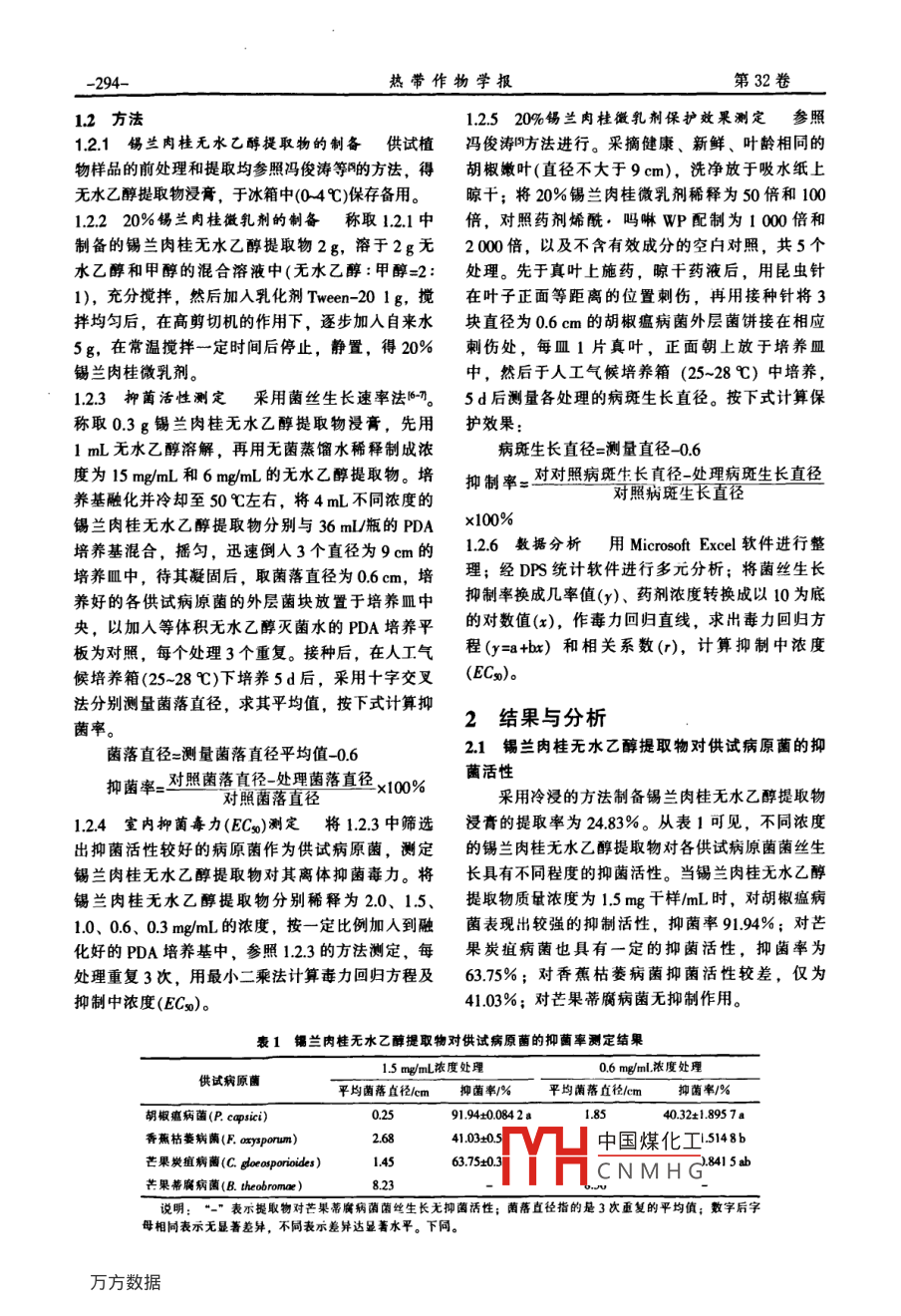 熱帶作物學報2011,32(2):293-29Inese journal of Tropical Crops錫蘭肉桂無水乙醇提取物的抑菌活性茍亞峰12,李志剛1,孫世偉1,桑利偉',劉愛勤121中國熱帶農(nóng)業(yè)科學院香料飲料研究所,海南萬寧5715332國家重要熱帶作物工程技術研究中心,海南儋州571737摘要采用菌絲生長速率法和組織測定法,測定錫蘭肉桂無水乙醇提取物對胡椒瘟病菌、香蕉枯萎病菌、芒果炭疽病菌和芒果蒂腐病菌的抑菌活性以及20%錫蘭肉桂微乳劑對胡椒癌病的保護作用。結(jié)果表明,錫蘭肉桂無水乙醇提取物對胡椒瘟病菌具有較好的抑菌活性,在濃度15mgmL時抑菌率為994%,EC為06875mgmL;對芒果炭疽病菌的抑菌率為6375%,但對芒果蒂腐病菌無抑菌活性。20%錫蘭肉桂微乳劑對胡椒瘟病表現(xiàn)出較好的保護效果,當稀釋100倍和50倍時抑制率分別為7279%和7891%。關鍵詞錫蘭肉桂提取物;胡椒瘟病菌;抑菌活性;保護效果中圖分類號S4822文獻標識碼AStudy the inhibitory Activity of Cinnamomumzeylanicum Bl Ethanol ExtractionGoU Yafeng, LI Zhigang, SUN Shiwei, SANG Liwei, LIU Aiqin+2I Research Institute of Spice and Beverage Crops, CATAS, Wanning Hainan 5715332 State Engineering and Technology Research Center for Importantpica Crops, Danzhou Hainan 571737ity of Cinnamomum zeylanicum B1. ethanol extraction against Phytophthorcapsici, Fusarium oxysporum f sp. cubense, Colletotrichum gloeosporioides and Botryodiplodia theobromae by mycelium growthrate method and in viva. The results indicated that Cinnamomum zeylanicum Bl ethanol extraction had good inhibitoryactivity to Phytophthora capsici. At the concentration of 1.5 mg/mL, the inhibitory rate were 91.949, ECo was 0.6875me/mL 63.75% to Colletotrichum gloeosporioides but no inhibitory effect to Botryodiplodia theobromae. The protective efficacyof 20% Cinnamomum zeylanicum ME was 72.79% and 78.91% respectively at the concentration of 100x and 50xKey words Cinnamomum zeylanicum B1. extraction; Phytophthora capsici; Inhibitory activity: Protective efficacydoi103969/isn.1000-2561,20110021錫蘭肉桂( Cinnamomum zeylanicum Bl)為樟菌、香蕉枯萎病菌、芒果炭疽病菌和芒果蒂腐病菌科樟屬植物,在中國廣東、廣西、海南和臺灣均有為供試病原菌,測定錫蘭肉桂無水乙醇提取物的抑栽培。錫蘭肉桂的桂皮是一種古老的香料,最初發(fā)菌活性及其微乳劑的防治效果,為錫蘭肉桂殺菌劑現(xiàn)在埃及木乃伊的尸體中,其樹皮具有防腐、健的開發(fā)應用提供理論依據(jù)。胃、抗癌、殺菌、殺蟲、殺螨等多種活性。陳青等報道錫蘭肉桂丙酶提取物對棉鈴蟲和皮氏葉螨具1材料與方法有較強的毒殺作用,并分別對其體內(nèi)多種解毒代謝11材料酶具有明顯的抑制作用。馮崗等測定了錫蘭肉桂1.L.1供試病原菌胡椒瘟病菌( Phytophthora提取物對集中害螨的殺螨活性,表明錫蘭肉桂葉乙 capsici)由中國熱帶農(nóng)業(yè)科學院香料飲料研究所植醇提取物對朱砂葉螨、皮氏葉螨、比哈小爪螨均有保中心提供;香蕉枯萎病菌( Fusarium oxysporum f毒殺作用。 Egbert等研究發(fā)現(xiàn)錫蘭肉桂精油具有sp. cubense)由中國熱帶農(nóng)業(yè)科學院??趯嶒炚咎釓V譜的抗菌活性,對供試曲霉屬菌株A.nigr,A.供;芒果炭疽病菌( Colletotrichum gloeosporioides)jas和A. fumigatus等生長具有較好的抑菌活性。和芒果蒂腐病菌( Botryodiplodia theobromae)由中國但目前國內(nèi)外有關錫蘭肉桂提取物的抑菌活性報道熱帶農(nóng)業(yè)科學院環(huán)境與植物保護研究所提供。較少,為進一步深入了解錫蘭肉桂提取物的抑菌活1.l2羋故把蘭肉桂葉于2009年中國煤化性,本文以幾種主要熱帶作物上典型病害胡椒瘟病10月}飲料研究所。CNMHG收稿日期:2010-05-12修回日期:20100920基金項目:公益性行業(yè)科研專項(No.200903024005),海南省自然科學基金項目(No.309055)資助作者簡介:茍亞峰,女,研究實習員,研究方向:檀物源農(nóng)藥研究開發(fā)?!ねㄓ嵶髡?劉愛勤,E-mil:lag3680@163com熱帶作物學報第32卷12方法1.2520%錫蘭肉桂微乳劑保護效果測定參照12.1錫蘭肉桂無水乙醇提取物的制備供試植馮俊濤門方法進行。采摘健康、新鮮、葉齡相同的物樣品的前處理和提取均參照馮俊濤等的方法,得胡椒嫩葉(直徑不大于9cm),洗凈放于吸水紙上無水乙醇提取物浸膏,于冰箱中(04℃)保存?zhèn)溆谩A栏?將20%錫蘭肉桂微乳劑稀釋為50倍和10012.220%錫蘭肉桂微乳劑的制備稱取1.21中倍,對照藥劑烯酰,嗎啉WP配制為100倍和制備的錫蘭肉桂無水乙醇提取物2g,溶于2g無2000倍,以及不含有效成分的空白對照,共5個水乙醇和甲醇的混合溶液中(無水乙醇:甲醇=2:處理。先于真葉上施藥,晾干藥液后,用昆蟲針1),充分攪拌,然后加入乳化劑Twen-201g,攪在葉子正面等距離的位置刺傷,再用接種針將3拌均勻后,在高剪切機的作用下,逐步加入自來水塊直徑為06cm的胡椒瘟病菌外層菌餅接在相應5g,在常溫攪拌一定時間后停止,靜置,得20%刺傷處,每皿1片真葉,正面朝上放于培養(yǎng)皿錫蘭肉桂微乳劑。中,然后于人工氣候培養(yǎng)箱(25-28℃)中培養(yǎng)1.2.3抑菌活性測定采用菌絲生長速率法。5d后測量各處理的病斑生長直徑。按下式計算保稱取03g錫蘭肉桂無水乙醇提取物浸膏,先用護效果:1mL無水乙醇溶解,再用無菌蒸餾水稀釋制成濃病斑生長直徑=測量直徑0.6度為15mmL和6mmL的無水乙醉提取物。培抑制率=對對照病魔牛長直徑處理班生長直徑養(yǎng)基融化并冷卻至50℃左右,將4mL不同濃度的錫蘭肉桂無水乙醇提取物分別與36mL瓶的PDA×100%培養(yǎng)基混合,搖勻,迅速倒