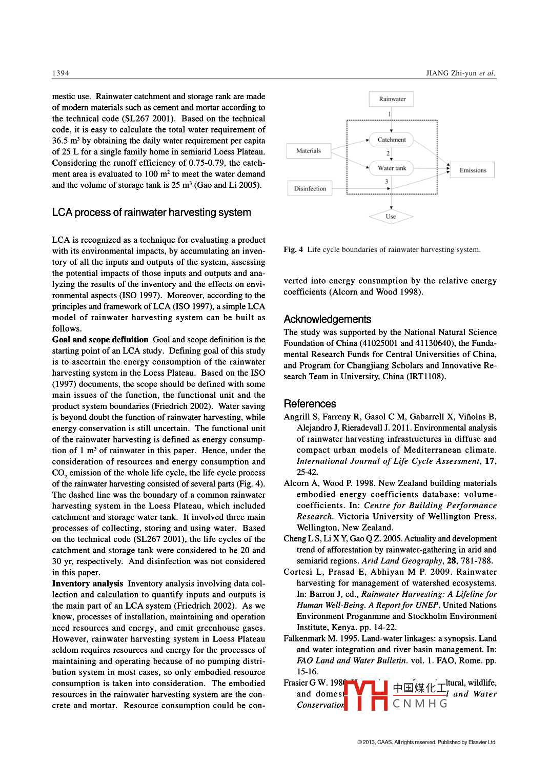 Available online at www.sciencedirect.comJournal of Integrative Agriculture2013, 12(8): 1389- 1395心ScienceDirectAugust 2013RESEARCH ARTICLEWater and Energy Conservation of Rainwater Harvesting System in the LoessPlateau of ChinaJIANG Zhi-yun1.2, LI Xiao yanl.2 and MA Yu-jun1.21 State Key Laboratory of Earth Surface Processes and Resource Ecology, Beijing Normal University, Beiing 100875, P.R.China2 College of Resources Science and Technology, Beijing Normal University, Beijing 100875, P.R. ChinaAbstractWater is the source of all the creatures on the earth and energy is the main factor driving the world. With the increasingpopulation and global change, water and energy conservation have become worldwide focal issues, particularly in thewater-stressed and energy-limited regions. Rainwater harvesting, based on the collection and storage of rainfall runoff,has been widely used for domestic use and agricultural production in arid and semiarid regions. It has advantages ofsimple operation, high adaption, low cost and less energy consumption. This study reviewed rainwater harvestingsystems adopted in the Loess Plateau of China and analyzed water use efficiency (WUE) for various rainwater harvestingtechniques. Supplemental irigation using harvested rainwater could increase crop yield by more than 30%, and WUEranged from 0.7 to 5.7 kg m-3 for spring wheat, corn and flax, and 30-40 kg m-3 for vegetables. Moreover, energy consumptionfor rainwater harvesting based on single family was compared with traditional water supply in the city of the Loess Plateauusing the life cycle assessment (LCA) method. Results showed that energy consumption yielded per unit harvestedrainwater was 25.96 MJ m-3 yr-1 which was much less than 62.25 MJ m-3 yr-1 for main water supply in Baoji City, ShanxiProvince, meaning that rainwater harvesting saved energy by 139.8% as compared to the main water supply system. Thisstudy highlights the importance and potential of rainwater harvesting for water and energy conservation in the nearfuture.Key words: rainwater harvesting, water saving, energy conservation, life cycle assessment (LCA)INTRODUCTIONsidering water productivity gains. Energy crisis is alsoserious, and about 1.6 billion people are lacking of en-Water and energy are two basic needs for human toergy for cooking, lighting and heating (Granit 2011). .survive. Unfortunately, water supplies are encounter-Precipitation is the main available water source in theing unprecedented challenge with the increasing demandterrestrial water balance (Oki and Kanae 2006), and itof industry, agriculture and booming urban populations .can be partitioned into two groups: blue water and green(UNESCO 2012). Hundreds of millions of people arewater (Falkenmark 1995). Blue water as the conven-still undergoing water scarcity and waterborne diseasestional water resource consists of surface water and(Gilbert 2012). Rockstrom (2003) reported that an ad-groundwater, and green water is considered to be theditional 5 800 km3 yr! is needed to meet the water de- evapotranspiration flow. Okiand and Kanae (2006) esti-中國煤化工Received 17 October, 2012 Acepted 10 January, 2013CNMHGCorrespondence LI Xiao-yan, Tel: +86- 10-588027 I6, E-mail: xyli@ bnu.cdu.cnMH02013,CAAS.. AII nghs reserved. Publishedby ElsevierLtd.doxi:10.1016/S2095-3119(13)60553-51390 _JIANG Zhi-yun et al.mated that blue water utilized by human beings was aboutergy consumption of an office building. However, it3 800 km3 yrl, only less than 10% of the maximum avail-has also been pointed out that rainwater harvestingable renewable freshwater, which was far lower thanactually had negative impacts on environment, par-the green water estimated to be 22 000 km3 yr'.ticularly in relation to energy consumption and CO2Therefore, green water has a great potential to be usedemission (Parkes et al. 2010). Hence, rainwaterfor solving water stress. Rainwater harvesting, as anharvesting, not to be a simple water saving technique,old and efficient approach to collect rainfall, can de-should be evaluated through taking energycrease unproductive evaporation, which means highlyconsumption, environmental impacts and other aspectsefficient use of green water. It has been widely used into account synthetically. Many previous studies havefor domestic use and supplemental irrigation in China,confirmed the positive effects of rainwater harvestingBrazil, Australia, Germany, India, Japan, New Zealandon energy conservation and environment, but differedand so on (Zaizen et al. 2000; Hills et al.2001; UNEPwith their different conditions, different systems and2002). Previous studies concerming rainwater harvest-different methods (Li and Gong 2002a; Mithraratneing techniques mainly focused on water saving, but theand Vale 2007; Grady and Younos 2008; Cortesi 2009;researches on energy conservation were still scarce.Angrill et al.2011; Ward et al. 2011). Energy conser-In order to build environmentally sustainable economies,vation for rainwater harvesting needs to be furtherit is necessary to integrate the water supply and demand, studied.energy and growing food into consideration. GradyThe history of rainwater harvesting techniques inand Younos (2008) had ever analyzed rainwater har-China may date back to 2700 yr ago extensively ap-vesting of a single family in Virginia, US, and the re-plied in the Loess Plateau (Li and Gong 2002a; Li 2003),sults showed that its energy efficiency was higher thanbut there were seldom systematic studies about rain-that of the groundwater in theory, but in practice, itwater harvesting until the 1980s (Li 1998). Previousdepended on the efficiency of the pump. Actually, rain- studies about rainwater harvesting mainly focused onwater harvesting systems, used concrete rain tanks,its benefits for solving water stress, improving agri-could decrease the life-cycle energy consumption bycultural production (Li 2003), adjusting agricultural3% and reduce the cost by 34% compared with mainstructur