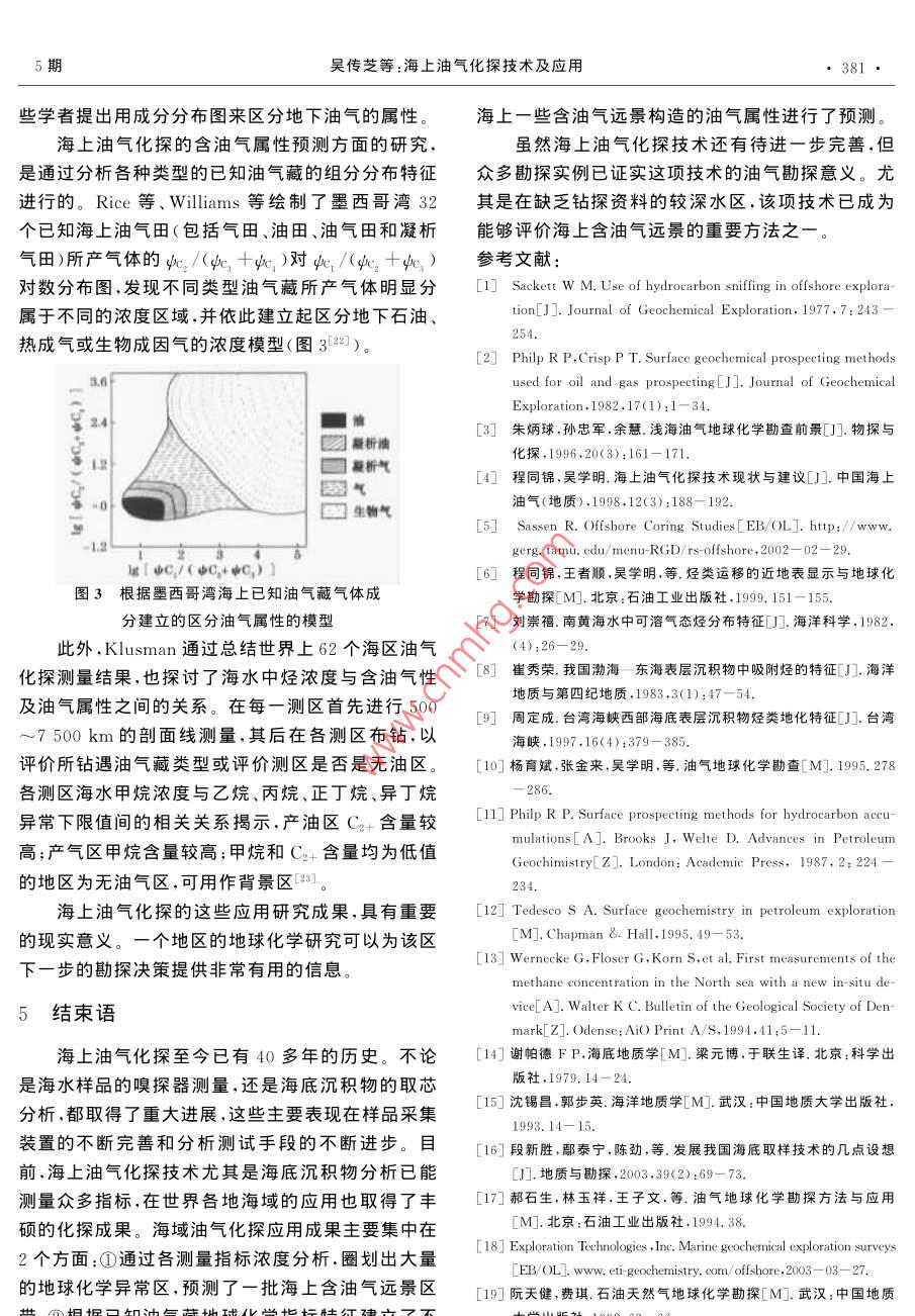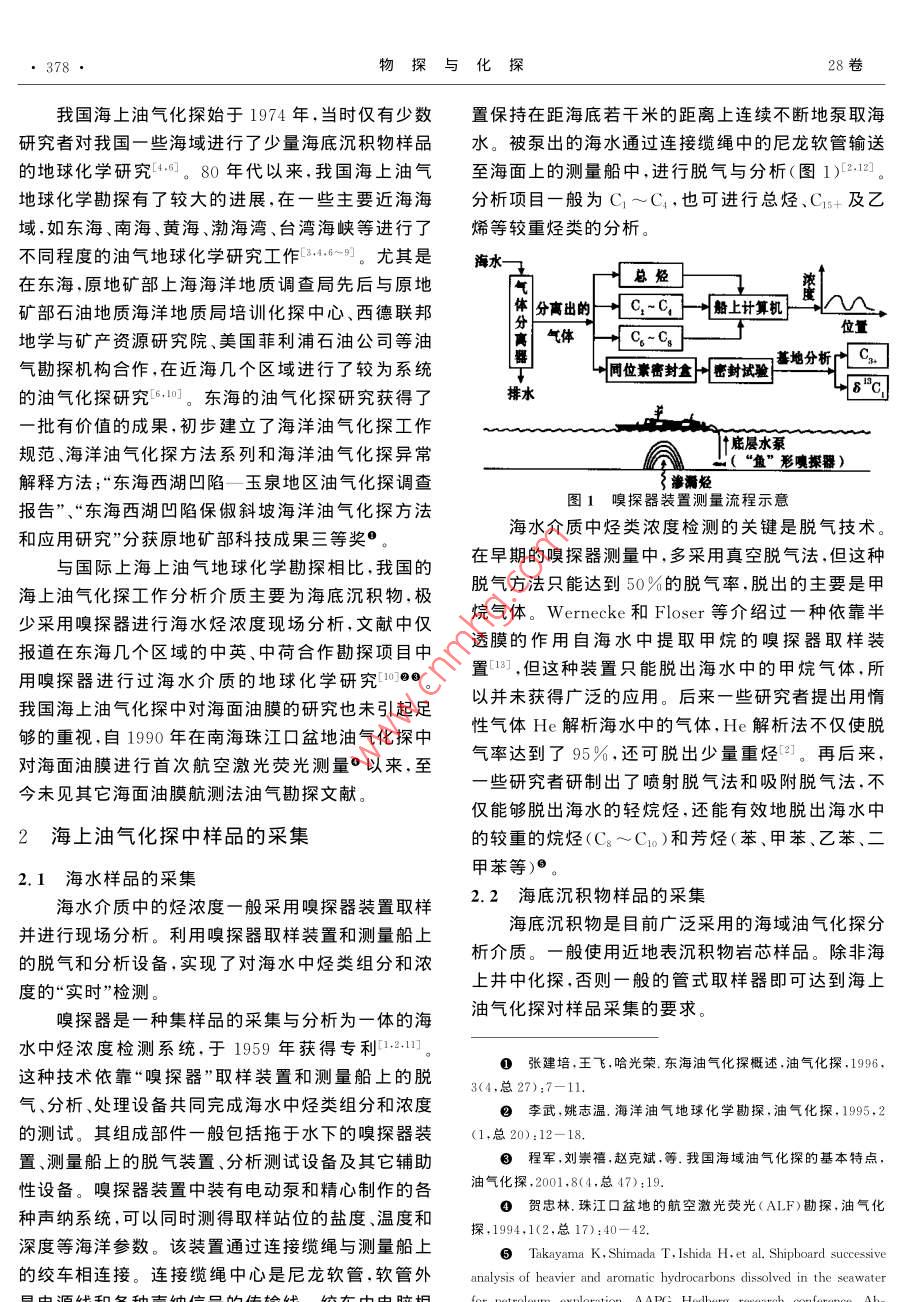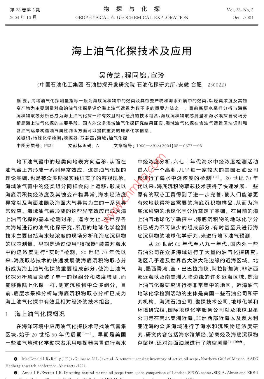 第28卷第5期物探與化探Vol. 28.No. 52004年10月GEOPHYSICAL &. GEOCHEMICAL EXPLORATIONOct. ,2004海上油氣化探技術及應用吳傳芝,程同錦,宣玲(中國石油化工集團石油勘探開發(fā)研究院石油化探研究所.安徽合肥230022)摘要:海域油氣化探測量指標-般為海底沉積物中的烴類及其蝕變產物和海水介質中的烴類,以烴類濃度及其蝕變產物為主要測量對象的油氣化探是評價海上油氣遠景為數不多的重要方法之一。目前底層水采樣分析與海底沉積物取芯分析已成為海上油氣化探一種有效且相對經濟的技術組合.海底沉積物取芯測量和海水嗅探器現場分析是海.上油氣化探的主要手段。國內外眾多海域油氣化探研究結果證實,海域油氣化探在含油氣遠景區(qū)塊識別和含油氣遠景構造油氣屬性判識方面可以提供重要的地球化學信息。關鍵詞:地球化學檢測:嗅探器;取芯器;海域;油氣化探中圖分類號: P632文獻標識碼: A文章編號: 1000- 8918(2004)05 - 0377-05地下油氣藏中的烴類向地表方向運移,從而在中烴濃度分析,六七十年代海水中烴濃度檢測活動油氣藏上方形成-系列異常效應。這是油氣化探的進入了一個高潮,幾乎每-家較大的美國石油公司理論基礎.也是被眾多勘探實踐證實了的客觀現象。都進行了海水中烴濃度的檢測1.2]。20 世紀70年海域油氣藏中的烴類組分同樣會向上運移,形成以代以來,海底沉積物取芯技術獲得了快速發(fā)展,一-些海底沉積物烴濃度及其蝕變產物異常、海水烴濃度原有的取芯工具得到了進一步完善,使人們能夠更異常以及海面油膜及海面大氣異常為主的一系列異有效地獲得符合需要的海底沉積物樣品,從而為海常效應。海域油氣藏形成的這些異常效應已成為海底沉積物的地球化學分析奠定了基礎。在目前的海上油氣化探的基本檢測對象。迄今為止,在世界各上油氣地球化學勘探中,海底沉積物的地球化學分大海域進行的油氣化探研究,所用的地球化學檢測析已成為不可缺少的組成部分,有時甚至只進行海技術主要包括海水烴濃度的現場分析和海底沉積物底沉積物的地球化學研究,來進行地下油氣預測。的取芯測量。早期是通過使用“嗅探器”裝置對海水從20世紀60年代至八九十年代,國內外一些中的烴濃度進行“實時”檢測。20世紀70年代以石油公司在眾多海域進行了大量的油氣化探研究,來,海底取芯技術的快速發(fā)展使海底沉積物取芯分測區(qū)幾乎遍及世界各大洲大陸邊緣的近海區(qū)域。北析成為海上油氣化探的重要組成部分,使海上油氣海、墨西哥灣、圣●巴巴拉海峽、阿拉斯加灣、非洲西化探分析項目突破了單一的烴組分和濃度檢測,而部近海以及南美洲大陸邊緣的許多近海區(qū)域,是海能夠像陸上化探一樣,測定沉積物中眾多組分。目上油氣化探研究進行得非常集中的地區(qū)。近海油氣前,底層水采樣分析與海底沉積物取芯分析已成為地球化學檢測活動的主體是美國-些石油公司和研海上油氣化探中有效且相對經濟的技術組合。究機構。海灣石油公司、勘探技術公司地球化學和環(huán)境研究組、國際地球化學服務公司以及地球衛(wèi)星1海上油氣化探 概況公司等在南北美洲近海、非洲西部近海以及澳大利在海洋環(huán)境中應用油氣化探技術尋找油氣富集亞近海的眾多海域進行了海水和沉積物烴濃度研區(qū)塊,始于20世紀50年代后期1-4]。早期是美國究,研究內容包括海水溶解烴、游離烴及海底沉積物一些油氣地球化學勘探者采用嗅探器裝置進行海水存留烴,還對海面油膜進行了航空測量[1.510◎。?MacDonald I R .ReillyJ F Jr.Guinasso N L Jr.et al. A remote - sensing inventory of active oil seeps, Northern Gulf of Mexico. AAPGHedberg research conference : Abstracts.1994.?AmosJ F.Everett J R. Detecting natural marine oil seeps from space ;comparison of Landsat。SPOY .seasat,SIR- A.Almaz and ERS-1378●物探與化探28卷我國海上油氣化探始于1974年.當時僅有少數置保持在距海底若干米的距離上連續(xù)不斷地泵取海研究者對我國-些海域進行了少量海底沉積物樣品水。被泵出的海水通過連接纜繩中的尼龍軟管輸送的地球化學研究(4.6。80 年代以來,我國海上油氣至海面上的測量船中,進行脫氣與分析(圖1)12.12]。地球化學勘探有了較大的進展,在-些主要近海海分析項目一般為C~C;,也可進行總烴、C1s+及乙域,如東海、南海、黃海、渤海灣、臺灣海峽等進行了烯等較重烴類的分析。不同程度的油氣地球化學研究工作E3.4.6~9]。尤其是海水在東海,原地礦部上海海洋地質調查局先后與原地總經礦部石油地質海洋地質局培訓化探中心、西德聯邦體分離出的一+[ C.-C→船上計算機位置地學與礦產資源研究院、美國菲利浦石油公司等油氣體→C%-C,氣勘探機構合作,在近海幾個區(qū)域進行了較為系統(tǒng)同位素密封日-(密封試驗基地分析廣"(的油氣化探研究6.10。東海的油氣化探研究獲得了排水-批有價值的成果,初步建立了海洋油氣化探工作↑底層水泵規(guī)范海洋油氣化探方法系列和海洋油氣化探異常出0“魚”形嗅探器)解釋方法;“東海西湖凹陷一玉 泉地區(qū)油氣化探調查{滲滑烴圖1嗅探器裝置測量流程示意報告”、“東海西湖凹陷保俶斜坡海洋油氣化探方法海水介質中烴類濃度檢測的關鍵是脫氣技術。和應用研究”分獲原地礦部科技成果三等獎"。與國際上海上油氣地球化學勘探相比,我國的在早期的嗅探器測