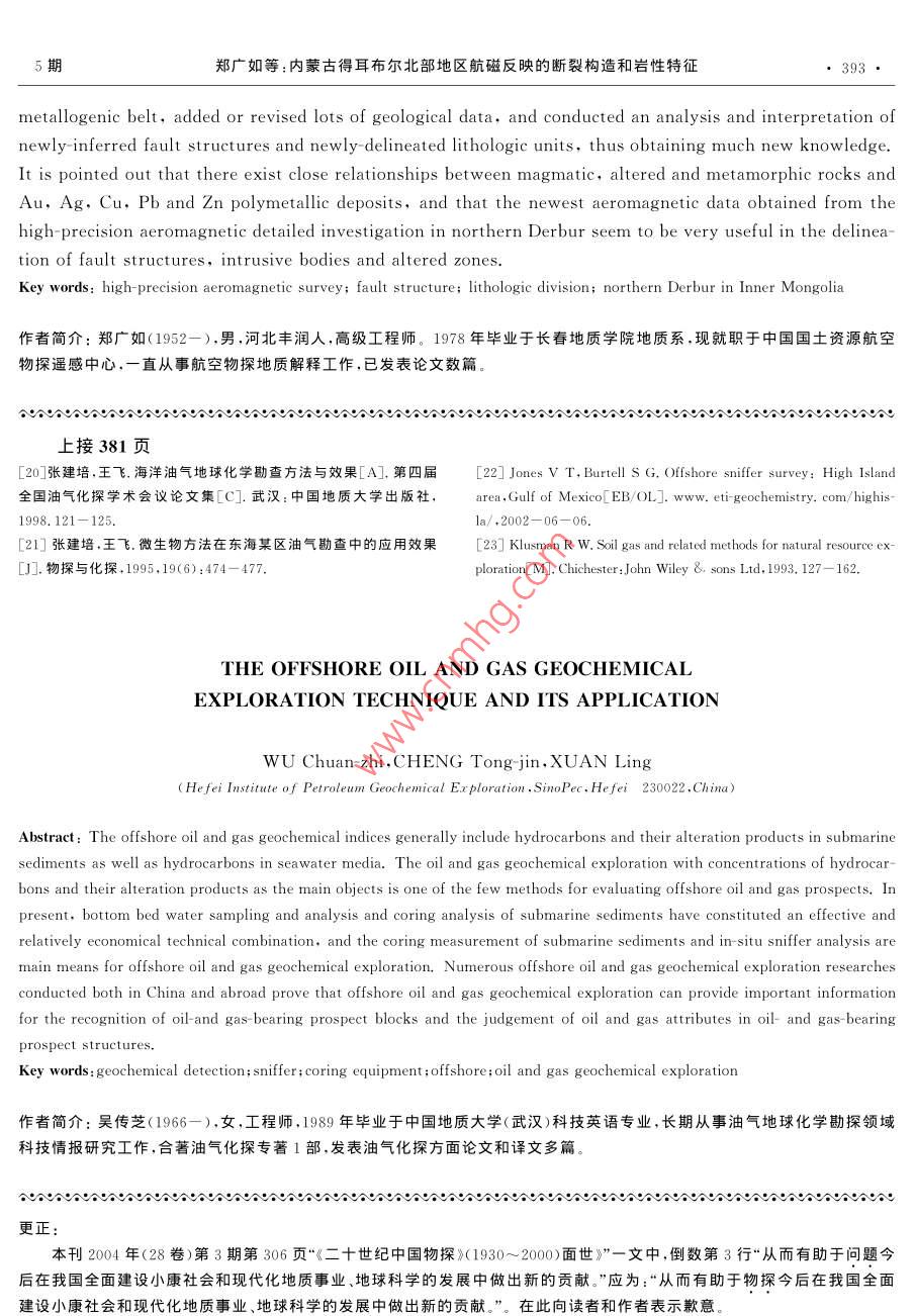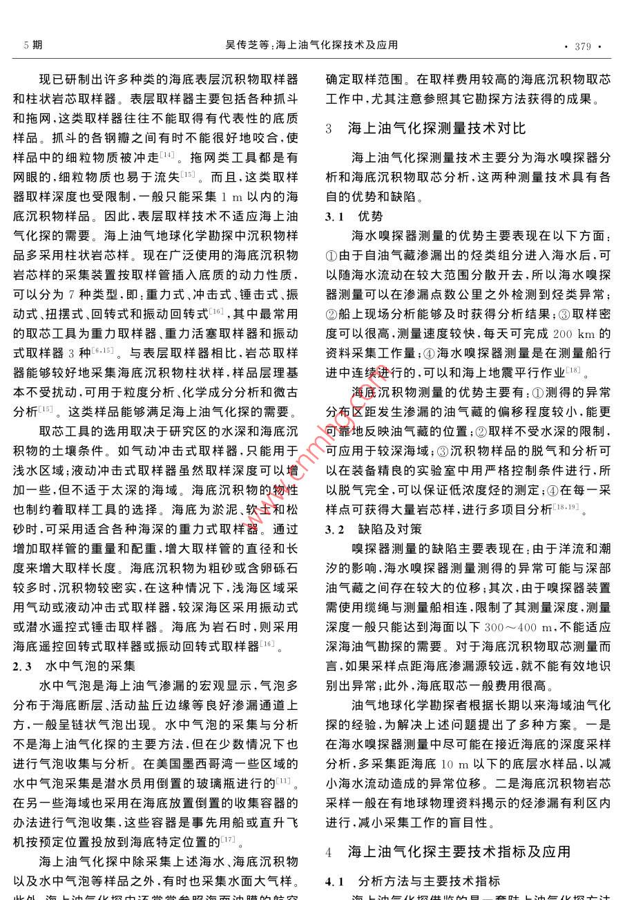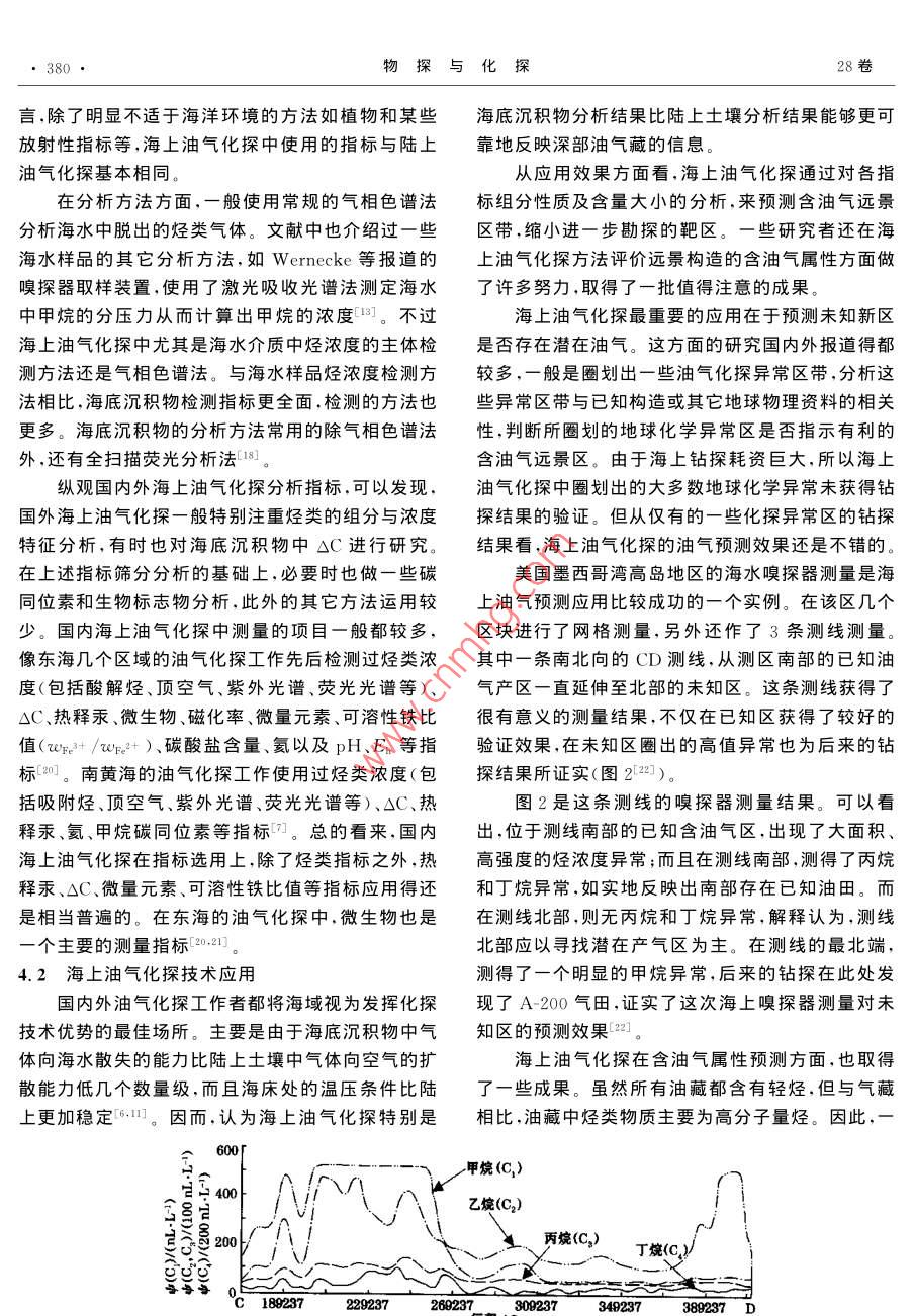 第28卷第5期物探與化探Vol. 28.No. 52004年10月GEOPHYSICAL &. GEOCHEMICAL EXPLORATIONOct. ,2004海上油氣化探技術及應用吳傳芝,程同錦,宣玲(中國石油化工集團石油勘探開發(fā)研究院石油化探研究所.安徽合肥230022)摘要:海域油氣化探測量指標-般為海底沉積物中的烴類及其蝕變產物和海水介質中的烴類,以烴類濃度及其蝕變產物為主要測量對象的油氣化探是評價海上油氣遠景為數不多的重要方法之一。目前底層水采樣分析與海底沉積物取芯分析已成為海上油氣化探一種有效且相對經濟的技術組合.海底沉積物取芯測量和海水嗅探器現場分析是海.上油氣化探的主要手段。國內外眾多海域油氣化探研究結果證實,海域油氣化探在含油氣遠景區(qū)塊識別和含油氣遠景構造油氣屬性判識方面可以提供重要的地球化學信息。關鍵詞:地球化學檢測:嗅探器;取芯器;海域;油氣化探中圖分類號: P632文獻標識碼: A文章編號: 1000- 8918(2004)05 - 0377-05地下油氣藏中的烴類向地表方向運移,從而在中烴濃度分析,六七十年代海水中烴濃度檢測活動油氣藏上方形成-系列異常效應。這是油氣化探的進入了一個高潮,幾乎每-家較大的美國石油公司理論基礎.也是被眾多勘探實踐證實了的客觀現象。都進行了海水中烴濃度的檢測1.2]。20 世紀70年海域油氣藏中的烴類組分同樣會向上運移,形成以代以來,海底沉積物取芯技術獲得了快速發(fā)展,一-些海底沉積物烴濃度及其蝕變產物異常、海水烴濃度原有的取芯工具得到了進一步完善,使人們能夠更異常以及海面油膜及海面大氣異常為主的一系列異有效地獲得符合需要的海底沉積物樣品,從而為海常效應。海域油氣藏形成的這些異常效應已成為海底沉積物的地球化學分析奠定了基礎。在目前的海上油氣化探的基本檢測對象。迄今為止,在世界各上油氣地球化學勘探中,海底沉積物的地球化學分大海域進行的油氣化探研究,所用的地球化學檢測析已成為不可缺少的組成部分,有時甚至只進行海技術主要包括海水烴濃度的現場分析和海底沉積物底沉積物的地球化學研究,來進行地下油氣預測。的取芯測量。早期是通過使用“嗅探器”裝置對海水從20世紀60年代至八九十年代,國內外一些中的烴濃度進行“實時”檢測。20世紀70年代以石油公司在眾多海域進行了大量的油氣化探研究,來,海底取芯技術的快速發(fā)展使海底沉積物取芯分測區(qū)幾乎遍及世界各大洲大陸邊緣的近海區(qū)域。北析成為海上油氣化探的重要組成部分,使海上油氣海、墨西哥灣、圣●巴巴拉海峽、阿拉斯加灣、非洲西化探分析項目突破了單一的烴組分和濃度檢測,而部近海以及南美洲大陸邊緣的許多近海區(qū)域,是海能夠像陸上化探一樣,測定沉積物中眾多組分。目上油氣化探研究進行得非常集中的地區(qū)。近海油氣前,底層水采樣分析與海底沉積物取芯分析已成為地球化學檢測活動的主體是美國-些石油公司和研海上油氣化探中有效且相對經濟的技術組合。究機構。海灣石油公司、勘探技術公司地球化學和環(huán)境研究組、國際地球化學服務公司以及地球衛(wèi)星1海上油氣化探 概況公司等在南北美洲近海、非洲西部近海以及澳大利在海洋環(huán)境中應用油氣化探技術尋找油氣富集亞近海的眾多海域進行了海水和沉積物烴濃度研區(qū)塊,始于20世紀50年代后期1-4]。早期是美國究,研究內容包括海水溶解烴、游離烴及海底沉積物一些油氣地球化學勘探者采用嗅探器裝置進行海水存留烴,還對海面油膜進行了航空測量[1.510◎。?MacDonald I R .ReillyJ F Jr.Guinasso N L Jr.et al. A remote - sensing inventory of active oil seeps, Northern Gulf of Mexico. AAPGHedberg research conference : Abstracts.1994.?AmosJ F.Everett J R. Detecting natural marine oil seeps from space ;comparison of Landsat。SPOY .seasat,SIR- A.Almaz and ERS-1378●物探與化探28卷我國海上油氣化探始于1974年.當時僅有少數置保持在距海底若干米的距離上連續(xù)不斷地泵取海研究者對我國-些海域進行了少量海底沉積物樣品水。被泵出的海水通過連接纜繩中的尼龍軟管輸送的地球化學研究(4.6。80 年代以來,我國海上油氣至海面上的測量船中,進行脫氣與分析(圖1)12.12]。地球化學勘探有了較大的進展,在-些主要近海海分析項目一般為C~C;,也可進行總烴、C1s+及乙域,如東海、南海、黃海、渤海灣、臺灣海峽等進行了烯等較重烴類的分析。不同程度的油氣地球化學研究工作E3.4.6~9]。尤其是海水在東海,原地礦部上海海洋地質調查局先后與原地總經礦部石油地質海洋地質局培訓化探中心、西德聯邦體分離出的一+[ C.-C→船上計算機位置地學與礦產資源研究院、美國菲利浦石油公司等油氣體→C%-C,氣勘探機構合作,在近海幾個區(qū)域進行了較為系統(tǒng)同位素密封日-(密封試驗基地分析廣"(的油氣化探研究6.10。東海的油氣化探研究獲得了排水-批有價值的成果,初步建立了海洋油氣化探工作↑底層水泵規(guī)范海洋油氣化探方法系列和海洋油氣化探異常出0“魚”形嗅探器)解釋方法;“東海西湖凹陷一玉 泉地區(qū)油氣化探調查{滲滑烴圖1嗅探器裝置測量流程示意報告”、“東海西湖凹陷保俶斜坡海洋油氣化探方法海水介質中烴類濃度檢測的關鍵是脫氣技術。和應用研究”分獲原地礦部科技成果三等獎"。與國際上海上油氣地球化學勘探相比,我國的在早期的嗅探器測