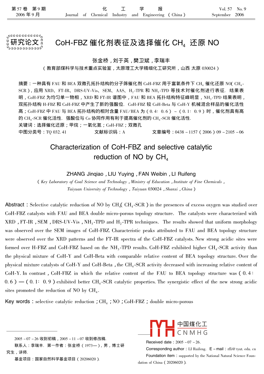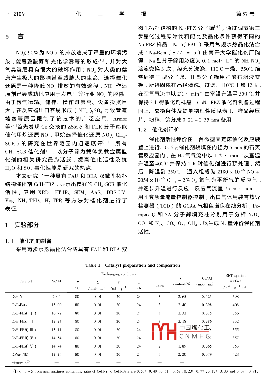 第57卷第9期化工學報Vol. 57 No 92006年9月Journal of Chemical Industry and Engineering ChinaSeptember 2006研究論文 CoH-FBZ催化劑表征及選擇催化CH4還原No張金橋,劉于英,樊衛(wèi)斌,李瑞豐教育部煤科學與技術(shù)重點實驗室,太原理工大學精細化工研究所,山西太原03004)摘要:一種具有FAU和BA雙微孔拓撲結(jié)構(gòu)的分子篩催化劑CoH-FBZ用于富氧條件下CH4催化還原NOCH4SCR),應(yīng)用XRD、FTR、 DRS-UV-Vis、SEM、AS、H2-TPR和NH3TPD等技術(shù)對催化劑進行表征.結(jié)果表明,CoH-FBZ為均勻單一物相,XRD和F-R譜圖中,FAU和BA拓撲結(jié)構(gòu)特征峰明顯,NH3-TPD結(jié)果表明雙拓撲結(jié)構(gòu)H-FBZ和 CoH-FBZ中產(chǎn)生了新的強酸位.CoH-FBZ較CoH-Beta與CoH-Y機械混合樣品的催化活性高;CoH-FBZ中FAU與BEA拓撲結(jié)構(gòu)的相對含量FAU/BEA為(0.4:0.6)~(0.1:0.9)時,催化劑具有高的CH4-SCR催化活性強酸位與Co協(xié)同作用有利于提高催化劑的CH4-SCR催化活性關(guān)鍵詞:選擇催化還原;甲烷;一氧化氮;CoH-FBZ;雙微孔中圖分類號:TQ032.41文獻標識碼:A文章編號:0438-1157(2006)09-2105-06Characterization of CoH-FBZ and selective catalyticreduction of no by chZHANG Jinqiao, LIU Yuying, FAN Weibin, LI RuifengKey Laboratory of Coal Science and Technology, Ministry of Education, Institute of Fine ChemicalsTaiyuan University of Technology Taiyuan 030024, Shanxi, ChinaAbstract: Selective catalytic reduction of no by CH C CH4-SCR in the presences of excess oxygen was studied overCoH-FBZ catalysts with FAU and BEA double micro-porous topology structure. The catalysts were characterized withXRD, FT-IR, SEM, DRS-UV-Vis, NH3-TPD and H2-TPR techniques. The results showed that uniform morphologywas observed over the SEM images of CoH-FBZ. Characteristic peaks attributed to FAU and BEA topology structurewere observed over the XRD patterns and the FT-IR spectra of the CoH-FBZ catalysts. New strong acidic sites wereformed over H-FBZ and Coh-FBZ based on the nh -tpd results. CoH-FBZ exhibited higher Ch -scr activity thanthe physical mixture of CoH-Y and CoH-Beta with comparable relative content of BEa topology structure. Over thephysical mixture catalysts of CoH-Y and CoH-Beta, the CH4-SCR activity decreased with increasing relative content ofCoh-Y. In contrasoH-FBZ in which the relative content of the fau to bea topology structure was(0.40.6)-(0. 1: 0.9) exhibited better CH4-SCR catalytic properties. The synergistic effect of the new strong acidicsites promoted the reduction of no by CH4Key words: selective catalytic reduction CHa NO: CoH-FBZ double micro-porous中國煤化工CNMHG2005-07-26收到初稿,2005-11-07收到修改稿聯(lián)系人:李瑞豐.第一作者:張金橋(1973-),男,博士研Received date: 2005-07-26究生,講師基金項目:國家自然科學基金項目(20206020Foundation item: supported by the National Natural Sciencedation of China( 20206020)2106化工學報第57卷微孔拓撲結(jié)構(gòu)的Na-FBZ分子篩*],通過調(diào)節(jié)第二步晶化過程原始物料配比及晶化條件獲得不同的Na-FBZ樣品.Na-Y(FAU)采用常規(guī)水熱晶化法合NO(90%為NO)的排放造成了嚴重的環(huán)境污成;Na-Beta(SiAl=15)由南開大學催化劑廠購染,能導致酸雨和光化學霧等的形成1,并對大得.Na型分子篩用濃度為0.1mol·L的NH4NO氣臭氧層具有很大的破壞作用;No.對人類的健溶液交換3次,經(jīng)充分洗滌、110℃千燥、50℃焙康產(chǎn)生極大的影響甚至威脅人的生命.選擇催化燒后得H型分子篩.H型分子篩用乙酸鈷溶液交還原是一種降低NO排放的有效途徑,NH作還換,所得固體樣品經(jīng)清洗、過濾、110℃千燥12h原劑已經(jīng)成功地應(yīng)用于發(fā)電廠等行業(yè)NO.的脫除.在空氣氣流中以2℃·min由室溫升溫至550℃并由于氨氣運輸、儲存、操作難度高、設(shè)備投資巨保持3h得催化劑樣品,CoNa-FBZ催化劑制備過程大,在反應(yīng)器出口容易形成(NH4)2SO4導致管道同上.交換條件及簡單物理性質(zhì)見表1.樣品經(jīng)壓堵塞等原因限制了該技術(shù)的廣泛應(yīng)用. Armor片、粉碎、篩分成0.21-0.35mm備用等2首先發(fā)現(xiàn)Co交換的ZSM5和FER分子篩能1.2催化劑評價催化甲烷還原NO,甲烷選擇催化還原NO(CH4SCR)的研究在世界范圍內(nèi)迅速展開31.所有催化劑活性評價在一臺微型固定床催化反應(yīng)裝置上進行.0.5g催化劑裝填在內(nèi)徑為6mm的石英CH4-SCR催化劑中,以分子篩為載體負載金屬催化劑的相關(guān)研究最為活躍,提高催化活性及抗管反應(yīng)器內(nèi),在He氣氣流中以1℃·mmn從室溫H2O和SO2毒化性能是研究的熱點升溫至400℃并保持1h對催化劑進行預處理,然本文研究了一種具有FAU和BEA雙微孔拓撲后,降溫到250℃,通入組成為2180×10-6NO+結(jié)構(gòu)催化劑CoH-FBZ,顯示出良好的CH4SCR催化2054×106CH4+2%O2氦氣為平衡氣的反應(yīng)氣,活性,應(yīng)用XRD、FTF-IR、SEM、AAS、 DRS-UV并逐步升溫進行反應(yīng).反應(yīng)氣流量75ml·minVis、NH12TPD、H2TPR等方法對催化劑進行了用4套質(zhì)量流量控制器控制,出口氣體用裝有熱導表征檢測器(TCD)的GC9A氣相色譜儀在線分析,Po-rapa Q和5A分子篩填充柱分別用于分析N2O、1實驗部分CO2和N2、CO、O2、CH4,以生成N2量評價催化劑活性.1.1催化劑的制備采用兩步水熱晶化法合成具有FAU和BEA雙Table 1 Catalyst preparation and compositionchanging conditionCo/ABET speciCatalystSi/Alntent/%/mol·mol-10.0115,000.0110.78800.0l0.315CoH-FBⅢ)中國煤化工CNMHGCoH-FBA V)14.741.89353CoNa-FBZ0.0l0.379mixture①(n=1-5, physical mixtures containing ratio of CoH-Y to CoH-Beta are 0. 51: 0. 49, 0. 31: 0. 69, 0.23: 0. 77, 0. 17: 0.83 and 0.09:0.91第9期張金橋