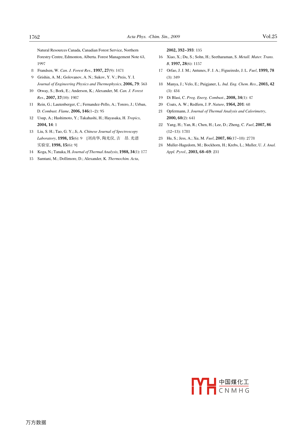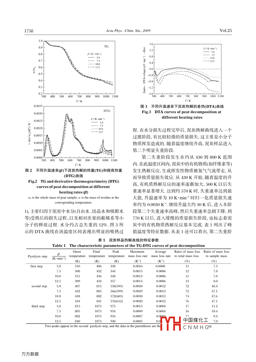 物理化學(xué)學(xué)報(bào)( Wuli huaxue Xuebao)1756Acta Phys.Chim.Sin,2009,25(9):1756-1762ptember[Articlewww.whxb.pku.edu.cn森林泥炭的熱解特性及熱解動(dòng)力學(xué)趙偉濤陳海翔*周建軍劉乃安(中國(guó)科學(xué)技術(shù)大學(xué)火災(zāi)科學(xué)國(guó)家重點(diǎn)實(shí)驗(yàn)室,合肥230026)摘要:泥炭陰燃是森林地下火的主要燃燒形式之一,硏究泥炭的熱解規(guī)律對(duì)認(rèn)識(shí)其陰燃機(jī)理及地下火蔓延機(jī)理有重要意義.本文使用熒光光譜分析技術(shù)測(cè)定了我國(guó)東北林區(qū)一種典型泥炭樣品的主要元素組成,并使用熱重-差熱分析(TG-DTA技術(shù)硏究了泥炭樣品在惰性氣氛中的熱解規(guī)律.實(shí)驗(yàn)結(jié)果表明,泥炭樣品主要由45種元素構(gòu)成.從常溫到1073K高溫的升溫過(guò)程中,泥炭樣品的質(zhì)量損失過(guò)程可以分為三個(gè)階段,依次為水分損失階段、有機(jī)質(zhì)熱解階段和礦物質(zhì)分解階段.對(duì)于泥炭陰燃密切相關(guān)的有機(jī)質(zhì)熱解階段,結(jié)合熱分析動(dòng)力學(xué)理論和優(yōu)化計(jì)算方法,建立了描述泥炭有機(jī)質(zhì)熱解動(dòng)力學(xué)規(guī)律的三組分疊加反應(yīng)模型關(guān)鍵詞:熱解;泥炭;地下火;動(dòng)力學(xué)模型;熱重-差熱分析中圖分類號(hào):O643Characteristics and Kinetics of Forest Peat PyrolysisZHAO Wei-TaoCHEn Hai-XiangZHoU Jian-Jun LiU Nai-An(State Key Laboratory of Fire Science, University of Science and Technology of China, Heifei 230026, P. R. chinaAbstract: Peat smoldering is one of the main combustion modes of forest ground fires. Research into the pyrolysiskinetics of peat is an essential step in studying the peat smoldering mechanism and ground fire behavior. We measuredthe elemental composition of one typical peat sampled from the northeast forest zone of China by means ofspectrofluorometry and studied the pyrolysis characteristics of peat with thermogravimetry-differential thermal analysis(TG-DTA). Results show that the peat sample is composed of more than 45 elements, The pyrolysis process of peatmay be divided into three stages, i.e., dehydration, organic matter pyrolysis and mineral decomposition. Becauseorganic matter pyrolysis played an important role in peat smoldering, the pyrolysis kinetics of organic matter wasdetermined. Using thermal kinetic analysis theory and optimization methods, the model that three-component reactparallelly was established to describe the scheme of peat pyrolysis. We found that the scheme containing three-parallelreactions could describe the pyrolysis kinetics very wellKey Words: Pyrolysis: Peat: Ground fire; Kinetic model; Thermogravimetry-differential thermal analysis地下火是森林火災(zāi)中一種難以控制的燃燒現(xiàn)象,我國(guó)東北林區(qū)是森林地下火的多發(fā)地區(qū).豐富會(huì)對(duì)森林土壤系統(tǒng)和生態(tài)系統(tǒng)造成毀滅性破壞.地的近土壤層和地下可燃物是地下火發(fā)生的物質(zhì)條下火還會(huì)釋放森林土壤固定的碳,是森林火災(zāi)煙氣件.按自上而下的層次,這些可燃物可以分為雜草、的主要來(lái)源,嚴(yán)重污染環(huán)境認(rèn)識(shí)地下火發(fā)生發(fā)展枯枝落葉、腐殖質(zhì)和泥炭吲地下火是地下腐殖質(zhì)和的客觀規(guī)律,是有效控制和撲救此類森林火災(zāi)的前泥炭陰燃形成的火災(zāi).因此,研究地下火發(fā)生發(fā)展規(guī)提.然而,地下火機(jī)理方面的相關(guān)研究卻進(jìn)展緩慢閂.律,必須研究腐殖質(zhì)或泥炭的陰燃規(guī)律.Received: April 10, 2009: Revised: May 16,Correspondingauthor.Email:hxchen@ustc.edu.cn;Tel:+86-551-3607276The project was supported by the National Natural Science Foundation of China(50806070)and re中國(guó)煤化工 e Industry, China(200704027)國(guó)家自然科學(xué)基金(50806070)和林業(yè)公益性行業(yè)科技專項(xiàng)(200704027)資助項(xiàng)目THCNMHGC Editorial office of Acta Physico-Chimica SinicaNo 9趙偉濤等:森林泥炭的熱解特性及熱解動(dòng)力學(xué)1757泥炭是原始森林沉積的凋落物經(jīng)過(guò)長(zhǎng)時(shí)間復(fù)雜302863生物物理化學(xué)過(guò)程后形成的一種物質(zhì)含有大量的3有機(jī)質(zhì),在適當(dāng)?shù)臈l件下就會(huì)發(fā)生陰燃,形成森林地o下火災(zāi).因此,目前有關(guān)地下火的研究工作主要集中2.5023721410105604ac o SiO, Fe, o, Cao N AL于關(guān)注泥炭(或腐殖質(zhì))陰燃的發(fā)生條件.研究表明圖1泥炭樣品的主要元素含量決定泥炭是否能夠維持陰燃的主要影響因素是泥炭Fig 1 Elemental composition of the peat中有機(jī)物含量、無(wú)機(jī)物含量和水分含量,泥炭陰燃能否維持的概率(有些文獻(xiàn)稱為¨點(diǎn)燃概率”,實(shí)際上使用日本島津( SHIMADZU)掃描型X射線熒是“蔓延概率”)與上述三種因素之間的關(guān)系可以通光光譜儀XRF-1800對(duì)泥炭樣品的元素組成進(jìn)行定過(guò)實(shí)驗(yàn)數(shù)據(jù)的擬合而得到.應(yīng)該指出,這些研究量測(cè)定.樣品制備采用粉末直接壓片法,逐步增大探討了泥炭陰燃維持的表觀影響因素,對(duì)于森林防壓力,同時(shí)保證加壓一定的時(shí)間.熒光光譜儀XRF火工程應(yīng)用有一定指導(dǎo)意義圓.但是這些研究得到1800能夠檢測(cè)出4號(hào)Be至92號(hào)U之間的所有元的是基于實(shí)驗(yàn)結(jié)果的表觀統(tǒng)計(jì)規(guī)律,沒(méi)有涉及地下素,檢測(cè)濃度范圍為10到100%火災(zāi)的內(nèi)在機(jī)制.要認(rèn)識(shí)地下火發(fā