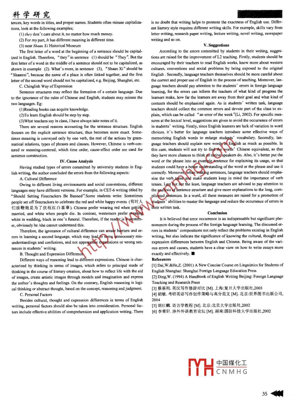 科學(xué)研究An Analysis on Errors in University Students’Compositions呼媛玲(西安職業(yè)技術(shù)學(xué)院陜西西安710017)Abstract: Based on some rescarch and clltions of students' English compositions, the thesis mainly clarfies erors in students' compositions into diferenttypes. Then , it makes an analysis of the causes through many examples in detail. In the conclusion part the thesis tries to find the solutions to improve Chineseleamers' writing ability and foreign language teaching.Key Words: English writing; errors; problems; solutinsIntroductionder or the context. Transitive verbs and intransitive verbs are restricted by whatDuc to the process of globalization, English plays a vital role in the world kind of elements that follows. Because of the diferences, it is likely that stu-stage. Meanwhile, English writing, serving as a part of basic skills of university dents misuse the transitive verbs and intransitive verbs.students, has been greatly promoted along with listening, speaking, reading andC. Errors in Article, Preposition, and Pronountranslating sills. However, when it comes to English writing, most of the stu-Except noun and verb crrors, errors in article, preposition, and pronoundents who have studied English for years can not write an elegant essay. Theare also committed in students' written task frequently. Firstly, errors in articlemain problem may lie in the fact that English learners are too much influencedare discussed.by the mother tongue, thus unable to get rid of the fixed way of expression of(1) Therefore, it is also good means of solving the problem ofheavy taffic.their own culture. For example, they write inoret English“My studies are(2) Pllution is the biggest problem in the cities.quite busy.”The sentence should be“I am quite busy with my studies.”WhyIn (1), the necessary article is missing; On the contrary, the unnecessarydo students commit such mistakes? What types of mistakes are they frequcntlyarticle is used in (2), which cause the errors.making? In what way can errors be avoided? To find out the answers, the au-Errors in article may result from the fact that there is no article contrast inthor analyzes the errors in students' compositions in great details.Chinese nouns.I. Lexical ErrorsSecondly, errors in preposition are discussed.Lexis plays a very important role in language study. In this section, lexical(1)We can draw some conclusions according to the satistis.errors are analyzed from the following aspects: errors in noun, verb, article,(2)However, people have different atitudes t0 failure.preposition and pronoun.For the Chinese sentences“我們從這些數(shù)據(jù)中得出結(jié)論”and“但是,人A. Errors in Noun們對(duì)于失敗持不同看法”,there is no need to use prepositions. However, inAccording to grammatical form, nouns can be divided into two classes:English there should be a“from" and a“towards" in the sentences (1) and (2)countable nouns and uncountable nouns. Errors in noun are selected from stu-respectively.dents' compositions:Students sometimes use wrong prepositions, because there are 286 prepo-(1) We can choose from an advertisement books.sitions in English, but only 30 in Chinese. The same preposition in Chinese can(2) And her mouth is very small with red lip.be used in various positions. However, in English, prepositions are used more(3) Sometimes, our parents brought us some foods and books.vigorously.In example (1), the suffix“-s”should be omitted after the article“an". InThrdly, the pronouns in English are various, including personal pronouns,example (2), the sufx“-s”should be added to“l(fā)ip" in accordance to the Eng-possessive pronouns, reflexive pronouns, reciprocal pronouns, dermonstratedlish plurality. Example (3) takes the uncountable nouns“ food”as countablepronouns, interrogative pronouns, relative pronouns and indefinite pronouns.under the influence ofChinese"很多食物”.English speakers use pronouns much more than Chinese so that Chinese learn-Compared with Chinese, English grammar appears to be more specificers tend to commit rrors of missing pronouns while writing English.and exact, such as countable plural nouns, which do not exist in Chinese gram-I . Combination of Different Types of Errorsmar. Therefore, Chinese students tend to ignore the plural form (-) while writIn this section, discussion will be concentated on erors in punctuation,ing English.capitalization and Chinglish way of expression.B. Errors in VerbA. Errors in PunctuationIn this section, transitive verb errors and intransitive verb errors made byPunctuation in English is a ltte difrent from that in Chinese. The authorstudents will be concentrated, Transitive verbs must be followed by an object,will not discuss errors of this type futher, since they are easy to identify andwhile intransitive verbs need not. Here are some errors:overcome for Chinese learners. However, the author only discusses some typi-(1) Just look the student around me.cal examples here: .(2) w aiting the end of the punishment.(1) She doesn't own the happiness that should belong to such itte gil,(3) Let's discuss right now.(2) As far as money is concermed, my opinion is,“ money is not every-In examples (1) and (2), the intransitive verbs“l(fā)ook" and“wait" are usedas transitive verbs,which may result from the fact that in Chineseand “ 等待某人"are transitive. The objects of the transitive verbs in exampleing difficulty for Chinese learners. In sentence (1),"“, "should be"." , as in Eng-(3) is wrongly omitted under the infuence of Chinese, for in Chinese it is saidlish, only“."can be used to end a sentence besides“?” and“!”. The error in“現(xiàn)在就討論”, but the crreet pattem in English is“discuss somehing”.sentence (2) is“,"after“is" should be“:", which is used to introduce an expla-According to Cai Jjigang (2003), on the one hand, English is explicit,natio