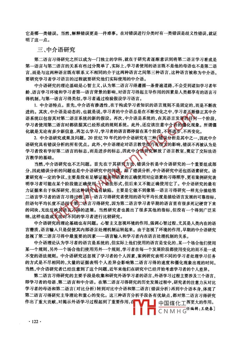 2010年第1期黑龍江社會科學(xué)Na. 1,2010(總第118期)Heilongjiang Social SciencesGeneral. No. 118對比分析、錯(cuò)誤分析及中介語研究仲晶瑤(黑龍江大學(xué)西語學(xué)院哈爾濱150080)摘要:第二語言習(xí)得研究主要涉及三種語言:學(xué)習(xí)者的母語、第二語言和中介語。 由于在不同的歷史時(shí)期受到不同理論的影響,第二語言研究者經(jīng)歷了從對比分析,即對比學(xué)習(xí)者的母語和第二語言,到錯(cuò)誤分析,即對比中介語和第二語言,再到研究中介語本身的過程。這三種語言分析手段各有優(yōu)缺點(diǎn),都對揭示外語學(xué)習(xí)過程起到了重要作用,對第二語言習(xí)得研究作出了重要貢獻(xiàn)。關(guān)鍵詞:對比分析;錯(cuò)誤分析;中介語中團(tuán)分類號:H1文獻(xiàn)標(biāo)志碼:A文章編號:1007 - 4937(2010)01 -0120 -03外語教學(xué)有多長的歷史,對外語學(xué)習(xí)者的研究就有多長的歷史,但在很長的一段時(shí)間內(nèi)對外語學(xué)習(xí)者的研究只是零散的、印象性的,不成系統(tǒng),直到20世紀(jì)40年代。從40年代到60年代,研究者們的興趣在于發(fā)現(xiàn)外語學(xué)習(xí)者的母語和第二語言的異同上,進(jìn)行了大量的對比分析。而后60年代起,學(xué)習(xí)者在外語學(xué)習(xí)過程中的作用得到了重視,研究者希望從他們的錯(cuò)誤中找到外語學(xué)習(xí)的規(guī)律,因而進(jìn)行了大量的錯(cuò)誤分析。與此同時(shí),學(xué)習(xí)者所使用的語言本身開始受到青睞,這種與母語和第二語言相關(guān)但又不盡相同的語言被稱為中介語,研究者力圖通過研究中介語的特點(diǎn)和發(fā)展規(guī)律找到外語學(xué)習(xí)的路徑,從而更好地指導(dǎo)外語學(xué)習(xí)和教學(xué)。一、對比分析對比分析其心理學(xué)基礎(chǔ)是行為主義,強(qiáng)調(diào)語言是習(xí)慣,語言的習(xí)得過程是習(xí)慣的形成過程。在第一語言習(xí)得過程中,兒童通過模仿和強(qiáng)化獲得母語的習(xí)慣。在外語學(xué)習(xí)中,模仿和強(qiáng)化仍是語言習(xí)得的手段,但學(xué)習(xí)者會把母語中的習(xí)慣“轉(zhuǎn)移"到第二語言中。研究者應(yīng)該系統(tǒng)對比學(xué)習(xí)者的母語和第二語言,找出兩種語言的不同,以預(yù)測學(xué)習(xí)者可能面臨的難點(diǎn)及可能會犯的錯(cuò)誤,并將這些不同作為教學(xué)的重點(diǎn)。對比分析的語言學(xué)基礎(chǔ)是結(jié)構(gòu)主義,強(qiáng)調(diào)把語言作為一個(gè)系統(tǒng)來研究,研究學(xué)習(xí)者的母語和第二二語言的語音、單詞、句子等語言單位的不同。1.對比分析的步驟。關(guān)于如何對比學(xué)習(xí)者的母語和第二語言,共分四個(gè)步驟:一是描述,即對學(xué)習(xí)者的母語和第二語言做形式上的描繪。二是篩選,即從學(xué)習(xí)者的母語和第二語言中選擇對比對象。三是對比,即比較從學(xué)習(xí)者的母語和第二語言中篩選出的對比對象,找出其相同點(diǎn)和不同點(diǎn)。四是預(yù)測,即通過學(xué)習(xí)者的母語和第二語言的相同點(diǎn)和不同點(diǎn),來預(yù)測學(xué)習(xí)者可能面臨的難點(diǎn)及可能出現(xiàn)的錯(cuò)誤。2.對比分析的作用及問題。對比分析有以下作用:首先,它有助于教學(xué)。通過對比學(xué)習(xí)者的母語和第二語言,教師可以了解兩種語言的不同,從而預(yù)測學(xué)習(xí)者學(xué)習(xí)中的難點(diǎn)及可能出現(xiàn)的錯(cuò)誤,并將兩.種語言的不同點(diǎn)作為教學(xué)的重點(diǎn),從而避免學(xué)習(xí)者犯錯(cuò)誤。其次,對比分析有助于測試。通過對比學(xué)習(xí)者的母語和第二語言,找出其不同,測試者能確定測試的內(nèi)容及如何測試。再次,對比分析有助于科研。在對比學(xué)習(xí)者的母語和第二語言的基礎(chǔ)上,研究者能夠確定其研究對象。20世紀(jì)60年代對比分析的問題逐漸顯現(xiàn)。首先,用行為主義解釋語言乃語言學(xué)習(xí)過程的做法受中國煤化工收稿日期:2009-11 -09TMHCNMH G作者簡介:仲晶瑤( 1974- ),女,黑龍江鶴崗人,講師,從事第二語口萬時(shí)、大唱數(shù)十低明九?!?20.到了抨擊。隨著心智主義及轉(zhuǎn)換生成語法的發(fā)展,語言不再被看做是習(xí)慣,而是一系列規(guī)則。 語言的習(xí)得過程不再是習(xí)慣的形成過程,而是規(guī)則的形成過程。在這一過程里,學(xué)習(xí)者根據(jù)接收到的語言信息形成關(guān)于語言規(guī)則的假設(shè),并通過不斷修正錯(cuò)誤的假設(shè),最終獲得正確的語言規(guī)則,從而習(xí)得語言。對比分析的語言學(xué)基礎(chǔ)也遭到了質(zhì)疑。語言對比研究中的對比單位應(yīng)適用于所有語言,而人類語言之間的差異之大使得這一點(diǎn)無法做到。此外,對比分析中通常對比兩種語言中的翻譯組對句,這缺乏理論依據(jù)。根據(jù)對比分析,通過對比學(xué)習(xí)者的母語和第二語言可以預(yù)測他們在外語學(xué)習(xí)中的錯(cuò)誤,而實(shí)際研究卻表明很多預(yù)測的錯(cuò)誤沒有出現(xiàn),相反,很多沒有預(yù)測到的錯(cuò)誤卻出現(xiàn)了。而對比研究了捷克的英語學(xué)習(xí)者和俄語學(xué)習(xí)者,發(fā)現(xiàn)俄語學(xué)習(xí)者有時(shí)將其母語中的粘著語素轉(zhuǎn)移到英語中,而英語學(xué)習(xí)者卻沒有這樣的做法,這與對比分