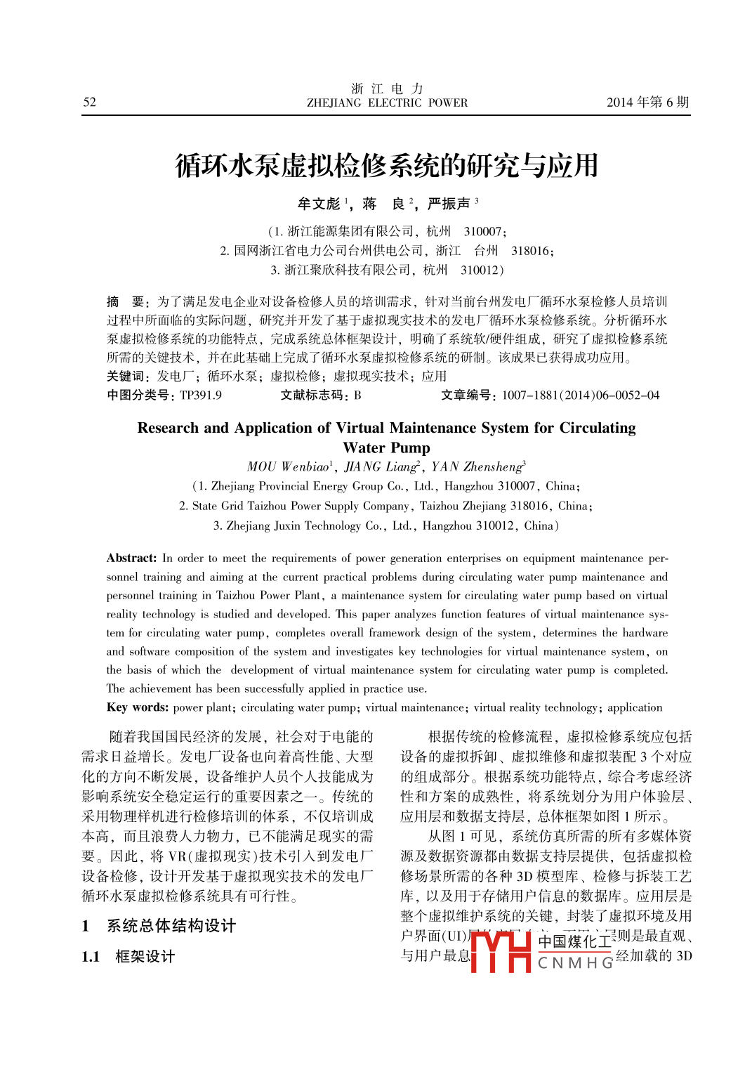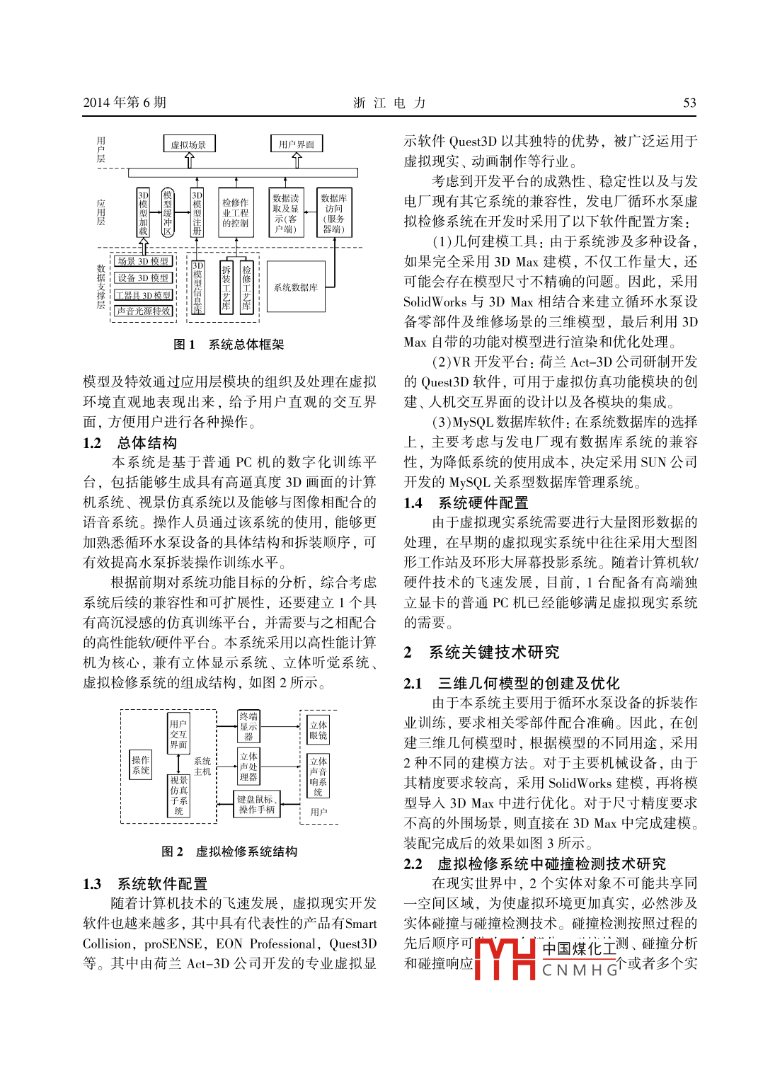 浙江電力52ZHEJIANG ELECTRIC POWER2014年第6期循環(huán)水泵虛擬檢修系統(tǒng)的研究與應(yīng)用牟文彪',蔣良了, 嚴(yán)振聲3(1.浙江能源集團(tuán)有限公司,杭州310007;2.國(guó)網(wǎng)浙江省電力公司臺(tái)州供電公司,浙江臺(tái)州318016;3.浙江聚欣科技有限公司,杭州310012)摘要:為了滿足發(fā)電 企業(yè)對(duì)設(shè)備檢修人員的培訓(xùn)需求,針對(duì)當(dāng)前臺(tái)州發(fā)電廠循環(huán)水泵檢修人員培訓(xùn)過(guò)程中所面臨的實(shí)際問(wèn)題,研究并開(kāi)發(fā)了基于虛擬現(xiàn)實(shí)技術(shù)的發(fā)電廠循環(huán)水泵檢修系統(tǒng)。分析循環(huán)水泵虛擬檢修系統(tǒng)的功能特點(diǎn),完成系統(tǒng)總體框架設(shè)計(jì),明確了系統(tǒng)軟/硬件組成,研究了虛擬檢修系統(tǒng)所需的關(guān)鍵技術(shù),并在此基礎(chǔ)上完成了循環(huán)水泵虛擬檢修系統(tǒng)的研制。該成果已獲得成功應(yīng)用。關(guān)鍵詞:發(fā)電廠;循環(huán)水泵;虛擬檢修;虛擬現(xiàn)實(shí)技術(shù);應(yīng)用中圖分類號(hào): TP391.9文獻(xiàn)標(biāo)志碼: B文章編號(hào): 1007-1881(2014)06- -0052-04Research and Application of Virtual Maintenance System for CirculatingWater PumpMOU Wenbiao', JIANG Liang', YAN Zhensheng'(1. Zhejiang Provincial Energy Group Co, Ltd, Hangzhou 310007, China;2. State Grid Taizhou Power Supply Company , Taizhou Zhejiang 318016, China;3. Zhejiang Juxin Technology Co., Ltd., Hangzhou 310012, China)Abstract: In order to meet the requirements of power generation enterprises on equipment maintenance per-sonnel training and aiming at the current practical problems during circulating water pump maintenance andpersonnel training in Taizhou Power Plant, a maintenance system for circulating water pump based on virtualreality technology is studied and developed. This paper analyzes function features of virtual maintenance sys-tem for circulating water pump, completes overall framework design of the system, determines the hardwareand software composition of the system and investigates key technologies for virtual maintenance system, onthe basis of which the development of virtual maintenance system for circulating water pump is completed.The achievement has been successfully applied in practice use.Key words: power plant; circulating water pump; virtual maintenance; virtual reality technology; application隨著我國(guó)國(guó)民經(jīng)濟(jì)的發(fā)展,社會(huì)對(duì)于電能的根據(jù)傳統(tǒng)的檢修流程,虛擬檢修系統(tǒng)應(yīng)包括需求日益增長(zhǎng)。發(fā)電廠設(shè)備也向著高性能、大型.設(shè)備的虛擬拆卸、虛擬維修和虛擬裝配3個(gè)對(duì)應(yīng)化的方向不斷發(fā)展,設(shè)備維護(hù)人員個(gè)人技能成為的組成部分。根據(jù)系統(tǒng)功能特點(diǎn),綜合考慮經(jīng)濟(jì)影響系統(tǒng)安全穩(wěn)定運(yùn)行的重要因素之一。傳統(tǒng)的性和方案的成熟性,將系統(tǒng)劃分為用戶體驗(yàn)層、采用物理樣機(jī)進(jìn)行檢修培訓(xùn)的體系,不僅培訓(xùn)成應(yīng)用層和數(shù)據(jù)支持層,總體框架如圖1所示。本高,而且浪費(fèi)人力物力,已不能滿足現(xiàn)實(shí)的需.從圖1可見(jiàn),系統(tǒng)仿真所需的所有多媒體資要。因此,將VR(虛擬現(xiàn)實(shí))技術(shù)引人到發(fā)電廠源及數(shù)據(jù)資源都由數(shù)據(jù)支持層提供,包括虛擬檢設(shè)備檢修,設(shè)計(jì)開(kāi)發(fā)基于虛擬現(xiàn)實(shí)技術(shù)的發(fā)電廠修場(chǎng)景所需的各種3D模型庫(kù)、檢修與拆裝工藝循環(huán)水泵虛擬檢修系統(tǒng)具有可行性。庫(kù),以及用于存儲(chǔ)用戶信息的數(shù)據(jù)庫(kù)。應(yīng)用層是整個(gè)虛擬維護(hù)系統(tǒng)的關(guān)鍵,封裝了虛擬環(huán)境及用1系統(tǒng)總體結(jié)構(gòu)設(shè)計(jì)戶界面(UI)中國(guó)煤化王則是最直觀、1.1 框架設(shè)計(jì)與用戶最息經(jīng)加載的3DHCNMHG2014年第6期浙江電力| 虛擬場(chǎng)景用戶界面示軟件Quest3D以其獨(dú)特的優(yōu)勢(shì),被廣泛運(yùn)用于個(gè)虛擬現(xiàn)實(shí)、動(dòng)畫制作等行業(yè)??紤]到開(kāi)發(fā)平臺(tái)的成熟性、穩(wěn)定性以及與發(fā)3| 檢修作數(shù)據(jù)讀取易H訪可數(shù)據(jù)庫(kù)電廠現(xiàn)有其它系統(tǒng)的兼容性,發(fā)電廠循環(huán)水泵虛|業(yè)工程的控制戶端)器端)擬檢修系統(tǒng)在開(kāi)發(fā)時(shí)采用了以下軟件配置方案:(1)幾何建模工具:由于系統(tǒng)涉及多種設(shè)備,-----年=-.場(chǎng)量3D模型網(wǎng)如果完全采用3D Max建模,不僅工作量大,還.設(shè)備3D模型]可能會(huì)存在模型尺寸不精確的問(wèn)題。因此,采用系統(tǒng)數(shù)據(jù)庫(kù). |工器具3D模型SolidWorks與3D Max 相結(jié)合來(lái)建立循環(huán)水泵設(shè)|聲音光源特效備零部件及維修場(chǎng)景的三維模型,最后利用3D圖1系統(tǒng)總體框架Max自帶的功能對(duì)模型進(jìn)行渲染和優(yōu)化處理。(2)VR開(kāi)發(fā)平臺(tái):荷蘭Act- 3D公司研制開(kāi)發(fā)模型及特效通過(guò)應(yīng)用層模塊的組織及處理在虛擬的Quest3D軟件,可用于虛擬仿真功能模塊的創(chuàng)環(huán)境直觀地表現(xiàn)出來(lái),給予用戶直觀的交互界建、人機(jī)交互界面的設(shè)計(jì)以及各模塊的集成。面,方便用戶進(jìn)行各種操作。(3)MySQL數(shù)據(jù)庫(kù)軟件:在系統(tǒng)數(shù)據(jù)庫(kù)的選擇1.2總 體結(jié)構(gòu)