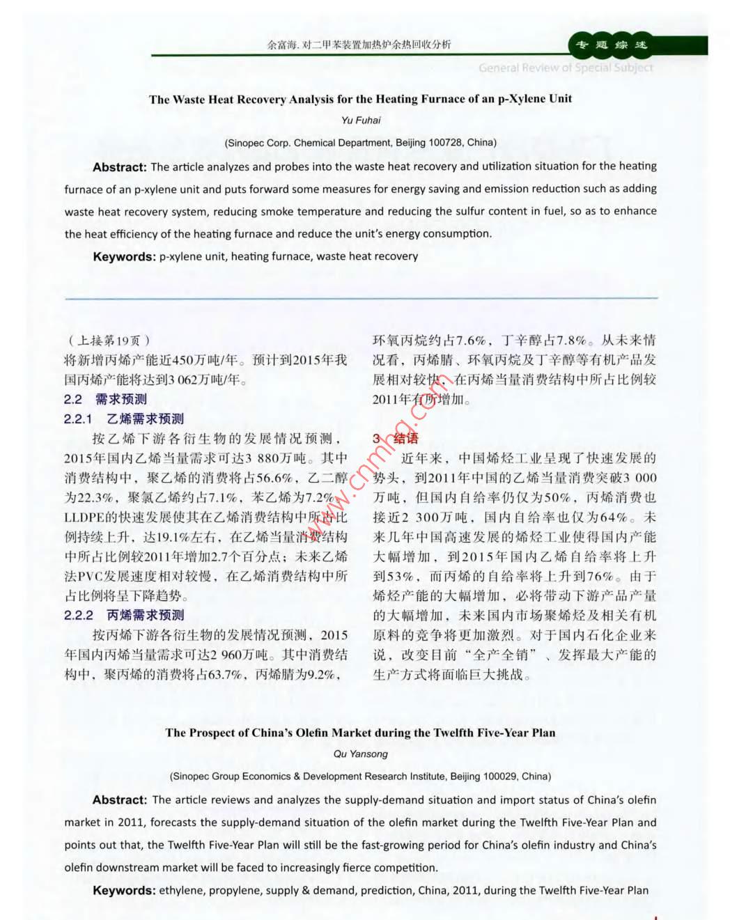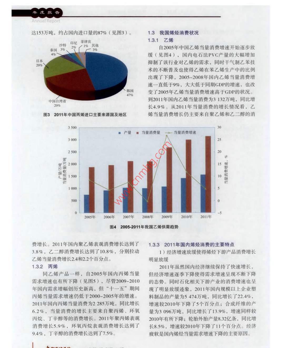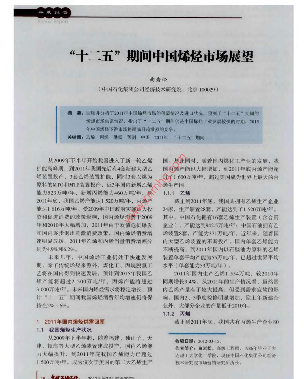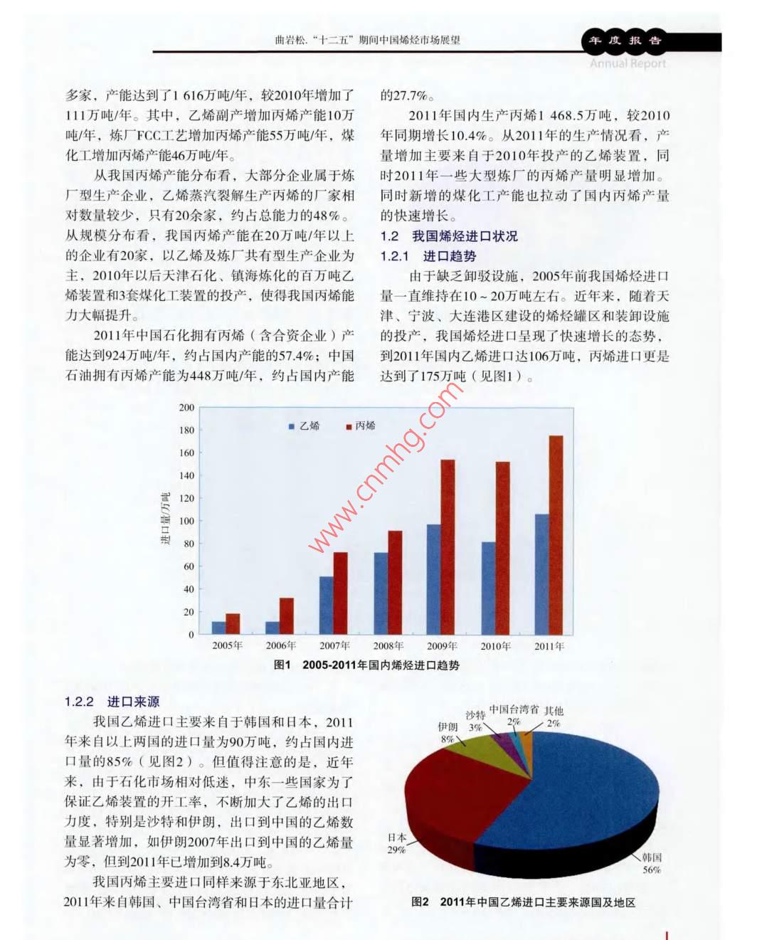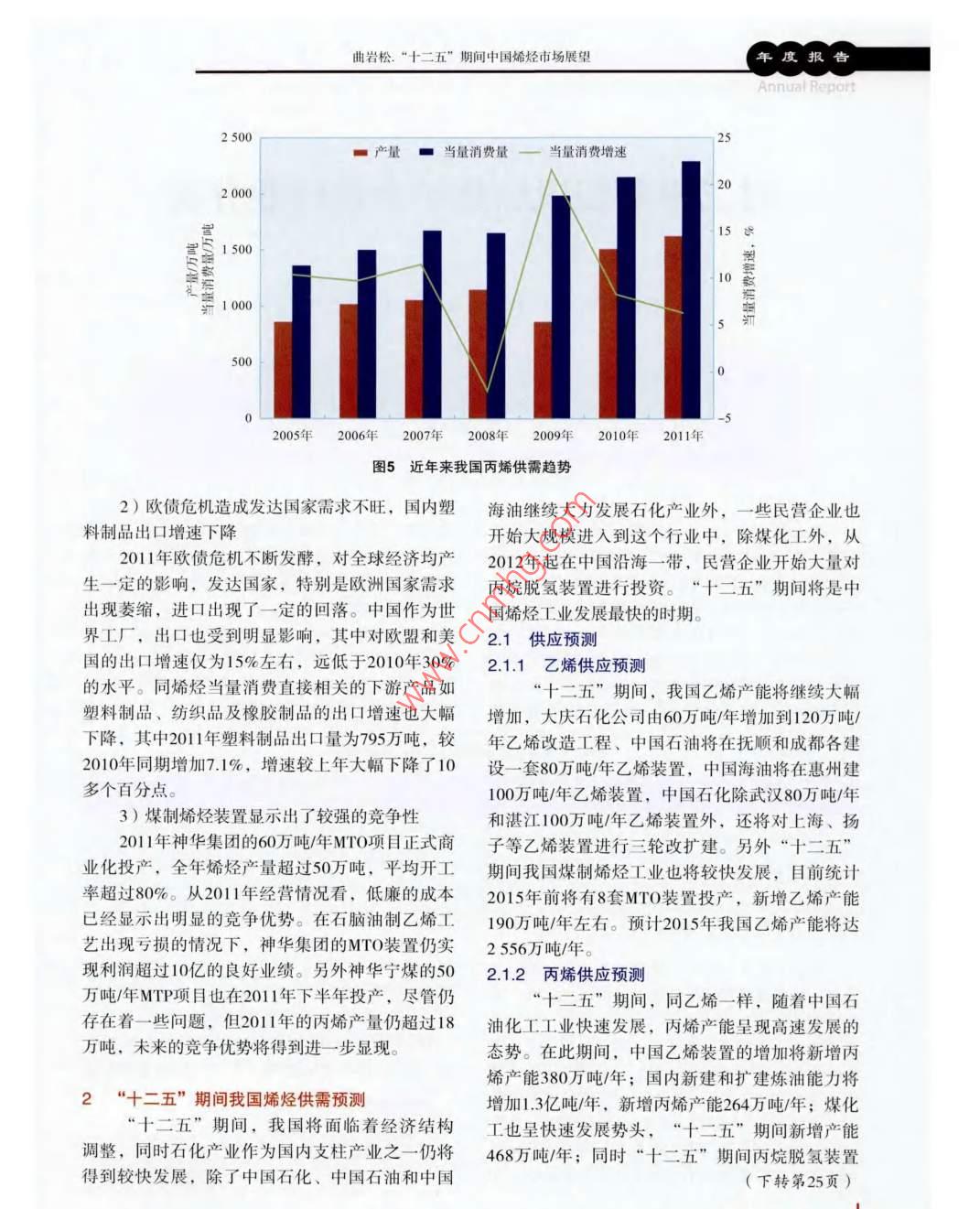 年度報告Annual Report“十二五”期間中國烯烴市場展望曲巖松(中國石化集團公司經(jīng)濟技術研究院,北京100029 )摘要: 回顧并分析了2011年中國烯烴市場的供需情況及進口狀況,預測了“十二五”期間的烯烴市場供需情況,指出了“十二五”期間仍是中國烯烴工業(yè)發(fā)展較快的時期,2015年中國烯烴下游市場將面臨日趨激烈的競爭。關鍵詞:乙烯丙烯供需預測中國2011年“十二五”期間從2009年下半年開始我國進入了新一- 輪乙烯國。與此同時,隨著國內(nèi)煤化工產(chǎn)業(yè)的發(fā)展,我擴能高峰期,到201 1年我國先后有4套新建大型乙國丙烯產(chǎn)能也大幅增加,到2011年底丙烯產(chǎn)能超烯裝置投產(chǎn),3套乙烯裝置擴能,同時3套以煤為過了1 600萬噸/年,超過美國成為世界上最大的丙原料的MTO和MTP裝置投產(chǎn),近3年國內(nèi)新增乙烯烯生產(chǎn)國。能力523萬噸/年,新增丙烯能力460萬噸/年,到1.1.1乙烯2011年底,我國乙烯產(chǎn)能達1 520萬噸/年,丙烯產(chǎn)截止到2011年底,我國共擁有乙烯生產(chǎn)企業(yè)能達1 616萬噸/年。受2009年中國政府實施加大投24家,生產(chǎn)裝置28套,產(chǎn)能達到了1 520萬噸/年。資和促進消費的政策影響,國內(nèi)烯烴消費于2009其中,中國石化擁有16套乙烯生產(chǎn)裝置(含合資年和2010年大幅增加,201 1年由于歐債危機爆發(fā)企業(yè)),產(chǎn)能達到942.5萬噸/年;中國石油擁有乙和國內(nèi)逐步退出刺激消費政策,國內(nèi)烯烴消費增烯裝置8套, 產(chǎn)能為371萬噸/年。近年來,隨著國速明顯放緩。2011年乙烯和丙烯當量消費增幅分內(nèi)大型乙烯裝置的不斷投產(chǎn),國內(nèi)單套乙烯能力別為4.9%和6.2%。不斷提高,到2011年國內(nèi)以石腦油為原料的乙烯未來幾年,中國烯烴工業(yè)仍處于快速發(fā)展裝置單套平均產(chǎn)能為55萬噸/年,已超過世界平均期,除了傳統(tǒng)烯烴來源外,煤化工、丙烷脫氫工水平(單套能力53萬噸/年)。藝將在國內(nèi)得到快速發(fā)展,預計到2015年我國乙2011年國內(nèi)生產(chǎn)乙烯1554萬噸,較2010年烯產(chǎn)能將超過2500萬噸/年,丙烯產(chǎn)能將超過同期增長9.4%。從201 1年的生產(chǎn)情況看,雖然國3 000萬噸/年。未來國內(nèi)烯烴需求將穩(wěn)定增長,預內(nèi)乙烯產(chǎn)量有了較大提高,但受到需求疲軟的影計“十二五”期間我國烯烴消費年均增速仍將保響,國內(nèi)2、3季度檢修明顯增加,除上年新建企持在5% ~ 6%。業(yè)外,大部分企業(yè)的產(chǎn)量低于2010年。1.1.2 丙烯1 2011年國內(nèi)烯烴供需回顧截止到2011年底,我國共有丙烯生產(chǎn)企業(yè)801.1 我國烯烴生產(chǎn)狀況從2009年下半年起,隨著福建、獨山子、天收稿日期: 2012-03-15。津、鎮(zhèn)海等大型乙烯裝置建成投產(chǎn),國內(nèi)乙烯能作者簡介:曲巖松,高級工程師,1986年畢業(yè)于大力大幅提升,到2011 年底我國乙烯能力已超過連理工大學化工學院,現(xiàn)任中國石化集團公司經(jīng)濟1 500萬噸/年,成為僅次于美國的第二大乙烯生產(chǎn)技術研究院市場營銷研究所所長。6當代石油石化2012年第3期 總第207期曲巖松.“十二五”期間中國烯烴市場展望年度報告Annual Report多家,產(chǎn)能達到了1 616萬噸/年,較2010年增加了的27.7%。111萬噸/年。其中,乙烯副產(chǎn)增加丙烯產(chǎn)能10萬2011年國內(nèi)生產(chǎn)丙烯1 468.5萬噸,較2010噸/年,煉廠FCC工藝增加丙烯產(chǎn)能55萬噸/年,煤年同期增長10.4%。從2011年的生產(chǎn)情況看,產(chǎn)化工增加丙烯產(chǎn)能46萬噸/年。量增加主要來自于2010年投產(chǎn)的乙烯裝置,同從我國丙烯產(chǎn)能分布看,大部分企業(yè)屬于煉時2011年--些大型煉廠的丙烯產(chǎn)量明顯增加。廠型生產(chǎn)企業(yè),乙烯蒸汽裂解生產(chǎn)丙烯的廠家相同時新增的煤化工產(chǎn)能也拉動了國內(nèi)丙烯產(chǎn)量對數(shù)量較少,只有20余家,約占總能力的48%。的快速增長。從規(guī)模分布看,我國丙烯產(chǎn)能在20萬噸/年以上1.2我國烯烴進 口狀況的企業(yè)有20家,以乙烯及煉廠共有型生產(chǎn)企業(yè)為1.2.1進口趨勢主,2010年以后天津石化、鎮(zhèn)海煉化的百萬噸乙由于缺乏卸駁設施,2005年 前我國烯烴進口烯裝置和3套煤化工裝置的投產(chǎn),使得我國丙烯能量一直維持在10~ 20萬噸左右。近年來,隨著天力大幅提升。津、寧波、大連港區(qū)建設的烯烴罐區(qū)和裝卸設施201 1年中國石化擁有丙烯(含合資企業(yè))產(chǎn)的投產(chǎn),我國烯烴進口呈現(xiàn)了快速增長的態(tài)勢,能達到924萬噸/年,約占國內(nèi)產(chǎn)能的57.4%;中國到201 1年國內(nèi)乙烯進口達106萬噸,丙烯進口更是石油擁有丙烯產(chǎn)能為448萬噸/年,約占國內(nèi)產(chǎn)能達到了175萬噸(見圖1)。200180■乙烯■丙烯1614120i 1086(4202005年2006年2007年2008年2009年2010年2011年圖1 2005-2011年國內(nèi)烯烴進口趨勢1.2.2進口來源沙特中國臺灣省其他我國乙烯進口主要來自于韓國和日本,2011伊朗3% 2902 2%年來自以上兩國的進口量為90萬噸,約占國內(nèi)進8%口量的85% (見圖2)。但值得注意的是,近年來,由于石化市場相對低迷,中東一些國家為了保證乙烯裝置的開工率,不斷加大了乙烯的出口力度,特別是沙特和伊朗,出口到中國的乙烯數(shù)量顯著增加,如伊朗2007年出口到中國的乙烯量日本29%韓國為零,但到201 1年已增加到8.4萬噸。5606我國丙烯主要進口同樣來