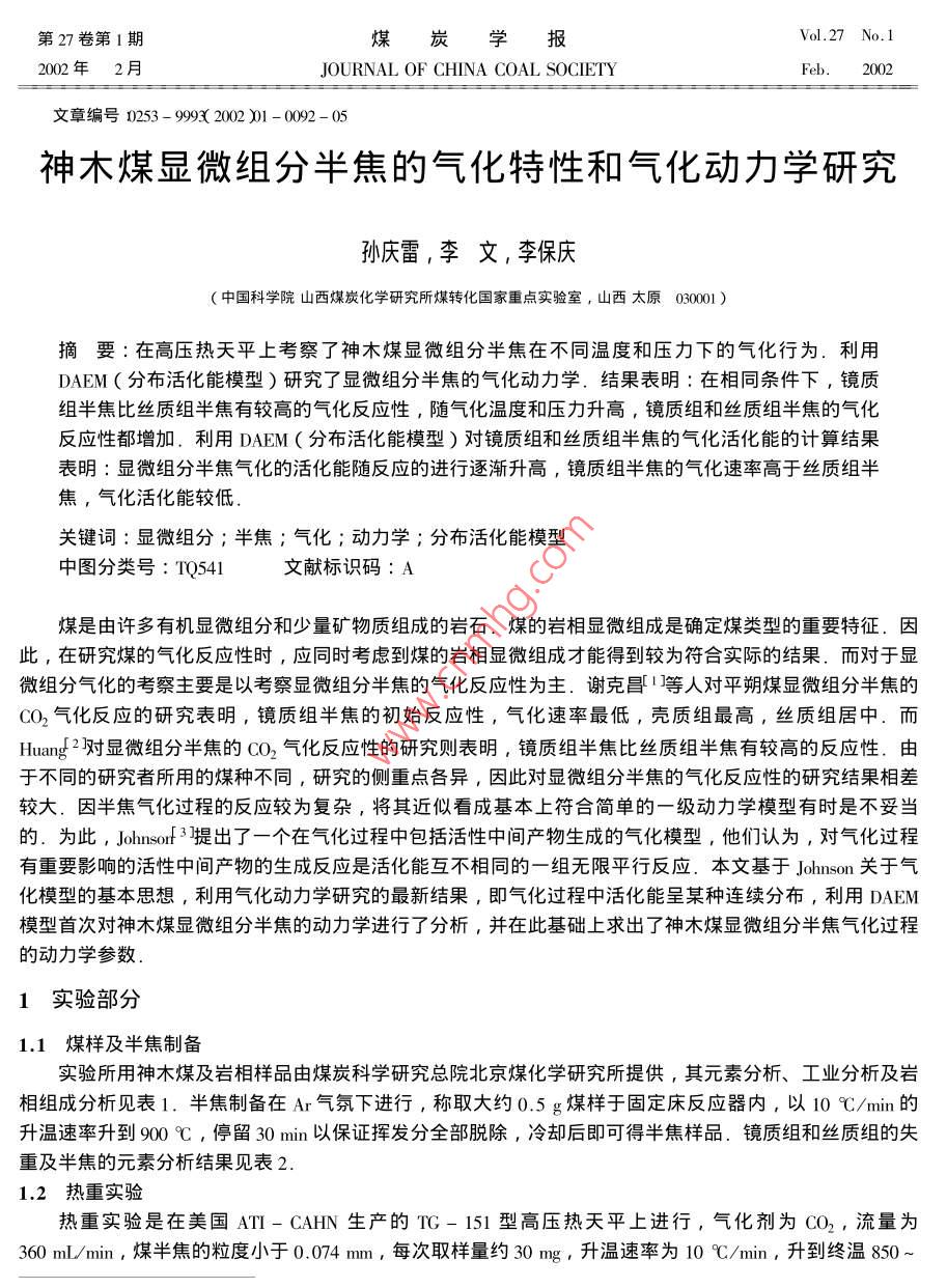第27卷第1期煤炭報Vol.27 No.12002年2月JOURNAL OF CHINA COAL SOCIETYFeb.2002文章編號0253- 9993( 2002 )01 - 0092 - 05神木煤顯微組分半焦的氣化特性和氣化動力學(xué)研究孫慶雷,李文,李保慶(中國科學(xué)院山西煤炭化學(xué)研究所煤轉(zhuǎn)化國家重點實驗室,山西太原030001 )摘要:在高壓熱天平上考察了神木煤顯微組分半焦在不同溫度和壓力下的氣化行為,利用DAEM (分布活化能模型)研究了顯微組分半焦的氣化動力學(xué).結(jié)果表明:在相同條件下,鏡質(zhì)組半焦比絲質(zhì)組半焦有較高的氣化反應(yīng)性,隨氣化溫度和壓力升高,鏡質(zhì)組和絲質(zhì)組半焦的氣化反應(yīng)性都增加,利用DAEM(分布活化能模型)對鏡質(zhì)組和絲質(zhì)組半焦的氣化活化能的計算結(jié)果表明:顯微組分半焦氣化的活化能隨反應(yīng)的進行逐漸升高,鏡質(zhì)組半焦的氣化速率高于絲質(zhì)組半焦,氣化活化能較低.關(guān)鍵詞:顯微組分;半焦;氣化;動力學(xué);分布活化能模型中圖分類號: TQ541文獻標(biāo)識碼: A煤是由許多有機顯微組分和少量礦物質(zhì)組成的巖石.煤的巖相顯微組成是確定煤類型的重要特征.因此,在研究煤的氣化反應(yīng)性時,應(yīng)同時考慮到煤的巖相顯微組成才能得到較為符合實際的結(jié)果.而對于顯微組分氣化的考察主要是以考察顯微組分半焦的氣化反應(yīng)性為主.謝克昌1]等人對平朔煤顯微組分半焦的CO2氣化反應(yīng)的研究表明,鏡質(zhì)組半焦的初始反應(yīng)性,氣化速率最低,殼質(zhì)組最高,絲質(zhì)組居中.而Huang2]對顯微組分半焦的CO2氣化反應(yīng)性的研究則表明,鏡質(zhì)組半焦比絲質(zhì)組半焦有較高的反應(yīng)性.由于不同的研究者所用的煤種不同,研究的側(cè)重點各異,因此對顯微組分半焦的氣化反應(yīng)性的研究結(jié)果相差較大.因半焦氣化過程的反應(yīng)較為復(fù)雜,將其近似看成基本上符合簡單的一級動力學(xué)模型有時是不妥當(dāng)?shù)?為此, Johnsof 3]提出了一個在氣化過程中包括活性中間產(chǎn)物生成的氣化模型,他們認為,對氣化過程有重要影響的活性中間產(chǎn)物的生成反應(yīng)是活化能互不相同的一組無限平行反應(yīng).本文基于Johnson關(guān)于氣化模型的基本思想,利用氣化動力學(xué)研究的最新結(jié)果,即氣化過程中活化能呈某種連續(xù)分布,利用DAEM模型首次對神木煤顯微組分半焦的動力學(xué)進行了分析,并在此基礎(chǔ)上求出了神木煤顯微組分半焦氣化過程的動力學(xué)參數(shù).1實驗部分1.1煤樣及半 焦制備實驗所用神木煤及巖相樣品由煤炭科學(xué)研究總院北京煤化學(xué)研究所提供,其元素分析、工業(yè)分析及巖相組成分析見表1.半焦制備在Ar氣氛下進行,稱取大約0.5 g煤樣于固定床反應(yīng)器內(nèi),以10 C/min的升溫速率升到900C,停留30min以保證揮發(fā)分全部脫除,冷卻后即可得半焦樣品、鏡質(zhì)組和絲質(zhì)組的失重及半焦的元素分析結(jié)果見表2.1.2 熱重實驗熱重實驗是在美國AT1- CAHN生產(chǎn)的TG- 151型高壓熱天平上進行,氣化劑為CO2,流量為360 mL/min,煤半焦的粒度小于0.074 mm ,每次取樣量約30 mg,升溫速率為10 C/min ,升到終溫850 ~第1期孫慶雷等:神木煤顯微組分半焦的氣化特性和氣化動力學(xué)研究9950C后,停留到不再產(chǎn)生明顯失重為止.表1煤及其顯微組分的工業(yè)分析、元素分析及巖相分析Table 1 The proximate , ultimate and petrographical analysis of coal sample and its macerals工業(yè)分析元素分析巖相分析試樣M.Asu( C)u(H)u(O)"u( N)u( s)鏡質(zhì)組絲質(zhì)組殼質(zhì)組礦物質(zhì)神木原煤7.43 4.43 36 4379.770.990.5463.59 34.99 0.36 1.07富鏡質(zhì)組6.40 2.37 39 .6077.83 .5.0315.611.010.5297.551.51 0.38 0.57富絲質(zhì)組6.88 3.54 25 .3082.633.7712.290.800.512.3796.90 0.36 0. 36*差減法所得.表2半焦制備 過程的失重率及元素分析Tacle 2 Weight loss in char preparation and elemental analysis of chars%半焦元素分析失重率u(C)u(0)*u(N)u(S)鏡質(zhì)組36.8693.283.831.290.54 .絲質(zhì)組24 .4395.532.45t差減法所得.2結(jié)果與討論2.1溫度對半焦氣化的影響神木煤鏡質(zhì)組和絲質(zhì)組半焦在CO2中,不同溫度下的恒溫氣化失重曲線如圖1所示.一絲質(zhì)組,850 它一-鍵質(zhì)組,850 C---被質(zhì)組,900...絲質(zhì)組,950 C“--質(zhì)組,950 C30 t-82000040000 60 00020000 40 000”60000時間1/s(b)(a)圖1神木煤鏡質(zhì)組和絲質(zhì)組半焦氣化的TG曲線Fig.1 The TG plots from gasification of vitrinite and fusinite chars under CO2(a)鏡質(zhì)組;(b)絲質(zhì)組由圖1可以看出,隨著氣化溫度升高,鏡質(zhì)組和絲質(zhì)組半焦的氣化反應(yīng)性均增加,在同一氣化溫度下,鏡質(zhì)組半焦的氣化反應(yīng)性高于絲質(zhì)組半焦.鏡質(zhì)組和絲質(zhì)組在3種不同溫度下的氣化速率見圖2.由圖2可以看出,在相同氣化溫度下, 鏡質(zhì)組半焦的氣化速率要高于絲質(zhì)組半焦,這也與鏡質(zhì)組半焦和絲質(zhì)組半焦的氣化失重曲線結(jié)果一致. 隨氣化溫度的升高,鏡質(zhì)組和絲質(zhì)組半焦的氣化速率都增大,同時還可以看出,在同-溫度下,鏡質(zhì)組半焦隨轉(zhuǎn)化率的增加氣化速率變化不大,基本上為一直線,因此鏡質(zhì)組半焦的氣化速率在整個氣化過程中可看成常數(shù),而絲質(zhì)組半焦的氣化速率隨轉(zhuǎn)化率的增加有逐漸下降的趨勢,并且隨氣化溫度的增加這種減少的趨勢在增大.