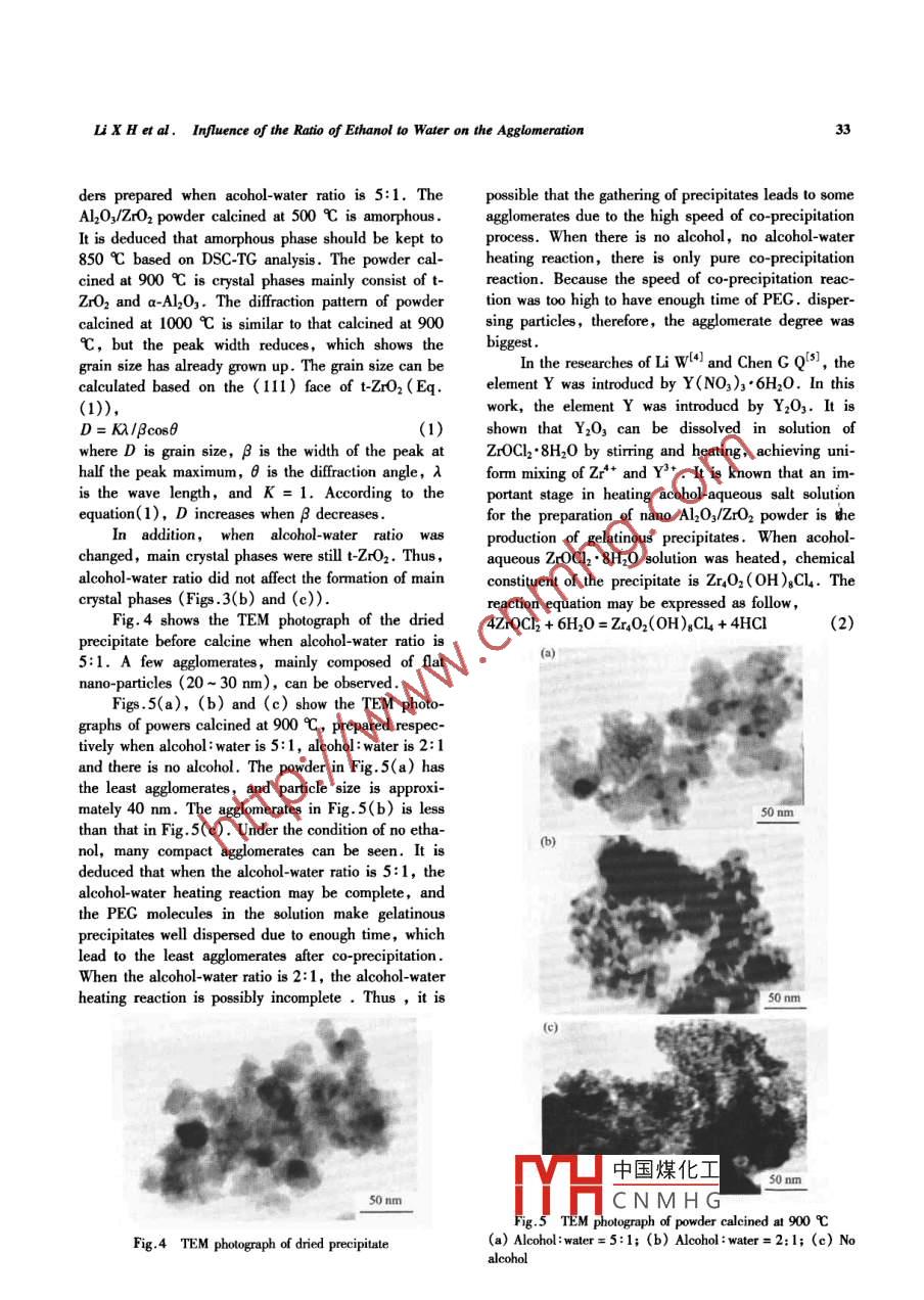 JOURNAL OF RARE EARTHSVol 25, Suppl., Dec. 2007, P 31Influence of the Ratio of Ethanol to Water on the agglomeration of Al2 O3/Y,03-ZrO, NanoparticlesLi Xiuhua(李秀華)2, Du Juanjuan(杜娟娟), Zhu Liying(朱麗穎)2, Cheng Huijie(成慧杰),Wang Lingwei(王靈偉)12(I. Key Laboratory of Advanced Ceramics and Machining Technology( Tianjin University ), Ministry of Education, Tian-jin 300072, China; 2. School of Materials Science and Engineering, Tianjin University, Tianyin 300072, China)Abstract: A method of heating ethanol-aqueous salt solution combined with co-precipitation was used to synthesize Al203/ZrO2 nanoparticles. The analysis of DSC and XRD revealed that the transformation temperature from amorphous to crystalphase was about 850 C. The grain size was increased with the raising of calcine temperature. The alcohol-water ratio didnot affect the formation of main crystal phases, but affected the agglomeration of nanoparticles based on the results ofTEM. When alcohol-water ratio was 5: 1, the dispersion of nanoparticles was good. When there was not alcohol, the dis-persion of nanoparticles was poor because there was only pure co-precipitation reaction and the speed of co-precipitationreaction was too high to have enough time of PEG. dispersing particleKey words: ZO2: Al2O3: Y2O3; nanoparticle; agglomerationCLC number: TF123 Document code: A Article ID: 1002-0721(2007)-0031-04A method of heating ethanol-aqueous salt solution preparation of 2Y-TZP nano-powder by the method ofhas been used toprepare nano-powder in receico-precipitationyears -3. An important process of the method is aIn this work, the method of heating of acoholheating process of ethanol-aqueous salt solution. Whensolution combinedthe alcohol-aqueous salt solution is heated, dielectric prepare AL20, /Z102(Z 02 matrix)nano-powder. For theconstant decreases significantly, which causes the re- decrease of agglomeration, NHHCO, was chosen as theduction of the solvation energy and the salt solubilityprecipitant. The influence of different ratio of ethanol toAs a result, the salt solution becomes supersaturated, water on agglomeration was investigatedthe gelatinous precipitation produces gradually. Theformation of the gel makes the ions, which have not1 Experimentalprecipitated, disperse uniformly in gelatinous precipFig 1 shows the flow chart of the experimenttation. Thus, it is advantageous to the uniform disper- The mixed aqueous solution of 0. 25 molL-I was pre-sion of each ingredient in precursors. In 1998, Liw4 prepared successfully ZHO2 (Y20, )nano-powderpared according to 20% Al203+80%(3%Y2O3-ZNO,). The solution was heated and stirred on a elec-by the method. In 2004, Chen G used the methodtromagnet mixer to make Y203 dissolve completelycombined co-precipitation process to prepare ZrO2/Then, the solution was divided into three equalAl2O, nano-powder(Al203 matrix), and studied the in-tion. Different volume of alcohol was separatelyfluluence of ammonia and NH, HCO, as precipitant on to the first one and the second one for the volume ratioagglomerate size. It was discovered that the two kinds of alcohol to water 5: 1 and 2: 1. The third one had onof precipitants were different. Because different pre- alcohol. PEG400 and PEG4000 as dispersant werecipitants have different anions, which leads to different added to each solution. Every solution was heated tonts in precursors. The result showed that 75 C for 6 h in the water-bath. The co-precipitationNHAHCO, as the precipitating agent was better than process was carried out on electromagnetic mixer atammonia. In 2003, Tang J N[6room temperature. The gel-like precipitate was addedNH,HCO, was one kind of good precipitant during the to lion1.8mol·L1中國煤化工Received date: 2006-12-09; revised date: 2007-04-18CNMHGFoundation item: The authors acknowledges the financial support of Tianjin University Youth Foundation and Tangshan Ceramics Limited CompanyBiography: Li Xiuhua (1964-)Female, Doctor, Vice-professor: Reasearch interest: material science*Correspondingauthor(e-mail:Ixh502@yahoo.comJOURNAL OF RARE EARTHS, Vol 25, Suppl., Dec. 2007ZrOCl, 8HOAl(NO) 9H,OHeated and stirredAdd alcohol and PEYaOdeionized waterHeatedAdded to NHHCO, and layedWashedFig 1 Flow chart of preparation of Al 20,/Zr02 powderwith pH 7-8 at about 3 ml.min. Three kinds oftsuspending liquids were layed for 12 h for complete reaction. The precipitate was washed repeatedly withAtdistilled water for removal of CI", dewatered by ethanol, dried at 100C and calcined at 500. 900, and1000C for 2 h. Wet precipitates dewatered after co-900ceprecipitation were analyzed by dSC and TG. The crys-talline phases of powders calcined at different temperatures were deduced by a RIGAKU D/Max 2500V/PCautomatic X-ray diffractometer. The microstructureand size of powders were observed by a Japan JEOL20(°)100CX-ll transmission electron microscope2 Results and discussionFig 2 shows the DSC-TG of wet gel obtainedwhen acohol-water ratio is 5:1. There is a obviousheat absorption peak at about 130 C, which may become from the evaporation of water, alcohol, and1000 degrees Catsupolymer. At about 350 C, there is an exothermicpeak that may be the result of carbonate decomposition. The exothermic peak at about 850C may bedue to the transformation from the amorphous to the01020304050crystal. The weight lost gradually decreases after va-2e/°)conization and all of weight lost is about 40%Fig 3(a) shows the XRD results of calcined pow-goodegrees Celsus500 degrees Celsus中國煤化工CNMHGm10℃alysis ot powders(a)Alcohol: water= 5: 1;(b)Alcohol: water =2: 1; (c)NoFig 2 TG-DSC analysis of wet gelalcoholLi X H ef al. Influence of the Ratio of Ethanol to Water on the agglomerationders prepared when acohol-water ratio is 5: 1. The possible that the gathering of precipitates leads to someAlO3/Zro2 powder calcined at 500 C is amorphousagglomerates due to the high speed of co-precipitationIt is deduced that amorphous phase should be kept t