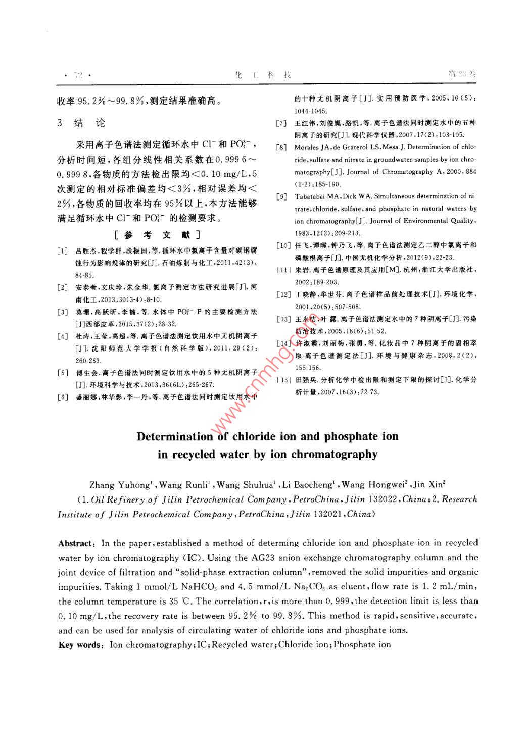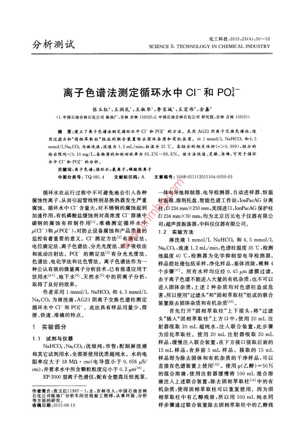 化工科技,2015,23(4):50~52分析測試science & TECHNOLOGY IN CHEMICAL INDUSTRY離子色譜法測定循環(huán)水中C|和PO8張玉紅1,王潤禮,王淑華,李寶城,王宏偉2,金鑫(1.中國石油吉林石化公司煉油廠,吉林吉林132022;2.中國石油吉林石化公司研究院,吉林吉林132021)摘要:建立了離子色譜法測定循環(huán)水中C和PO的方法。采用AG23陰離子交換色譜柱,使用過濾頭和“固相萃取柱”組成的聯(lián)合裝置除去國體雜質和有機雜質。以1mmol/ L NaHcO3和4,5mmol/LNa2CO3為淋洗液,流速為1.2mL/min,柱溫為35℃。各組分的相關性好(r>0.999),組分的檢出限均<0.10mg/L,各物質的加標回收率為95.2%~99.8%,該方法快速、靈敏、準確,可用于循環(huán)水中Cl和PO的分析。關鍵詞:離子色譜;循環(huán)永;氯離子;磷酸根離子中圖分類號:TQ085.4文獻標識碼:A文章編號:1008-0511(2015)040050-03循環(huán)水在運行過程中不可避免地會引入各種體電導池抑制器、電導檢測器、自動進樣器、恒溫腐蝕性離子,從而引起管線特別是換熱器發(fā)生嚴重柱溫箱溶劑托盤、智能色譜工作站, Ion PacAG分離腐蝕。循環(huán)水中C含量大,對不銹鋼的腐蝕起到柱:D234mm×250mm,美國進口, Ion PacAS保護柱加速作用有機磷酸鹽緩蝕劑對高濃度C溶液中D234mm×50mm,均為北京歷元電子儀器有限公碳鋼的腐蝕有抑制作用,準確測定循環(huán)水中司;超聲波振蕩器:中科儀儀器有限公司p(C)和p(PO),對防止設備腐蝕和產(chǎn)品質量的1.2實驗方法監(jiān)控有著重要的意義。Cl測定方法2有滴定法淋洗液1mmol/ L Nahco3和4.5mmol/L電位滴定法離子色譜法、分光光度法、原子吸收法N2CO3,流速1.2mL/mn,色譜柱溫度35℃,檢測和流動注射法。PO的測定法有分光光度法、池溫度40℃,檢測器為化學抑制型電導檢測器色譜法電化學法和比色管法。離子色譜法作為一樣品前處理包括采樣,凈化樣品,基體消除,稀釋4種公認有效的微量離子分析技術,已有報道應用于個步驟1。所有水樣均應經(jīng)0.45m濾膜過濾飲用水7、地下水、天然水中的陰離子分析取得了良好的效果由于離子色譜不能進入大量的有機雜質,也不可以進入固體雜質,上述2種雜質均對色譜柱造成危作者采用1mmol/ L NaHCO3和4.5mmol/L害,所以使用“過濾頭”和“固相萃取柱”組成的聯(lián)合Na2CO3為淋洗液,AG23陰離子交換色譜柱測定循環(huán)水中Cl和PO。此法具有樣品用量少、簡裝置除去固體雜質和有機雜質1。便、快速、準確的特點。首先打開“固相萃取柱”上下接頭,將“過濾頭”插入“固相萃取柱”上方口中,使用20mL注1實驗部分射器吸取20mL超純水,注入聯(lián)合裝置,此步驟為活化萃取柱。使用20mL注射器吸取20mL1.1試劑與儀器NahCO3、Na2CO3:優(yōu)級純,市售;配制淋洗液樣品,緩慢注入聯(lián)合裝置,在下方接口接取后面的15mL樣品,舍棄前5mL樣品。接取的15mL和其它試劑用水,全部要使用優(yōu)質超純水。水的電阻率應大于18Mn·cm(電導值小于0.056gS/樣品即為除去固體和有機雜質的干凈樣品,可以cm),并要求水中所含顆粒粒度應小于0.2pm10直接在色譜裝置上使用。使用g(乙醇)=50%EP2000型離子色譜儀:配有全塑高壓恒流泵的混合溶液,使用注射器緩慢將100mL混合溶液注入上述聯(lián)合裝置,除去固相萃取柱中的有作者簡介:張玉紅(1967-),女,吉林市人,中國石油吉林機雜質,使得固相萃取柱可以重復使用。因為固在化公司練迪廠分析車間任檢驗工程師,從事環(huán)保、分析相萃取柱中有乙醇殘留,所以用100m純水同收稿日期:2015-06-13樣步驟通過聯(lián)合裝置除去固相萃取柱中的乙醇殘第1期張卡紅,等,離子色譜法測定循環(huán)水中C1和PO留,至此固相萃取柱處理完畢,可以進樣?;€20.0mL,加超純水定容至1000mnL。制成20.0穩(wěn)定,進樣,進樣量10μL。由校準曲線查相應的mg/LPO標準溶液。再稀釋配成5種不同濃離子濃度,換算成mg/L。度的標準溶液,進行色譜分析,數(shù)據(jù)見表1。將各P=AX組分的峰面積和質量濃度進行線性擬合,各組分式中p為樣品中陰離子濃度,A為校準曲線上讀的線性相關性見表2。出的濃度數(shù)值,F為稀釋倍數(shù)。表1c-和PO標樣質量濃度和峰面積2結果與討論項目p/(mg·L“1)峰面積保留時間min2.1色譜條件的選擇0.50000367.80100000933.2287.123循環(huán)水樣品的測試選用EX2000系統(tǒng),用2.500002826.973Ion PacAS23分離柱,并且使用氫化學抑制器。5.6136.2607.132在色譜柱條件不變的情況下,影響色譜分離的主0.0000012272.527.132POt.00000255.7041.117要因素是淋洗液的種類、濃度、配比和流速,色譜14.475柱工作環(huán)境溫度,以及抑制器的性能。5,000001716.70214.48510.000003658.650對本檢測方法而言,淋洗液一般為CO和14.48420.000007317.30014.48HCO3的混合液,借電解產(chǎn)生的H即可有效的抑制淋出液的背景電導值,通過調(diào)節(jié)v(HOO):表2方法的線性范圍和線性相關性V(CO-)=1:4.5,可改變淋洗液的pH值和選擇項目線性范圍線性方程相關系數(shù)性,提高樣品的分離效率從而滿足色譜分離的10.5-10.0y=0.3173-0.003230.9967要求。PO)I1-20.0y=0.50501x-0.00255880.999882.2標樣配制及標準曲線的繪制首先取1000mg/LCl-儲備液溶液10.02.3方法的準確度和精密度mL,加超純水定容至1000mL,制成10.0mg/L配制5個質量濃度各為5mg/L的標樣,在Cl標準溶液。取1000mg/LPO-儲備液溶液給定的色譜條件下進行分析,定量結果見表3。表3方法的準確度與精密度項目P理論測定/(mg·L.-1)P定平均值相對標準相對誤差偏差/%4.95.995.014.944.965.004.981.954.984.