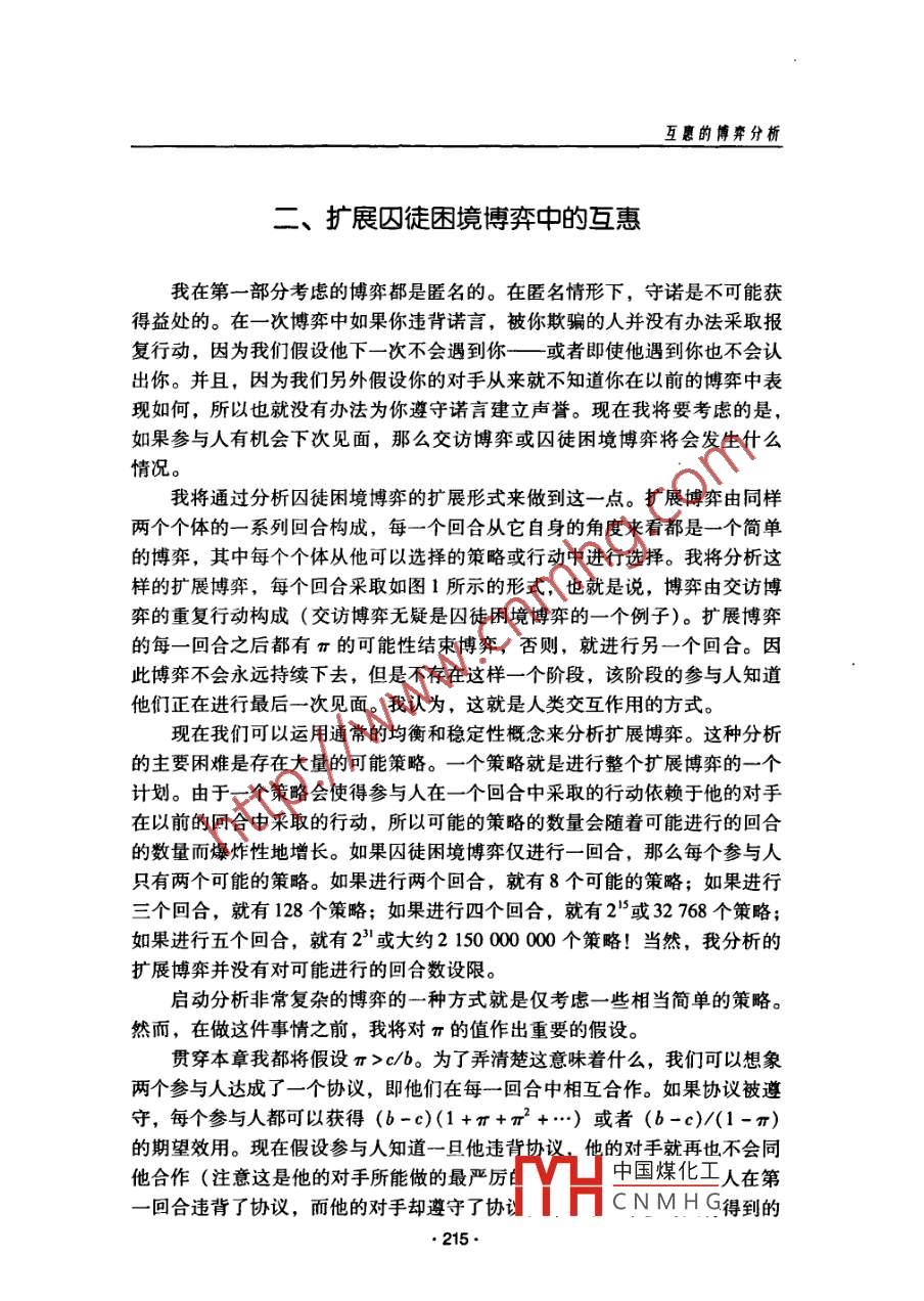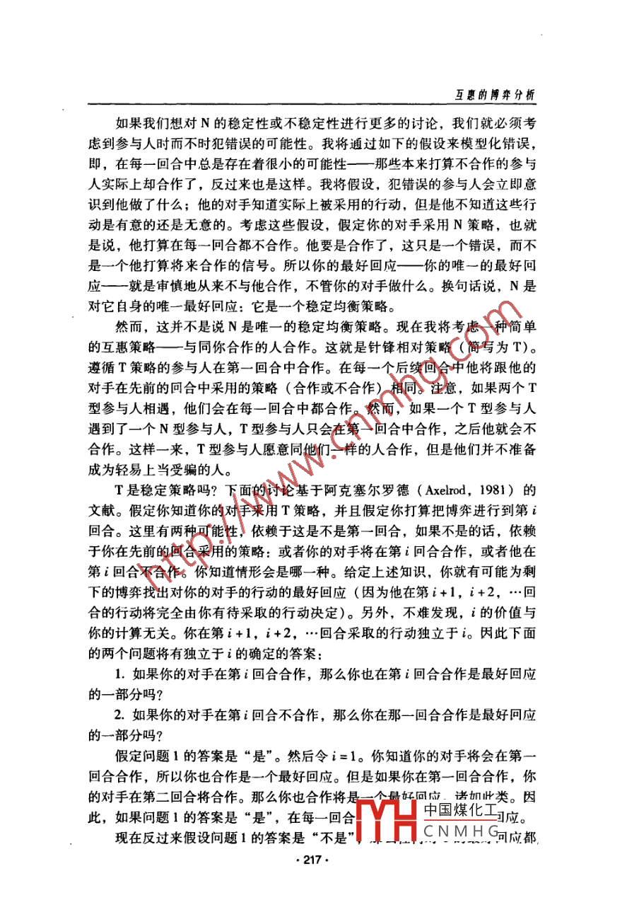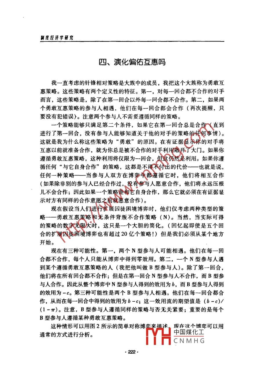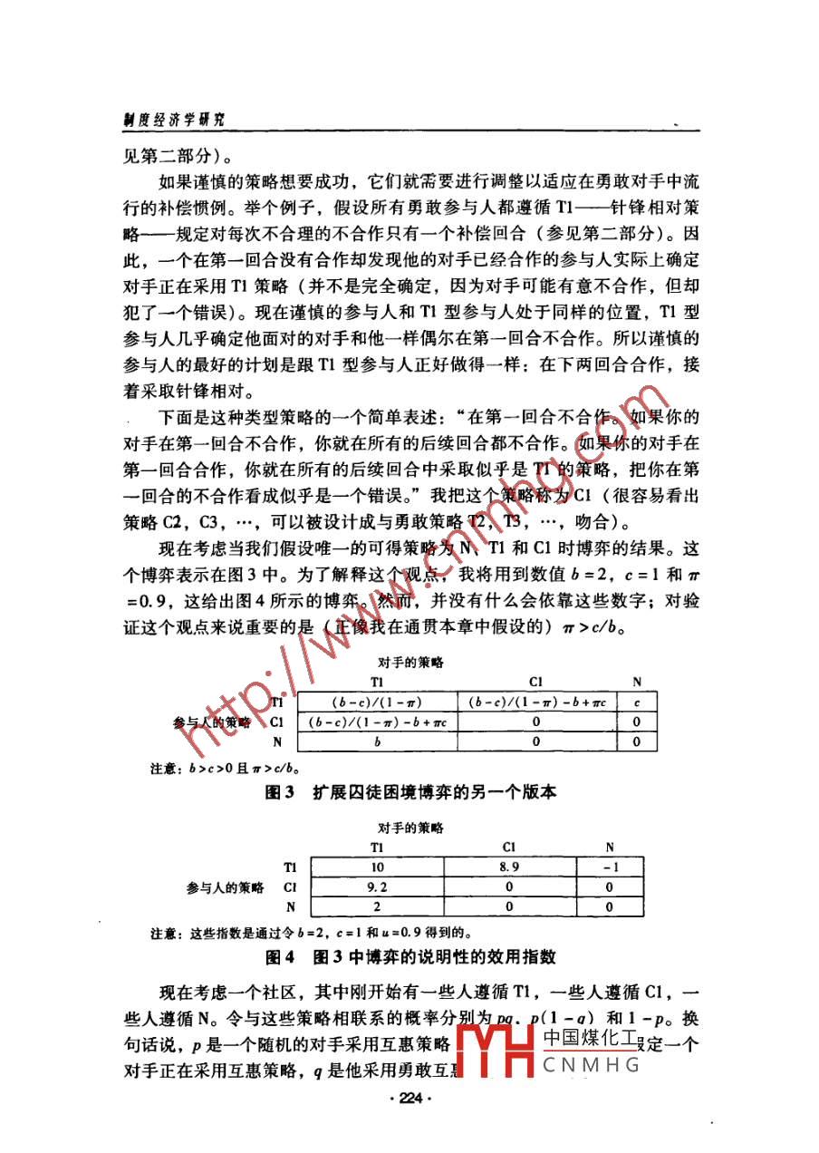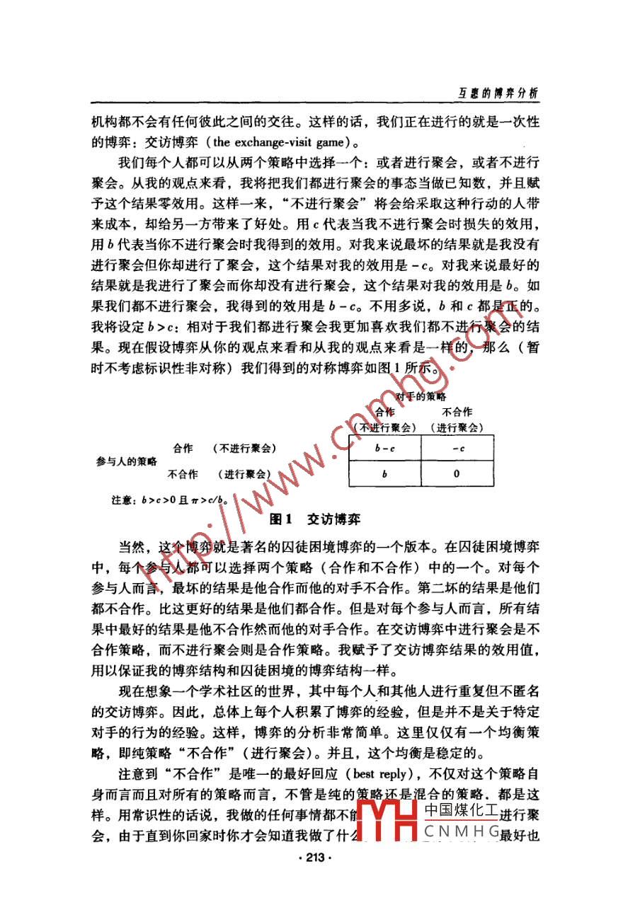 互惠的博弈分析'0羅伯特.薩金”皮建才律”.[摘要]本文從博弈論的角度分析了互惠的形成以及形成互惠的穩(wěn)定均衡策略。[關(guān)鍵詞]互惠囚徒困境擴(kuò)展博弈針?shù)h相對(duì)勇敢互惠謹(jǐn)慎互惠中圖分類號(hào): F063.1 文 獻(xiàn)標(biāo)識(shí)碼: A-、囚徒困境假設(shè)你是一個(gè)美國(guó)的學(xué)者,我是一個(gè)英國(guó)的學(xué)者。我們互訪彼此的大學(xué),并且我們互換住處。因?yàn)橛龅搅艘蝗汉軔?ài)熱鬧的美國(guó)人,所以我打算在我返回英國(guó)之前舉行-個(gè)晚會(huì)。我知道這將會(huì)把你的房子搞得亂七八糟一煙頭燒壞椅子,啤酒弄臟地毯,但是這在很大程度上與我無(wú)關(guān),因?yàn)槲乙院笤僖灿貌恢淌苓@些亂七八糟的東西。與此同時(shí),你遇到了-群不緊不忙的英國(guó)人,所以你也打算在離開(kāi)之前為他們舉行-一個(gè)晚會(huì).......假設(shè)不管每個(gè)聚會(huì)造成什么樣的破壞,求助法律都是不可能的。你不會(huì)因?yàn)闅牡靥憾灰?。假設(shè)- -旦我們的互訪結(jié)束,不管是我們還是我們的●本文譯自羅伯特.薩金( Robert Sugden) 的著作《權(quán)利、合作與福利的經(jīng)濟(jì)學(xué)》 (The Eco-nomics of Rights, Cooperation and Welfare) 第6章,翻譯時(shí)把標(biāo)題“互惠”改成了“互惠的博弈分析",摘要和關(guān)鍵詞為澤者所加。本文在翻譯時(shí)得到了韋森教授的指導(dǎo)。作者羅伯特.薩金( Robert Sugden),東英格蘭大學(xué)經(jīng)濟(jì)學(xué)教授( Profesor of Economics, Uni-versity of East Anglia)。中國(guó)煤化工...譯者:皮建才,博士后,南京大學(xué)經(jīng)濟(jì)學(xué)院教師;IYHCNMHG:學(xué)商學(xué)院安中大樓281信箱(210093); E-mail: jiancaipi@ hotnail om?!?12●互惠的博弈分析機(jī)構(gòu)都不會(huì)有任何彼此之間的交往。這樣的話,我們正在進(jìn)行的就是-一次性的博弈:交訪博弈( the exchange -visit game)。我們每個(gè)人都可以從兩個(gè)策略中選擇- -個(gè):或者進(jìn)行聚會(huì),或者不進(jìn)行聚會(huì)。從我的觀點(diǎn)來(lái)看,我將把我們都進(jìn)行聚會(huì)的事態(tài)當(dāng)做已知數(shù),并且賦予這個(gè)結(jié)果零效用。這樣- -來(lái),“不進(jìn)行聚會(huì)”將會(huì)給采取這種行動(dòng)的人帶來(lái)成本,卻給另-方帶來(lái)了好處。用c代表當(dāng)我不進(jìn)行聚會(huì)時(shí)損失的效用,用b代表當(dāng)你不進(jìn)行聚會(huì)時(shí)我得到的效用。對(duì)我來(lái)說(shuō)最壞的結(jié)果就是我沒(méi)有進(jìn)行聚會(huì)但你卻進(jìn)行了聚會(huì),這個(gè)結(jié)果對(duì)我的效用是-c。對(duì)我來(lái)說(shuō)最好的結(jié)果就是我進(jìn)行了聚會(huì)而你卻沒(méi)有進(jìn)行聚會(huì),這個(gè)結(jié)果對(duì)我的效用是b。如果我們都不進(jìn)行聚會(huì),我得到的效用是b-c。不用多說(shuō),b和c都是正的。我將設(shè)定b>c:相對(duì)于我們都進(jìn)行聚會(huì)我更加喜歡我們都不進(jìn)行聚會(huì)的結(jié)果。現(xiàn)在假設(shè)博弈從你的觀點(diǎn)來(lái)看和從我的觀點(diǎn)來(lái)看是一樣的,那么(暫時(shí)不考慮標(biāo)識(shí)性非對(duì)稱)我們得到的對(duì)稱博弈如圖1所示。對(duì)手的策略合作不合作(不進(jìn)行聚會(huì)) (進(jìn)行聚會(huì))(不進(jìn)行聚會(huì))b-e參與人的策略(進(jìn)行聚會(huì))b0注意: b>c>0且π>c/b。圖1交訪博弈 .當(dāng)然,這個(gè)博弈就是著名的囚徒困境博弈的一個(gè)版本。在囚徒困境博弈中,每個(gè)參與人都可以選擇兩個(gè)策略(合作和不合作)中的一個(gè)。對(duì)每個(gè)參與人而言,最壞的結(jié)果是他合作而他的對(duì)手不合作。第二壞的結(jié)果是他們都不合作。比這更好的結(jié)果是他們都合作。但是對(duì)每個(gè)參與人而言,所有結(jié)果中最好的結(jié)果是他不合作然而他的對(duì)手合作。在交訪博弈中進(jìn)行聚會(huì)是不合作策略,而不進(jìn)行聚會(huì)則是合作策略。我賦予了交訪博弈結(jié)果的效用值,用以保證我的博弈結(jié)構(gòu)和囚徒困境的博弈結(jié)構(gòu)一樣。現(xiàn)在想象- -一個(gè)學(xué)術(shù)社區(qū)的世界,其中每個(gè)人和其他人進(jìn)行重復(fù)但不匿名的交訪博弈。因此,總體上每個(gè)人積累了博弈的經(jīng)驗(yàn),但是并不是關(guān)于特定對(duì)手的行為的經(jīng)驗(yàn)。這樣,博弈的分析非常簡(jiǎn)單。這里僅僅有一個(gè)均衡策略,即純策略“不合作”(進(jìn)行聚會(huì))。并且,這個(gè)均衡是穩(wěn)定的。注意到“不合作”是唯-一的最好回應(yīng)( best reply), 不僅對(duì)這個(gè)策略自身而言而且對(duì)所有的策略而言,不管是純的策略還是混合的策略.都是這樣。用常識(shí)性的話說(shuō),我做的任何事情都不能中國(guó)煤化工進(jìn)行聚會(huì),由于直到你回家時(shí)你才會(huì)知道我做了什么MHCNMHG最好也。 213.制度經(jīng)濟(jì)學(xué)研究進(jìn)行聚會(huì)。而且,如果你不進(jìn)行聚會(huì),那么無(wú)論如何我仍然最好利用你的好品性進(jìn)行聚會(huì)。因?yàn)椤安缓献鳌笔且粋€(gè)占優(yōu)策略,所以不管參與人認(rèn)識(shí)到博弈是對(duì)稱的還是非對(duì)稱的都無(wú)關(guān)緊要。不管我的角色是什么也不管我期望你做什么,對(duì)我來(lái)說(shuō)不合