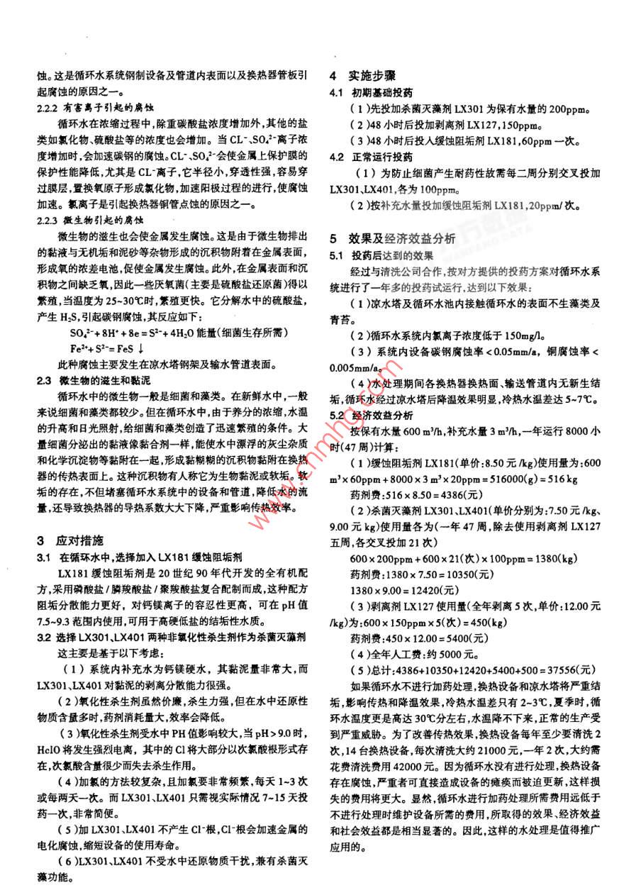 2008年9月廣西輕工業(yè)第9期(總第118期GUANGXI JOURNAL OF LIGHT INDUSTRY資源與環(huán)境循環(huán)水的加藥處理羅勝(南寧化工股份有限公司,廣西南寧53031)摘要】冷凍崗位循環(huán)水系統(tǒng)由于使用河水未進行處理致使系統(tǒng)內(nèi)大部分設(shè)備、管道積垢嚴(yán)重,嚴(yán)重彩響循環(huán)水系統(tǒng)的正常運行,無法達(dá)到預(yù)期的降溫效果,也彩響了工廠的正常生產(chǎn)。通過與清洗公司合作,加入一些緩蝕阻垢劑、殺菌滅藻劑等加藥處理,達(dá)到除垢抗腐蝕效果,取得明顯成效?!娟P(guān)鍵詞】獷環(huán)水;結(jié)垢;加藥;除垢;抗腐蝕【中圖分類號】TQ085【文獻標(biāo)識碼】A【文章編號】100-2673(200809-115-02南寧化工股份有限公司精細(xì)廠冷凍崗位循環(huán)水系統(tǒng)由于使220kw氟里昂制冷機組(其中包括6臺55m2的氟里昂冷凝器用河水未進行處理致使系統(tǒng)內(nèi)大部分設(shè)備、管道積垢嚴(yán)重存和6臺22m2的油冷凝器);(5)2臺30m2的板式換熱器。在以下問題:(1)系統(tǒng)中換熱器的傳熱表面嚴(yán)重結(jié)垢降低傳熱效果;(2)微生物在循環(huán)水系統(tǒng)中大量繁殖形成大量黏泥使涼2循環(huán)水系統(tǒng)存在的問題水塔降溫效率降低;(3)換熱器換熱面結(jié)垢引起垢下腐蝕,大大21水垢縮短設(shè)備壽命。這些問題嚴(yán)重影響循環(huán)水系統(tǒng)的正常運行,無法該循環(huán)水系統(tǒng)中,補充水的水樣經(jīng)化驗結(jié)果如下:達(dá)到預(yù)期的降溫效果,也嚴(yán)重影響整個廠的正常生產(chǎn)。電導(dǎo)率PH值總硬度鈣硬度為此我們與清洗公司合作,通過加藥(加入一些緩蝕阻垢劑、殺菌滅藻劑等)處理,達(dá)到除垢抗腐蝕效果,取得明顯成效。mg/L mouL mg/L027×103|76160i60.122.31041循環(huán)水系統(tǒng)概況11系統(tǒng)工藝簡圖循環(huán)水中的重碳酸鹽濃度隨著水分的蒸發(fā)而濃縮,當(dāng)其濃度達(dá)到過飽和狀態(tài)時,或者在經(jīng)過換熱器表面使水溫升高時,會發(fā)生下列反應(yīng):Ca(HCO3)2=CaCO3↓+CO2↑+H2O因循環(huán)水經(jīng)過涼水塔向下噴淋時溶解在水中的游離CO2要逸出,這就促使上述反應(yīng)向右方進行。CaCO3沉積在換熱器傳熱表面,形成致密的碳酸鈣水垢,它的導(dǎo)熱性能很差。不同的水垢其導(dǎo)熱系數(shù)不同但一般不超過116W/(mK),而鋼材的導(dǎo)熱系數(shù)為45W(mK),比水垢的導(dǎo)熱系數(shù)高40倍之多。可見,水垢形成必然會影響換熱器的傳熱效率。帶林池2游塔3換特4帶秋5吸罐22設(shè)備腐蝕循環(huán)水系統(tǒng)中大量的設(shè)備是多種金屬制造的換熱器。對如圖所示,此系統(tǒng)屬典型的敞開式循環(huán)冷卻水系統(tǒng),于碳鋼和銅管制成的氟里昂冷凝器,長期使用循環(huán)冷卻水會20-30℃冷卻水由冷水泵送往氟利昂制冷機組等換熱設(shè)備作發(fā)生腐蝕穿孔其腐蝕的原因主要由以下因素造成為冷載體,吸收熱量后溫度升高,變成30-40℃的熱水后送到221環(huán)水中落解氧引起的電化學(xué)腐涼水塔頂部,經(jīng)噴霧系統(tǒng)霧化冷卻,空氣則由塔底百葉窗空隙敞開式循環(huán)水系統(tǒng)中,水與空氣能充分接觸,因此水中溶進入塔內(nèi)并被塔頂風(fēng)扇抽吸上升,與落下的水滴和霧化的水解的02可達(dá)飽和狀態(tài)。當(dāng)碳鋼與溶有02的循環(huán)水接觸時,由霧相遇進行熱交換,水滴和水霧則在下降過程中逐漸變冷,當(dāng)于不同金屬表面的不均一性和循環(huán)水的導(dǎo)電性,在碳鋼及銅管到達(dá)涼水塔下部集水池時,水溫下降到2030℃,符合生產(chǎn)工表面會形成許多腐蝕微電池微電池的陽極區(qū)和陰極區(qū)分別發(fā)藝的要求又重新送入系統(tǒng)反復(fù)循環(huán)使用。正常情況下冷卻水生下列的氧化反應(yīng)和還原反應(yīng)與熱水有5-7℃左右的溫差,系統(tǒng)結(jié)垢換熱效率下降后,大約在陽極區(qū)Fe=Fe2+2只有2-3℃的溫差。在陰極區(qū)1/202+H2O+2e=20H12系統(tǒng)包含設(shè)備在水中Fe2+20H=Fe(OH2↓1)3臺無填料玻璃鋼涼水塔(500mh);(2)2臺循環(huán)水4Fe(OH+0,+2H, 0=4 FeOH,!泵(400m3h);(3)循環(huán)水池(總?cè)莘e600m3);(4)6臺這些反應(yīng),促使微電池中的陽極區(qū)金屬不斷溶解而被腐【作者簡介】羅勝(1966-),男,南寧化工股份有限公司工程師。蝕。這是循環(huán)水系統(tǒng)鋼制設(shè)備及管道內(nèi)表面以及換熱器管板引4實施步驟起腐蝕的原因之一。4.1初期基礎(chǔ)投藥222有害離子引起的腐蝕(1)先投加殺菌滅藻劑LX301為保有水量的200ppm循環(huán)水在濃縮過程中除重碳酸鹽濃度增加外,其他的鹽(2)48小時后投加剝離劑LX127,150pm類如氯化物、硫酸鹽等的濃度也會增加。當(dāng)CL、SO2離子(3)48小時后投入緩蝕阻垢劑LX181,60pm一次度增加時,會加速碳鋼的腐蝕。CL、SO42會使金屬上保護膜的42正常運行投藥保護性能降低,尤其是CL離子它半徑小穿透性強容易穿1)為防止細(xì)菌產(chǎn)生耐藥性故需每二周分別交叉投加過膜層置換氧原子形成氯化物加速陽極過程的進行,使腐蝕LxX301、LX401,各為100ppm加速。氯離子是引起換熱器銅管點蝕的原因之一。(2)按補充水量投加緩蝕阻垢劑LX181,20ppm/次。223微生物引起的腐蝕微生物的滋生也會使金屬發(fā)生腐蝕。這是由于微生物排出5效果及經(jīng)濟效益分析的黏液與無機垢和泥砂等雜物形成的沉積物附著在金屬表51投藥后達(dá)到的效果成