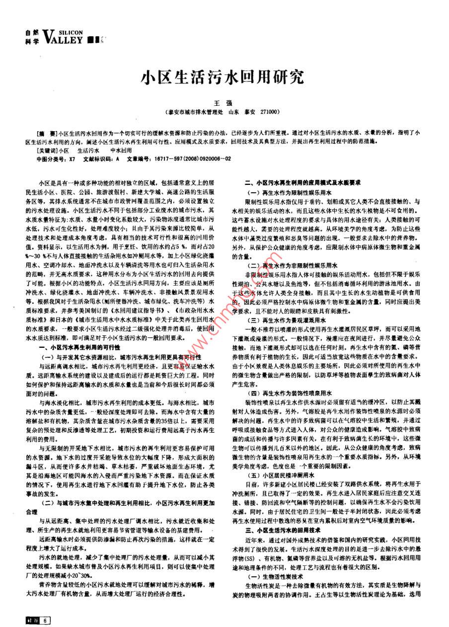 VA亞E■小區(qū)生活污水回用研究王強(qiáng)(豪安市城市排水管理處山東泰安271000賽]小區(qū)生活污水回用作為一個(gè)切實(shí)可行的緩解水資源和防止污染的辦法,已經(jīng)逐步為人們所重視,通過對(duì)小區(qū)生活污水的水質(zhì)、水歌的分析,指明了小區(qū)生活污水利用的方向,闡述小區(qū)生活污水再生利用可打性,應(yīng)用模式及水質(zhì)要求,回用技術(shù)及其典型方法,并提出再生利用過程中的防范措施.[關(guān)鍵詞]小區(qū)生活污水中水回用中圖分類號(hào):X7文獻(xiàn)標(biāo)識(shí)碼:A文章編號(hào):16717-597(2008)0920006-02小區(qū)是具有一種或多種功能的相對(duì)獨(dú)立的區(qū)域,包括通常意義上的居二、小區(qū)污水再生利用的應(yīng)用式及水質(zhì)要求民生活小區(qū)、醫(yī)院、公園、旅游渡假村、新建大學(xué)城、高速公路的生活服(一)再生水作為限制性?shī)蕵酚盟畡?wù)區(qū)等,其排水系統(tǒng)通常不在城市市政管網(wǎng)覆蓋范圍之內(nèi),必須設(shè)置獨(dú)立限制性?shī)蕵酚盟竷H用于垂釣、劃船或其它人類不會(huì)直接接觸的、與的污水處理設(shè)施。小區(qū)生活污水不同于包括部分工業(yè)廢水的城巾污水,其水相關(guān)的娛樂活動(dòng)的水,而且這些水體中生長(zhǎng)的水生物是不可食用的水質(zhì)水量特征為:水質(zhì)、水量小時(shí)變化系數(shù)較大,污染物濃度通常比城市污這些蓄水設(shè)施對(duì)水處理程度的要求與具體的用水途徑有關(guān):人類接觸的可水低,污水可生化性好,處理難度較小;且由于其污染來源比較簡(jiǎn)單,從能性越大,需要的處理程度就越高。從環(huán)境美學(xué)的角度考慮,為防止這些處理技術(shù)和處理成本角度考慮,具有相當(dāng)?shù)募夹g(shù)可行性和很高的回用價(jià)水體中藻類過度繁殖和臭等問題的出現(xiàn),一般要求去除水中的背養(yǎng)物值.資料顯示,以生活用水為例,用于烹飪、飲用的水約占5%,而對(duì)占20另外,從保護(hù)公眾健康的角度考慮,應(yīng)限制水體中病原體微生物和重金屬~30%不與人體直接接觸的生活雜用水如沖廁用水等,加上小區(qū)綠化澆灌的含量用水、空調(diào)冷卻水、地面沖洗水以及4輛清洗等用水也可歸入生活雜用水二)再生水作為非限制性?shī)蕵酚盟姆懂?并無高水質(zhì)要求,這種用水分布為小區(qū)生活污水的回用去向提供非限制性?shī)蕵酚盟溉梭w可接觸的娛樂活動(dòng)用水,包括但不限于娛樂了可能,根據(jù)小區(qū)的功能特點(diǎn),小區(qū)生活污水問用方向,主要應(yīng)該是廁所性湖泊、公共水塘以及魚池等,但不包括消毒循環(huán)利用的游泳池用水。由沖洗水、綠化澆灌水、地面沖洗水、車輛沖洗水、非接觸風(fēng)景景觀用水于這些水體允許人類全身接觸,而且其中生長(zhǎng)的水生動(dòng)植物是可供食用等.根據(jù)我國(guó)對(duì)于生活雜用水(則所便器沖洗、城市綠化,洗車沖洗等)水的,因此必須嚴(yán)格控制水中病原體微物和重金屬的含量,同時(shí)應(yīng)提出美質(zhì)標(biāo)準(zhǔn)要求,并參考美國(guó)制訂的《水問用建議指導(dǎo)書》、《市政雜用水水學(xué)要求,且不能對(duì)人的眼睛和皮膚具有刺激性質(zhì)標(biāo)準(zhǔn)》和日本的《城市生活用水中水水質(zhì)標(biāo)準(zhǔn)》中關(guān)于此類冉生回用水(三)再生水作為景觀灌溉用水的水質(zhì)要求,一般要求小區(qū)生活污水經(jīng)過二級(jí)強(qiáng)化處理并消毒后,使回用一般不推薦以噴灌的形式使用再生水灌溉居民區(qū)草坪,而可以采用地水水質(zhì)達(dá)到標(biāo)準(zhǔn),即可滿足對(duì)于小區(qū)生活污水的一般回用要求下灌溉或漫的形式。一般情況下,漫灌應(yīng)在夜間進(jìn)行,并盡量避免公眾小區(qū)污水再生利用的可行性接觸,而地下灌溉形式卻可以選在任何時(shí)刻。冉生水中含有的氮、磷等營(yíng)(一)與開發(fā)其它水資源相比,城市污水再生利用更具有可行性養(yǎng)物質(zhì)有利于植物的生長(zhǎng),因此可適當(dāng)放寬這些物質(zhì)在水中的含量要求與遠(yuǎn)距離調(diào)水相比,城市污水再生利用更經(jīng)濟(jì),且更容易保證輸水水由于小區(qū)景觀是人類休息娛樂的主要場(chǎng)所,因此必須對(duì)所使用的再生水中質(zhì)。遠(yuǎn)距離輸水系統(tǒng)的建設(shè)以及建成后的運(yùn)行都是耗資巨大的工程。同時(shí)的微生物含量做出嚴(yán)格的限制,以防草坪等植物表面孽生的致病菌對(duì)人體如何保護(hù)和保持遠(yuǎn)距離輸水的水質(zhì)和水量也是當(dāng)前和今后很長(zhǎng)時(shí)間都必須產(chǎn)生危害面對(duì)的問題。(四)再生水作為裝飾性噴泉用水與海水液化相比,城市污水再生利用的成本更低,與海水相比,城市裝飾性噴泉以再生水作供水源時(shí)必須留有適當(dāng)?shù)木彌_區(qū),以防止其派污水中的雜質(zhì)含量更低,一般經(jīng)深度處理即可去除。而海水中含有大量的射對(duì)人體造成傷害。另外,氣溶膠是冉生水用作裝飾性噴泉的水源時(shí)必須溶解鹽和有機(jī)物,其雜質(zhì)含量在城市污水雜質(zhì)含的35倍以上,需要采用解決的向題。再生水中的許多致病菌可以在氣溶膠中生活和繁蘋,并通過復(fù)雜的預(yù)處理和反滲透等處理工藝,初期投資和運(yùn)行費(fèi)用遠(yuǎn)