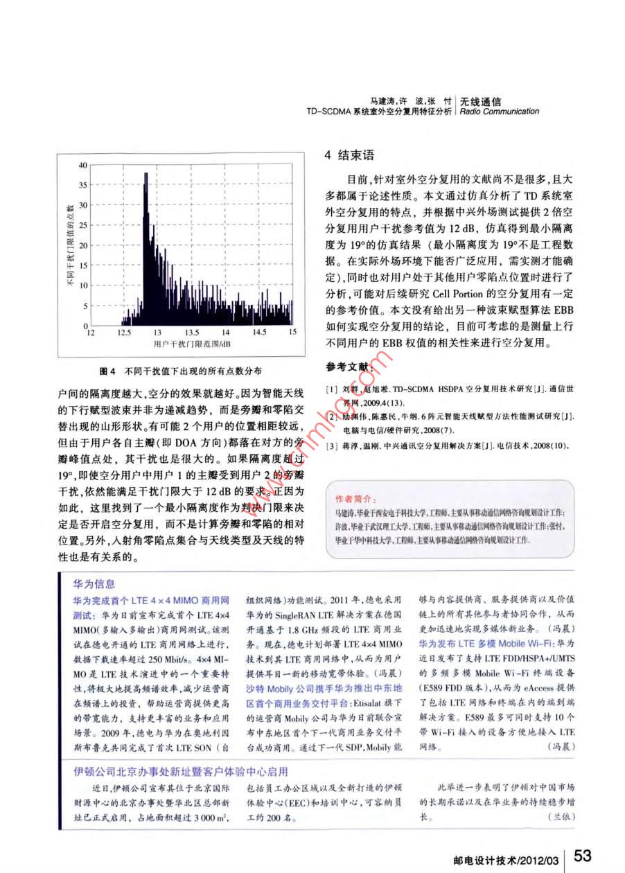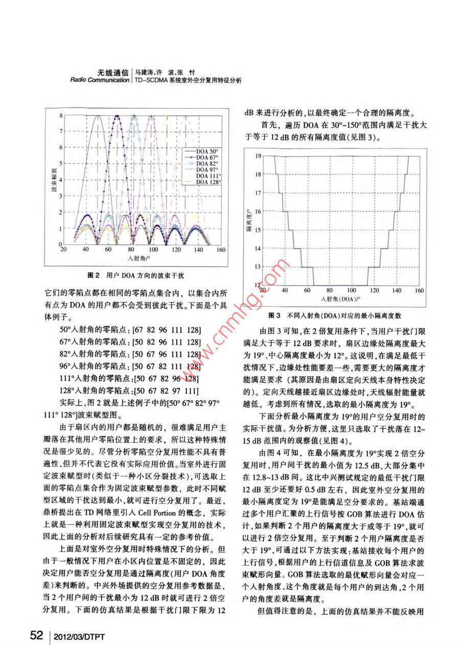 無線通信馬建濤許波張忖RadNoaon;TD- SCDMA系統(tǒng)室外空分復用特征分析TD- SCDMA系統(tǒng)室外aracteristIc AnalysIs o空分復用特征分析馬建濤,許波,張忖(中訊郵電咨詢設計院有限公司,河南鄭州450007Ma Jiantao, Xu Bo, Zhang Cun( china Information Technology Designing&Consulting Institute Co. Ltd, Zhengzhou 450007, China關鍵詞:闡述了TD- SCDMA系統(tǒng)扇區(qū)定向天線室外空分復用的原理及特點,給空分復用時分同步碼分多址隔離;固定波束掃面出了GB算法下判斷是否開啟空外空分復用的最小隔離度并分析了特中圈分類號:TN9295殊情況下的波束賦型瓣零陷點性能碼:A文章編號:1007-3043(2011)03-0050-04AbstractIt analyzes the principle of outdoor SDM in TD-SCDMA system, and provides the least isolation degree by GOB, which can determine whether the system opens SDM function. At the same time, it analyzes the performance of side-lobe beam forming andKeywordsSDM: TD-SCDMA; Isolation degree; GOB方向上形成不同的定向波束,即使用戶占用相同的頻1概述域、時域及碼道資源也不會發(fā)生相互干擾或干擾很小。隨著數(shù)據(jù)用戶規(guī)模的不斷擴大和通信業(yè)務的不在無需增加載頻資源、修改用戶終端、調(diào)整網(wǎng)絡規(guī)劃及斷增長,現(xiàn)有的通信資源(如FDMA、CDMA、TDMA)的改變空口技術的情況下,利用智能天線的室外隔離度容量已接近飽和。時分同步碼分多址( TD-SCDMA,簡(即用戶人射角度差)或室內(nèi)多通道隔離度來實現(xiàn)碼道稱TD)屬碼道資源受限系統(tǒng),提高碼道利用率是提升的重復利用,從而達到了提高小區(qū)吞吐量的效果。其吞吐量和頻率利用率的關鍵。目前TD系統(tǒng)使用的目前,室內(nèi)空分復用業(yè)已實現(xiàn)它主要是利用室內(nèi)是B頻段,室/內(nèi)外各有6個頻點,由其載頻資源少、碼樓板及墻體構(gòu)成的用戶天然隔離、使用空分復用和室道數(shù)量有限而導致的容量受限尤為突出。內(nèi)覆蓋技術,根據(jù)用戶在不同通道上的功率值計算用鑒于空分多址(SDMA)技術通過陣列天線提供的戶的隔離度,并選取隔離度大的用戶進行時隙及碼資空間動態(tài)控制增加了1個維度,故而能解決上述難源的重復利用來有效地提高室內(nèi)吞吐量的。中興通題。通常移動用戶位于小區(qū)的不同位置,因此在基站訊 HSDPA Mx(倍速)的室內(nèi)測試結(jié)果表明,其吞吐量側(cè)接收到的不同用戶的空間特征也是不一樣的。SD-能增加2倍。MA就是利用這種差異性,通過陣列天線技術在用戶由于室外空分復用實際無線環(huán)境的復雜性(如波瓣和旁瓣干擾比、來波方向(DOA)估計精度和信道快收稿日期:201201-19速變化)很容易導致錯誤的觸發(fā)空分,其效果并不理50|201203DTPT馬建濤許波張忖無線通信cDMA系統(tǒng)室外空分復用特征分析 Radio Communication想。鑒于究竟如何對室外進行復用一直是個難題故對K?!炀€標識室外空分復用進行分析具有重要的現(xiàn)實意義。假設基站天線收到第k個用戶的信號為R,則信2室外空分復用的原理與特點號相關矩陣R。=RR"。GOB算法是要找出人射方向上最大的信號能量,算法公式為21室外空分復用的原理WR WTD系統(tǒng)室外是以智能天線實現(xiàn)空分復用的。目前主要是采用固定波束掃面(GOB)算法和最大特征值根據(jù)最大信號功率準則,找出max(o)所對應的(EBB)算法實現(xiàn)波束賦型來降低用戶間干擾的。GOB權(quán)值W(第k個用戶的天線權(quán)值),同時能得到用戶的算法通過測量上行用戶信號的到達方向,根據(jù)信號的DOA方向,而下行波束賦型時只需取就可以了。DOA選取預先設定的波束賦型系數(shù)進行加權(quán),將方向室外空分復用主要是通過判斷2個用戶的隔離度圖的主瓣指向用戶方向從而提高用戶的信噪比:EB來決定系統(tǒng)是否開啟的,而用戶隔離度主要是通過算法是一種自適應波束賦型算法,其方向圖沒有固定GOB算法測量DOA進行空分判斷的。只要2個用戶形狀是隨信號及干擾的變化而變化的。其原則是,在的空間隔離度到達一定度數(shù)要求,用戶間的相互干擾期望用戶接受功率最大的同時,還要滿足對其他用戶就可子以忽略,從而可占用相同頻點時隙及碼道進行干擾最小的要求。下面主要分析GOB算法下空分復用信息傳輸實現(xiàn)空分復用,最終達到提高整個小區(qū)吞吐的特點2。量的目的。室外空分復用演示見圖1。22室外空分復用的特點3定向天線GOB算法下的空分復用分析GOB算法的原理如下所述。當前TD系統(tǒng)都是共基站3扇區(qū)布網(wǎng)。每個假設一個扇區(qū)內(nèi)多個用戶空分復用占用相同的頻由8根線陣形式的定向天線組成一組陣列天線,覆蓋率、時隙及碼道,理想情況下只要用戶DOA方向落在圍為120°,線陣公式為其他用戶的波束零陷位置上(波束復制為0的點),用戶間的干擾就可予以忽略(見圖2)。(1)由圖2可知,當用戶的主瓣方向(DOA方向)落在式中其他用戶的零陷點處時,用戶間的干擾可予以忽略,此W——線陣天線權(quán)值時就可空分復用了。經(jīng)仿真遍歷搜索30-150°范圍內(nèi)DOA方向,天線入射角范圍為30°-150°的所有入射角零陷點,可發(fā)現(xiàn)一個規(guī)律:每個人射角都天線間距(一般為半個波長)有幾個零陷點位置,而每個零陷點若再做為入射角,則5 ms3.Carrier2. Carrier1.6 MHzTS0魯44TsiT2Ts3T4TsULULUL DLDL DDwPISUpPTS圖1室外空分復用演示郵電設計技術20120351無線通信馬建濤許波張忖Radio Communica