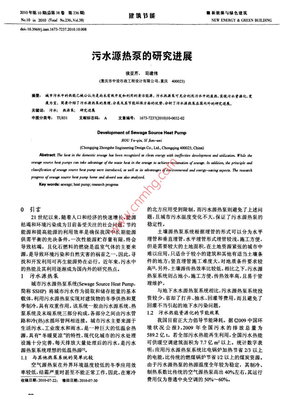 2010年第10期總第38卷第236期建筑節(jié)能■新能源與綠色建筑No 10 in 2010(Total No 236, Vol 38)NEW ENERGY GREEN BUILDINGdoi:10,3969/issn67372372010.10.008污水源熱泵的研究進(jìn)展侯亞芹,司建偉(重慶市中設(shè)市政工程設(shè)計(jì)有限公司,重慶40003)摘要:城市污水中的熱能已被公認(rèn)為是尚未有效開(kāi)發(fā)和利用的清潔能源,污水熱源泵可克分利用污水中的廢熱,實(shí)現(xiàn)污水資源化,變廢為寶簡(jiǎn)要介紹了污水源熱泵的原理分類及其節(jié)能環(huán)保方面的優(yōu)勢(shì),分析了污水源熱泵在國(guó)內(nèi)外的研究進(jìn)展關(guān)鍵詞:污水;熱源泵;研究進(jìn)展中圖分類號(hào):TU831文獻(xiàn)標(biāo)志碼:A文章編號(hào);1673-7237(2010)10003202Development of Sewage Source Heat PumpHOU Ya-gin, SI Jan-woei(Chongqing Zhongshe Engineering Design Co, Ltd, Chongqing 400023, China)ewage source hear pumps can take advantage of the waste heat in the sewage to achieve reclamation of sewage. In addition, the principleclassification of sewage source heat pump were introduced, as well as its advantages of environmentol and energ - saming aspects. The researchprogress of sewage souree heat pump home and aboard was also analyzedKey words: sewage: heat pump; research progress0引言的北方應(yīng)用受到限制。而污水源熱泵則避免了上述問(wèn)21世紀(jì)以來(lái)隨著人口和經(jīng)濟(jì)的快速增長(zhǎng),能源題,且城市污水溫度變化不大,保證了污水源熱泵的枯竭和環(huán)境污染成為目前備受關(guān)注的社會(huì)問(wèn)題。節(jié)約穩(wěn)定性能源和提高能源的利用效率是確保我國(guó)中長(zhǎng)期能源土壤源熱泵系統(tǒng)根據(jù)埋管的形式可以分為水平供需平衡的先決條件,一次性能源貯存量有限,終會(huì)埋管和垂直埋管,水平埋管形式埋管較淺施工方便,導(dǎo)致枯竭,且化石燃料的燃燒是溫室氣體的主要來(lái)但是需要較大的土地面積在土地資源緊張的城市中源是導(dǎo)致環(huán)境污染和自然災(zāi)害的禍?zhǔn)字?因此,尋難以應(yīng)用只適合于較小的建筑和其他有適當(dāng)土壤條找和開(kāi)發(fā)利用可再生能源勢(shì)在必行。近年來(lái)污水中件的地方;豎直埋管施工難度大,對(duì)地質(zhì)條件要求較的熱能及其利用逐漸成為國(guó)內(nèi)外的研究熱點(diǎn)。高,另外,土壤源傳熱效率比較低。相比之下,污水源1污水源熱泵熱泵系統(tǒng)則占地小,施工方便,傳熱效率高,且易于管城市污水源熱泵系統(tǒng)( Sewage Source Heat Pump,理維護(hù)。簡(jiǎn)稱SSH)將城市污水作為提取和儲(chǔ)存能量的基本與地下水水源熱泵系統(tǒng)相比,污水源熱泵系統(tǒng)投載體,利用污水源熱泵實(shí)現(xiàn)對(duì)建筑物的冬季供熱和夏資較少,省卻了打井、抽水、回灌等費(fèi)用,而且避免了季制冷,具有雙重作用。該系統(tǒng)一般由污水源系統(tǒng)、熱回灌不當(dāng)引起的地下水污染問(wèn)題。泵系統(tǒng)及末端系統(tǒng)三部分構(gòu)成,各部分之間由污水管1,2污水熱能資源化的節(jié)能效果路和冷(熱)水循環(huán)管網(wǎng)相連接。城市污水主要來(lái)源于我國(guó)目前正大力倡導(dǎo)節(jié)能降耗。據(jù)《2009中國(guó)環(huán)生活污水、工業(yè)廢水和雨水,是一種巨大的低溫余熱境狀況公報(bào)》,2009年全國(guó)污水的排放總量為源,具有“冬暖夏涼的特性,現(xiàn)代化城市的污水處理5892億t。若全部污水熱能再生利用全國(guó)污水熱能設(shè)施十分完善,每天排放大量處理后的污水,是污水可供暖空調(diào)建筑面積為77億m2以上。統(tǒng)計(jì)數(shù)字表源熱泵系統(tǒng)理想的低溫?zé)嵩磫?。?應(yīng)用污水源熱泵系統(tǒng)比電鍋爐加熱節(jié)省23以上1.1與其他熱泵系統(tǒng)的簡(jiǎn)單比較的電能,比傳統(tǒng)的燃煤鍋爐節(jié)省2以上的煤炭資源??諝庠礋岜迷谕饨绛h(huán)境溫度較低的冬季應(yīng)用效由于污水源熱泵的熱源溫度全年較為穩(wěn)定,其制冷、率較低,結(jié)霜嚴(yán)重時(shí)甚至不能正常工作因此,在寒冷制熱系數(shù)比傳統(tǒng)的空氣源熱泵高出40%左右,其運(yùn)行收稿日期:20100722:修回日期:20100730費(fèi)用僅為普通中央空調(diào)的50%~60%13污水熱能資源化的經(jīng)濟(jì)效益到制冷的目的由于省去了鍋爐房和冷卻塔等附屬設(shè)施污水源22污水源熱泵系統(tǒng)分類熱泵系統(tǒng)可以將污水熱能直接供給需要區(qū)域,這樣在污水源熱泵系統(tǒng)按其利用污水的處理狀態(tài)可分節(jié)省空間減少設(shè)備及其占地面積的情況下,自然降為以未處理過(guò)的污水作為冷熱源的原生污水源熱泵低了設(shè)備投資和區(qū)域管網(wǎng)的費(fèi)用,從而大大地降低了系統(tǒng)和以污水處理廠一級(jí)、二級(jí)出水或中水作為冷熱系統(tǒng)的運(yùn)行費(fèi)用。日本實(shí)際運(yùn)行的城市污水熱能回收源的熱泵系統(tǒng);根據(jù)污水與制冷劑之間的換熱關(guān)系將與利用系統(tǒng)的測(cè)算結(jié)果表明,與以往其他熱供給系統(tǒng)城市污水源熱泵系統(tǒng)分為間接利用系統(tǒng)和直接利用相比較,大約可降低運(yùn)行費(fèi)用30%左右。朱愛(ài)平比系統(tǒng),若污水與制冷劑之間不通過(guò)任何中介媒質(zhì)而僅較了污水源熱泵系統(tǒng)、地下水源熱泵系統(tǒng)燃?xì)饪绽鋬H通過(guò)換熱器壁面進(jìn)行間接換熱的熱泵系統(tǒng)