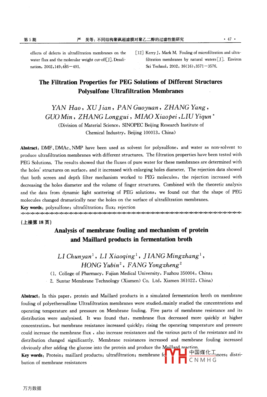 第33卷第5期膜科學與技術Vol. 33 No. 52013年10月MEMBRANE SCIENCE AND TECHNOLOGYOct.2013不同結構聚砜超濾膜對聚乙二醇的過濾性能研究嚴昊,徐建,潘國元,張楊,郭敏,張龍貴,苗小培,劉軼群"(中國石油化工股份有限公司北京化工研究院材料科學研究所,北京100013)摘要:以N,N-二甲基甲酰胺(DMF)、N,N-二甲基乙酰胺(DMAc)、N-甲基吡咯烷酮(NMP)為溶劑,水為非溶劑,制備了不同結構的聚砜超濾膜,并考察其對超濾膜過濾性能測試體系一聚乙二醇水溶液的過濾性能.發(fā)現(xiàn)純水通量主要是由超濾膜表面的孔結構所決定,孔徑越大通量越高;聚乙二醇水溶液的過濾性能由膜表面的孔結構和截面結構所決定,膜表面的孔徑越小、截面是海綿結構的超濾膜的截留率越高.并且通過理論模擬與動態(tài)激光光散射的數(shù)據(jù)比較,發(fā)現(xiàn)聚乙二醇的分子鏈在經(jīng)過超濾膜時形態(tài)發(fā)生了明顯變化.關鍵詞:聚砜;超濾膜;通量;截留率中圖分類號: TQ028. 8文獻標志碼: A文章編號: 1007 -8924(2013)05-0043-05聚砜是一種性能優(yōu)良的高聚物,耐水解,很適合到了 ~些對分析聚砜超濾膜性能參數(shù)有指導意義的在工業(yè)上應用于膜材料的開發(fā)與應用.目前,過濾領結論.域主要在兩大方向使用聚砜材料(-),一個是超濾膜1試驗部分方向4],另一個是做復合納濾和反滲透膜的支撐基膜[5].雖然這兩種聚砜膜的制備工藝都是采用非溶1.1試驗材料與儀器劑浸泡的相轉化法,但是其對結構和性能的要求卻聚砜: Solvay Udel3700; PEG10000: Alfa Aesar,不盡相同.其中超濾膜的研究方向主要是截留率與Mw = 100 000; PEG40000:Alfa Aesar,M =40 000;F、通量的調控,和抗污染性能的提高.而基膜主要研究DMAc、NMP均選自北京化學試劑廠,分析純.的是其表面結構和界面聚合的匹配性,其本身截留美國Brookhaven公司的BI-200SM型動靜態(tài)率和通量性能對最終復合膜的性能影響較小.對于激光光散射儀,532nm固體激光光源,BI-APD檢測超濾膜而言,其過濾的主要是其他分離技術難以完器;日本日立公司的場發(fā)射掃描電鏡S-4800;國產(chǎn)成的膠狀懸浮液,大分子在溶劑中形態(tài)的復雜性造DKN-40型平板刮膜機;美國Amicon8200死端式成了超濾膜截留性能的不確定性,線性高分子如聚過濾單元.乙二醇的截留率往往低于相同分子量的球型蛋白高1.2聚砜超濾膜的制備分子[6].將18%聚砜分別溶于DMF .DMAc.NMP的3本工作采用了最常使用的超濾膜過濾性能測試種溶劑中,完全溶解后靜置72h,并用真空烘箱脫體系-聚乙二醇(PEG)水溶液進行研究,通過動態(tài)泡15 min,之后使用平板膜刮膜機在無紡布上連續(xù)激光光散射(DLS)對其形態(tài)進行了表征.以DMF、刮涂厚度為250 pμm的高分子溶液,并立即浸人DMAc、NMP為溶劑,水為非溶劑,制備了不同結構20 C的水浴中成膜.的聚砜超濾膜,分別考察其對PEG水溶液的過濾性1.3純水通和PEG截留率測試能根據(jù)實驗結果探討了不同溶劑對聚砜超濾膜結將制備好的聚砜超濾膜放置于死端式過濾單元構和性能的影響,并對實驗數(shù)據(jù)進行了理論模擬,得中測試純水通量和截留率.首先將超濾膜在0.2MPa收稿日期: 2012-12-17第- -作者簡介:嚴昊(1984-), 男,安徽人,博士,工程師,主要研究方向為中國煤化工. *通訊作者,E-mail: liuyq. bjhy@sinopec. comMYHCNMH G第5期嚴吳等: 不同結構聚砜超濾膜對聚乙二醇的過濾性能研究effects of defects in ultrafiltration membranes on the[12] Kerry J, Mark M. Fouling of microfiltration and ultra-water flux and the molecular weight cut off[J]. Desali-filtration membranes by natural waters[J]. Environnation, 2002,149:485- 491.Sci Technol, 2002, 36(16):3571 - -3576.The Filtration Properties for PEG Solutions of Different StructuresPolysulfone Ultrafiltration MembranesYAN Hao, XU Jian, PAN Guoyuan, ZHANG Yang,GUO Min, ZHANG Longgui, MIAO Xiaopei ,LIU Yiqun(Division of Material Science, SINOPEC Beijing Research Institute ofChemical Industry, Bejjing 100013, China)Abstract: DMF、DMAc、NMP have been used as solvent for polysulfone, and water as non-solvent toproduce ultrafiltration membranes with different structures. The filtration properties have been tested withPEG Solutions. The results showed that the fluxes of pure water for these membranes are determined withthe holes' structures on surface, and it increased with enlarging holes diameter. The rejection data showedthat both screen and depth filter mechanism worked to PEG molecules, the rejection increased withdecreasing the holes diameter and the volume of finger structures. Combined with the theoretic analysisand the data from dynamic light scattering of PEG solutions, we found out that the shape of PEGmolecules changed dramatically near the holes on the surface of ultrafiltration membranes.Key words: polysulfone; ultrafiltration; flux; rejection(上接第18頁)Analysis of membrane fouling and mechanism of proteinand Maillard products in fermentation brothLI Chunyan' , LI Xiaoqing', J IANG Mingzhang',HONG Yubin', FANG Yongzheng2(1. College of Pharmacy, Fujian Medical University, Fuzhou 350004, China;2. Suntar Membrane Technology (Xiamen) Co. Ltd, Xiamen 361022, China)Abstract: In this paper, protein and Maillard products in a simulated fermentation broth on membranefouling of polyethersulfone Ultrafiltration membranes were studied, mainly studied the concentrations andoperating temperature and pressure on Membrane fouling. Five parts of membrane resistance and itsdistribution were analysised. It was found that, membrane flux decreased more quickly at higherconcentration, but membrane resistance increased quickly; rising the operating temperature and pressurecould incre