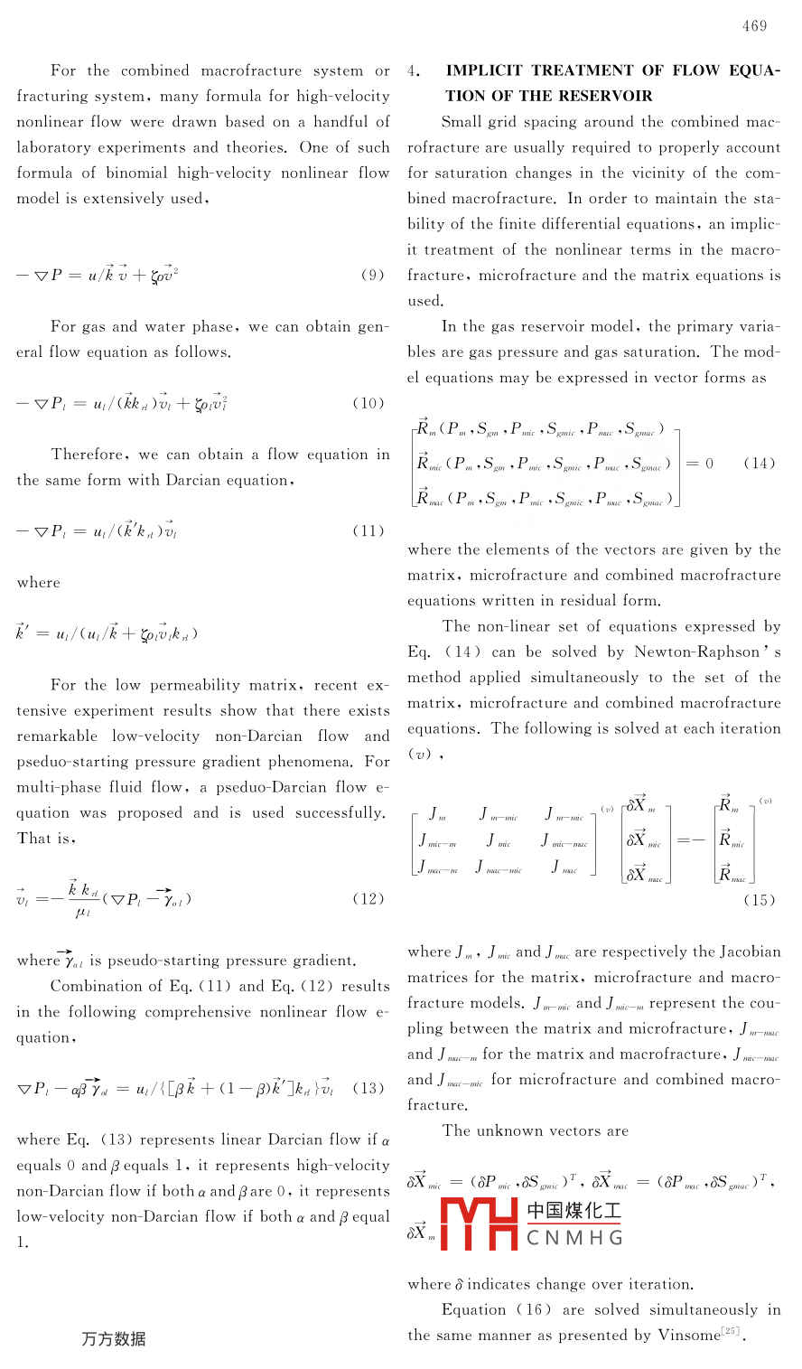 466Journal of Hydrodynamics ,Ser. B,2005,17(4):466 - - 472China Ocean Press, Beijing - Printed in ChinaWATER BREA KTHROUGH SIMULATION IN NATURALLY FRACTUREDGAS RESERVOIRS WITH WATER DRIVEZHANG Lie-hui, FENG Guo-qing,LI xiao-ping, LI YunState Key Laboratory of Oil and Gas Reservoir Geology and Exploitation,Southwest Petroleum Institu-te, Chengdu 610500, China, E mail: zlhdyyzbn@ 163. com( Received Jan. 17, 2004)ABSTRACT: In the fractured water drive reservoirs of Chi-saturationna,because of the complex geological conditions, almost allK- formation permeabilitythe active water invasions appear to be water breakthrough- relative permeabilityalong fractures, especially along macrofractures. These sealproduction ratethe path of gas flow, thus the remaining gas in the pores mi-fluid potentialxes into water, and leads to gas- water interactive distribu-- porositytion in the fractured gas reservoir. These complicated frac-. viscositytured systems usually generate some abnormal flowing phe-nomena such as the crestal well produces water while thecapillary pressuredowndip well in the same gas reservoir produces gas, or thethe exchange termsame gas well produces water intermittently. It is very diffi-- fracture spacingcult to explain these phenomena using existing fracture mod-upstream weighting factorels because of their simple handling macrofractures withoutδ -- shape factorconsidering nonlinear flowing in the macrofractures and theξ -- inertial factorlow permeability matrix. Therefore, a nonlinear combined-flowing multimedia simulation model was scessfully devel-oped in this paper by introducing the equations of macrofrac-SUBSCRIPTStures and considering nonlinear flow in the macrofracturesmacmacrofractureand the matrix. This model was then applied to actual frac-tured bottom water gas fields. Sensitivity studies of gas pro-microfractureduction by water drainage in fractured gas reservoirs were- matrixcompleted and the effect of different water drainage intensityx---- x -directionand ways on actual gas production using this model were cal-y -directionculated. This model has been extensively used to predict thez -directionproduction performance in various fractured gas fields andl-一o,g,wproven to be reliable.1. INTRODUCTIONKEY WORDS:fractured gas reservoir, water break-Simulation of multiphase flow in heterogene-through,water invasion, numerical simulation, implicitous two porosity reservoirs such as naturally frac-treatmenttured system is a difficult problem from both a res-ervoir description standpoint as well as a numericalNOMENCLATUREone. The reservoir is represented by two collocated0l-time incrementcontinuums, i. e. a fracture continuum and a ma-T - fracture transmissibilitytrix continuum. The fracture continuum has highV。-- bulk volumeperr中國煤化工volume while the ma-YHCNMH G .Project supported by the Teaching and Research Award Program for Outstanding Y oung Teachers for Higher Edu-cation Institutions of Ministry of Education of China and the Fund of Ph. D. Student Supervisor of Ministry of Education ofChina (Grant No:20040615004).Biography :公HA教據(jù).ie hui (1967-). Male, Ph. D. ,Professor467trix continuum has low permeability and high stor- considered the interaction between fluid flow andage volume.rock- mass deformation. Zhang-24] developed a su-Simulation of naturally fractured reservoirs per dual porosity model by introducing larger aper-has received much interest since the extension of ture fractures and a new combined fracture media ,Warren and Root's'1 model to multiphase systems which is used to quantitatively simulate waterby Kazemi et al.L241. Further developments were channeling through macrofracture. Based on the a-made by Iffly et al.t5], Yamamoto et al.bove models, we have developed a two- phase ( gasKleppe and Morsef] ,Rossen-8J and Thomas et and water) and multiple fracture media simulatoral. [9] and others. These models include laboratory to simulate the fluid flow phenomena in naturallyinvestigations of oil and gas recovery from individ- fractured water drive gas reservoir by establishingual matrix blocks and simulation of single and mul-independently combined macrofracture equationstiphase flow in fractured reservoirs. Most of the and considering nonlinear flow in the combinedmultiphase models account emphatically for the macrofractures and the low permeability matrix u-viscous, gravity and capillary forces, or a mixture sing a fully implicit formulation. The simulatorof them. In these models, usually the matrix can handle the reservoirs that contain arbitraryblocks are assumed as isolated block surrounded by combination of macrofractured, microfractured anda continuous fracture medium. The matrix blocks unfractured areas. In addition, our model has suc-act as sources or sinks to the fractures, which are ceeded in completing 24 single- well history matchthe main flow channel. This kind of models is with abnormal production phenomena for actualcalled dual porosity model. The other model is du- fractured water drive gas reservoirs. Sensitivityal- permeability model, also considering the matrix studies for water drainage production gas in the ac-to matrix flow.tual gas reservoir were carried out. The resultsIn recent years, the accurate modelling of ma- were used to direct actual production of the gastrix- fracture transfer has been the most important reservoir.aspect of the simulation of naturally fractured res-ervoirs. Numerous papers have appeared in the lit- 2. MODEL DESCRIPTIONeraturel0-16) discussing various approaches for im- 2. 1 Flow equationsproving the handling of the transfer in black-oilThe reservoir is assumed to be comprised of asimulation where the interaction between capillary continuous combined macrofracture system,a con-and gravity forces plays an important role. The tinuous microfracture system and continuous mamain deficiency of the original dual-porosity model trix blocks. The combined macrofracture system iswas the treatment of th
