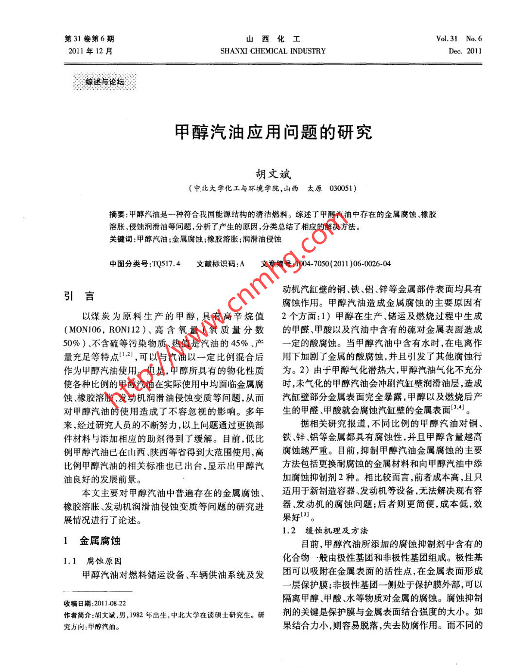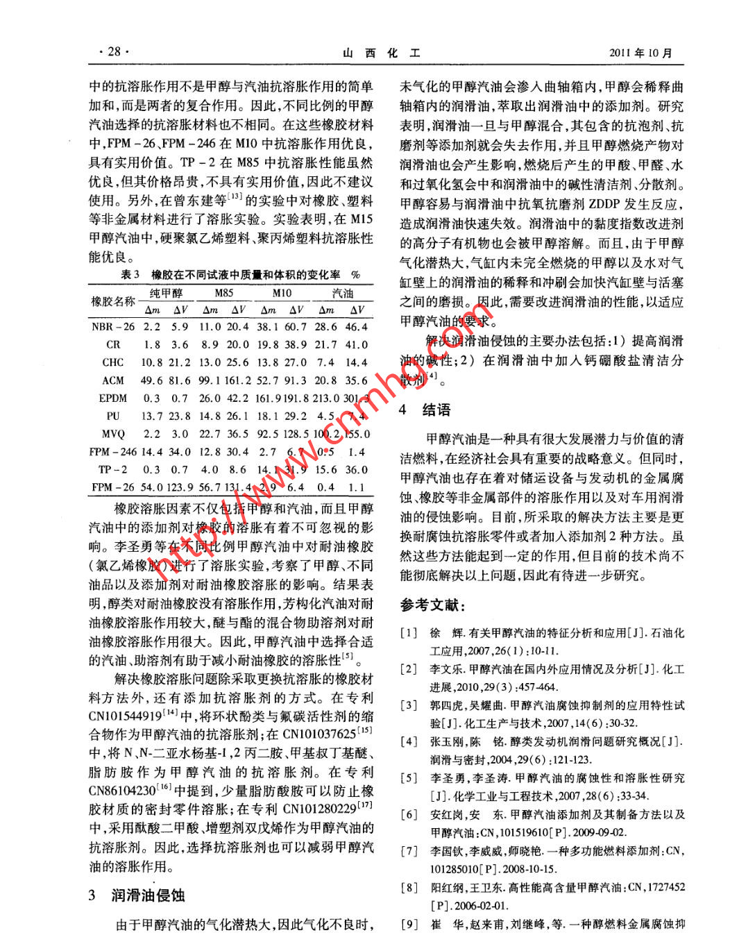第31卷第6期山西化工Vol.31 No. 62011年12月SHANXI CHEMICAL INDUSTRYDec.2011綜述與論壇甲醇汽油應(yīng)用問題的研究胡文斌(中北大學(xué)化工與環(huán)境學(xué)院,山西太原030051)摘要:甲醇汽油是一種符合我國能源結(jié)構(gòu)的清潔燃料。綜述了甲醇汽油中存在的金屬腐蝕、橡膠溶脹侵蝕潤滑油等問題,分析了產(chǎn)生的原因,分類總結(jié)了相應(yīng)的解決方法。關(guān)鍵詞:甲醇汽油;金屬腐蝕;橡膠溶脹;潤滑油侵蝕中圖分類號:TQ517.4文獻(xiàn)標(biāo)識碼:A 文章編號 :1004-7050(2011 )06-0026-04動機(jī)汽缸壁的銅、鐵、鋁、鋅等金屬部件表面均具有引言腐蝕作用。甲醇汽油造成金屬腐蝕的主要原因有以煤炭為原料生產(chǎn)的甲醇,具有高辛烷值2個方面:1)甲醇在生產(chǎn)、儲運及燃燒過程中生成(MON106, RON112)、高含氧量(氧質(zhì)量分?jǐn)?shù)的甲 醛、甲酸以及汽油中含有的硫?qū)饘俦砻嬖斐?0%)、不含硫等污染物質(zhì)、熱值是汽油的45%、產(chǎn)- -定的酸腐蝕。當(dāng)甲醇汽油中含有水時,在電離作量充足等特點[1.21,可以與汽油以一-定比例混合后用下加劇了金屬的酸腐蝕,并且引發(fā)了其他腐蝕行作為甲醇汽油使用。但是,甲醇所具有的物化性質(zhì)為。2)由于甲醇?xì)饣瘽摕岽?甲醇汽油氣化不充分使各種比例的甲醇汽油在實際使用中均面臨金屬腐時,未氣化的甲醇汽油會沖刷汽缸壁潤滑油層,造成蝕、橡膠溶脹、發(fā)動機(jī)潤滑油侵蝕變質(zhì)等問題,從而汽缸壁 部分金屬表面完全暴露,甲醇以及燃燒后產(chǎn)對甲醇汽油的使用造成了不容忽視的影響。多年生的甲醛、甲酸就會腐蝕汽缸壁的金屬表面13.4]。來,經(jīng)過研究人員的不斷努力,以上問題通過更換部據(jù)相關(guān)研究報道,不同比例的甲醇汽油對銅、件材料與添加相應(yīng)的助劑得到了緩解。目前,低比鐵、鋅、鋁等金屬都具有腐蝕性,并且甲醇含量越高例甲醇汽油已在山西、陜西等省得到大范圍使用,高腐蝕越嚴(yán)重。目前,抑制甲醇汽油金屬腐蝕的主要比例甲醇汽油的相關(guān)標(biāo)準(zhǔn)也已出臺,顯示出甲醇汽方法包括更換耐腐蝕的金屬材料和向甲 醇汽油中添油良好的發(fā)展前景。加腐蝕抑制劑2種。相比較而言,前者成本高,且只本文主要對甲醇汽油中普遍存在的金屬腐蝕、適用于新制造容器、發(fā)動機(jī)等設(shè)備,無法解決現(xiàn)有容橡膠溶脹、發(fā)動機(jī)潤滑油侵蝕變質(zhì)等問題的研究進(jìn)器、發(fā)動機(jī)的腐蝕問題;后者則更簡便,成本低,效展情況進(jìn)行了論述。果好”。1.2 緩蝕機(jī)理及方法1金屬腐蝕目前,甲醇汽油所添加的腐蝕抑制劑中含有的1.1 腐蝕原因化合物一般由極性基團(tuán)和非極性基團(tuán)組成。極性基甲醇汽油對燃料儲運設(shè)備車輛供油系統(tǒng)及發(fā)團(tuán)可以吸附在金屬表面的活性點,在金屬表面形成一層保護(hù)膜;非極性基團(tuán)- -側(cè)處于保護(hù)膜外部,可以隔離甲醇、甲酸、水等物質(zhì)對金屬的腐蝕。腐蝕抑制收稿日期:2011-08-22作者簡介:胡文斌,男,1982年出生,中北大學(xué)在讀碩士研究生。研劑的關(guān)鍵是保護(hù)膜與金屬表面結(jié)合強(qiáng)度的大小。如究方向:甲醇汽油。果結(jié)合力小,則容易脫落,失去防腐作用。而不同的.2011年12月.胡文斌,甲醇汽油應(yīng)用問題的研究.27.金屬對于不同化合物的結(jié)合力不同,因此需要將不的腐蝕抑制劑。除此以外,研究者還提供了同時具同的化合物進(jìn)行復(fù)配,以適用不同的金屬。目前使有緩蝕功能和其他功能的腐蝕抑制劑配方。例如,用的腐蝕抑制劑主要是由不同化合物按照一-定要求在專利CN10164923010]中就公開了成分為脂肪酸、復(fù)配后制備出的適用于甲醇汽油的混合物。防銹劑、烯基酯或醚、非離子表面活性劑的甲醇汽油郭四虎與吳耀曲3]制備了不同的腐蝕抑制劑,腐蝕抑制劑。這種腐蝕抑制劑不但對銅、鋁、45#鋼、并且在M15甲醇汽油中進(jìn)行了防腐蝕實驗,結(jié)果如鋅和氣化器材質(zhì)等多種金屬具有優(yōu)良緩蝕性能,而表1所示。其中,由糖類與多元有機(jī)酸合成的化合且具有助溶作用,不會破壞甲醇汽油的酸堿平衡。物和氮雜環(huán)類復(fù)配而成的H-G腐蝕抑制劑具有較以上所述甲醇汽油腐蝕抑制劑多為含有羥基等好的緩蝕效果。組分分子中的極性基團(tuán)能夠吸附在極性基團(tuán)的化合物、含氮類化合物以及屏蔽酚類。銅、鋁表面,非極性基團(tuán)在金屬表面形成保護(hù)膜,起這是因為,這些化合物分子中含有的羥基等極性基到了阻止電化學(xué)腐蝕和減弱硫等酸性物質(zhì)的酸腐蝕團(tuán)可以吸附在金屬表面形成保護(hù)膜;而含有未配對作用。而且,腐蝕抑制劑組分分子中的部分官能團(tuán)電子的氮原子能與金屬形成配位鍵“",從而形成一能與鐵等金屬形成絡(luò)合物,在鋼鐵表面形成致密保層阻擋腐蝕物質(zhì)的保護(hù)膜;屏蔽酚類起到的主要作護(hù)膜,阻止對鋼鐵金屬表面的腐蝕。在李圣勇與李用是減少空氣對甲醇與金屬的氧化,避免空氣對金圣濤的銅腐蝕實驗中,以苯并唑與吡唑酮2種氮雜屬腐蝕的影響。因此,甲醇汽油腐蝕抑制劑組成- -般環(huán)化合物進(jìn)行復(fù)配制備腐蝕抑制劑,并在不同比例包括酸類醇類、酯類胺類氮雜環(huán)類與屏蔽酚類。的甲醇汽油中添加不同比例的腐