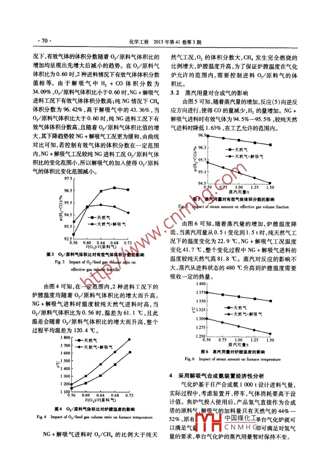第41卷第3期化學(xué)工程Vol. 41 No. 32013年3月CHEMICAL ENGINEERING( CHINA)Mar.2013解吸氣部分替代天然氣制合成氣可行性分析李青云',何凱,李云,張華2(1.西安交通大學(xué)能源與動(dòng)力工程學(xué)院,陜西西安710049;2.中國(guó)石油天然氣股份有限公司寧夏石化分公司,寧夏銀川750026)摘要:針對(duì)解吸氣部分替代天然氣制取合成氨用合成氣的反應(yīng)過(guò)程建立了數(shù)學(xué)模型,基于 Aspen Plus軟件,模擬2種進(jìn)料情況下的反應(yīng),驗(yàn)證解吸氣部分替代天然氣可行性。分析了主要工藝條件如氧氣原料氣體積比蒸汽用量對(duì)氣化爐出口氣體成分和爐膛溫度的影響。對(duì)比解吸氣部分替代和純天然氣進(jìn)料的經(jīng)濟(jì)性,當(dāng)天然氣價(jià)格為1.875元/m3時(shí),2種原料氣合成氨的成本相同。但隨著天然氣價(jià)格的上漲采用解吸氣部分替代后將有明顯的經(jīng)濟(jì)性?xún)?yōu)勢(shì)。關(guān)鍵詞:解析氣; Aspen Plus;合成氨中圖分類(lèi)號(hào):TQ441.41文獻(xiàn)標(biāo)識(shí)碼:A文章編號(hào):10059954(2013)030067405DOI:10.3969/.iss.10059954.2013.03.016Feasibility analysis of natural gas partly replaced bydesorbed gas to produce syngasLI Qing-yun,HE Kai, LI Yun', ZHANG Hua(1. School of Energy and Power Engineering, Xi'an Jiaotong University, Xi'an 710049, Shaanxi ProvinceChina; 2. PetroChina Ningxia Petrochemical Company, Yinchuan 750026, Ningxia, China)Abstract: According to the gasification process of natural gas partly replaced by desorbed gas to produce the syngasused in synthetic ammonia, the mathematical model of this process was established, based on Aspen Plus softwarethe gasification process of two kinds of feed gas was simulated, and the feasibility of natural gas partly replaced bydesorbed gas was verified. The main process conditions such as volume ratio of oxygen to feed gas, the effect of theamount of steam on gasifier exit gas composition and fumace temperature were analyzed. By contrasting theeconomic performance of part replacement by desorbed gas and pure gas feed, the conclusion shows that the costs ofthe two kinds of synthetic ammonia gas materials are the same when the price of natural gas is 1. 875 yuan/m.Asnatural gas price rises, the part replacement by desorbed gas has obvious economic advantagesKey words: desorbed gas; Aspen Plus; synthetic ammonia隨著天然氣價(jià)格的上漲,以天然氣為原料的合和環(huán)境的污染。將其回收利用作為合成氨的原成氨生產(chǎn)成本逐漸提高,尋求新的原料替代天然氣料氣,可取得很好的經(jīng)濟(jì)效益和環(huán)境效益成為一種趨勢(shì)。焦?fàn)t氣經(jīng)過(guò)分離與凈化后的解吸氣焦?fàn)t氣經(jīng)過(guò)分離與凈化后得到氫氣和解吸氣因含有一定量的CH4和H2,被認(rèn)為是一種很好的化(富甲烷氣),其中氫氣的純度(體積分?jǐn)?shù))可以達(dá)到工原料。98.67%,解吸氣的成分為:H216.75%,CH4焦?fàn)t氣主要來(lái)源于焦炭生產(chǎn),是煤在煉焦?fàn)t中43.36%,N28.69%,CO01734%,CO28.76%,CH經(jīng)過(guò)高溫干餾產(chǎn)生的一種可燃性氣體。我國(guó)每年焦5.10%,被送入氣化爐,替代部分天然氣。爐氣的產(chǎn)量約1200億m3,約有55%用來(lái)發(fā)電,制利用解吸氣部分替代天然氣作為合成氨原料可氫和甲醇,其余部分則直接排放造成了資源的浪費(fèi)節(jié)省天然氣,但解吸氣中較純天然氣(簡(jiǎn)稱(chēng)NG)CH4中國(guó)煤化工收稿日期:201207-17基金項(xiàng)目:中石油創(chuàng)新基金資助項(xiàng)目(2010D-50060705)CNMHG作者簡(jiǎn)介:李青云(1987—),女,碩士研究生,主要從事氣化爐的模擬工作;李云,女,教授通信聯(lián)系人,E-mail68化學(xué)工程2013年第41卷第3期含量低,同時(shí)含有一定量的H2和CO,進(jìn)料的變化CH4+H2O→→C0+3H2,必然對(duì)氣化爐的工作帶來(lái)一定影響。分離后的氫氣△H=206.15kJ/mol經(jīng)過(guò)進(jìn)一步處理作為合成工段的原料氣,對(duì)氣化工CH4+CO2→→2C0+2H2,段產(chǎn)物H2的需求量減少。同時(shí),O2的需求量也減△H=247.27kJ/mol少,針對(duì)寧夏石化分公司的具體實(shí)際,若O2的加入CO2+H2→→CO+H,O量小于正常值的50%,裝置無(wú)法正常運(yùn)行。本文結(jié)△H=115.98kJ/mol合 Aspen Plus軟件,分析解吸氣部分替代天然氣的CH4 FC+2H2(6)可行性,探討工藝條件對(duì)合成氣的影響。2C0=C+co(7)C+hoe co+2H(8)1天然氣制取合成氣的非催化部分氧化過(guò)程分析C+H2OF CO+2H2(9)天然氣為原料的合成氨裝置氣化工段采用非催其中,反應(yīng)(1),(2)為天然氣的燃燒反應(yīng),通?;糠盅趸に?該技術(shù)由前蘇聯(lián)國(guó)立氮?dú)庠O(shè)計(jì)研認(rèn)為瞬間完成,是強(qiáng)放熱過(guò)程,反應(yīng)(3)-(5)為究院和意大利蒙特卡尼公司開(kāi)發(fā),其工業(yè)化始于20CH和一次反應(yīng)的產(chǎn)物發(fā)生的二次轉(zhuǎn)化,是整個(gè)過(guò)世紀(jì)50年代中期23),工藝流程簡(jiǎn)圖如圖1所示。程的控制步驟反應(yīng)在2-3ms內(nèi)完成,且均為吸熱氧氣來(lái)自空分過(guò)程8。提高反應(yīng)溫度有利于反應(yīng)的進(jìn)行,但同時(shí)合成氣蒸氣會(huì)發(fā)生甲烷裂解生成碳的反應(yīng)。因此,在反應(yīng)過(guò)程中控制溫度不宜過(guò)高。天然氣非催化部分氧化是一個(gè)在高溫高壓下洗|循環(huán)灰水壓縮機(jī)洗滌器「滌由多組分參與的復(fù)雜反應(yīng)過(guò)程,氣化爐內(nèi)的反應(yīng)溫度一般在1200-1500℃左右,壓力為78MPa。去廢水處理用 Aspen Plus模擬氣化爐內(nèi)的反應(yīng