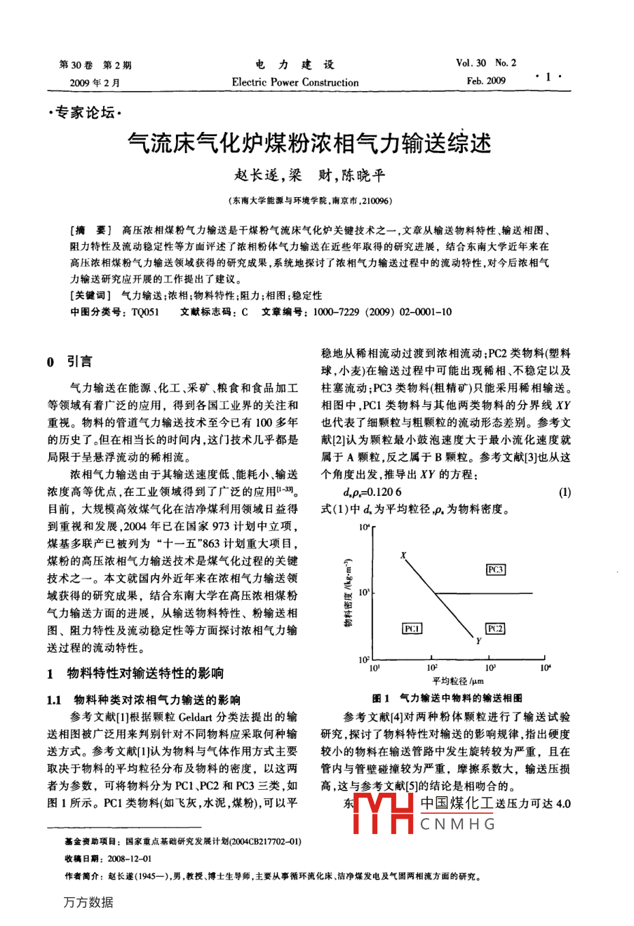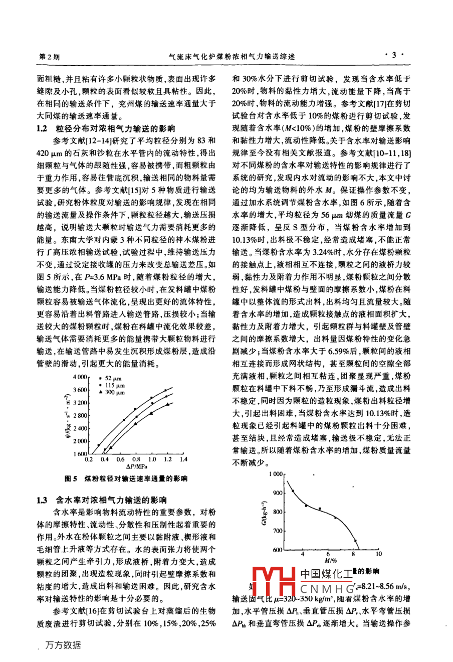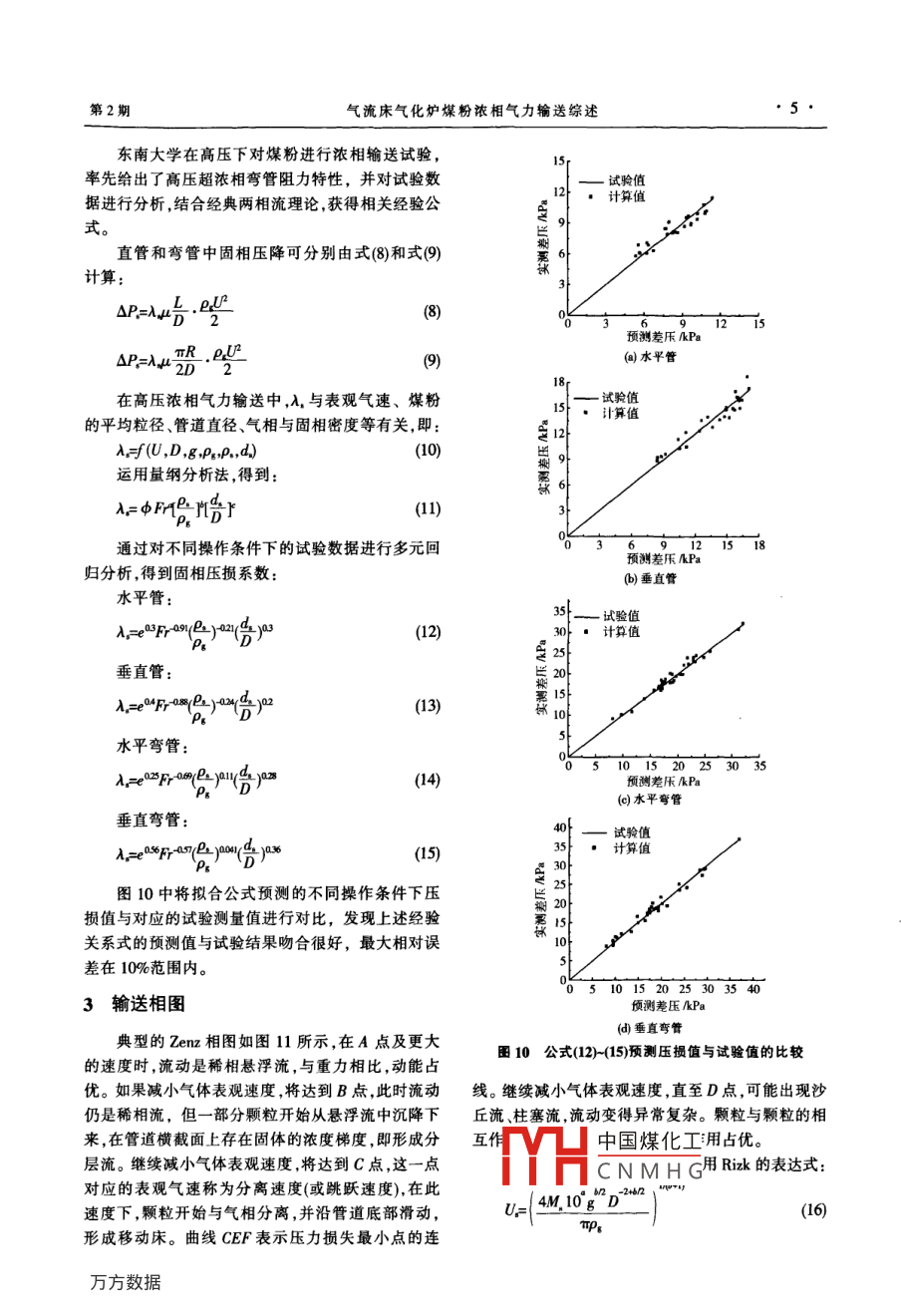 第30卷第2期電力建設(shè)Vol.30 No. 22009 年2月Electric Power ConstructionFeb. 2009專家論壇●氣流床氣化爐煤粉濃相氣力輸送綜述趙長遂,梁財(cái), 陳曉平(東南大學(xué)能源與環(huán)境學(xué)院.南京市,210096)[摘要]高壓濃相煤粉氣力輸送是干煤粉氣流床氣化爐關(guān)鍵技術(shù)之- - ,文章從輸送物料特性、輸送相圖、阻力特性及流動穩(wěn)定性等方面評述了濃相粉體氣力輸送在近些年取得的研究進(jìn)展,結(jié)合東南大學(xué)近年來在高壓濃相煤粉氣力輸送領(lǐng)城獲得的研究成果,系統(tǒng)地探討了濃相氣力輸送過程中的流動特性,對今后濃相氣力輸送研究應(yīng)開展的工作提出了建議。[關(guān)鍵詞]氣力輸 送;濃相;物料特性;阻力;相圖;穩(wěn)定性中圖分類號: TQ051文獻(xiàn)標(biāo)志碼: C文章編號: 1000-7229 (2009) 02- 0001-10穩(wěn)地從稀相流動過渡到濃相流動;PC2類物料(塑料0引言球,小麥)在輸送過程中可能出現(xiàn)稀相、不穩(wěn)定以及氣力輸送在能源、化工、采礦、糧食和食品加工柱塞流動;PC3類物料(粗精礦)只能采用稀相輸送。等領(lǐng)域有著廣泛的應(yīng)用,得到各國工業(yè)界的關(guān)注和.相圖中,PC1類物料與其他兩類物料的分界線XY重視。物料的管道氣力輸送技術(shù)至今已有100多年也代表了細(xì)顆粒與粗顆粒的流動形態(tài)差別。參考文的歷史了。但在相當(dāng)長的時(shí)間內(nèi),這門技術(shù)幾乎都是獻(xiàn)[2]認(rèn)為顆粒最小鼓泡速度大于最小流化速度就局限于呈懸浮流動的稀相流。屬于A顆粒,反之屬于B顆粒。參考文獻(xiàn)[3]也從這濃相氣力輸送由于其輸送速度低、能耗小、輸送個(gè)角度出發(fā),推導(dǎo)出XY的方程:濃度高等優(yōu)點(diǎn),在工業(yè)領(lǐng)域得到了廣泛的應(yīng)用15。.d,p.=0.120 6(1]目前,大規(guī)模高效煤氣化在潔凈煤利用領(lǐng)域日益得式(1)中 d,為平均粒徑,P,為物料密度。到重視和發(fā)展,2004年已在國家973計(jì)劃中立項(xiàng),煤基多聯(lián)產(chǎn)已被列為“十一五”863計(jì)劃重大項(xiàng)目,煤粉的高壓濃相氣力輸送技術(shù)是煤氣化過程的關(guān)鍵技術(shù)之一。本文就國內(nèi)外近年來在濃相氣力輸送領(lǐng)ot域獲得的研究成果,結(jié)合東南大學(xué)在高壓濃相煤粉氣力輸送方面的進(jìn)展,從輸送物料特性、粉輸送相圖、阻力特性及流動穩(wěn)定性等方面探討濃相氣力輸P2]送過程的流動特性。101物料特 性對輸送特性的影響平均粒徑/um1.1物料種 類對濃相氣力輸送的影響圖1氣力輸送 中物料的輸送相圍參考文獻(xiàn)[1]根據(jù)顆粒Geldart分類法提出的輸參考文獻(xiàn)[4]對兩種粉體顆粒進(jìn)行了輸送試驗(yàn)送相圖被廣泛用來判別針對不同物料應(yīng)采取何種輸研究,探討了物料特性對輸送的影響規(guī)律,指出硬度送方式。參考文獻(xiàn)[1]認(rèn)為物料與氣體作用方式主要較小的物料在輸送管路中發(fā)生旋轉(zhuǎn)較為嚴(yán)重,且在取決于物料的平均粒徑分布及物料的密度,以這兩管內(nèi)與管壁碰撞較為嚴(yán)重,摩擦系數(shù)大,輸送壓損者為參數(shù),可將物料分為PC1、PC2和PC3三類,如高,這與參考文獻(xiàn)[5]的結(jié)論是相吻合的。圖1所示。PC1 類物料(如飛灰,水泥,煤粉),可以平中國煤化工送壓力可達(dá)4.0YHCNMHG基金資助項(xiàng)目:國家重點(diǎn)基礎(chǔ)研究發(fā)展計(jì)劃(004CB217702-01)收稿日期: 2008-12-01作者簡介:趙長遵(1945-),男,教授博士生導(dǎo)師,主要從事循環(huán)流化床、潔凈煤發(fā)電及氣固兩相流方面的研究。●2●電力建設(shè)第30卷反吹風(fēng)q山電化充壓調(diào)風(fēng)幫↓秤1 1e"緩沖罐閥流化風(fēng).氮'(瓶傳感器轉(zhuǎn)換圄2高壓濃相氣力輸 送試驗(yàn)臺系統(tǒng)圖MPa.、固氣比高達(dá)600 kg/m3的試驗(yàn)臺上進(jìn)行了高壓能增大,可用于克服輸送壓損的能量增加,單位氣體濃相煤粉氣力輸送。如圖2所示,高壓氮?dú)饨?jīng)過緩沖的懸浮攜帶能力增強(qiáng),煤粉的輸送通量增大。不同煤罐分成充壓風(fēng)流化風(fēng)和補(bǔ)充風(fēng)3路。煤粉發(fā)料罐采粉的輸送速率通量的差異主要是由于物料特性引起用上出料式,流化風(fēng)流經(jīng)布風(fēng)板后對發(fā)料罐中的煤的,對2種煤粉進(jìn)行剪切試驗(yàn),如圖4所示,兗州煤粉進(jìn)行流化,經(jīng)提升段進(jìn)入輸送管道,在發(fā)料罐出口的流動性比大同煤好,這與高壓濃相輸送試驗(yàn)的結(jié)引人補(bǔ)充風(fēng)增強(qiáng)輸送能力,充壓風(fēng)則維持發(fā)料罐的論是相同的。根據(jù)煤粉顆粒表面結(jié)構(gòu)掃描電鏡圖,可壓力不變。通過加濕系統(tǒng),水分在輸送過程中按- -定以看到兗州煤顆粒表面光滑,棱角分明,表面沒有明的比例被均勻地加入粉煤中。收料罐壓力由排氣管顯的孔隙及凹坑,并且硬度高,石質(zhì)感強(qiáng)。大同煤表道上的電動調(diào)節(jié)閥根據(jù)設(shè)定值自動控制。發(fā)料罐和5 000收料罐體積均為0.648m',輸送管為φ 16 mmx34 500mm,輸送距離為53m,煤粉實(shí)時(shí)質(zhì)量由3個(gè)高精度4000箔式電子秤稱量,采壓直管長1 000 mm,彎管長6303 500mm,曲率半徑R=200 mm,輸送氣體為壓縮氮?dú)?罐。3000氣源最高壓力為4.8MPa。采用試驗(yàn)研究和數(shù)值模擬相結(jié)合的方法,獲得了不同煤粉物性(如含水率、2 000粒徑和煤種)和操作參數(shù)(如輸