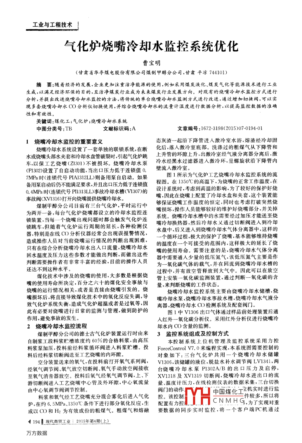 工業(yè)與工程技術(shù)氣化爐燒嘴冷卻水監(jiān)控系統(tǒng)優(yōu)化曹寶明(甘肅省華亭煤電股份有限公司煤制甲醇分公司,甘肅平?jīng)?44101)滴要:隨著經(jīng)濟的發(fā)展,企業(yè)更加注重潔凈能源的使用,例如采用煤炭液化、煤炭氣化等能源技術(shù)進行工業(yè)生成,以滿足經(jīng)濟環(huán)保的目的,且潔凈煤炭行業(yè)成為未來煤炭行業(yè)發(fā)展方向。對現(xiàn)有的燒嘴冷卻水監(jiān)控方式進行分析,并提出改進燒嘴冷卻水監(jiān)控的方法,將傳統(tǒng)的單臺燒嘴嶺卻水監(jiān)測方式進行改進,通過增加切換閥,可以實現(xiàn)多套燒嘴冷卻水CO分析儀切換使用,并綜合燒嘴冷卻水的流量計溫度進行數(shù)據(jù)分析,以提高監(jiān)控數(shù)據(jù)的準確性和有效性。關鍵詞:煤化工;氣化爐;燒嘴冷卻水系統(tǒng)中圖分類號:TB文獻標識碼:A文章編號:1672-3198(2015)07-0194-011燒嘴冷卻水 監(jiān)控的重要意義態(tài)灰渣一起沿下降管進人激冷室水浴,熔渣經(jīng)冷卻固燒嘴冷卻水系統(tǒng)設置了- -套單獨的聯(lián)鎖系統(tǒng),在斷化后,落人激冷室底部。洗滌過的粗煤氣從下降管和水或燒嘴頭部水夾套和冷卻水盤管破裂時,引起氣化爐跳上升管的環(huán)隙上升,出激冷室經(jīng)氣液分離器分離后,激車,以保工藝燒嘴(Z1301)不被損壞。燒嘴冷卻水泵冷水經(jīng)黑水過濾器進人激冷環(huán),呈螺旋狀沿下降管內(nèi)(P1302)設置了自啟動功能,當出口壓力低于連鎖值0.壁流人激冷室。7MPa時(連鎖代號PIA1312LL)則備用泵自啟動。如果圖1所示為氣化爐工藝燒嘴冷卻水監(jiān)控系統(tǒng)的流備用泵啟動后仍不能滿足要求,并且出口壓力低于連鎖值程圖。在1350C的高溫下,為燒嘴的正常工作溫度,在0. 4MPa時(連鎖代號PI1313LL)事故冷卻水槽(V1307)的設計系統(tǒng)時,考慮到高溫的影響,為了較好的保護好燒嘴,因此在燒嘴上配置了冷卻水盤和夾套,這個裝置能事故閥(XV1316)打開向燒嘴提供燒嘴冷卻水。煤制甲醇分公司目前有三臺氣化爐,平時運行中夠保證燒嘴工作溫度的恒定,同時也考慮打破突然燒為兩開--備,每臺氣化爐燒嘴都設立的冷卻水監(jiān)控連嘴損壞,操作人員能夠較好的維護好燒嘴部分,并關掉鎖裝置,當每一個燒嘴出現(xiàn)問題時都會觸發(fā)氣化爐連系統(tǒng)。燒嘴冷卻水槽中的水需要經(jīng)過加壓才能送至燒鎖跳車,但隨著氣化爐運行周期的延長,各種檢測儀嘴冷卻換熱器,然后冷卻水義通過切斷閥進人到冷卻器,特別是在線CO分析儀器經(jīng)常會出現(xiàn)誤報警情況,水盤中,后又進人到燒嘴冷卻水氣體分離器中,這樣的造成操作人員對當前燒嘴運行情況的判斷出現(xiàn)困難,-個循環(huán)過程,極大的保護了燒嘴,基本能夠維持燒嘴只有在綜合分析燒嘴冷卻水出人口流量,燒嘴冷卻水的溫度在一一個可接受的范圍內(nèi),這樣極大的延長了燒回水溫度及壓力這些參數(shù)才能做出判斷,而做出這些嘴的使用壽命。需要注意的是,燒嘴冷卻水氣體分離判斷需要操作者有非常豐富的經(jīng)驗,目前的操作人員器中需要通人少量的低壓氮氣,該低壓氮氣主要是作為一氧化碳氣體的載氣,并在回流到燒嘴冷卻水槽的還達不到這種水平。過程中,并有放空管釋放到大氣中。因此可以在放空煤化技術(shù)中涉及的燒嘴的使用,大多數(shù)是根據(jù)燒管上安裝一氧化碳監(jiān)測裝置,通過判斷--氧化碳的含嘴的使用壽命所決定,百分之六十的煤化安全事故與量,來判斷燒嘴的工作狀態(tài)。燒嘴的運行情況相關,或者是直接由燒嘴引發(fā)的。燒燒嘴冷卻水監(jiān)控系統(tǒng)主要由燒嘴冷卻水儲槽,燒嘴損壞后,將直接導致煤化技術(shù)中的氧化反應失調(diào),導嘴冷卻水泵,燒嘴冷卻水事故水槽燒嘴冷卻水氣液分致氣化爐系統(tǒng)失衡,造成氣化爐超溫或者是過氧等,因離器,燒嘴冷卻水CO檢測系統(tǒng)及配套閥門。此有必要對燒嘴進行日常的監(jiān)測與管理,做到防護的圖1中V1306出口氣體通過樣品前處理裝置后通作用,避免事故的發(fā)生。人紅外一氧化碳分析儀。采用紅外分析儀進行燒嘴冷2燒嘴冷卻水監(jiān)控流程卻水內(nèi)CO含量的監(jiān)測。煤制甲醇分公司的德士古氣化爐裝置運行時由來3監(jiān)控 系統(tǒng)組成及控制方式自制漿工段料漿貯槽濃度約60%的合格料漿,由高壓本控制系統(tǒng)上位機管理及監(jiān)控系統(tǒng)采用力控料漿泵加壓,投料前經(jīng)料漿循環(huán)閥進人料漿貯槽。投ForceControlV7.0來編程實現(xiàn),本系統(tǒng)圖需要控制的料后經(jīng)料漿切斷閥送至工藝燒嘴的內(nèi)環(huán)隙。對象如下:三臺氣化爐共用一個燒嘴冷卻水儲罐空分裝置送來的氧氣,在投料前打開氧氣系列閥,V1306,該儲罐的液位,脫鹽水補水調(diào)節(jié)閥LV1341,兩經(jīng)氧氣調(diào)節(jié)閥、氧氣放空切斷閥、氧氣手動放空閥接收臺燒嘴冷卻水泵PI302A/B的出口壓力及啟停,至氧氣消音器放空。投料后氧氣經(jīng)氧氣調(diào)節(jié)閥,上、下XV1318 及XV1319切斷閥,燒嘴冷卻水進出口的流游切斷閥進人工藝燒嘴中心管及外環(huán)隙,中心氧流量量、溫度計壓力,在線檢測儀表的數(shù)據(jù)采集,三臺切換由中心氧調(diào)節(jié)閥調(diào)節(jié)控制。閥門的動作中國煤化工業(yè)機實時進行監(jiān)料漿 和氧氣經(jīng)I藝燒嘴充分混合霧化后進入氣化控。該控