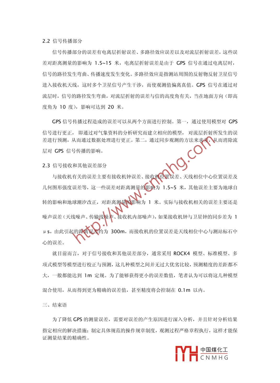 GPS測(cè)量的誤差分析邢寶奇遼寧省冶金地質(zhì)勘查局四O- -隊(duì)114005[摘要] GPS具有測(cè)量時(shí)間短、精度高、全球、全天候等諸多優(yōu)點(diǎn),在社會(huì)各個(gè)領(lǐng)域都得到了廣泛的應(yīng)用。但是由于各種各樣的因素,導(dǎo)致GPS系統(tǒng)在測(cè)量過(guò)程中有一定程度上的不穩(wěn)定,從而導(dǎo)致了各種誤差。本文分析了GPS定位系統(tǒng)的組成部分,對(duì)其誤差來(lái)源做出了分析,并對(duì)相應(yīng)的精度控制技術(shù)進(jìn)行了簡(jiǎn)單介紹。[關(guān)鍵字] GPS測(cè)量測(cè)量誤差精度控制技術(shù)中圖分類號(hào): 0433文獻(xiàn)標(biāo)識(shí)碼: A全球定位系統(tǒng)(GPS) 因?yàn)闇y(cè)量時(shí)間短、測(cè)量精度高、觀測(cè)站之間無(wú)需通視,可提供三維坐標(biāo),測(cè)量過(guò)程具有全球性、全天候性、連續(xù)性和實(shí)時(shí)性等優(yōu)點(diǎn),在全球范圍內(nèi)的各個(gè)領(lǐng)域都得到了廣泛的運(yùn)用。任何先進(jìn)技術(shù)都不可避免的有些不盡人意或者有待改善的不足,GPS也不例外,具體表現(xiàn)在實(shí)際測(cè)量過(guò)程中有- -定程度上的不穩(wěn)定,經(jīng)常由于- -種或者幾種因素導(dǎo)致測(cè)量結(jié)果出現(xiàn)誤差。為了改進(jìn)GPS的上述缺點(diǎn),本文對(duì)GPS測(cè)量中的誤差以及誤差精度控制技術(shù)進(jìn)行分析。GPS定位系統(tǒng)的組成部分GPS定位系統(tǒng)是基于全球24顆定位人造衛(wèi)星,向全球各個(gè)地方全天候地提供三維位置、三維速度信息的一一種無(wú)線電導(dǎo)航定位系統(tǒng)。它由空間衛(wèi)星群、地面控制系統(tǒng)以及用戶裝置部分組成,民用的定位精度可達(dá)10米內(nèi)。1.空間衛(wèi)星群GPS的空間衛(wèi)星群由24顆衛(wèi)星(21 顆工作衛(wèi)星: 3顆備用衛(wèi)星)組成,衛(wèi)星分布在.六個(gè)距地表20200 km的特定軌道上,每個(gè)軌道上有4顆衛(wèi)星,各軌道面之間的交角60軌道傾角55°,衛(wèi)星軌道運(yùn)行的周期11 h 58 min,衛(wèi)星的分部保證了在全球任何地點(diǎn)、時(shí)間、地平線能夠至少接收到4顆衛(wèi)星的信號(hào)。中國(guó)煤化工MHCNMH G2.地面控制系統(tǒng)地面控制系統(tǒng)由由3個(gè)注入站、1個(gè)主控站、5個(gè)監(jiān)測(cè)站所組成的。注入站把主控站計(jì)算出的信息全部注進(jìn)到衛(wèi)星里;主控站通過(guò)觀測(cè)GPS衛(wèi)星的運(yùn)行數(shù)據(jù),對(duì)衛(wèi)星鐘進(jìn)行及時(shí)的參數(shù)修正,計(jì)算衛(wèi)星星歷,然后再將計(jì)算結(jié)果利用注入站傳送到衛(wèi)星當(dāng)中;監(jiān)控站則是接收衛(wèi)星所發(fā)出的信號(hào),對(duì)衛(wèi)星工作情況進(jìn)行監(jiān)測(cè)。3.用戶裝置部分GPS用戶部分即GPS信號(hào)接收機(jī),由天線單元和接收單元兩部分組成。其作用就是收取衛(wèi)星所發(fā)出的信號(hào),然后通過(guò)這些接收到的信號(hào)計(jì)算出用戶所在地理位置的經(jīng)緯度、高度、速度、時(shí)間等信息。隨著科技的不斷發(fā)展,GPS 的用戶部分逐漸小型化,便于野外觀測(cè)使用。二、GPS的測(cè)量誤差與精度控制技術(shù)誤差按性質(zhì)可分為系統(tǒng)誤差與偶然誤差兩類。這兩類誤差中,系統(tǒng)誤差對(duì)測(cè)量結(jié)果的影響要遠(yuǎn)比偶然誤差大的多,系統(tǒng)誤差是GPS測(cè)量的主要誤差來(lái)源,而且系統(tǒng)誤差存在一定的規(guī)律性,所以可以采用- -定的方法和措施來(lái)消除此項(xiàng)誤差。從GPS測(cè)量誤差的來(lái)源可分:衛(wèi)星部分、信號(hào)傳播部分、信號(hào)接收部分和其他影響部分四個(gè)部分。2.1 衛(wèi)星部分衛(wèi)星部分誤差主要有衛(wèi)星星歷誤差、衛(wèi)星鐘誤差及相對(duì)論效應(yīng),衛(wèi)星部分誤差對(duì)距離測(cè)量的影響約為1.5~15 米。衛(wèi)星星歷誤差是衛(wèi)星在空間的位置與實(shí)際位置之差,衛(wèi)星星歷的數(shù)據(jù)來(lái)源有廣播星歷和實(shí)測(cè)星歷,廣播星歷由于SA政策,廣大用戶很難從系統(tǒng)的改善中獲得應(yīng)有的精度,而實(shí)測(cè)星歷對(duì)導(dǎo)航和動(dòng)態(tài)定位無(wú)任何意義,對(duì)靜態(tài)定位有重要意義。衛(wèi)星鐘的鐘差包括由鐘差、頻偏、頻漂、鐘的隨機(jī)誤差,在GPS測(cè)量中,無(wú)論是碼相位觀測(cè)或載波相位觀測(cè),都要求衛(wèi)星鐘和接收機(jī)鐘保持嚴(yán)格同步。由于GPS衛(wèi)星軌道的預(yù)測(cè)工作主要是通過(guò)GPS跟蹤網(wǎng)來(lái)實(shí)施的。其中對(duì)數(shù)據(jù)影響最大的是坐標(biāo)誤差,較為嚴(yán)重的情況下,坐標(biāo)誤差是其他誤差十倍之多。因此要特別注重跟蹤站地心坐標(biāo)的精度,要求要優(yōu)于0.1m,當(dāng)對(duì)基站松他軌道進(jìn)行加權(quán)時(shí),要求其坐標(biāo)值要優(yōu)于5m。只要能夠?qū)⒏櫥具M(jìn)行數(shù)據(jù)分析,就能夠?qū)④壍栏鶖?shù)誤差修改而成為正值。通中國(guó)煤化工過(guò)以上手段,精密星歷就能夠傳送給客戶。YHCNMH G2.2信號(hào)傳播部分.信號(hào)傳播部分的誤差有電離層折射誤差、多路徑效應(yīng)誤差以及對(duì)流層折射誤差,這些誤差對(duì)距離測(cè)量的影響為1.5~15 米,電離層折射誤差是由于GPS信號(hào)在通過(guò)電離層時(shí),信號(hào)的路徑發(fā)生