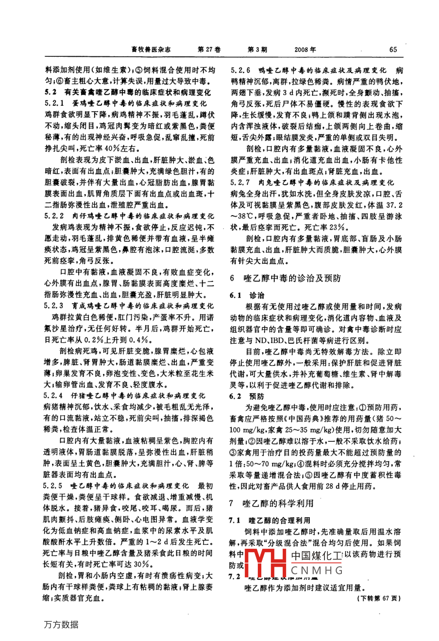畜牧獸醫(yī)雜志第27卷第3期2008年喹乙醇的應(yīng)用研究進(jìn)展董堯,王前勇(武漢市農(nóng)業(yè)學(xué)校畜牧獸醫(yī)教研室,湖北武漢430043)摘要:喹乙醇( Olaquindox)作為飼料添加劑不但具有良好的廣譜抗菌效果,而且能促進(jìn)畜禽對飼料的消化利用,提高生長速度。但是在生產(chǎn)實踐中,對喹乙醇的應(yīng)用出現(xiàn)了不少問題,應(yīng)引起廣泛的重視關(guān)鍵詞:喳乙醇;飼料添加劑;畜牧業(yè)中圖分類號:S859.796文獻(xiàn)標(biāo)識碼文章編號:10046704(2008)03-0063-04Advance in the Application of olaquindoxDONG Yao, WANG Qianyong(Wahan Agriculture University, Wuhan hubo 430043, China)Abstract: As an additive of feed, Olaquindox not only showed strongly broad-spectrum antibacterial effect, but also exertedstimulative promoting effect on the digestion and absorption of feed in animals and make animals grow faster. Whereare, it ap-peared that the application of the medicine had led to many problems in the production practice. Therefore, further respect onthese problems is essential for the application of olaquindox.ey words: Olaquindox; An additive of feed; Application喹乙醇( Olaquindox)又名喹酰胺醇商品名為溶解度微溶于熱水難溶于冷水不溶于一般有機(jī)溶快育靈、倍育諾( Bayanox),是70年代由西德拜爾劑;熔點,202~205℃(亦即分解點);穩(wěn)定性,對熱穩(wěn)藥廠研究合成的飼料添加劑。其具有良好的廣譜抗定,在70~90℃經(jīng)30mn無變化;其它,苦味、無臭,菌效果,尤其是對大腸桿菌沙門氏桿菌等革蘭氏陰純品對光敏感,光照易分解為棕色或深棕色。性致病菌所致的消化道疾病具有良好的療效并能1.2喹乙醇的作用機(jī)理促進(jìn)畜禽對飼料的消化利用,提高生長速度等因而喹乙醇以鄰硝基苯胺為原料,經(jīng)化學(xué)合成而得被廣泛的用于多種獸藥及飼料添加劑中。在正確使其具有較強(qiáng)的抑制有害菌作用特別是對革蘭氏陰用的前提下確實產(chǎn)生了良好的效果,對生產(chǎn)起到了性菌如禽巴氏桿菌、大腸桿菌、雞白痢沙門氏菌、變定的促進(jìn)作用,尤其在飼料環(huán)境較惡劣的場地使形桿菌等有較強(qiáng)的抗菌作用。對上述細(xì)菌的最小抑用效果更為顯著。我國于1981年由北京營養(yǎng)源研菌濃度分別為43.16、16及16mg/mL對革蘭氏究所研制成功并已廣泛用作畜禽生產(chǎn)促進(jìn)劑。然陽性菌葡萄球菌等的抑制作用相對較弱;喹乙醇與而,由于存在使用方法不當(dāng)?shù)葐栴}在生產(chǎn)實踐中喹氯霉素、四環(huán)素等常用藥物無交又耐藥性,同時,喹乙醇的應(yīng)用出現(xiàn)了不少問題。本文結(jié)合有關(guān)文獻(xiàn)資乙醇還能影響代謝(特別是內(nèi)分泌系統(tǒng)),促進(jìn)合成,料,就喹乙醇的特性、吸收、排泄、殘留作用機(jī)理應(yīng)提高飼料能量的利用效果,提高氮的沉積,從而導(dǎo)致用效果、中毒及應(yīng)用時應(yīng)注意的問題等作一綜合闡蛋白質(zhì)細(xì)胞形成和組成增多,達(dá)到增加動物體重、述,以供參考。促進(jìn)生產(chǎn)的目的。1喹乙醇的理化特性及作用機(jī)制2喹乙醇的吸收、排泄與殘留1.1喹乙醇的理化特性喹乙醇一般經(jīng)消化道吸收,主要在肝臟代謝,喹乙醇的化學(xué)名稱:2-[N-(2_羥基一乙基)經(jīng)分離到的代謝產(chǎn)物有5種,約85%經(jīng)腎隨尿排氨基甲酰]-3-甲基一喹啞啉-1,4-二氧化物,除。喹乙醇內(nèi)服吸收迅速生物利用度高;雞內(nèi)服的屬喹啞啉類抑菌促生長劑。主要理化性質(zhì):分子式藥物有53%被吸收進(jìn)入血液循環(huán)凵中國煤化工性低藥物排泄迅CNMHG于.1×10按仰女王。不振等報道,用第一作者簡介:董堯(1980),女,山東濰坊人,本科,助理講師,mg/kg的飼料劑量給石岐雜種雞內(nèi)服以高速度效收稿日期:2007-11-27主要從事畜牧獸醫(yī)教學(xué)工作,液相色譜法測定,24h后藥物在肌肉、肝、腎、脾和Journal of Animal Science and Veterinary Medicine Vol 27 No. 3 2008肺中的含量低于02gg/kg。有記載,仔豬以100×5%~8.7%降低發(fā)病率37.0%~54.7%,明顯提高10-5的喹乙醇混飼喂140d停藥24h后組織中的了經(jīng)濟(jì)效益。江蘇省畜牧獸藥研究所報道,在兔日糧殘留<0.2μg/kg。但也有報道仔豬和雞超量使用中添加一定量的喹乙醇試驗組比對照組增重提高易中毒,并且畜產(chǎn)品的殘留量大。葉麗紅等報道用8.5%~31.7%節(jié)省飼料7.9%~20%喹乙醇30×106及70×106飼料濃度連續(xù)飼喂濱白雞7天后檢測蛋中殘留量隨著劑量加大而增加,4喹乙醇的毒副作用最大殘留量達(dá)到29.59μg/只。4.1亞慢性毒性3喹乙醇在畜禽養(yǎng)殖業(yè)的應(yīng)用喹乙醇對動物與中等程度的蓄積作用,表現(xiàn)為體重下降、精神疲頓、無力、毛色無光澤等臨床癥狀,3.1喹乙醇在養(yǎng)豬生產(chǎn)中的應(yīng)用起病理變化以肝、腎比較嚴(yán)重,對心、肺的作用較輕喹乙醇能促進(jìn)蛋白質(zhì)的同化作用增加機(jī)體蛋白或無病變。將喹乙醇混于大鼠的標(biāo)準(zhǔn)飼料中,按不質(zhì)合成,使更多的氮儲存于體內(nèi)呈現(xiàn)促生長和多產(chǎn)肉同劑量分組連續(xù)飼喂90d結(jié)果表明喹乙醇的主要的作用。據(jù)報道在小豬至30kg的飼料階段中,喳毒性靶器官為肝、腎,可造成肝、腎實質(zhì)性病變;對外乙醇對飼料的消化率有顯著影響,試驗組(50×106周血液無影響,但能引起血清谷丙轉(zhuǎn)氨酶下降喹乙醇比對照組的粗蛋白消化率提高5%有機(jī)物進(jìn)行蓄