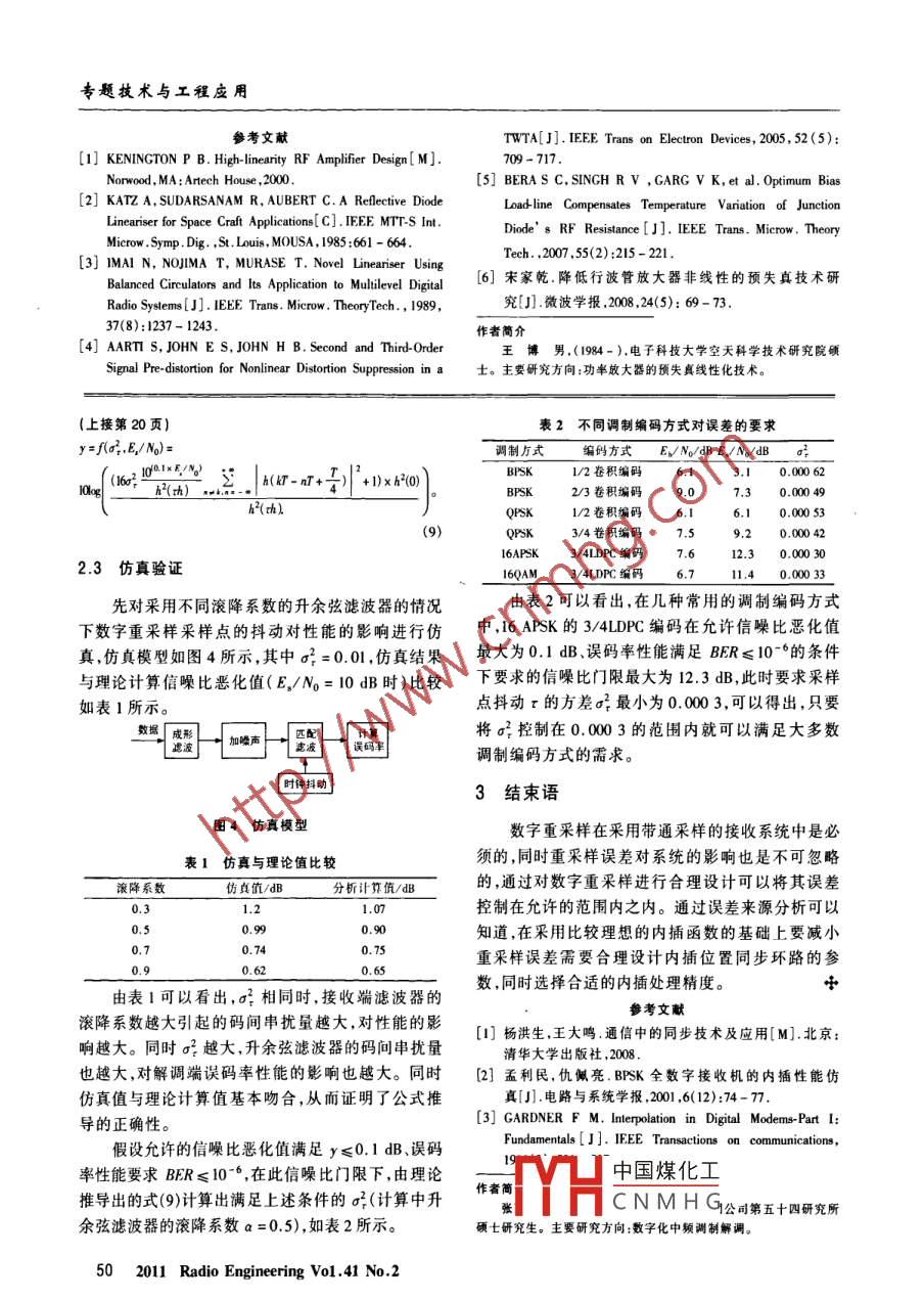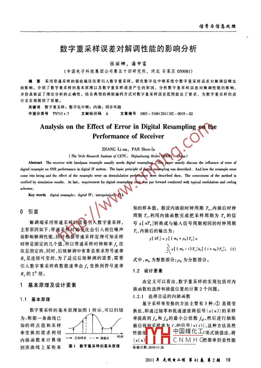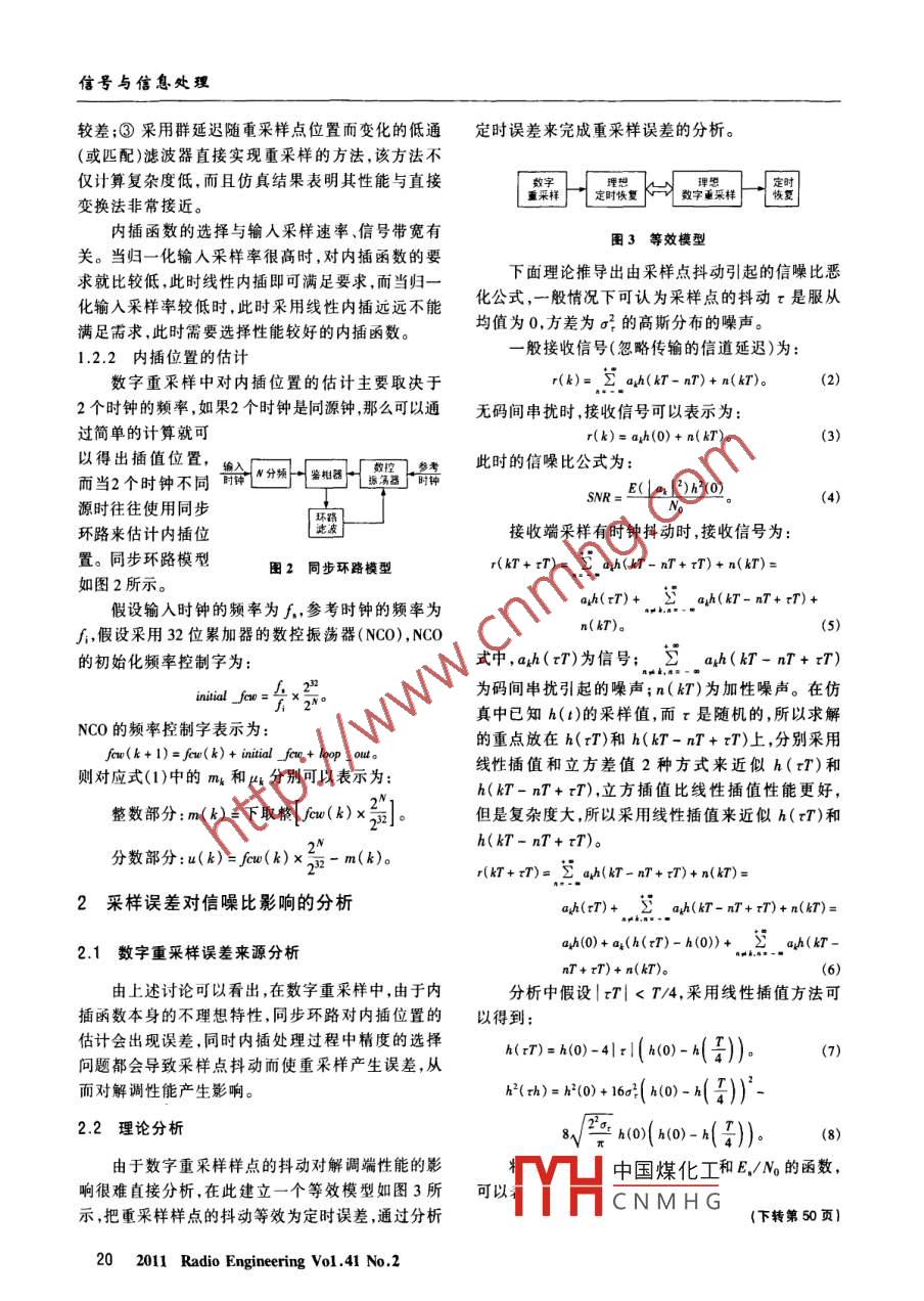 信號與信息處理數(shù)字重采樣誤差對解調(diào)性能的影響分析張麗娜,潘申富(中國電子科技集團公司第五十四研究所,河北石家莊050081)摘要采用帶通采樣的接收端往往要引入數(shù)字重采樣。研究數(shù)字化中頻系統(tǒng)中數(shù)字重采樣誤差對解調(diào)信噪比的影響。介紹了數(shù)字重采樣的基本原理以及數(shù)字重采樣誤差產(chǎn)生的原因,分析數(shù)字重采樣誤差對解調(diào)性能的影響并仿真驗證了理論分析的正確性。結(jié)合典型的調(diào)制編碼方式對數(shù)字重采樣誤差范圍提出了要求,為數(shù)字重采樣的設(shè)計及實現(xiàn)提供了依據(jù)。關(guān)鍵詞數(shù)字重采樣;數(shù)字化中頻;內(nèi)插;同步環(huán)路中圖分類號TN713+7文獻標識碼A文章編號1003-3106(2011)02-0019-02Analysis on the Effect of Error in Digital Resampling on thePerformance of ReceiverZHANG Li-na, PAN Shen-f(The 54 th Research Institute of CETC, Shijiazhuang Heibei 050081, China)bstract The receiver with bandpass resample usually needs digital resampling. This paper mainly discuss the influence of error ofdigital resample on SNR performance in digital IF system. The basic principle of digital resampling was described. And how the resample errorcome into being and the effect of the resample error on demodulation performance were described then. The correctness of the method isverified by simulation results. At last, requirement for digital resampling error was put forward combined with typical modulation and coderey words digital resample: di0引言知的樣本值。假設(shè)內(nèi)插前時鐘周期T,內(nèi)插后時鐘周期T;,利用內(nèi)插函數(shù)完成把采樣周期為T的信解調(diào)端采用帶通采樣時需要引人數(shù)字重采樣,號x[nT,]轉(zhuǎn)換成與輸入信號周期相同的時鐘周期主要原因如下:帶通采樣時鐘變化會引人相位噪聲T,內(nèi)插后的輸出為:T]=y[(m+)T]時鐘是固定的幾個值,所以帶通采樣時鐘頻率,往往是固定的,同時,后級解調(diào)中常常是要求符號速率∑x[(m-i)T,h[(i+叫)T]。(1)R是連續(xù)可變的,為了適應(yīng)后級解調(diào)的需要,需要式中,m為整數(shù)部分;4為分數(shù)部分。引入數(shù)字重采樣將數(shù)據(jù)速率由f變換到符號速率R,的2N倍1.2設(shè)計要素1基本原理及設(shè)計要素由定義可以看出,數(shù)字重釆樣的實現(xiàn)包括對內(nèi)插函數(shù)的選擇和插值位置的計算2個問題1.1基本原理1.2.1選擇合適的內(nèi)插函數(shù)基于采樣率變換的方法主要有3種:①直接變數(shù)字重采樣的基本原理如圖1所示,可以歸結(jié)換法,即通過插零和低通濾波將信號{x(n)}的采樣為:根據(jù)一條曲線已率提高到和f的最小公倍數(shù)fs,然后進行抽取知的樣點值和采樣最后樣率為f的信號!v(i),這種方法雖然率變換的需求利用性能中國煤化工項式插值法,將內(nèi)插函數(shù)來計算得已知樣點一-◆插值點Ix(n)CNMHG然簡單但是性能到該曲線上某些未圖1數(shù)字重采樣的基本原理收稿日期:101262011年死線電工翟第41桌第2期19信號與信息處理較差;③采用群延遲隨重采樣點位置而變化的低通定時誤差來完成重采樣誤差的分析。(或匹配)濾波器直接實現(xiàn)重采樣的方法,該方法不僅計箅復雜度低,而且仿真結(jié)果表明其性能與直接數(shù)字重采樣變換法非常接近。定時恢復內(nèi)插函數(shù)的選擇與輸入采樣速率、信號帶寬有圖3等效模型關(guān)。當歸一化輸入采樣率很高時,對內(nèi)插函數(shù)的要求就比較低,此時線性內(nèi)插即可滿足要求,而當歸一下面理論推導出由采樣點抖動引起的信噪比惡化輸入采樣率較低時,此時采用線性內(nèi)插遠遠不能化公式,一般情況下可認為采樣點的抖動r是服從滿足需求,此時需要選擇性能較好的內(nèi)插函數(shù)。均值為0,方差為a2的高斯分布的噪聲1.22內(nèi)插位置的估計般接收信號(忽略傳輸?shù)男诺姥舆t)為:數(shù)字重采樣中對內(nèi)插位置的估計主要取決于r(k)=2 ah(kT-nT)+n(kT)2個時鐘的頻率如果2個時鐘是同源鐘那么可以通無碼間串擾時,接收信號可以表示為過簡單的計算就可r(k)=ah(0)+n(AT)。(3)以得出插值位置而當2個時鐘不同N分頻叫鑒相器等此時的信噪比公式為:NR=E(a+12)(0)源時往往使用同步環(huán)路來估計內(nèi)插位接收端采樣有時鐘抖動時,接收信號為:置。同步環(huán)路模型圖2同步環(huán)路模型r(kT+tT)=2 ah(AT-nT+ tT)+n(kr)如圖2所示。假設(shè)輸入時鐘的頻率為f參考時鐘的頻率為ahh(tr)+a h(kT-nT+ tT)+。sm∫,假設(shè)采用32位累加器的數(shù)控振蕩器(NCO),NCOn( kr).的初始化頻率控制字為:式中,a(r)為信號;a(MT-m+τT為碼間串擾引起的噪聲;n(kT)為加性噪聲。在仿真中已知h(t)的采樣值,而r是隨機的,所以求解NCO的頻率控制字表示為:的重點放在h(rT)和h(kT-nT+rT)上,分別采用fu(k+1)=fow(k)+ initial fcu +loop outo則對應(yīng)式(1)中的m4和k分別可以表示為:線性插值和立方差值2種方式來近似h(rT)和h(AT-nT+τT),立方插值比線性插值性能更好,整數(shù)部分:m(k)=下取整/(k)但是復雜度大,所以采用線性插值來近似h(T)和分數(shù)部分:(k)=/m(h)x21h(AT-nT+rT)。r(kT +tT)∑sh(AT-nT+tT)+n(kT)2采樣誤差對信噪比影響的分析h(rT)+2 ah(kT-nT+rr)+n(kT)2.1數(shù)字重采樣誤差來源分析a(0)+a4(h(zT)-h(0)*jhh(kT-nT+rT)+n(kT)。由上述討論可以看出,在數(shù)字重采樣中,由于內(nèi)分析中假設(shè)|rT|