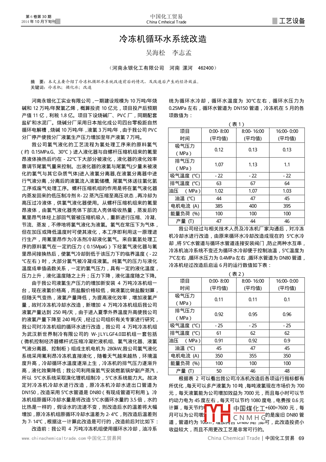 第6卷第30期中國化工貿(mào)易2014年10月下旬刊China Cmheical trade工藝設(shè)備冷凍機(jī)循環(huán)水系統(tǒng)改造吳海松李志孟(河南永銀化工有限公司河南漯河462400)摘要:本文主要介紹了冷凍機(jī)循環(huán)水系統(tǒng)改造前后的情況,及改造后產(chǎn)生的經(jīng)濟(jì)效益關(guān)鍵詞:冷凍杌;循化水;改造河南永銀化工實業(yè)有限公司,一期建設(shè)規(guī)模為10萬噸/燒統(tǒng)為循環(huán)水冷卻,循環(huán)水溫度為30℃C左右,循環(huán)水壓力為堿和1萬噸/聚氯乙烯,概算投資10億元,項囯投產(chǎn)后預(yù)期θ.25MPa左右,循環(huán)水管道為DN150管道,冷凍機(jī)在5月的各產(chǎn)值11億,利稅1.8億。項目下設(shè)燒堿廠、PVC廠,同期配套項數(shù)值為鹽礦和水泥廠。燒堿分廠采用日本旭化成公司四臺零極距自然(表1)循環(huán)電解槽,燒堿10萬噸/,液氯3萬噸年,由于我公司PVC項目0:00-8:008:00-16:006:00-0:00分廠停產(chǎn)使我分廠液氯生產(chǎn)壓力增加至年產(chǎn)液氯7萬噸。時間(平均值)(平均值)我公司氯氣液化的工藝流程為氯處理工序來的原料氯氣吸氣壓力約0.15MPaG、30°C)進(jìn)入液化器與自螺桿壓縮機(jī)組來的氟里0.130.13(MPa)昂液體換熱后約在-22℃C下大部分被液化,液化器的液化效率排氣壓力靠調(diào)節(jié)尾氯氣量來控制。出液化器的液氯與尾氯氣(少量未被液1071.131.1(MPa)化的氯氣與其它雜質(zhì)氣體進(jìn)入液氯分離器在液氯分離器中進(jìn)吸氣溫度r2行氣液分離,分離后的液氯流入液氯儲槽,尾氯氣體送往氯化氫排氣溫度(°O)6工序或廢氣處理工序螺桿壓縮機(jī)組的作用是將在氯氣液化器油壓(M薩a)1021.071.03內(nèi)蒸發(fā)回來的低壓制冷劑R-22蒸汽壓縮至高壓狀態(tài),再冷卻為油溫(°C)47高壓過冷液體,供氯氣液化器使用。從螺桿壓縮機(jī)組來的氟里電機(jī)電流(A昂液體,由氯氣液化器殼體下部流入殼體吸收熱量,蒸發(fā)后的能量負(fù)荷(%)氟里昂氣體經(jīng)上部回氣管被壓縮機(jī)吸入,重新進(jìn)行壓縮、冷凝節(jié)流、蒸發(fā),不停地將氯氣液化為液氯。氯氣在常壓下為氣體產(chǎn)量()474446但在加壓或降低溫度時可使其液化,本工序即利用這一原理進(jìn)我公司經(jīng)過與相關(guān)技術(shù)人員及冷凍機(jī)廠家溝通后,對冷凍行生產(chǎn),用氟里昂作為冷凍劑冷卻液化氯氣。來自氯氫處理工機(jī)冷卻水進(jìn)行改造,由原來循環(huán)水冷卻改造成現(xiàn)在的5°C水冷卻,將5°水管道與循環(huán)水管道連接安裝閥門,防止兩種水互串序的原料氯氣在一定的壓力(0.15M3G)下經(jīng)氯氣液化器與氟冷凍機(jī)油冷系統(tǒng)不變還為循環(huán)水冷卻便于控制油溫,5℃溫度為里昂間接換熱后,使氯氣冷卻到低于該壓力下的臨界溫度(-22℃C左右)時,大部分氯氣被冷凝成液氯。純氯氣的壓力與液化℃左右,循環(huán)水壓力為04MPa左右循環(huán)水管道為DN80管道溫度成單值函數(shù)關(guān)系,一定的氯氣壓力,具有一定的液化溫度冷凍機(jī)經(jīng)過改造后啟運(yùn)6月的運(yùn)行數(shù)值如下表壓力上升,液化溫度隨之上升;壓力下降,液化溫度隨之下降。(表2)由于我公司液氯生產(chǎn)壓力的增加新安裝4萬噸冷凍機(jī)組項目0:00-8:08:00-16:0016:00000臺,現(xiàn)在液氯價格髙,而鹽酸價格較低,做液氯比做鹽酸劃算時間(平均值)(平均值(平均值)但隨天氣變熱,液氯產(chǎn)量降低,為提高液化效率,增加液氯產(chǎn)吸氣壓力0.110.110.1量,故對冷凍機(jī)冷卻水改造,新增加4萬噸冷凍機(jī)組后我公司( MPa)液氯產(chǎn)量達(dá)到250噸厭,由于進(jìn)入夏季外界溫度升高使我公司排氣壓力0.920950.96的液氯產(chǎn)量下降至240噸厭,經(jīng)過公司組織有關(guān)專家進(jìn)行研究(MPa我公司對冷凍機(jī)組的循環(huán)水進(jìn)行改造,我公司4萬噸冷凍機(jī)組吸氣溫度(℃為武漢新世界制冷有限公司的WYGF40Ⅲ機(jī)組一套包括排氣溫度(C微機(jī)控制經(jīng)濟(jì)器螺桿式壓縮冷凝貯液機(jī)組、氯氣液化器、液氯油壓(MPa091092氣液分離器、控制柜)組成主機(jī)電機(jī)為280kW我公司氯氣液化油溫(°C)系統(tǒng)采用氟利昂冷凍機(jī)直接液化,隨著天氣越來越熱,環(huán)境溫電機(jī)電流(A)350355350度升高,冷卻循環(huán)水溫度逐漸上生,冷凍機(jī)的排氣壓力逐漸升能量負(fù)荷(%)高,液化效果降低;我公司利用廢氨氣安裝燃?xì)溴仩t副產(chǎn)蒸汽,產(chǎn)量()所以5℃C水系統(tǒng)采取溴化鋰機(jī)組制冷,5°℃水系統(tǒng)能力大。故決根據(jù)表2可以看出我公司冷凍機(jī)改造后各項運(yùn)行指標(biāo)都有定對冷凍機(jī)冷卻水進(jìn)行改造,原冷凍機(jī)冷卻水進(jìn)出口管道為所優(yōu)化每天可以多產(chǎn)液氯為10噸每噸液氯現(xiàn)在市場價為700DN150,改造采用5°C水管道是DN80(有現(xiàn)成管道可利用冷元,每天液氯能為公司增加效益為7000元,而且每小時可以節(jié)凍機(jī)組原循環(huán)冷卻水量是將改造5°℃水循環(huán)水量的3.5倍,水的約動力電為45度左右,每天可以節(jié)約1080度電,電費按06元比熱是一樣的,假設(shè)水的流速不變,則改造后水的溫差將大幅計算,每天節(jié)約VT凵中國煤化工+6060元每增加,原冷凍機(jī)組原循環(huán)冷卻水溫差為2-4°C,則改造后溫差則月可以為公司增為7-14°C,根據(jù)這一計算此改造是可行的,后對比如下CNMHG的是廢舊DN80管道,管道約