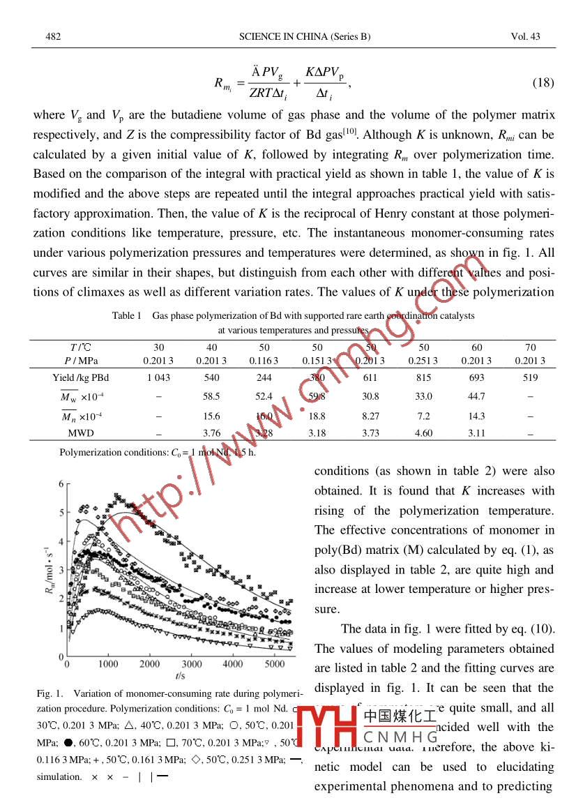 Vol. 43 No. 5SCIENCE IN CHINA (Series B)October 2000Kinetic model of gas phase polymerization of 1,3-butadienecatalyzed by supported rare earth coordination systemSHEN Zhiquan (沈之荃), LI Weishi (李維實) & ZHANG Yifeng (張-烽)Department of Polymer Science and Engineering, Zhejiang University, Hangzhou 310027, ChinaCorrespondence should be addressed to Shen Zhiquan (email: zqshen@163.net)Received May 10, 2000Abstract Gas phase polymerization of 1 ,3-butadiene (Bd) catalyzed by supported rare earth coor-dination system is studied and a new kinetic model is proposed. Four elementary reactions or proc-esses: the process of exposure and activation of potential active catalytic center, propagation,deactivation and chain transfer reaction to alkyl aluminum, are considered in this model. Someimportant parameters, such as monomer-consuming rate, are well expressed as the functions ofmacroscopic polymerization conditions such as pressure, temperature, and duration. The modelcan simulate the whole polymerization procedure satisfactorily.Keywords: rare earth catalyst, 1,3-butadiene, gas phase polymerization, kinetic, modeling.Because gas phase polymerization is conducted without solvent in the process, the compli-cate procedures of aggregation and separation of polymer from solution, which are needed in so-lution polymerization, are excluded from gas phase polymerization. This leads to not only cuttingdown the cost of construction and operation, but also reducing environmental pollution. On theother hand, it also avoids the shortages of bulk polymerization such as low conversion, polymerquality difficult to control and the danger of violent polymerization, which are due to system vis-cosity enhancing rapidly with the increase of conversion and reaction heat being difficult to dif-fuse in bulk polymerization. Although the gas phase polymerization technology of ethylene andpropylene has been industrialized for a long time, gas phase polymerization of Bd has just beenstudied. However, it represents the trend of Bd polymerization technology.Study on gas phase polymerization of Bd was firstly carried out by Berlin Technical Univer-sity and Bayer Company in 19941. Recently, we have studied it succesfully with supported rareearth coordination catalysts. However, the kinetic study of gas phase polymerization of Bd has notbeen performed except for a preliminary work of Eberstein et al.!21. In this paper, the kinetic be-havior and a whole model of gas phase polymerization of Bd with supported rare earth coordinati-on catalysts are reported for the first time. This model can simulate the whole polymerization pro-cedure satisfactorily.中國煤化工MHCNMHG1 ExperimentalGas phase polymerization of butadiene was carried out in a 150 mL kettle. The monomerpressure and the polymerization temperature were kept constant during the whole procedure. Mo-SCIENCE IN CHINA (Series B)Vol.43lecular weight and its distribution of Poly(Bd) prepared were determined on a WATERS 150CGPC chromatograph under the following conditions: 35"C, THF as eluent, flow rate of 1 ml /min,polystyrene as standard, gel columns of 10, 104 and linear. The Mark-Houwink constants'3] ofhigh-cis poly(Bd) in THF at 35°C are K = 4.57x10- and a = 0.693.2 Modeling principleA growing particle is considered as a“solution”of polymeric continuous phase. All reactionstake place in the intraparticle. The difference between the surface and the bulk of particle is ig-nored in this model. The effective monomer concentration in the particle maintains a certain valuewith respect to the constant pressure of Bd during the whole polymerization procedure. Their re-lationship can be well described by Henry' s law: .M=K.P,(1)where K is the reciprocal of Henry constant.Reasonably, the following three elementary reactions or processes are taken into considera-tion for gas phase polymerization of Bd with supported rare earth coordination catalysts.( i ) Process of exposure and activation of potential catalytic centers. In the case of gasphase polymerization of Bd by supported rare earth catalysts, the catalytic centers deposit on theouter and inner surfaces or in the cavity of the carrier. Monomer diffuses from outer to inner of theparticle in a slow rate. Therefore, some zones in inner have no monomer at the very beginning ofthe polymerization. Consequently, no polymerization has happened at the catalytic centers in thesezones, which is regarded as the potential catalytic centers. However, the monomer reaches thesezones gradually along with the polymerization proceeding. In such a case, these centers have φp-portunities to meet with monomer. They become the“true”active propagation centers right afterreacting with monomer. This is consistent with the multigrain model4+. 51 and multilayer model6.7.The process is called the exposure and activation of potential catalytic centers, as expressed in thefollowing:C+M- Ake→>P*where C is the number of potential catalytic centers, and ke the rate constant.(il ) Propagation. The propagation reaction isP1-1+Mk。P%where kp is the rate constant of propagation, and P" the number of active propagation chains with中國煤化工polymeric degree of n.(ii) Deactivation. It is reported!21 that thereMHCNMHGionreationinthegasphase polymerization of Bd. To take it into account, we consider the following deactivation reac-tion:No.5KINETIC MODEL OF BUTADIENE GAS PHASE POLYMERIZATION479P*_kg>Pnwhere Pn is the terminated polymer chain with polymeric degree of n, and kg the rate constant ofthis deactivation reaction.Besides, chain transfer reaction exists in this polymerization system, but mainly toward alkylaluminuml8.9. We assume that the active propagation chain,Pi, and the terminated polymerchain, Pn , are yielded in such chain transfer reaction, as shown in the following:P,*+Al-kr→P, +P*where kr is the rate constant of chain transfer reaction.Thus, we have the variation rate of potential catalytic center:dC=-k。MC,(2)Itthe