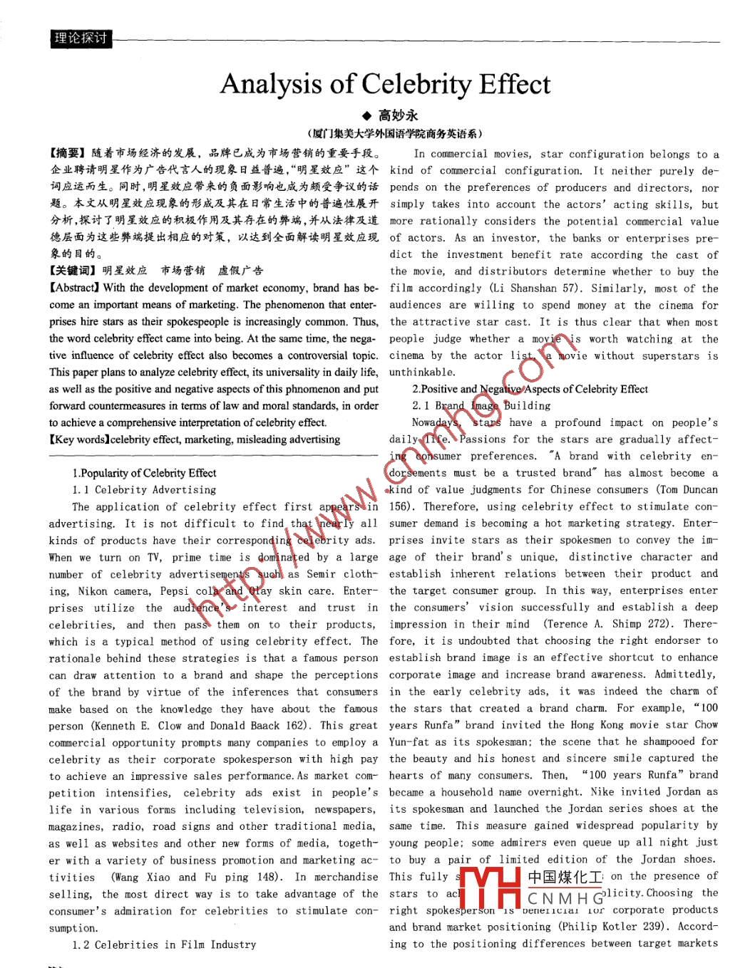 理論探討IAnalysis of Celebrity Effect◆高妙永(廈[ ]集美大學(xué)外國語學(xué)院商務(wù)英語系)[摘要]隨著市場經(jīng)濟的發(fā)展,品牌已成為市場營銷的重要手段。In commercial movies, star configuration belongs to a企業(yè)聘請明星作為廣告代言人的現(xiàn)象日益普遍,“明星效應(yīng)”這個kind of commercial configuration. It neither purely de-詞應(yīng)運而生。同時,明星效應(yīng)帶來的負(fù)面影響也成為頗受爭議的話pends on the preferences of producers and directors, nor題。本文從明星效應(yīng)現(xiàn)象的形成及其在日常生活中的普遍性展開simply takes into account the actors' acting skills, but分析,探討了明星效應(yīng)的積極作用及其存在的弊端,并從法律及道m(xù)ore rationally considers the potential commercial value德層面為這些弊端提出相應(yīng)的對策,以達(dá)到全面解讀明星效應(yīng)現(xiàn)of actors. As an investor, the banks or enterprises pre-象的目的。dict the investment benefit rate according the cast of[關(guān)鍵詞]明星效應(yīng)市場營銷 虛假廣告 .the movie, and distr ibutors determine whether to buy th[Abstract] With the development of market economy, brand bas be- film accordingly (Li Shanshan 57). Similarly, most of thecome an important means of marketing. The phenomenon that enter- audiences are willing to spend money at the cinema forprises hire stars as their spokespeople is increasingly common. Thus,the attractive star cast. It is thus clear that when mostthe word celebrity effect came into being. At the same time, the nega- people judge whether a movie is worth watching. at thetive influence of celebrity effect also becomes a controversial topic. cinema by the actor list, a movie without superstars isThis paper plans to analyze celebrity effect, its universality in daily life, unthinkable.as well as the positive and negative aspects of this phnomenon and put2.Positive and Negative Aspects of Celebrity Effectto achieve a comprehensive interpretation of celebrity effect.Nowadays,stars have a profound impact on people's[Key words]celebrity eftet, marketing, misleading advertisingdaily life. Passions for the stars are gradually affect-ing consumer preferences.‘ A brand with celebrity en-1.Popularity of Celebrity Effectdorsements must be a trusted brand” has almost become a1.1 Celebrity Advertisingkind of value judgments for Chinese consumers (Tom DuncanThe application of celebrity effect first appears in 156). Therefore, using celebrity effect to stimulate con-advertising. It is not difficult to find that nearly all sumer demand is becoming a hot marketing strategy. Enter-kinds of products have their corresponding celebrity ads. prises invite stars as their spokesmen to convey the im-When we turn on TV,prime time is dominated by a largeage of their brand' s unique, distinctive character annumber of celebrity advertisements such as Semir cloth- establish inherent relations betweentheir product andng, Nikon camera, Pepsi cola and 0lay skin care. Enter- the target consumer group. In this way, enterprises enterprises utilize the audience's interest and trust in the consumers' vision successfully and establish a deepcelebrities,and then pass them on to their products, impression in their mind (Terence A. Shimp 272). There-which is a typical method of using celebrity effect. The fore, it is undoubted that choosing the right endorser torationale behind these strategies is that a famous person establish brand image is an effective shortcut to enhancecan draw attention to a brand and shape the perceptions corporate image and increase brand awareness. Admi ttedly,of the brand by virtue of the inferences that consuers in the early celebrity ads, it was indeed the charm ofmake based on the knowledge they have about the famous the stars that created a brand charm. For example, “ 100person (Kenneth E. Clow and Donald Baack 162). This great years Runfa” brand invited the Hong Kong movie star Chowcommercial opportunity prompts many companies to employ a Yun-fat as its spokesman; the scene that he shampooed forcelebrity as their corporate spokesperson with high pay the beauty and his honest and sincere smile captured theto achieve an impressive sales performance. As market com- hearts of many consumers. Then, “100 years Runfa”brandpetition intensifies, celebrity ads exist in people's became a household name overnight. Nike invited Jordan aslife in various forms including television, newspapers, its spokesman and launched the Jordan series shoes at themagazines,radio, road signs and other traditional media, same time. This measure gained widespread popularity byas well as websites and other new forms of media, togeth-young people; some admirers even queue up all night juster with a variety of business promotion and marketing ac- to buy a pair of limited edition of the Jordan shoes.tivities (Wang Xiao and Fu ping 148). In merchandise This fully中國煤化工: on the presence ofselling, the most direct way is to take advantage of the stars to:0HC N MH Glicity. Choosing the .consumer's admiration for celebrities to stimulate con- right spokesperson 1s DeneI1cial 10r corporate productssumpt ion.and brand market positioning (Philip Kotler 239). Accord-1.2 Celebrities in Film Industrying to the posi tioning differences between target markets吟方別數(shù)據(jù).{理論探討|and target consumer groups, the choice of celebrity en- commoditiesservices to consumers in the faul adver-dorsements is in different ways. The functions of tisements, resulting in damage of consumers' . legal rightscelebrities in market positioning are reflected in the and interests. They shall be held liable (Law Press Chi-following two aspects: on one hand, enterprises with na, qtd. in Li Yiming 49). However, according to "Adver-high-end brands hire world famous stars as their etising Law”(re