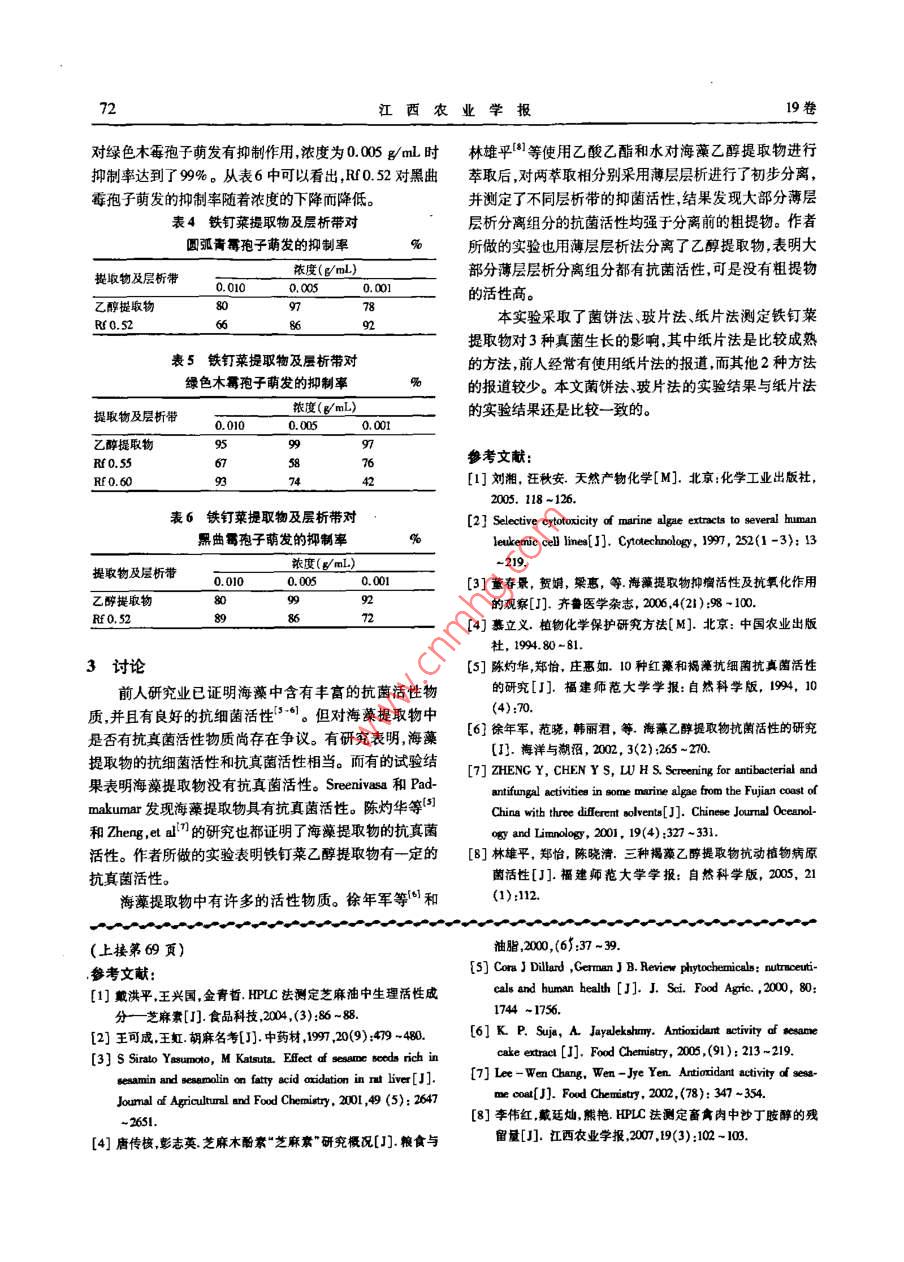 江西農(nóng)業(yè)學(xué)報2007,19(11):70~72Acta Agriculturae Jiangxi鐵釘菜乙醇提取物對真菌生長的影響歐陽桐嬌,鄭怡2,劉艷如2,林勇3,郭文杰,江枝和(1.福建省農(nóng)科院生物技術(shù)研究所福建福州35000;2.福建師范大學(xué)生命科學(xué)院福建福州35007;3.福建省農(nóng)科院土壤肥料研究所福建福州350013)摘要:鐵釘萊乙醇粗提物通過薄層層析法分離活性物質(zhì),分別采用紙片法和菌餅法測定了鐵釘菜提取物及薄層層析帶對3種真菌的菌絲生長的影響,用玻片法測定了對孢子萌發(fā)的抑制作用。實驗結(jié)果表明:乙醇提取物對3種真菌孢子萌發(fā)的抑制作用最強,其中,濃度在0.005mg/m時對綠色木霉和黑曲寡孢子萌發(fā)的抑制率均達(dá)到9%。關(guān)鍵詞:鐵釘萊;薄層層析;真菌;萬絲生長;抱子萌發(fā)中圖分類號:Q49.327.1文獻(xiàn)標(biāo)識碼;A文章編號:1001-8581(2007)11-0070-03Effect of Ethanol Extract from Ishige okamura on growth of FungiOUYANG Tong-jiao', ZHENG Yi, LIU Yan-n, LIN Yong, GUO Wen-jie, JIANG Zhi-h(1. Biotechnology Institute, Fujian Academy of Agricultural Sciences, Fuzhou 350003, China:2. College of Life Sciences, Fujian Normal University, Fuzhou 350007, China;3. Institute of Soil and Fertilizer, Fujian Academy of Agricultural Sciences, Fuzhou 350013, ChinaAbstract: Active substances separated by TLC from the ethanol extract of ishige okamura were used to study their effects on thehyphal growth of three fungi by using the method of disc and filter papar, as well as their restraining effects on the spore germination byusing the slide method. The results indicated that ethanol extract showed strong inhibition to the spore germination of three fungi andthe maximu inhibitory rate reached 97. 0% to Trichoderma wirde and aspergillus niger under the concentration of 0. 005 me/mL.Key words: Ishige okamura; Thin layer chromatographic analysis; Fungus; Hyphal growth; Spore germination海洋占地球總面積的71%,蘊藏著極其豐富的生物細(xì)菌、真菌對抗生款耐藥性和抗藥性的加強,尋找新的抗資源,是有機物質(zhì)的最大生產(chǎn)者。這些有機物基本上是菌活性物質(zhì)已成為了當(dāng)務(wù)之急。而海洋生物的多樣性海洋浮游植物合成的,特別是海藻。因此可以說海洋藻特殊性及復(fù)雜性是理想的新的抗菌素的資源寶庫。海藻類是世界上最大的有機物合成并儲存的資源寶庫并且抗菌活性物質(zhì)的研究主要包括對具抗菌活性種類的篩它們在海洋中分布廣泛從大洋水體到世界各沿岸海區(qū),選抗菌活性物質(zhì)的提取分離純化及化學(xué)成分分析和結(jié)生活環(huán)境變化多端物種和生活環(huán)境的多樣性為海洋藻構(gòu)鑒定等。本研究以綠色木霉( Trichoderma ririd)黑曲類帶來了其生物活性物質(zhì)的多樣性。由于海洋環(huán)境的特霉( Aspergillus niger)、圓弧青霉( Penicillium cyclopium)為殊性很多的海洋生物在高鹽高壓、缺氧等惡劣生活環(huán)研究對象研究了乙醇提取物及薄層層析分離物對其生境的長期進(jìn)化和發(fā)展的過程中,為適應(yīng)生存和競爭生存長的影響,旨在為進(jìn)一步開發(fā)利用海藻的天然活性物質(zhì)空間形成并產(chǎn)生了許多結(jié)構(gòu)獨特而藥理作用顯著的海提供借鑒。洋次生代謝物質(zhì)如抗菌抗病毒抗腫瘤抗氧化等活性1材料與方法物質(zhì)。而海藻作為海洋生物鏈的第一生產(chǎn)者,為了抵1.1材料鐵釘菜采自石獅海域;海藻采回后立即清洗抗外界微生物的感染和獵食者的吞食而獲得生存它們干凈室內(nèi)陰干陰涼處保存?zhèn)溆?。在不斷的進(jìn)化過程中產(chǎn)生了對各種敵害生物的抗性。由1.2真菌本實驗的供試真菌有3種即綠色木霉(Tn于海藻本身沒有像高等動物那樣的細(xì)胞免疫系統(tǒng),它們 choderma viride)、黑曲霉( Aspergillus niger)、圓弧青霉的這種抗性是一種有目標(biāo)地產(chǎn)生化學(xué)物質(zhì)的防衛(wèi)機制,( Penicillium cyclopium),由福建農(nóng)林大學(xué)許文耀教授分一般為藻類產(chǎn)生的次生代謝物質(zhì)。另外海洋藻類還是離純化本實驗室保存。很多其他消費者的活性物質(zhì)的主要來源。自20世紀(jì)601.3試劑石油醚丙酮、乙醇、乙酸乙酯均為國產(chǎn)分析年代人們提出“向海洋要藥”的口號起,近40年來海洋純薄層層析硅膠為青島海洋化工有限公司產(chǎn)品?;瘜W(xué)及生命科學(xué)研究成為熱點之一23。其中對于海1.4儀器高速萬能粉碎機(天津市泰斯特儀器有限公洋藻類抗菌活性物質(zhì)的研究由來已久特別是隨著很多司);SHB-ⅢB循環(huán)水式多用真空泵(鄭州長城科工貿(mào)收稿日期:2007-08-06基金項目:福建省科技廳重點項日(2005%036)作者簡介陽桐嬌(193-),女福建平潭人,助理研究員從事植物資源化學(xué)研究工作。歐陽桐嬌等鐵釘菜乙醇提取物對真菌生長的影響71有限公司);旋轉(zhuǎn)蒸發(fā)器(上海亞榮生化儀器廠);電熱恒28℃恒溫?;炫囵B(yǎng)6h顯微鏡下觀察并記錄孢子萌發(fā)溫水浴鍋(上海醫(yī)療器械五廠);VD-650型桌上式潔凈情況。以等量的乙酸乙酯為對照,每處理重復(fù)3次按下工作臺(蘇州凈化設(shè)備);電熱手提式壓力蒸汽滅菌器面公式計算孢子萌發(fā)抑制率:(上海醫(yī)用核子儀器廠);TDCC2-3接觸調(diào)壓器(浙江正孢子萌發(fā)抑制率=(1-處理萌發(fā)率/對照萌發(fā)率)泰電器股份有限公司);雙層鐵皮電爐(上海申航五金電x100%器廠丹陽分廠);EF-I型三用紫外分析儀(上海顧村電2結(jié)果與